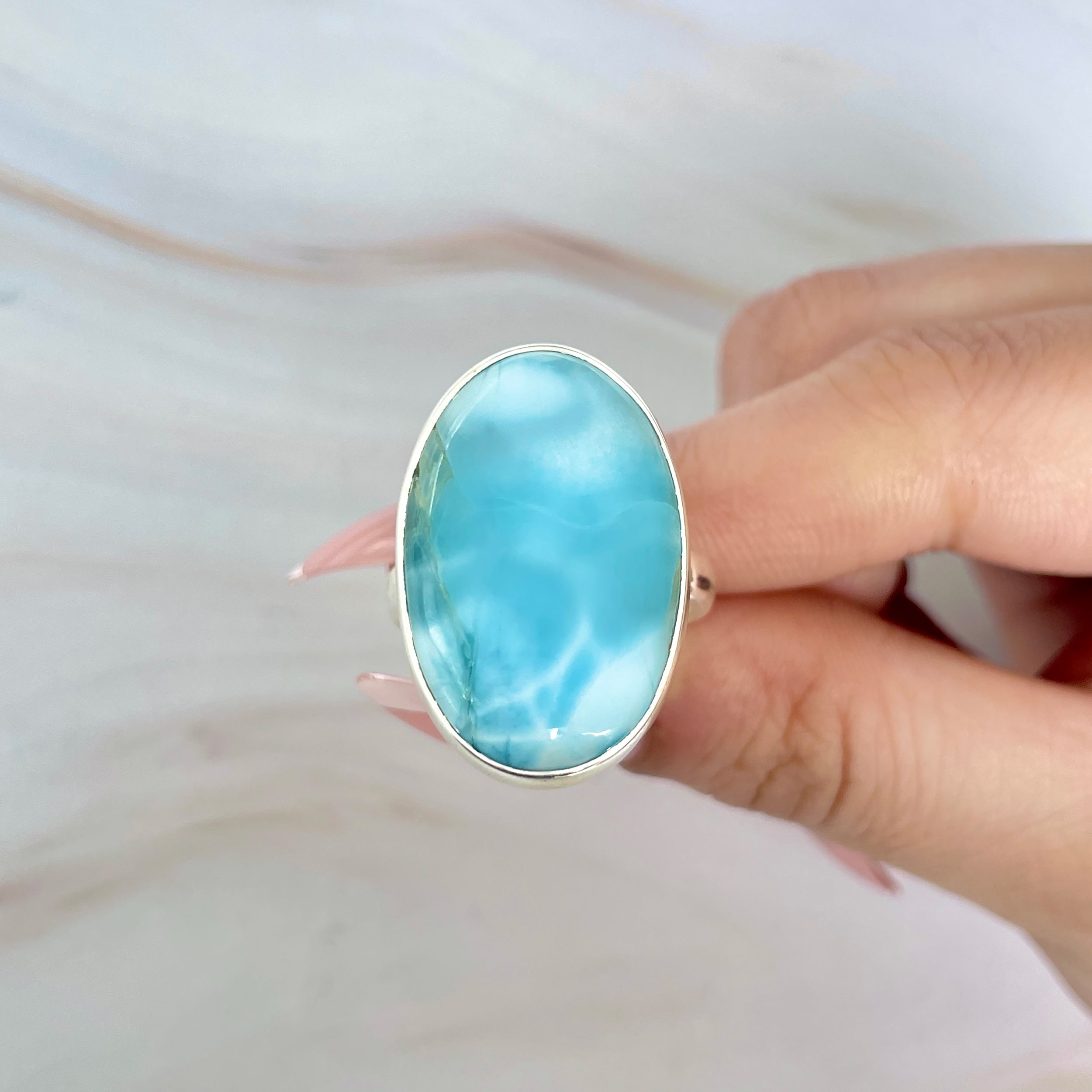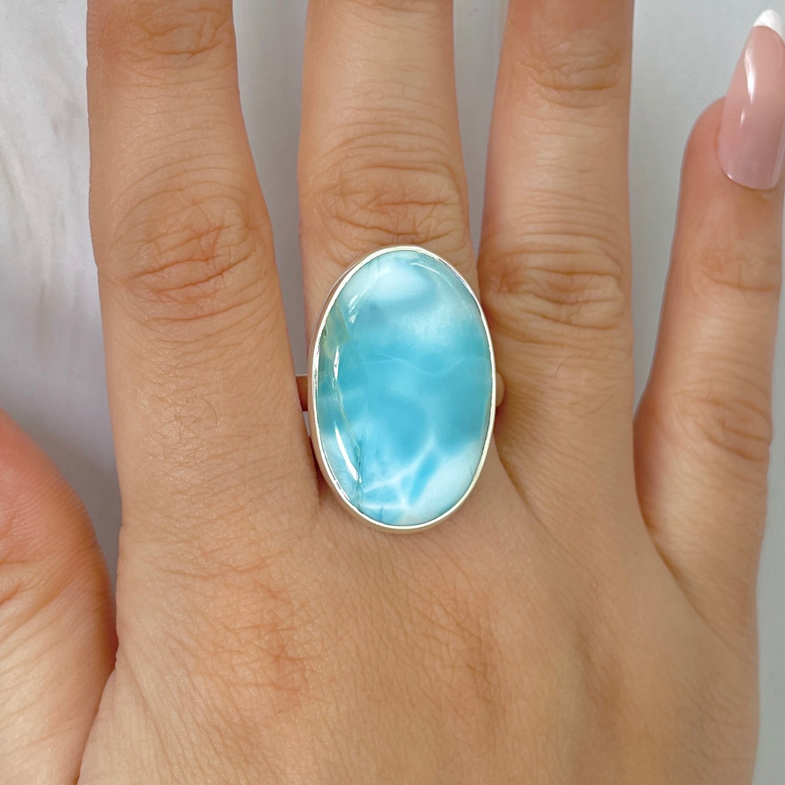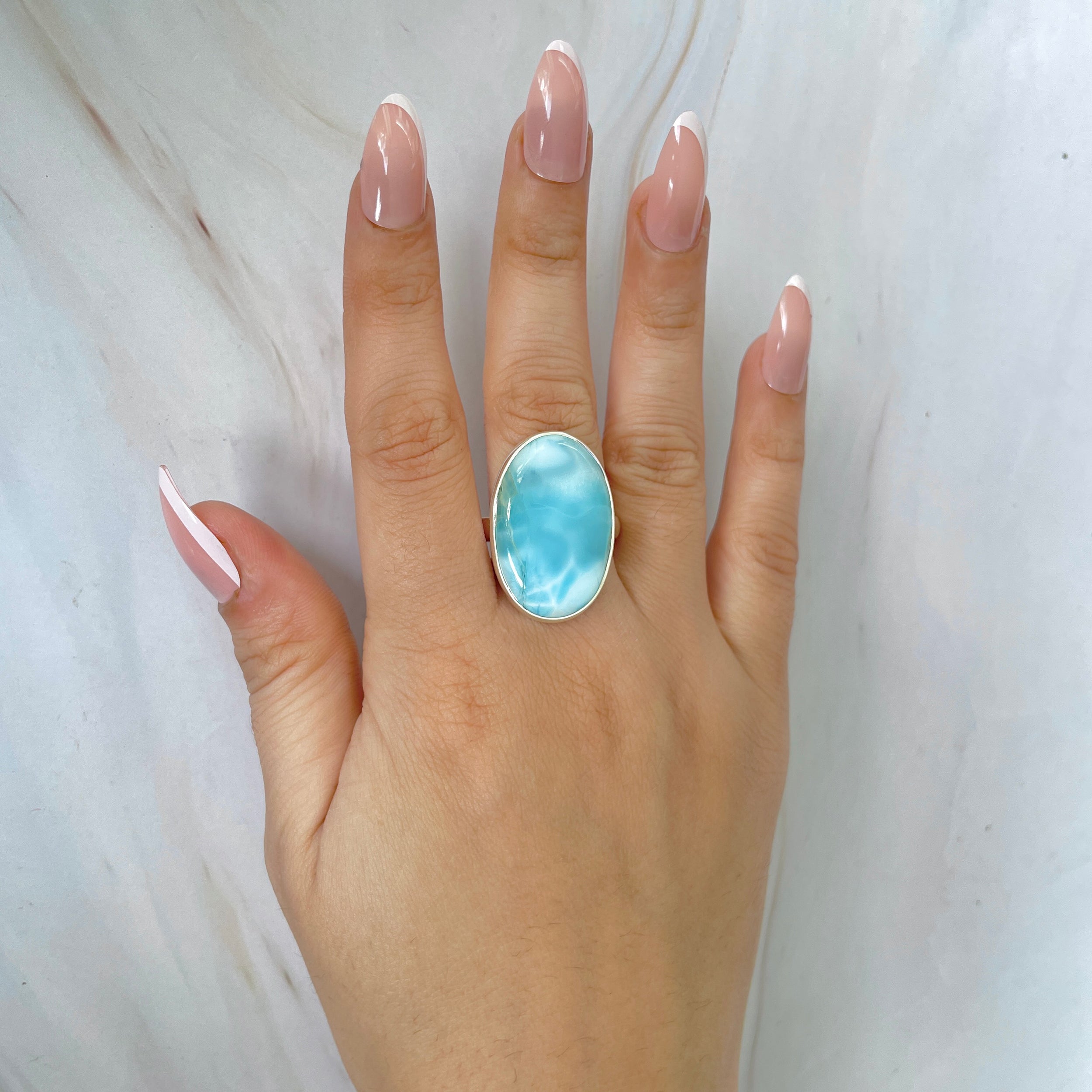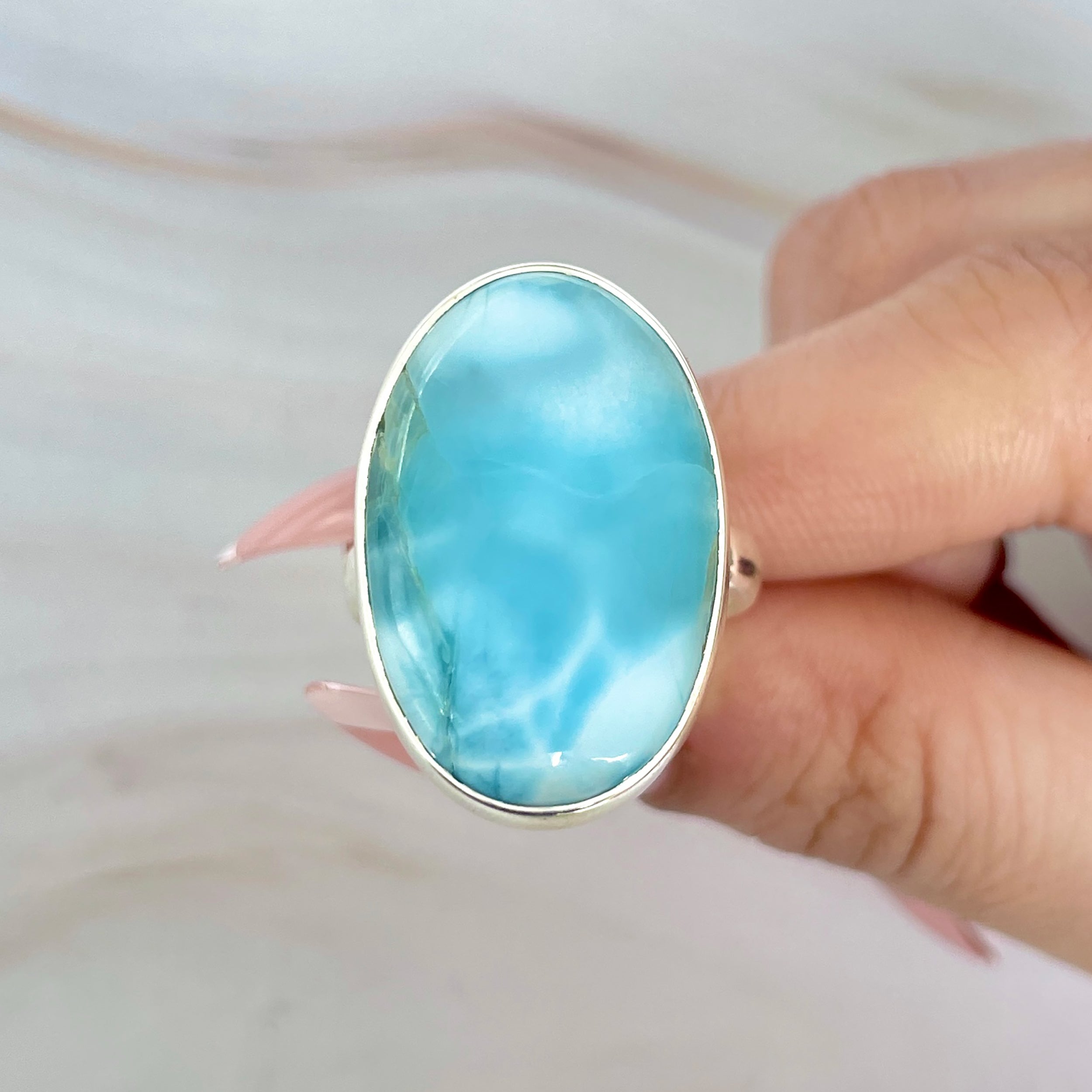 Регулируемият дизайн осигурява комфорт и универсалност, превръщайки този пръстен в подходящ избор както за всекидневно носене, така и за специални моменти. Като уникална творба, всеки пръстен с ларимар носи отпечатъка на природата, превръщайки се в нещо повече от бижу – в личен талисман.