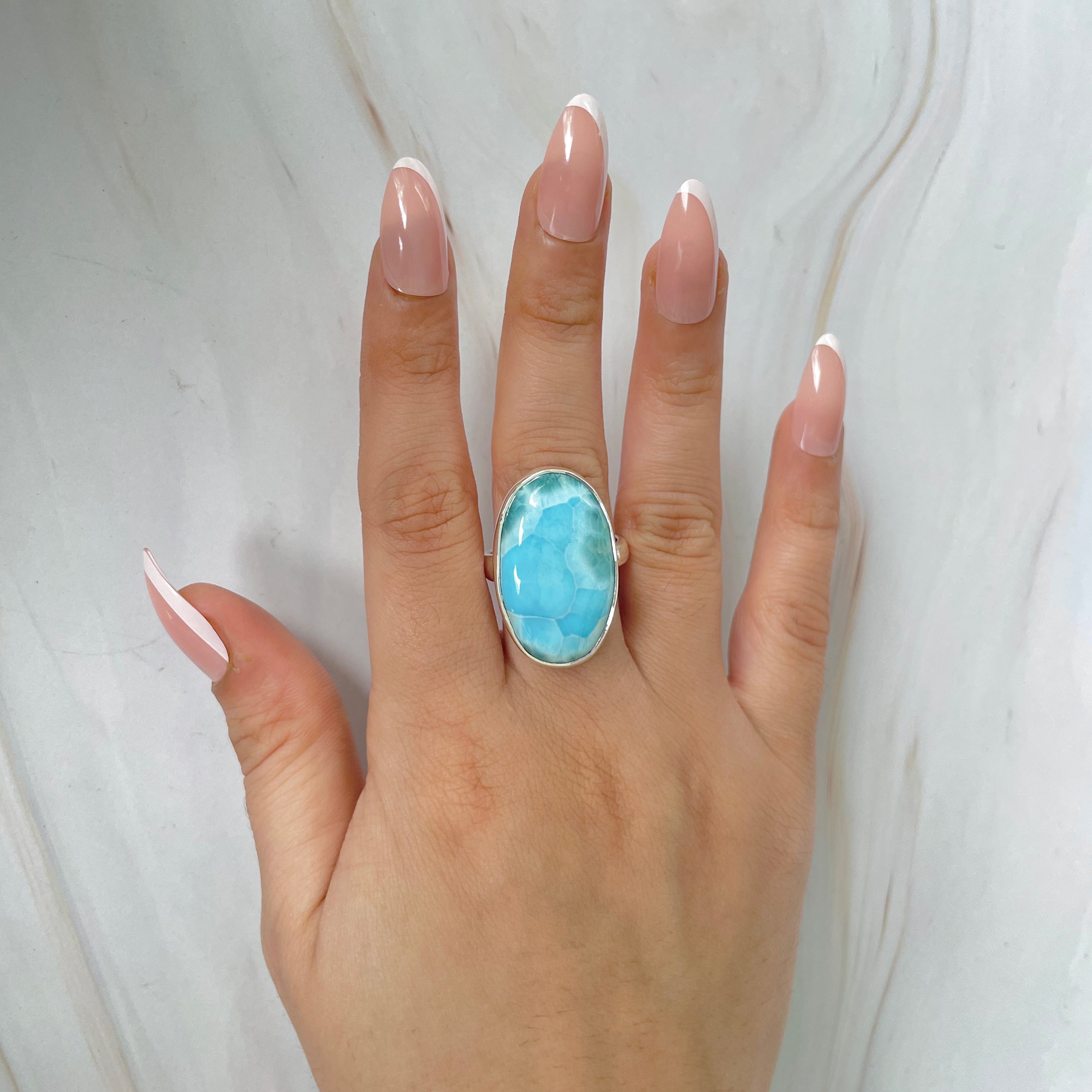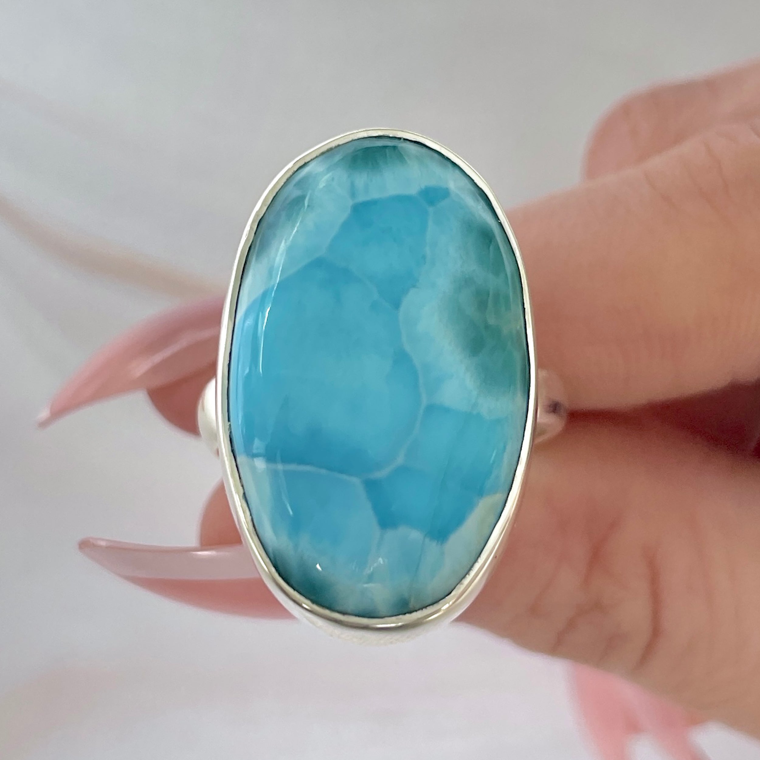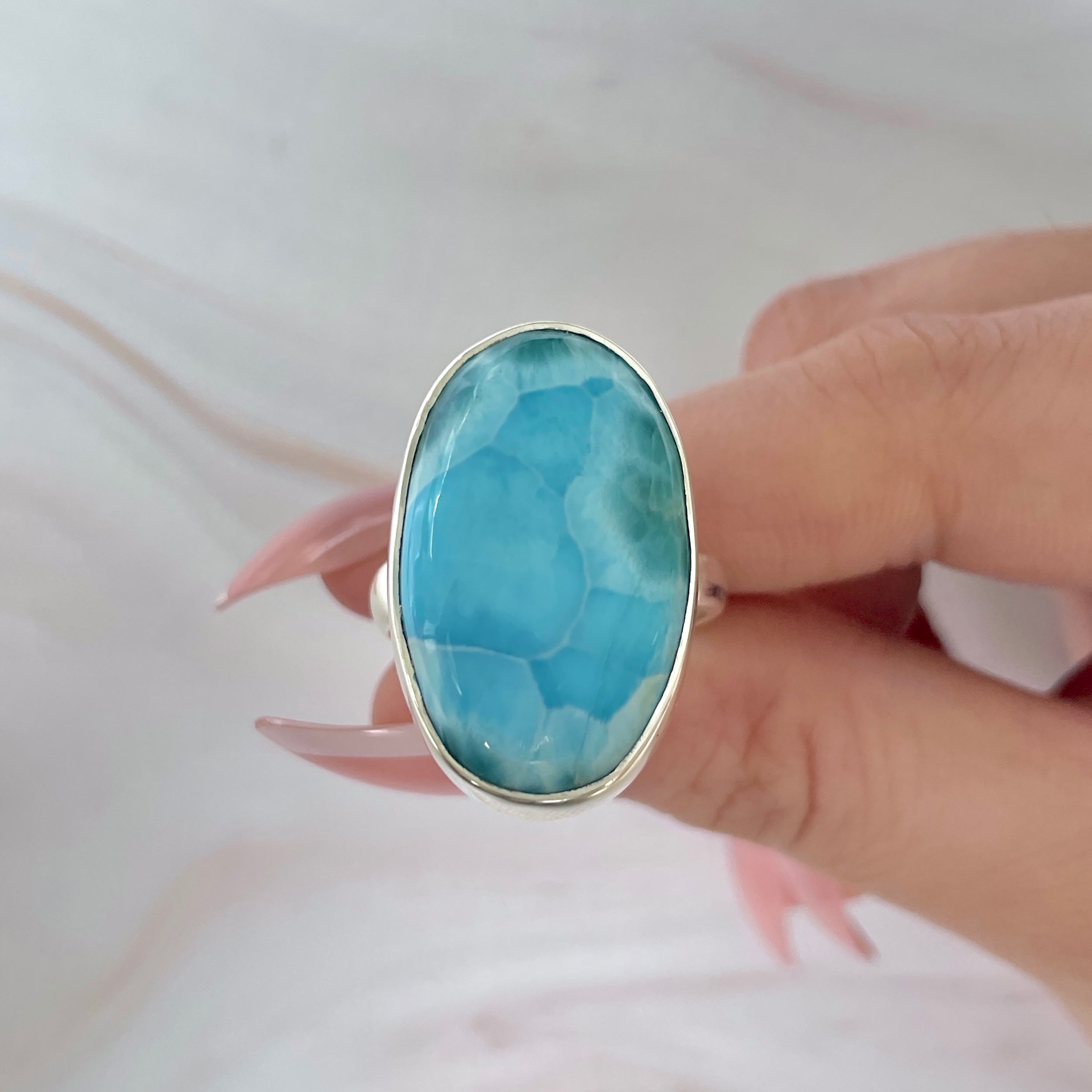 Уникален пръстен от натурален ларимар, известен като камъкът на небето и океана. Неговите нюанси на аквамариново синьо с бели отблясъци като морски вълни носят вътрешен покой и усещане за безкрайна свобода.