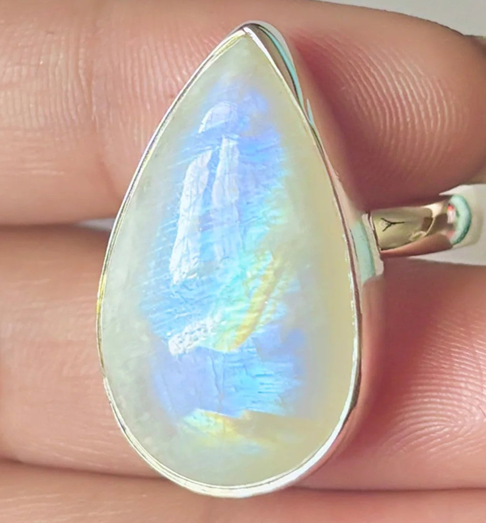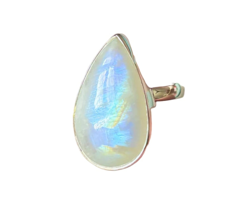 Уникален пръстен с дъгов лунен камък, който излъчва мистерия и изтънченост. Сините и златистите отблясъци се разкриват в нежни вълни от светлина, подобно на затъмнение, което танцува между сянка и блясък.