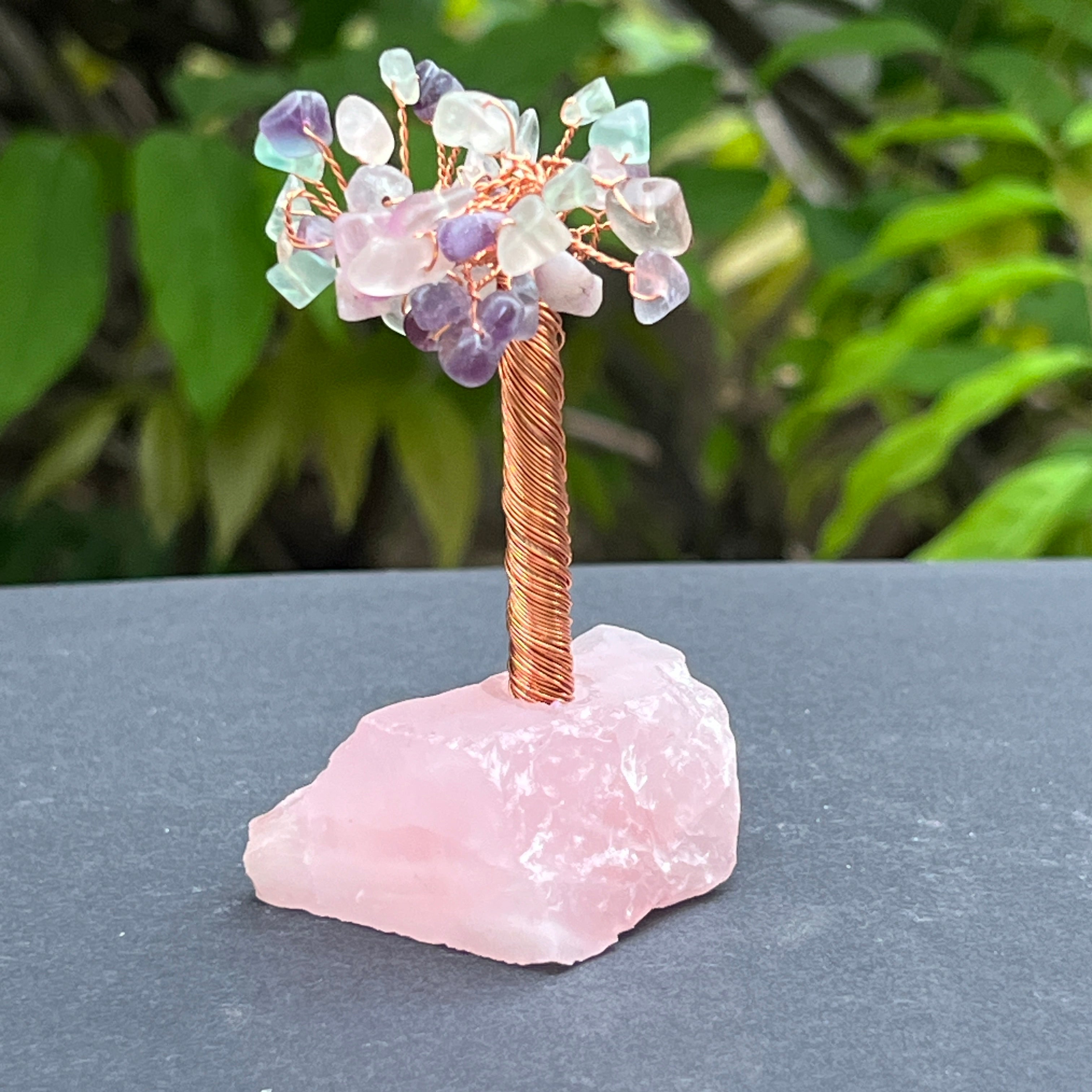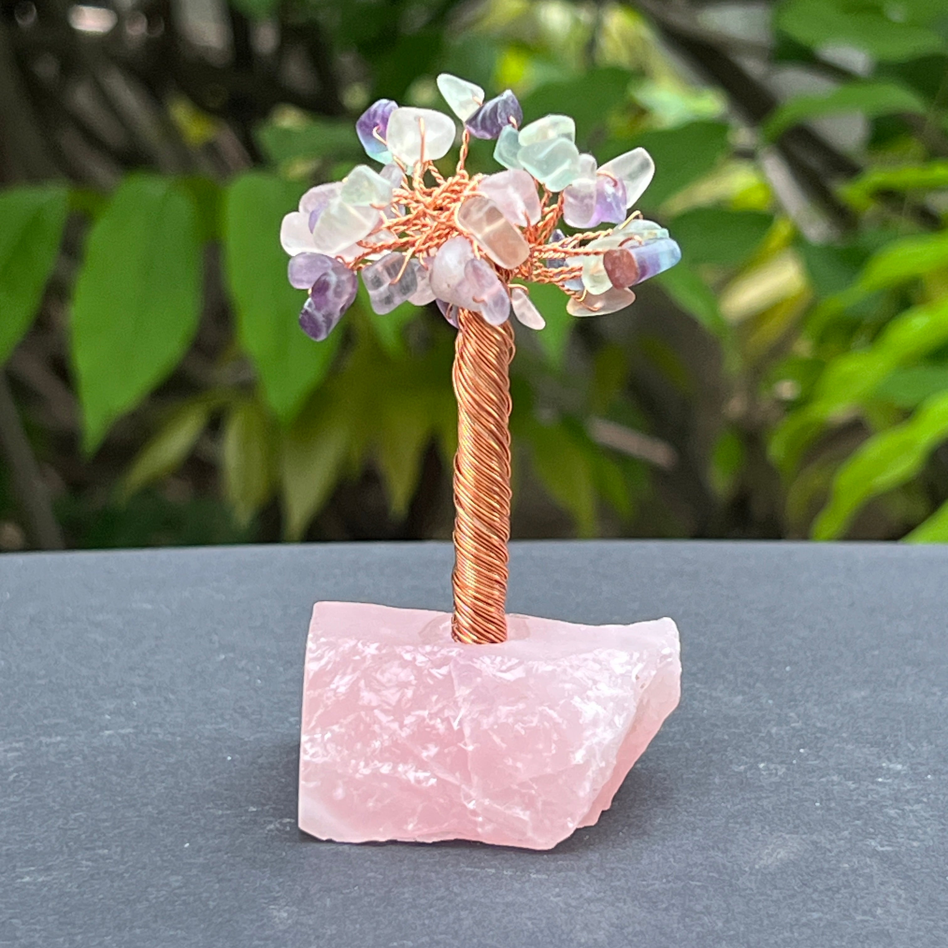 Това дърво фън шуй съчетава енергията на умствената яснота с нежните вибрации на любовта и емоционалния баланс. Листата са направени от флуорит, камък, свързан във фън шуй с фокус, психическа защита и баланс между логика и интуиция. Плътната основа е направена от суров розов кварц, известен като сърдечен камък, който поддържа любов, емоционално изцеление и състрадание.