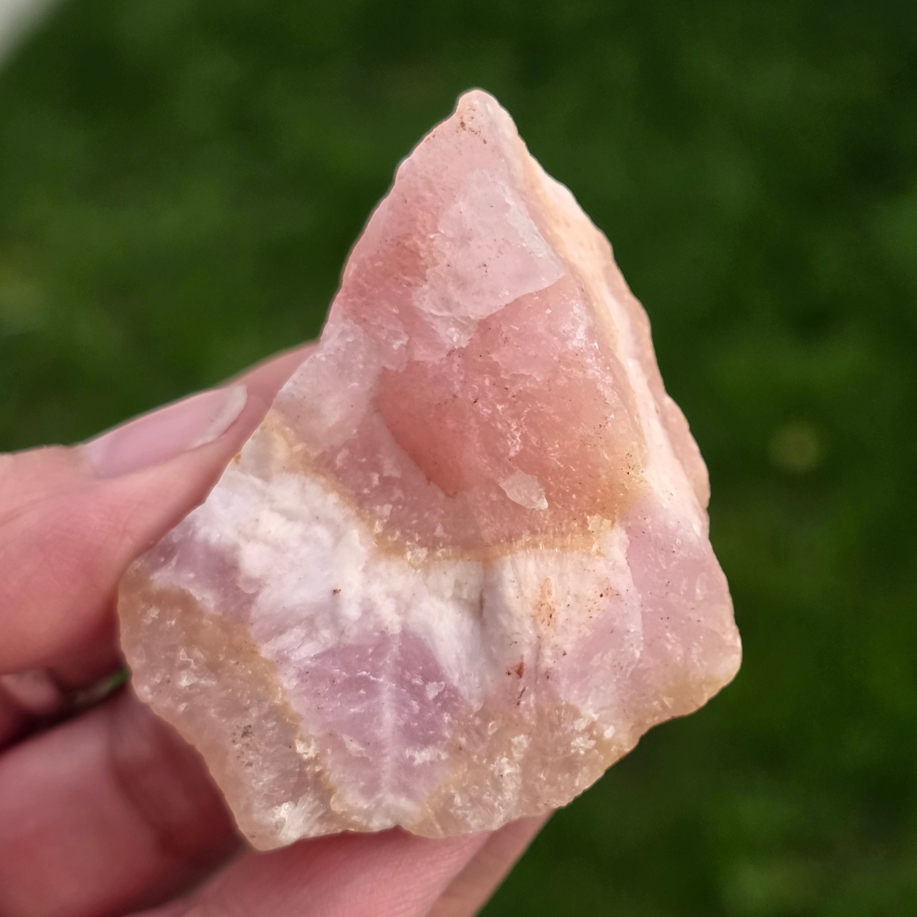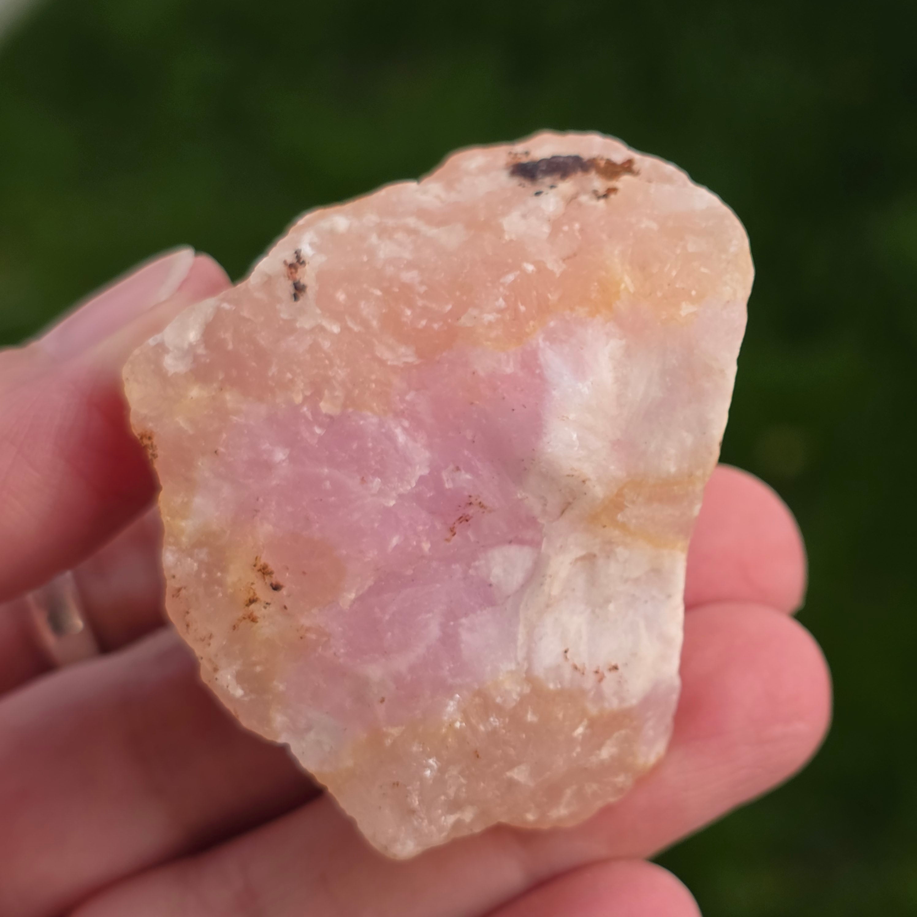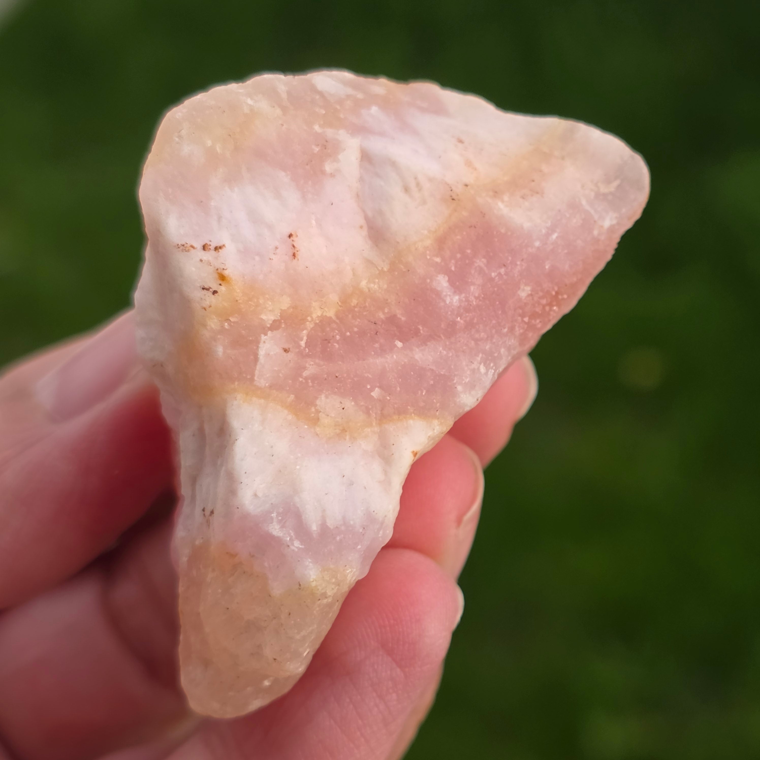 Розовият арагонит е рядък полускъпоценен камък. Състои се от калциев карбонат и има розово-оранжев цвят поради примеси на желязо.