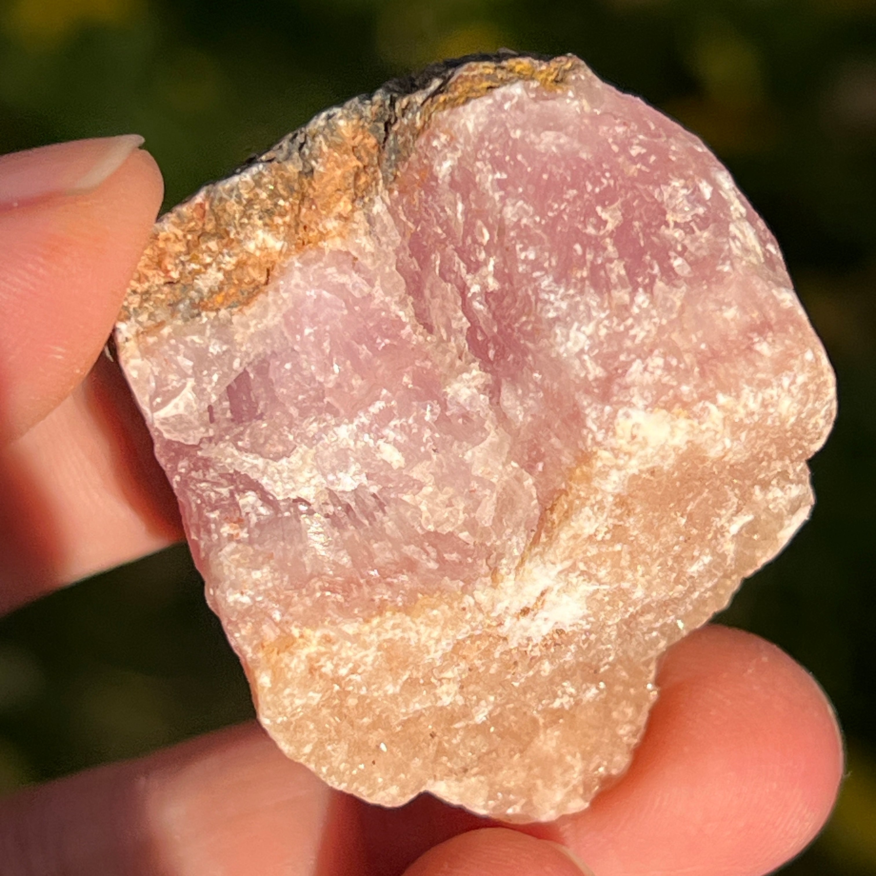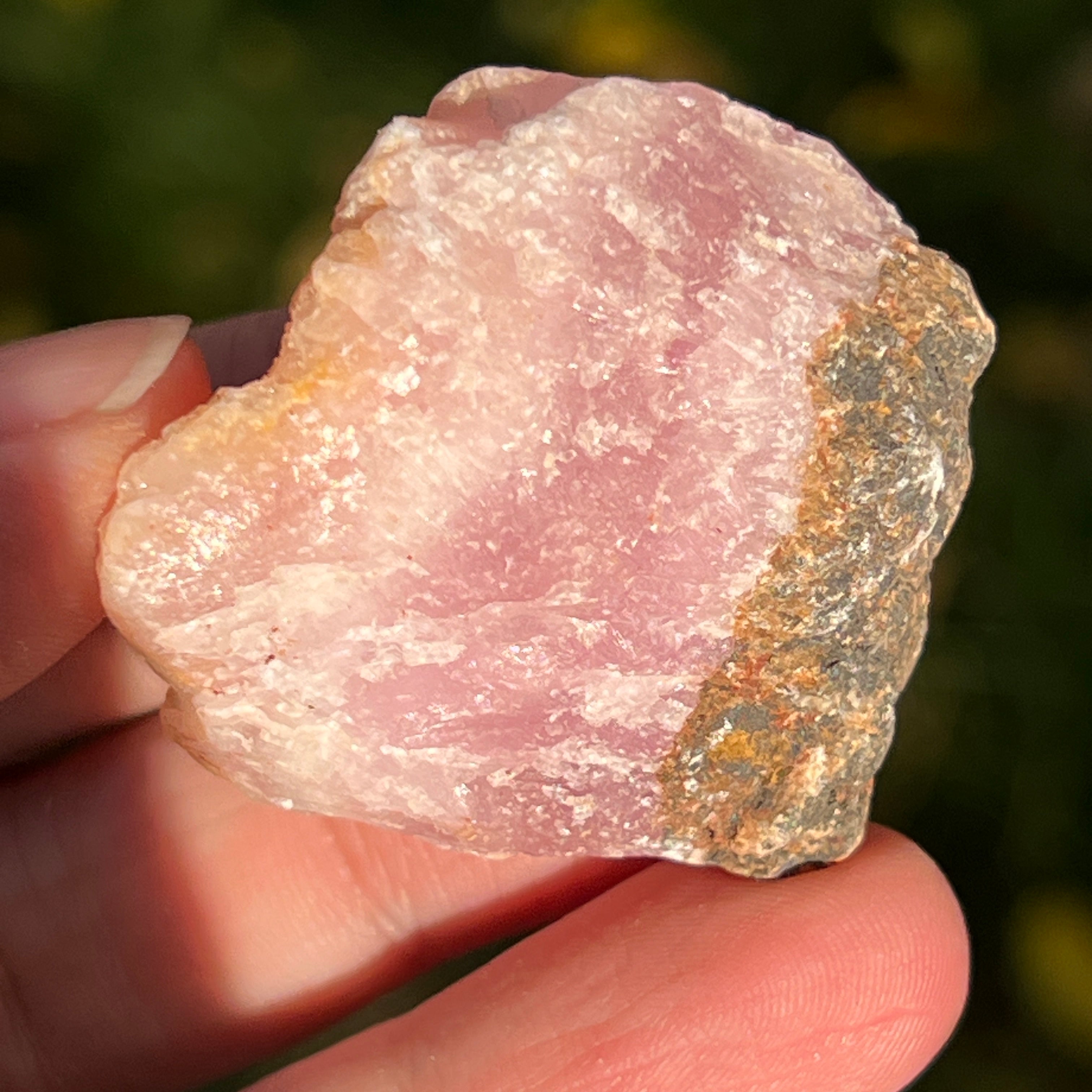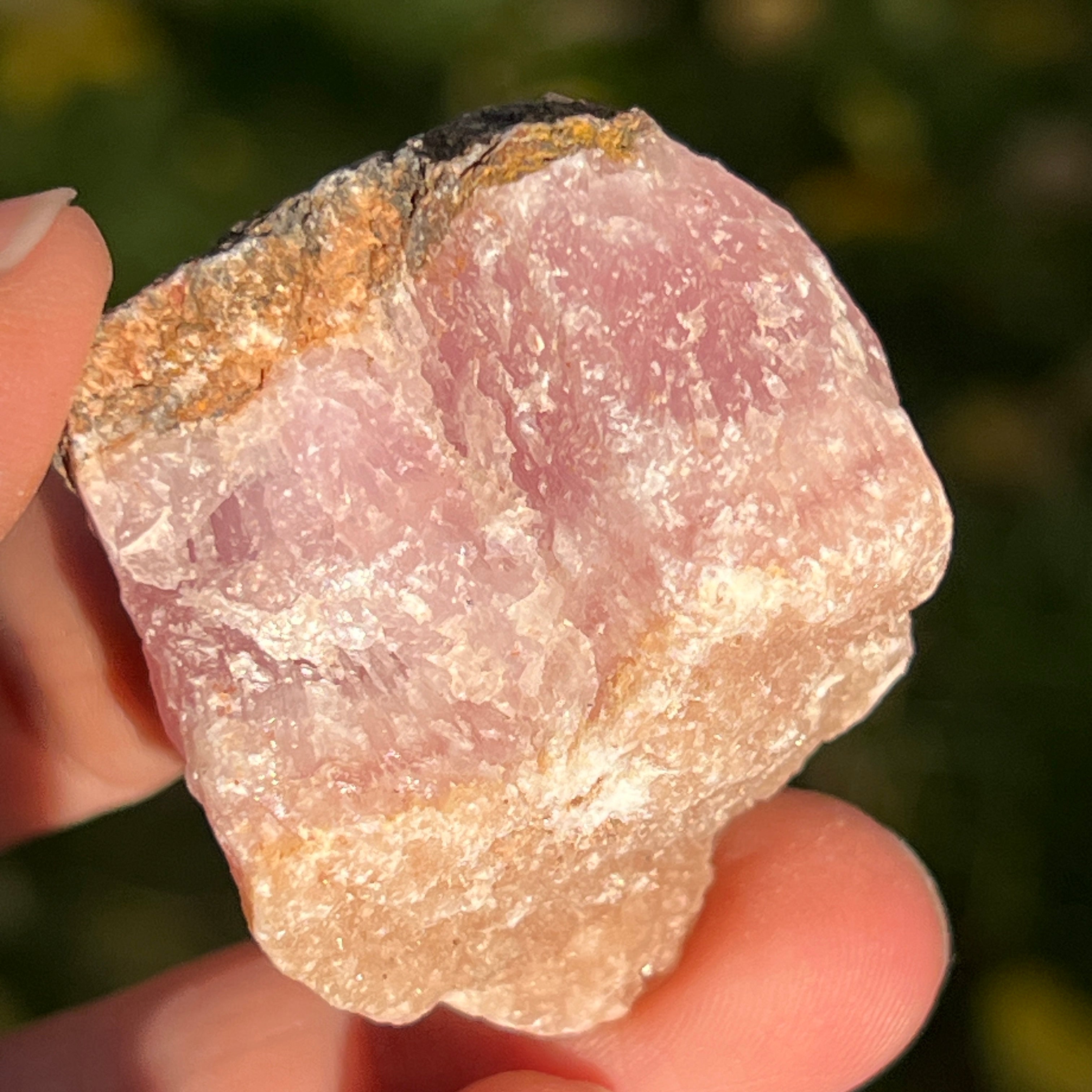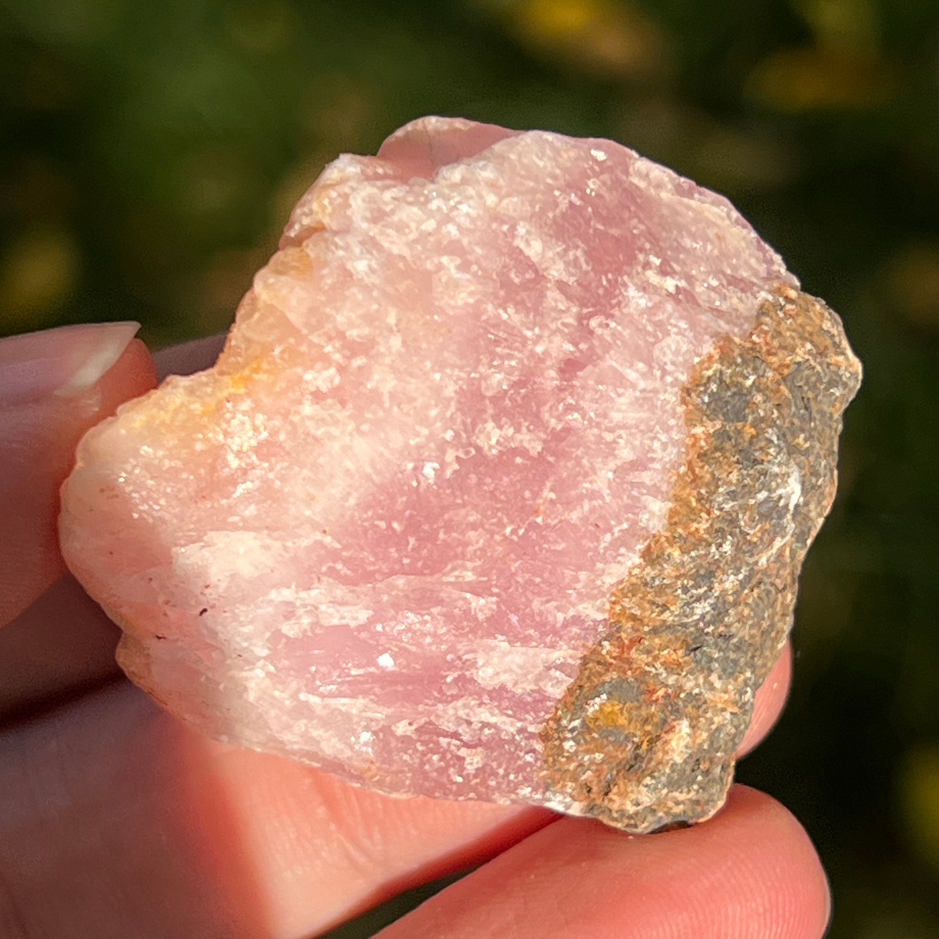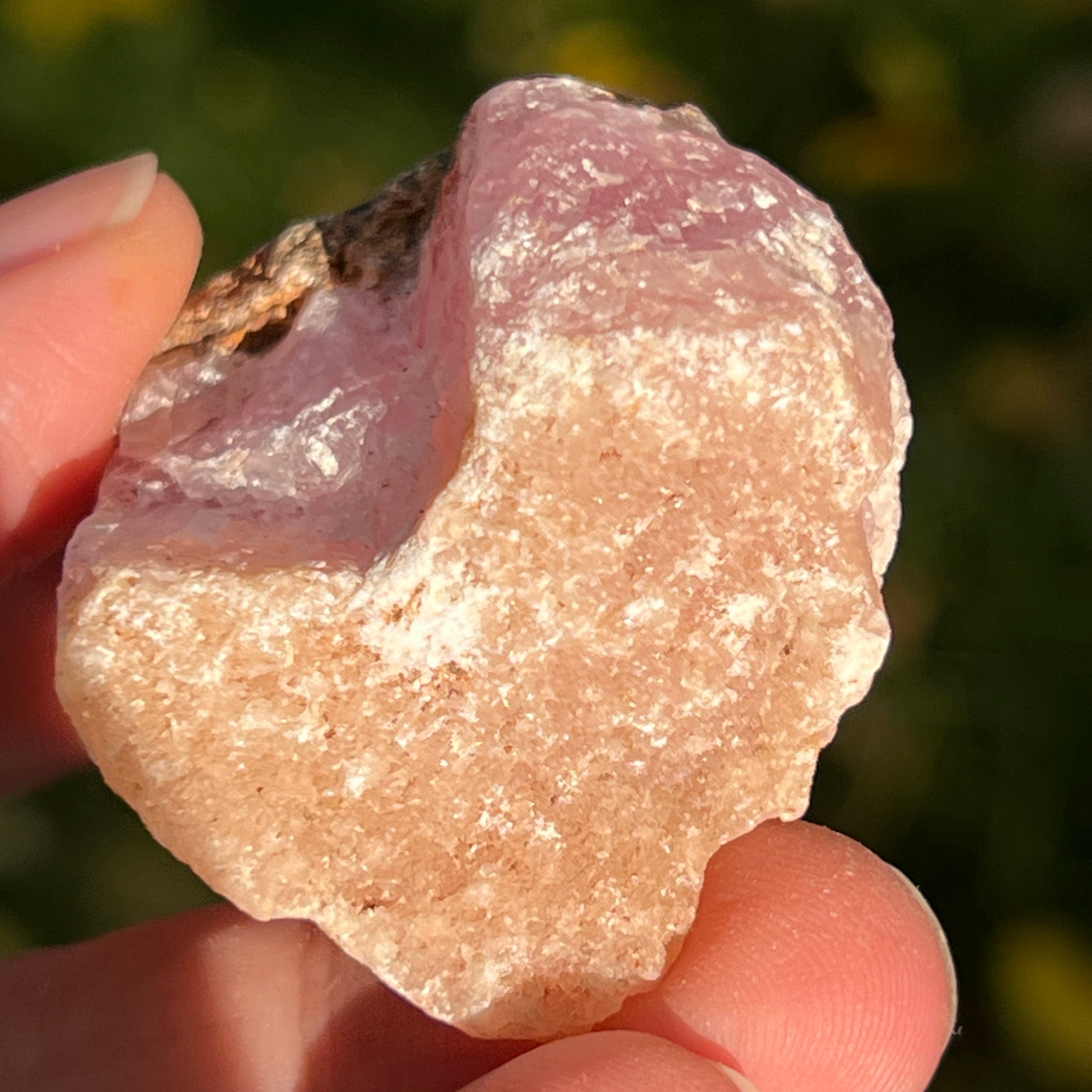 Розовият арагонит е рядък полускъпоценен камък. Състои се от калциев карбонат и има розово-оранжев цвят поради примеси на желязо.