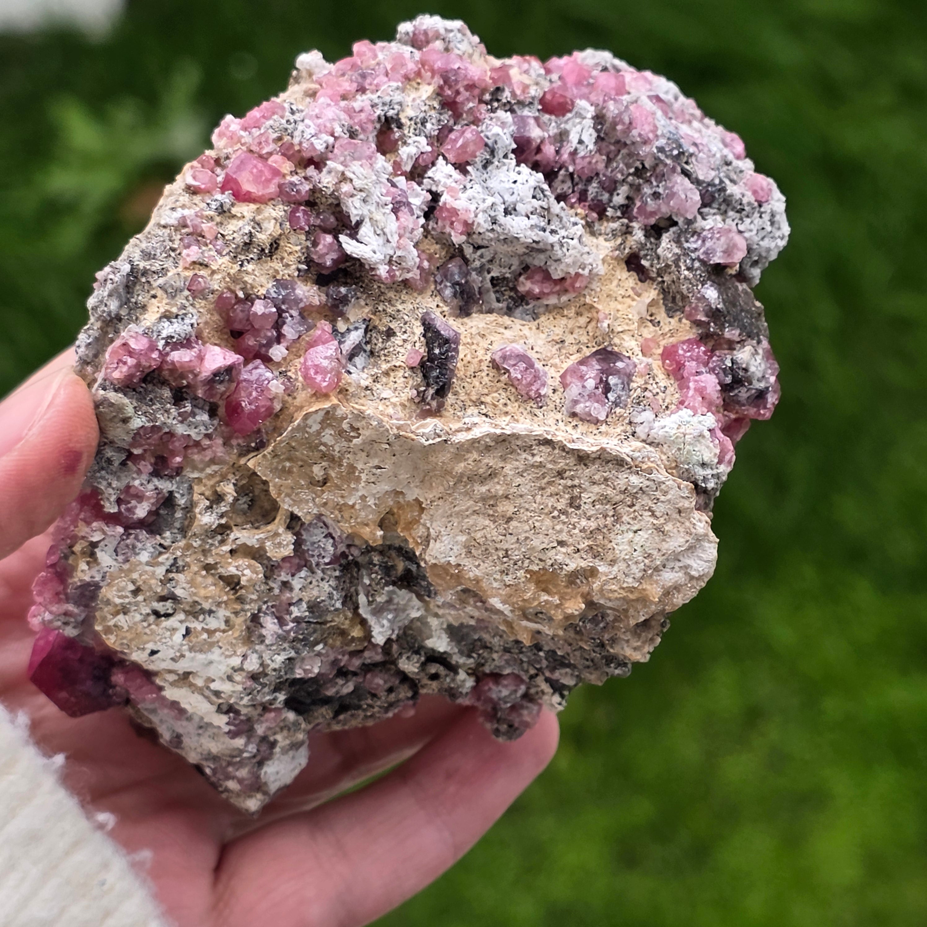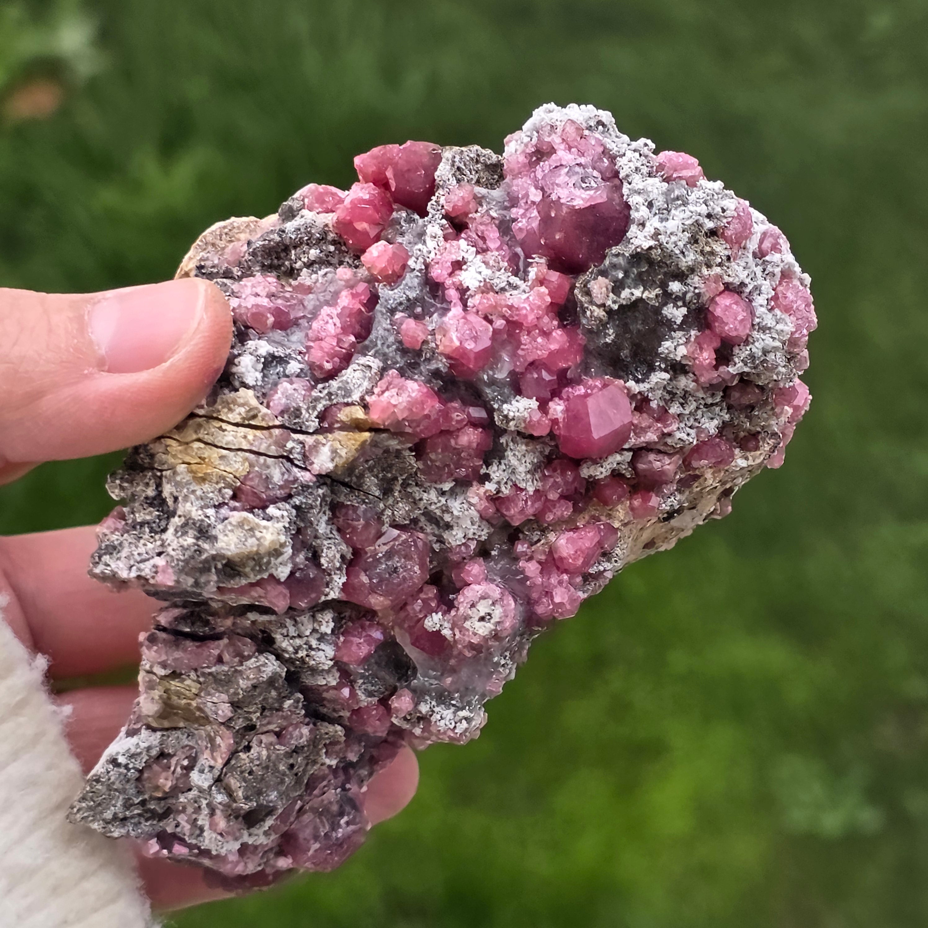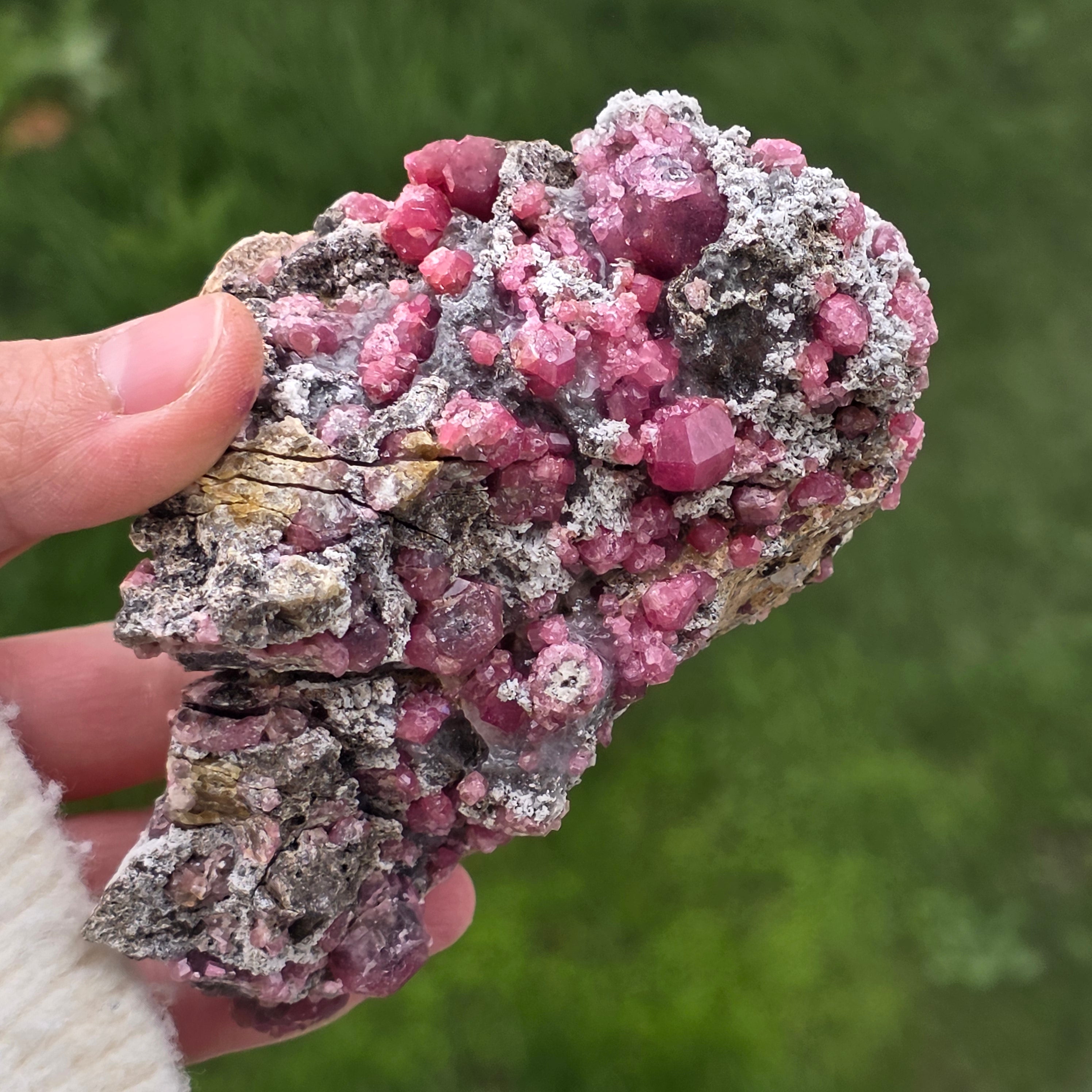 Розовите гранатови кристали са видими директно в матрицата, с добре дефинирани естествени форми, органично израснали в структурата на скалата. Контрастът между топлите нюанси на граната и суровата текстура на матрицата придава на експоната балансиран и автентичен вид, характерен за колекционерските образци. Присъствието на матрицата запазва контекста на формиране на минерала, повишавайки както естетическата, така и минералогичната му стойност.
