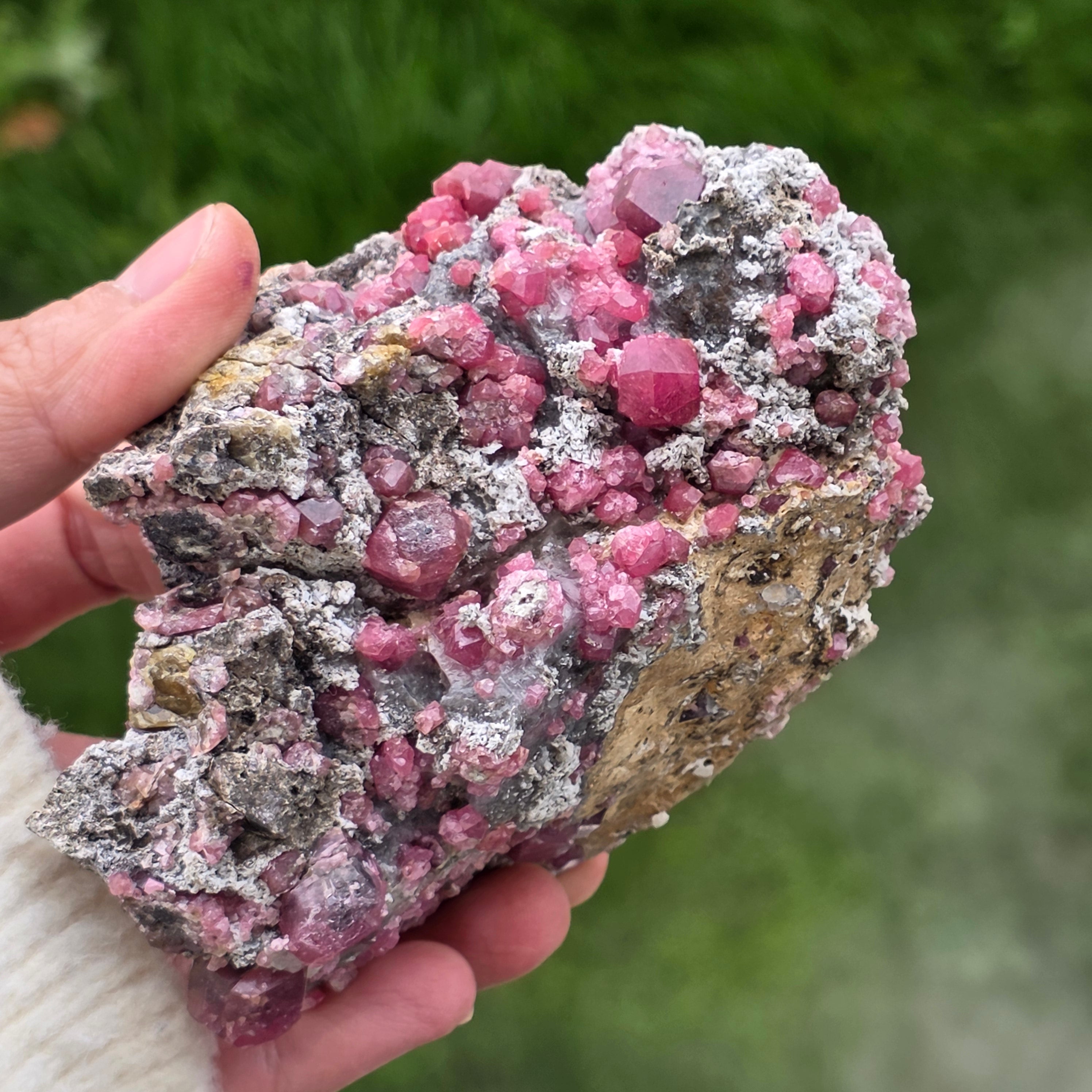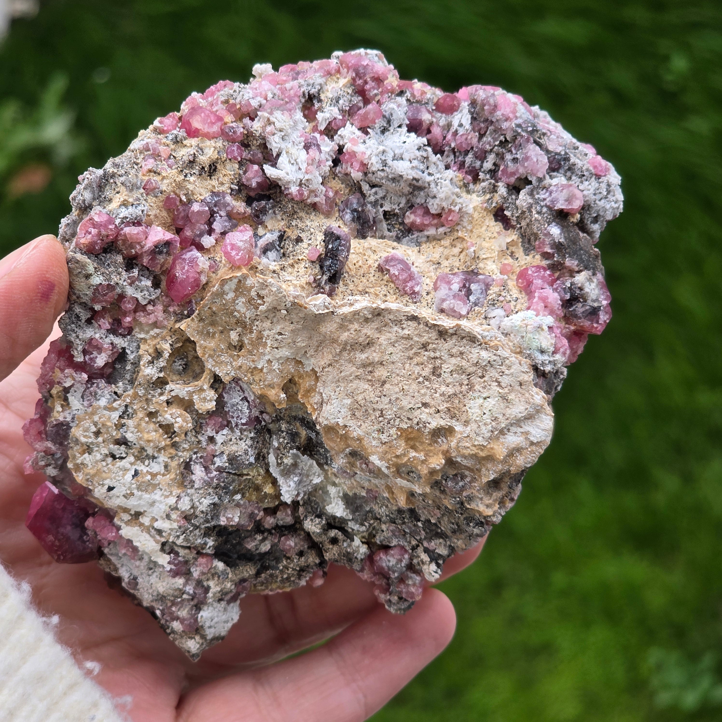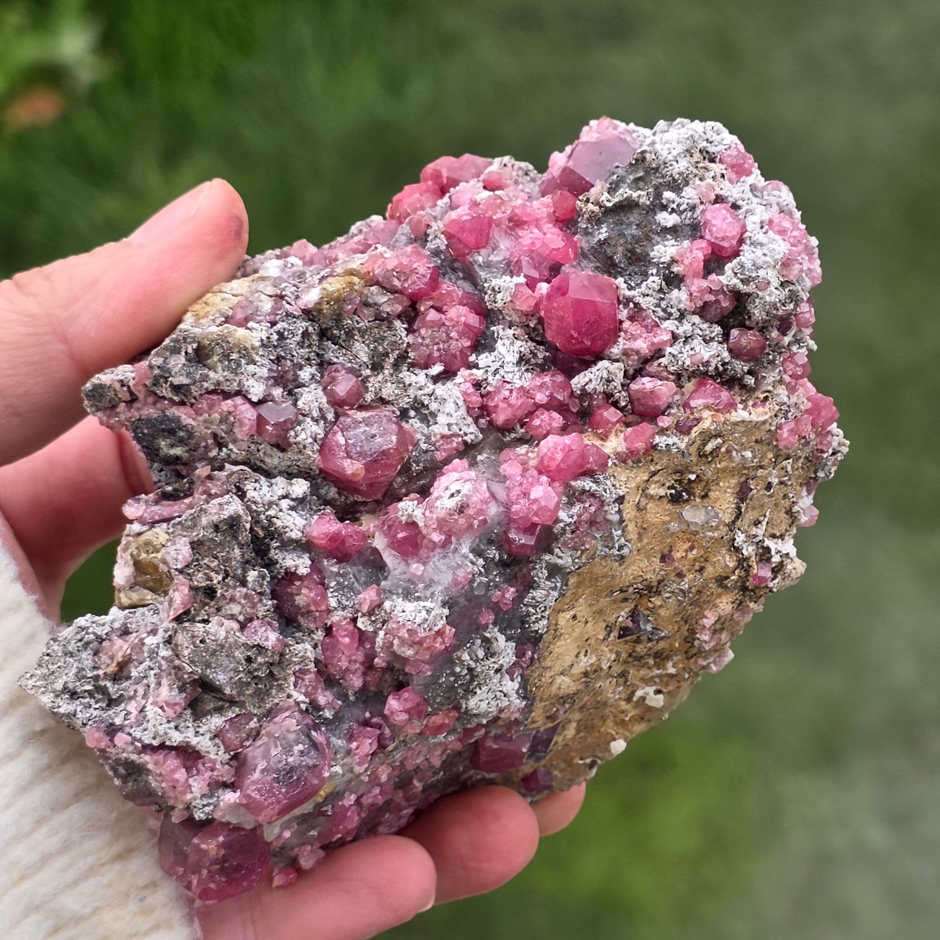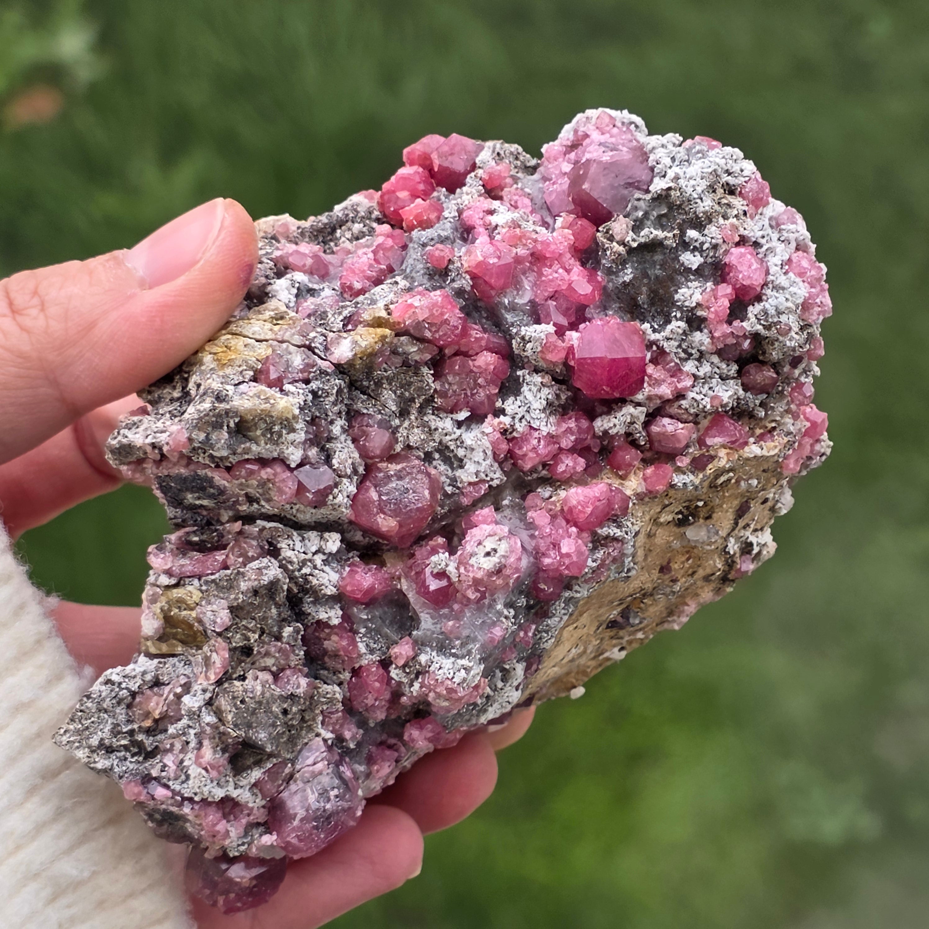 Розовите гранатови кристали са видими директно в матрицата, с добре дефинирани естествени форми, органично израснали в структурата на скалата. Контрастът между топлите нюанси на граната и суровата текстура на матрицата придава на експоната балансиран и автентичен вид, характерен за колекционерските образци. Присъствието на матрицата запазва контекста на формиране на минерала, повишавайки както естетическата, така и минералогичната му стойност.
