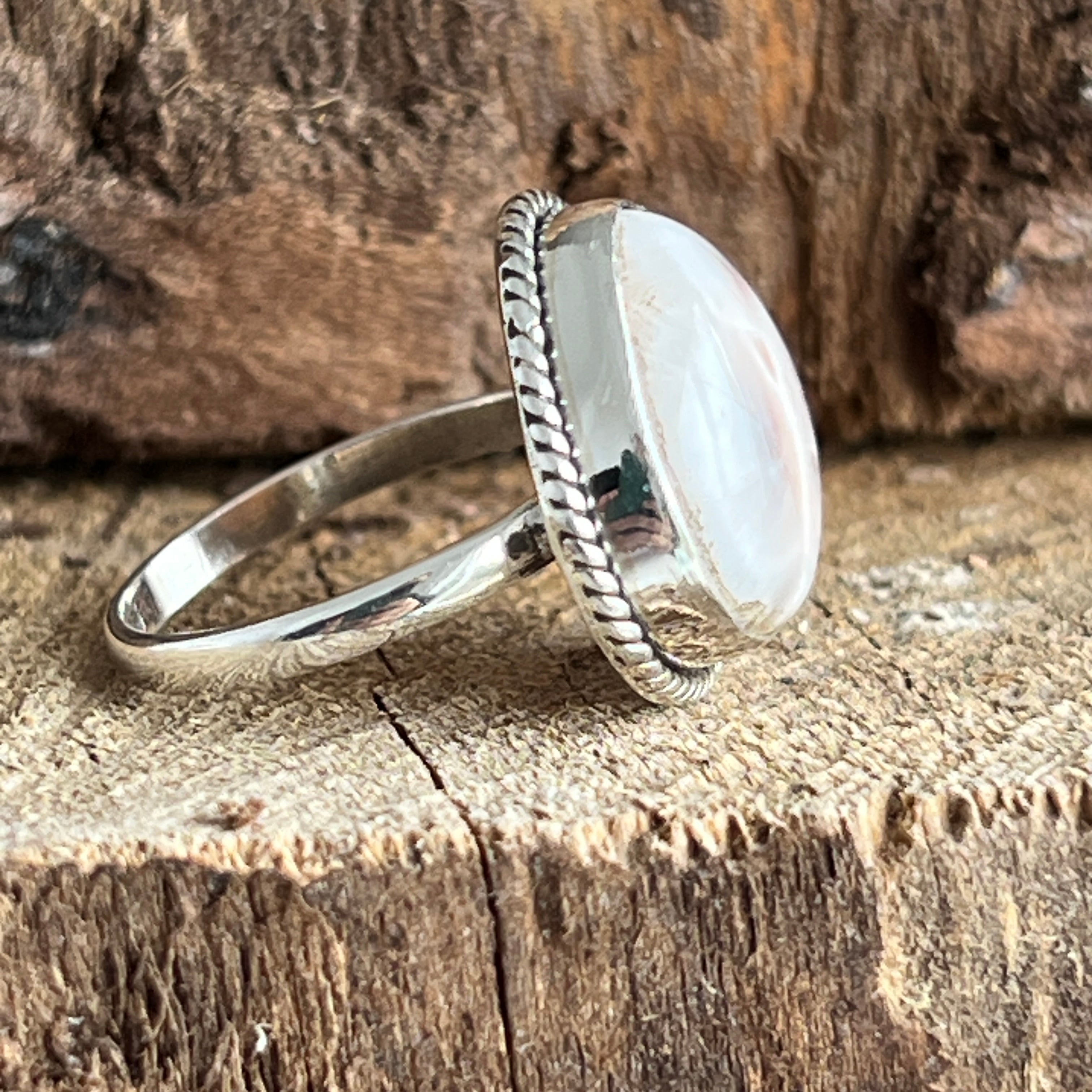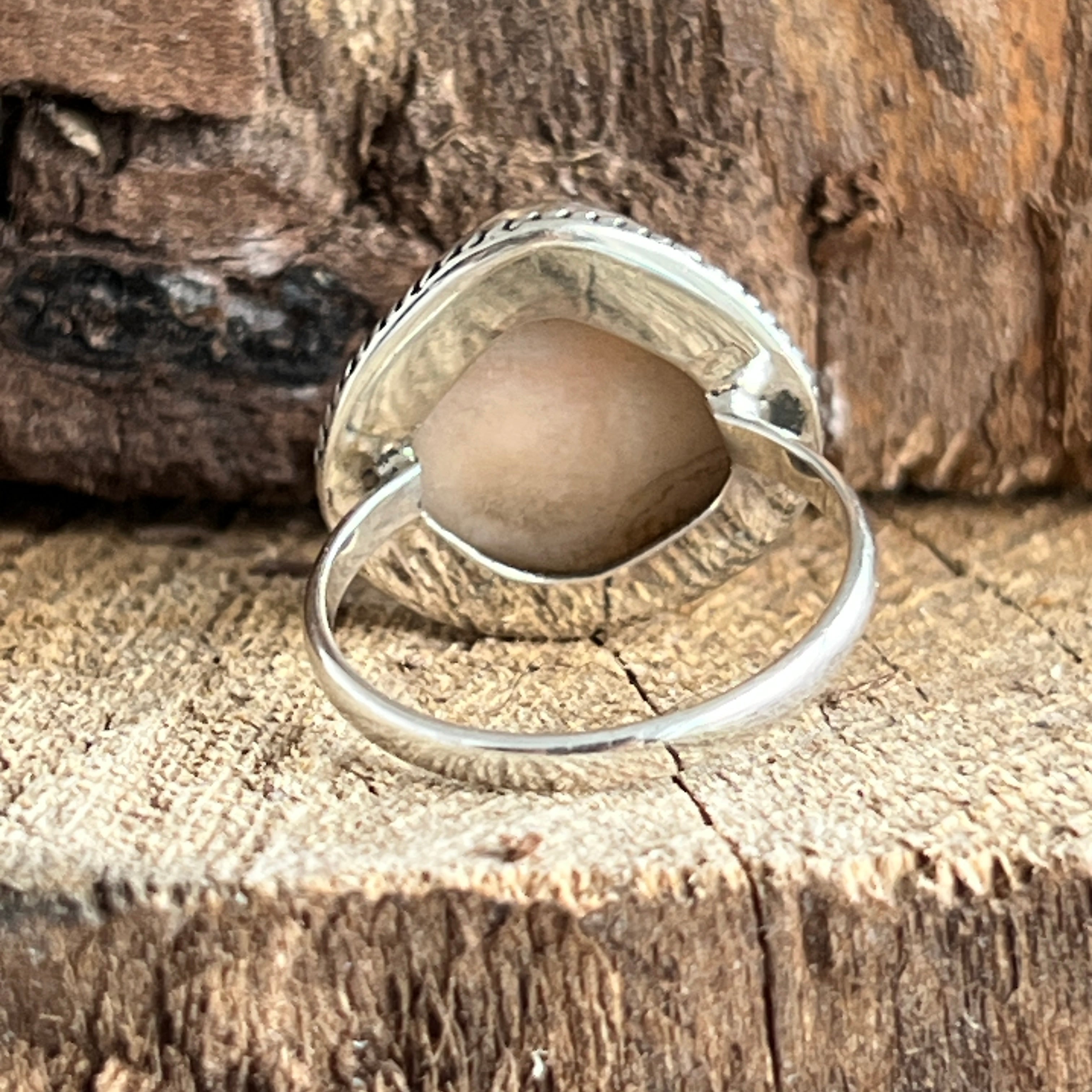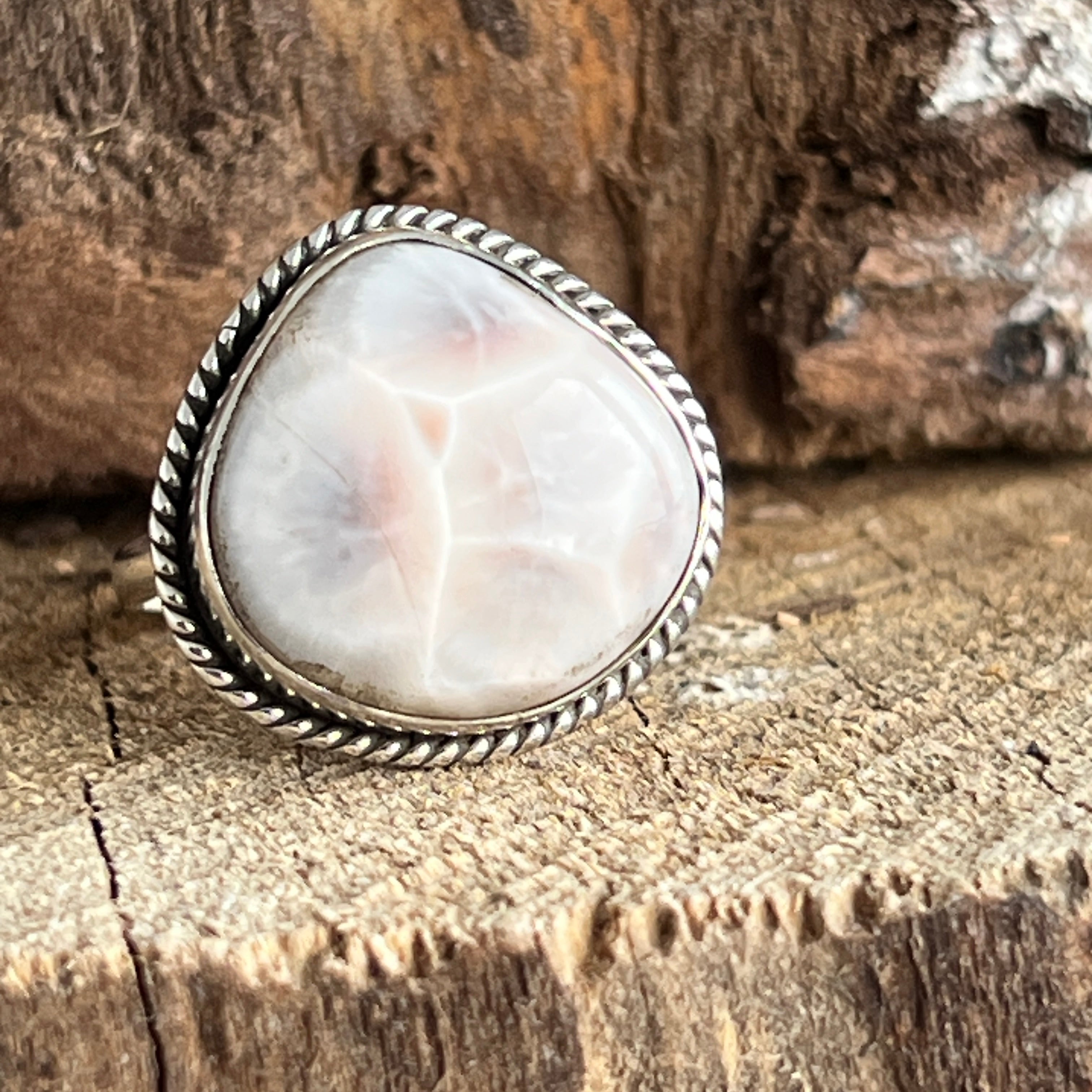 Пръстенът от сребро 925 излъчва деликатна и спокойна красота, благодарение на камъка от Pink Larimar, рядък и изискан вид, с кадифени розови тонове и млечни отблясъци.
