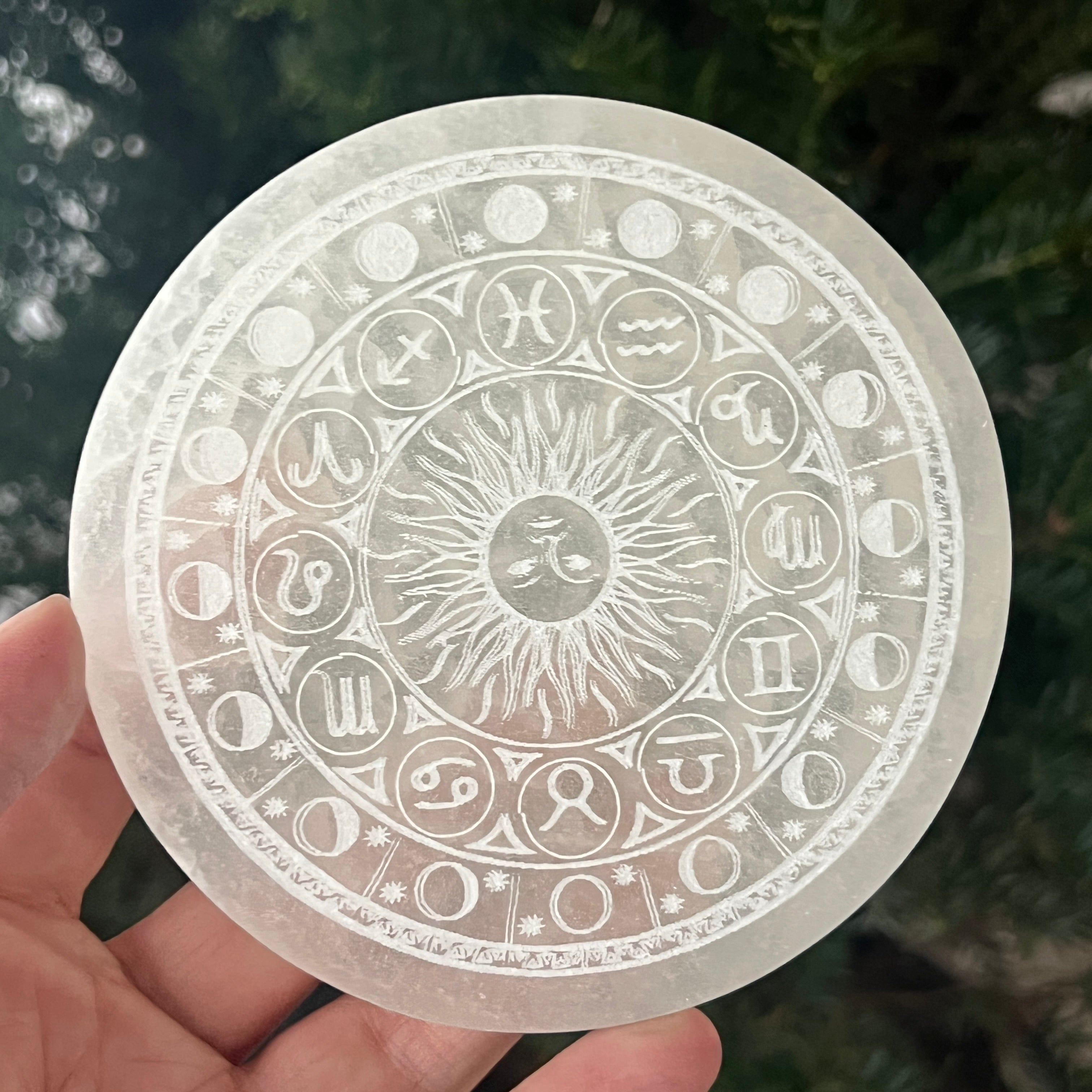 Избери този Селенитов диск със зодиакални символи като инструмент за пречистване и повторно свързване с ритмите на Вселената.