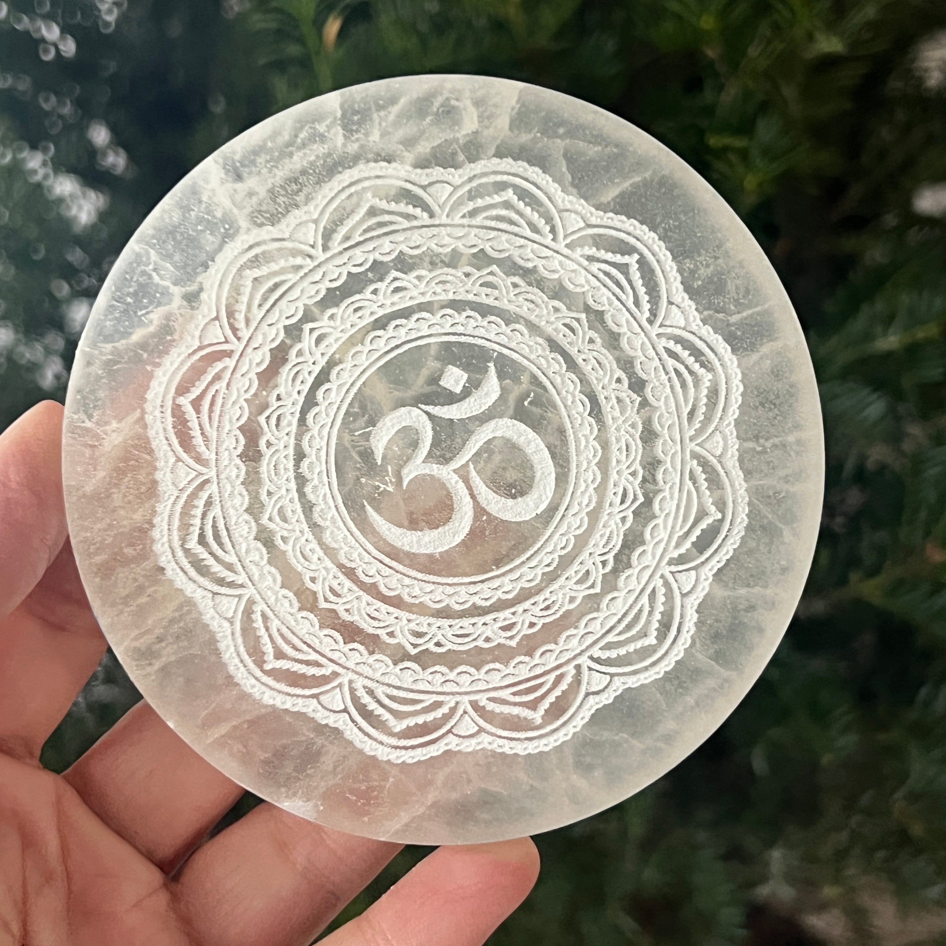 Този диск от селенит, гравиран със свещения символ Ом е изключително красив и духовно зареден. Мандала Ом представлява първичната вибрация на вселената, символизирайки единството и вътрешната хармония.