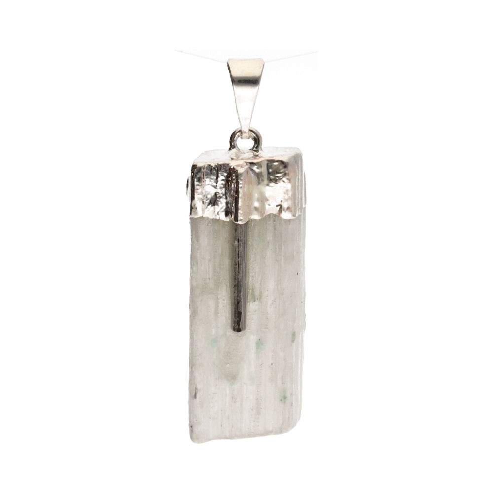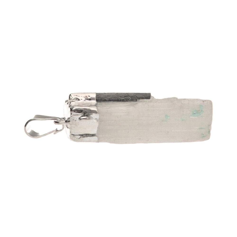Медальонът от селенит с турмалин, покрит със сребро, съчетава чистата светлина на селенита с защитната енергия на черния турмалин, усилена от блясъка на среброто.