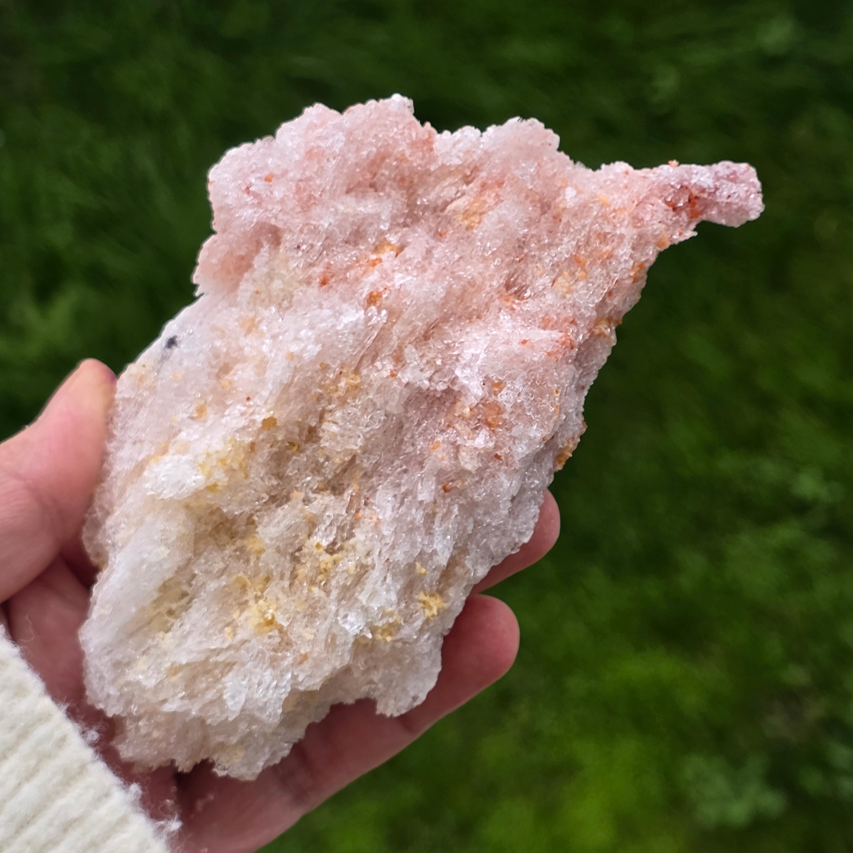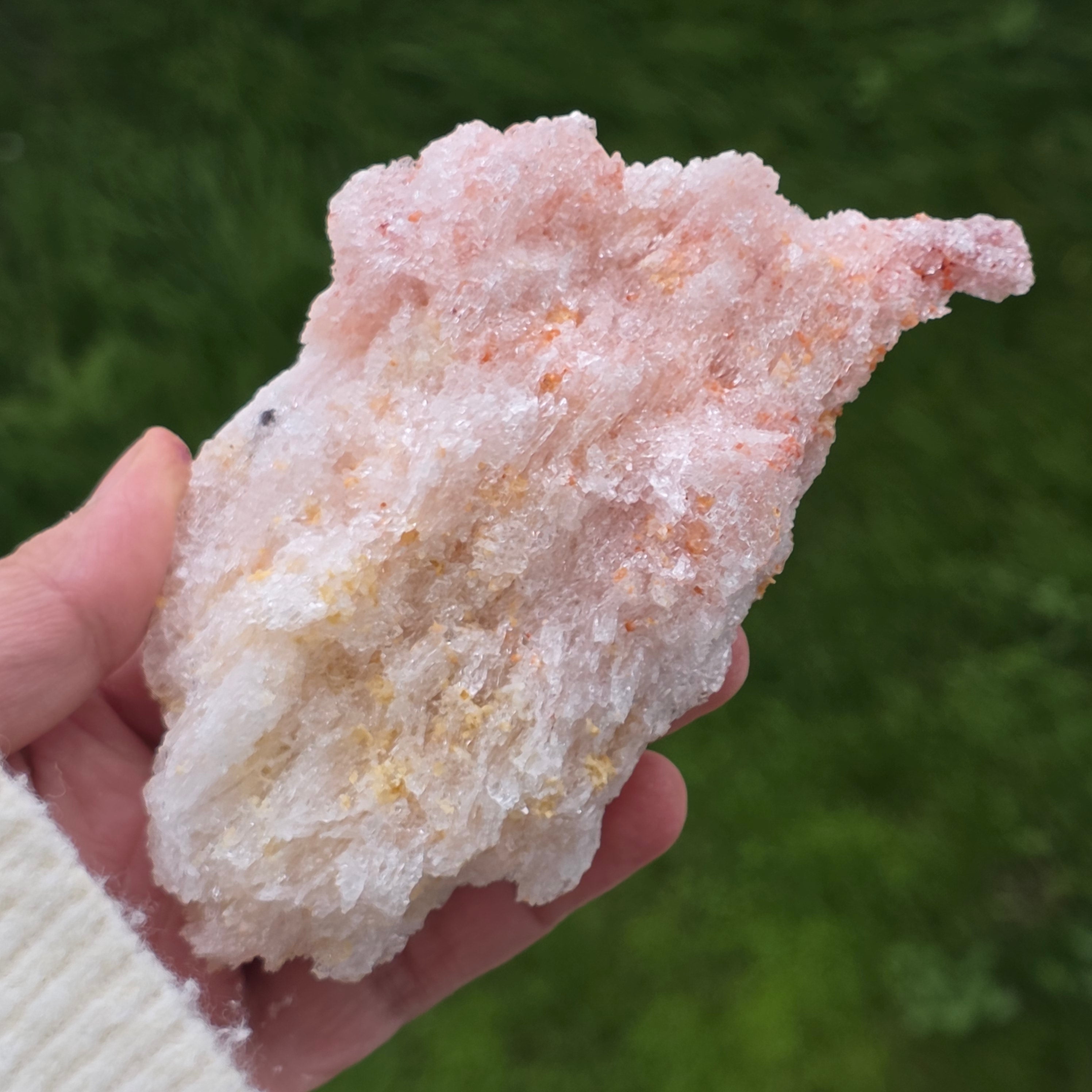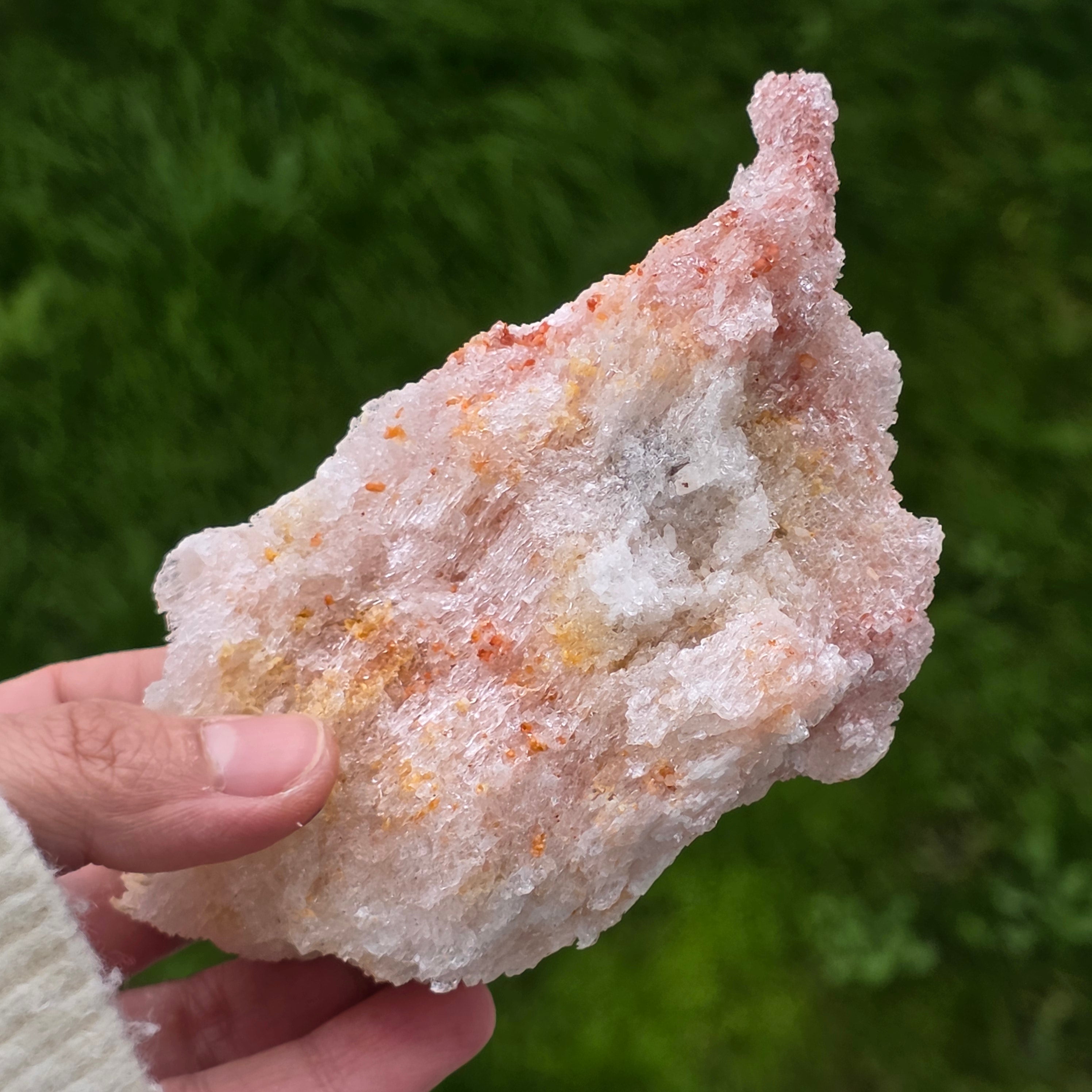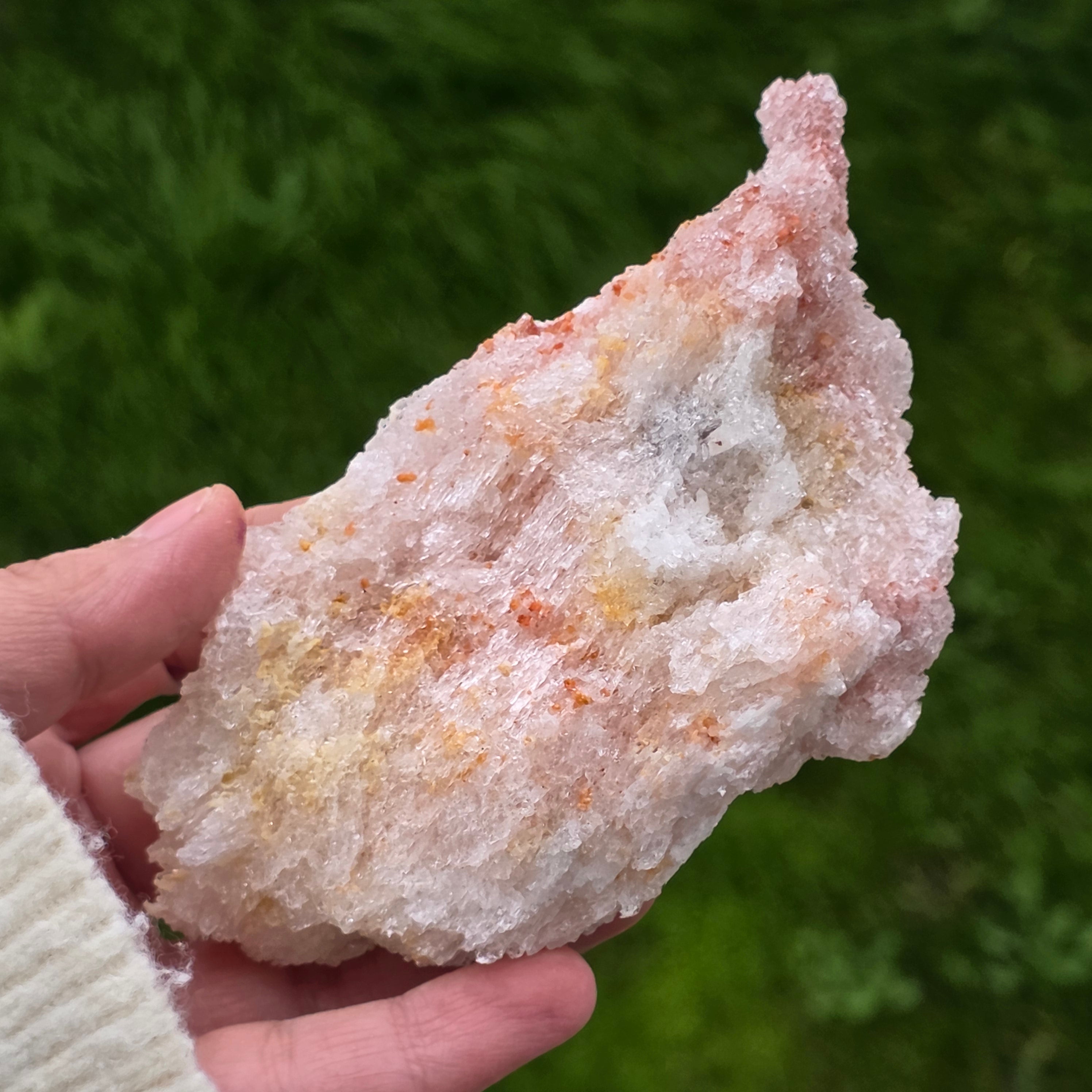 Резултатът е единна минералогична асоциация, в която бялата прозрачна матрица на селенита е пресечена или нацапана с червени киноварени включвания, без изкуствени граници. Двата минерала са тясно свързани структурно и визуално, киноварът подчертава формата и прозрачността на селенита, а селенитът акцентира върху наситения цвят на киновара.