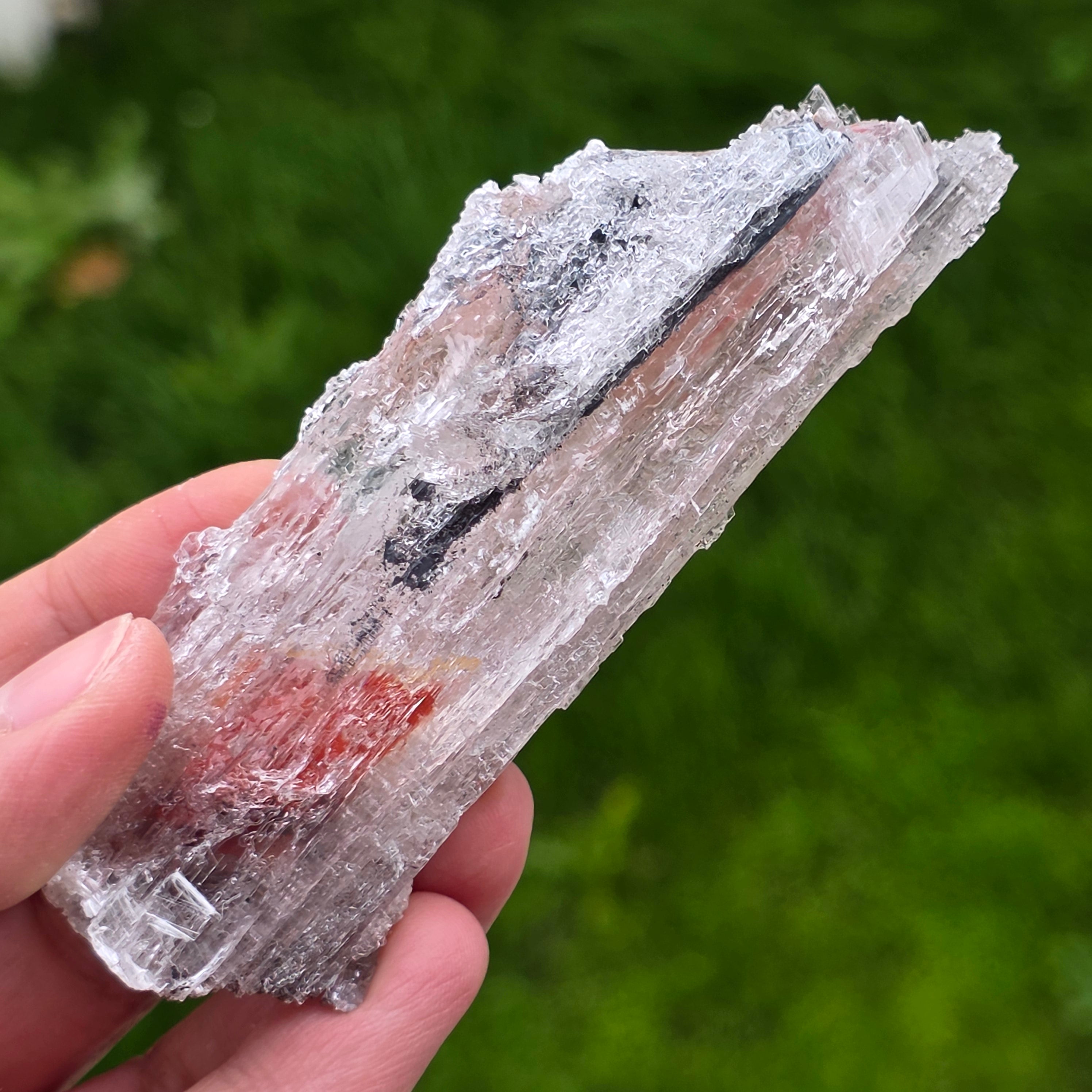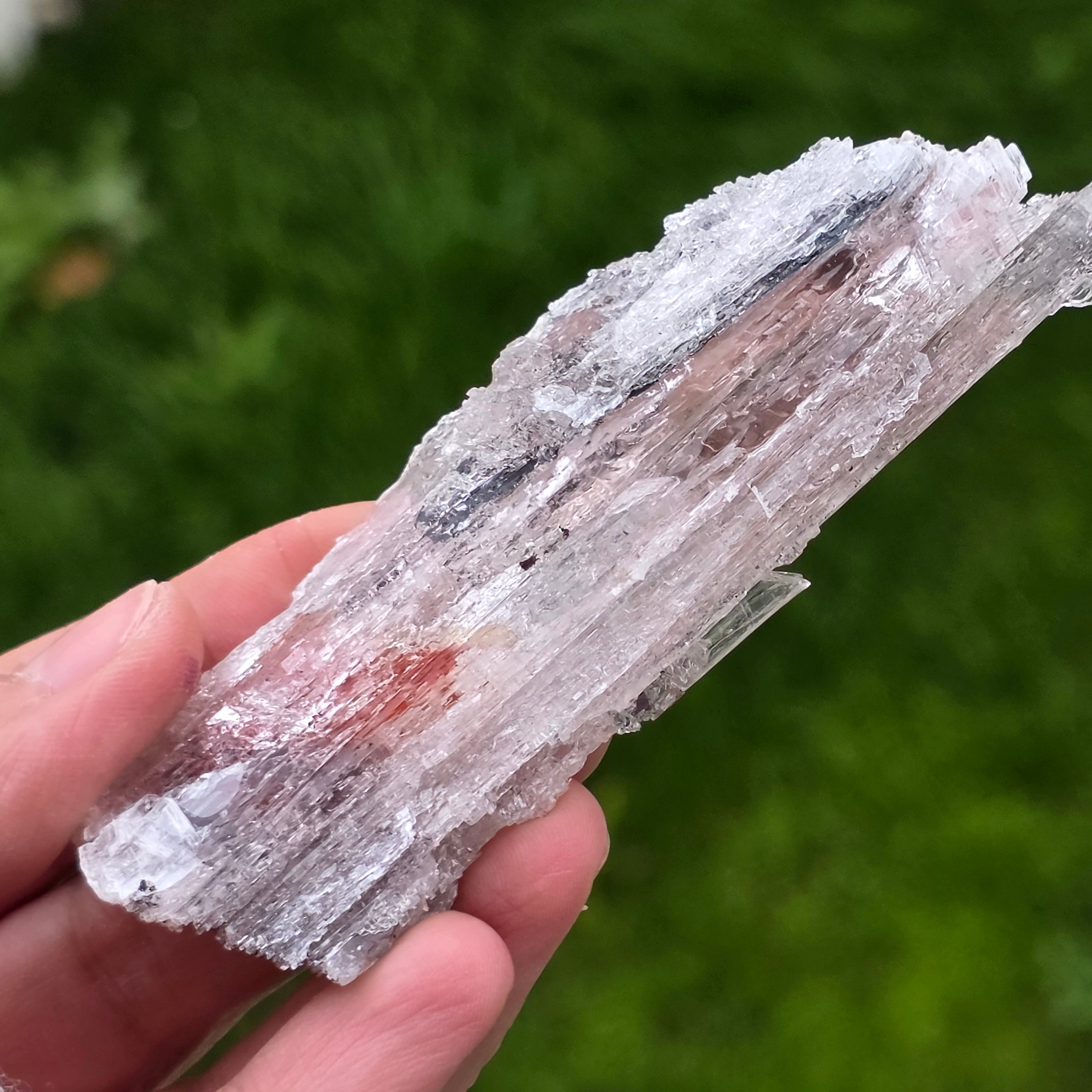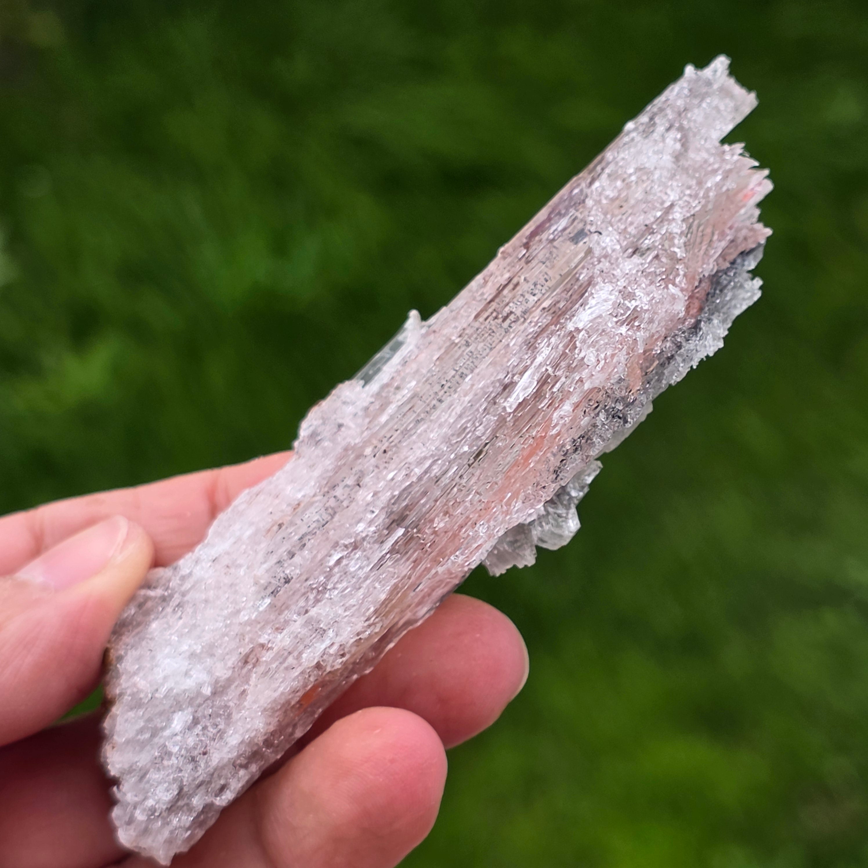 Селенитът се появява под формата на удължени кристали или полупрозрачни плочки, с кадифен блясък и фина текстура, докато хематитът се проявява като включвания, филмчета или естествени отлагания, които подчертават структурата на кристала и му придават визуална дълбочина.