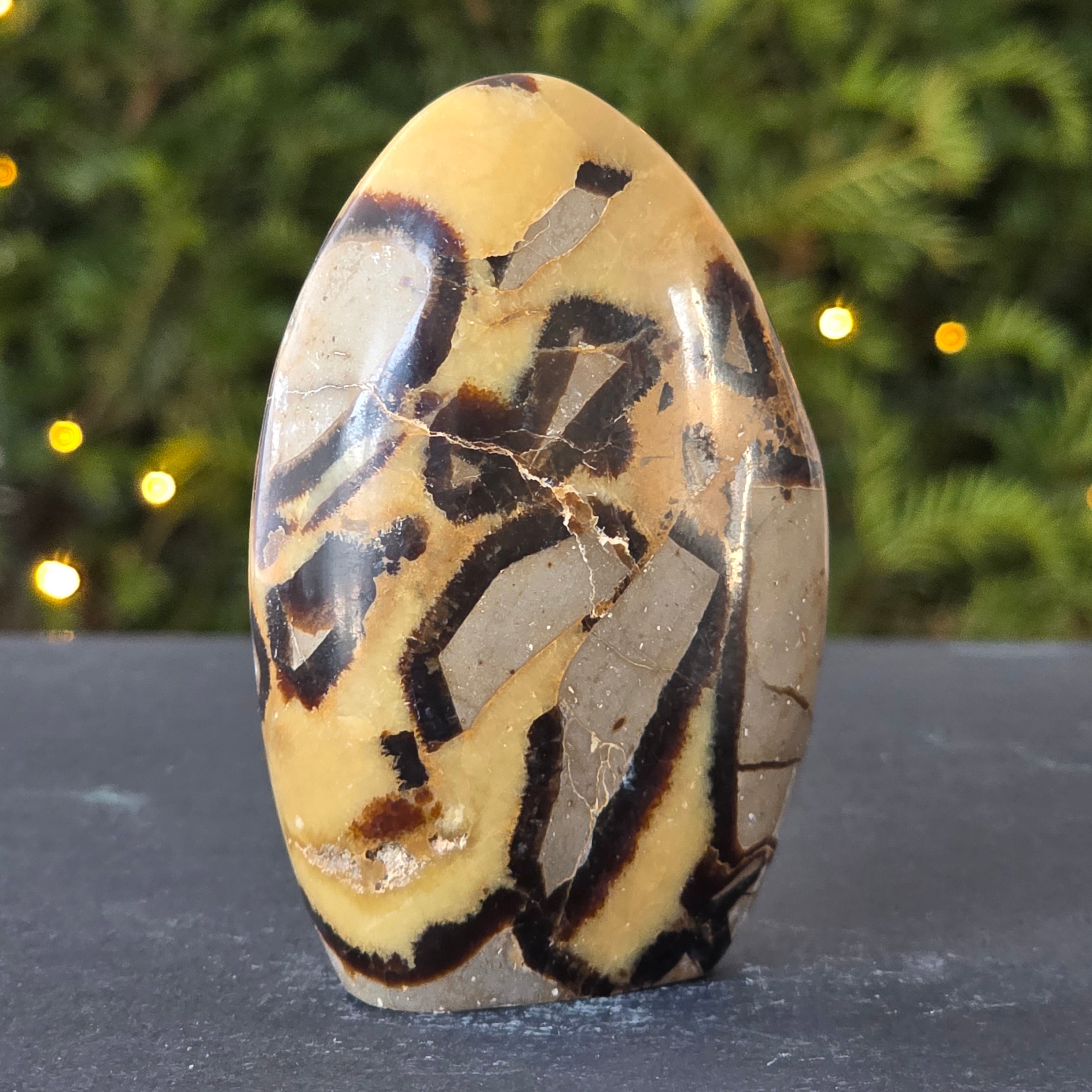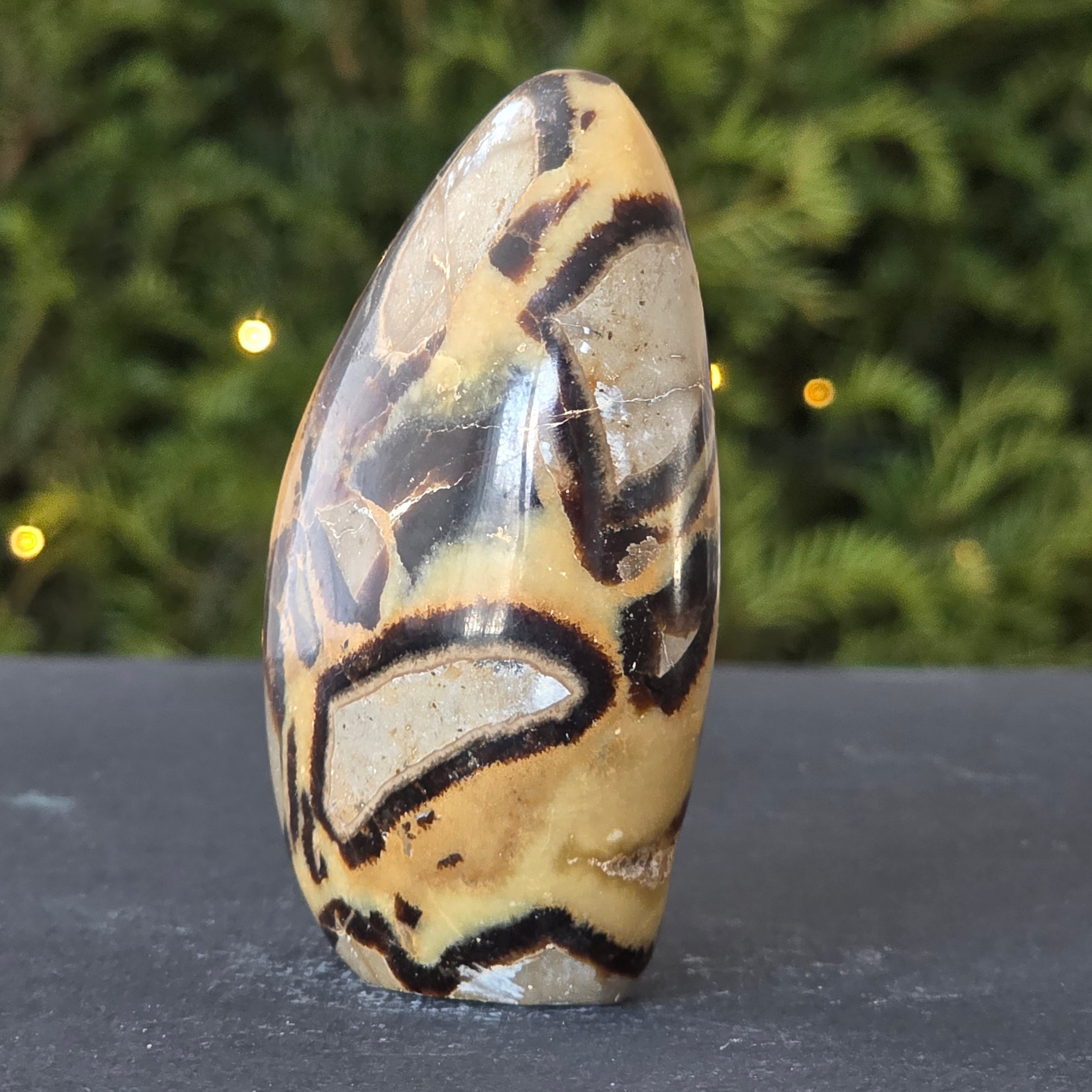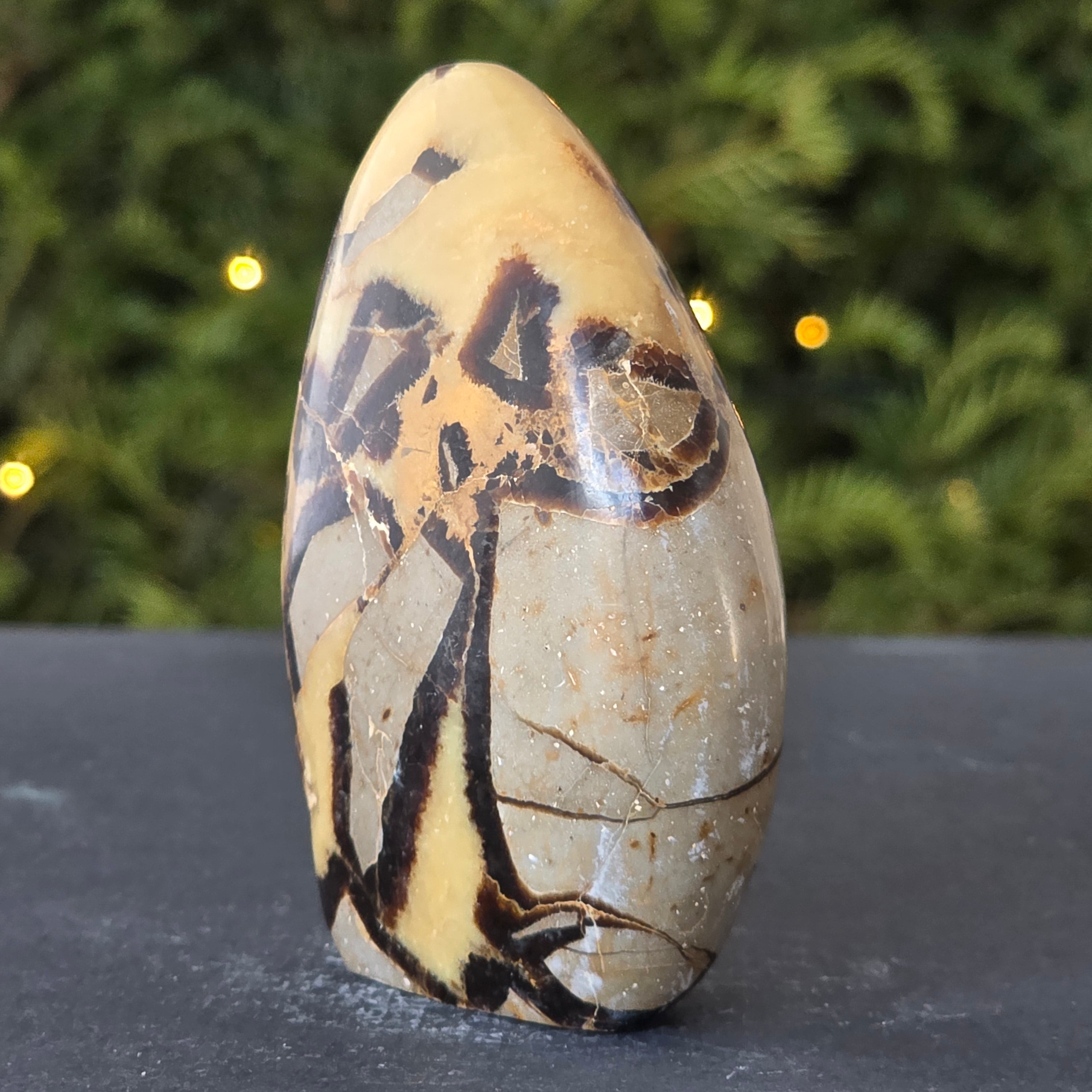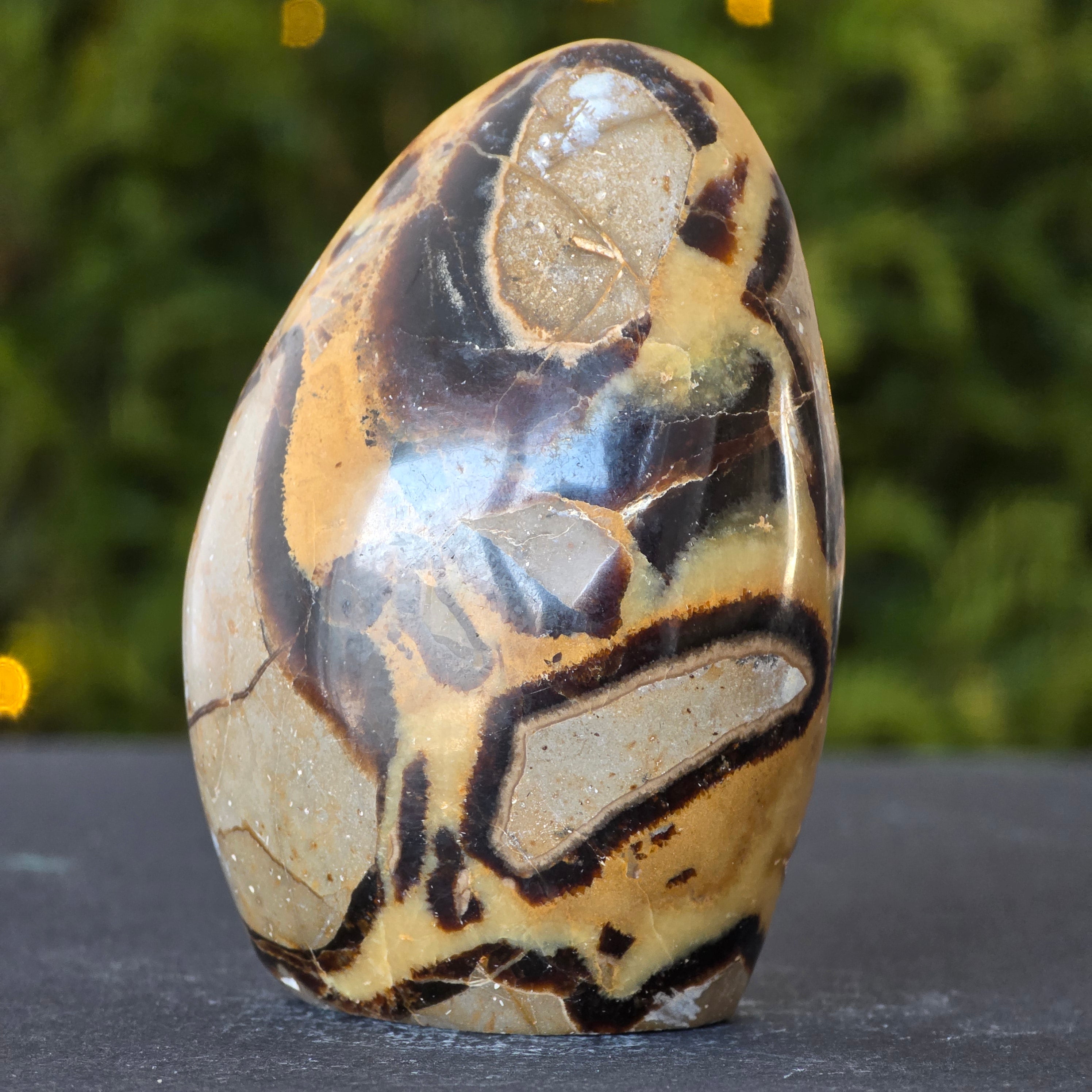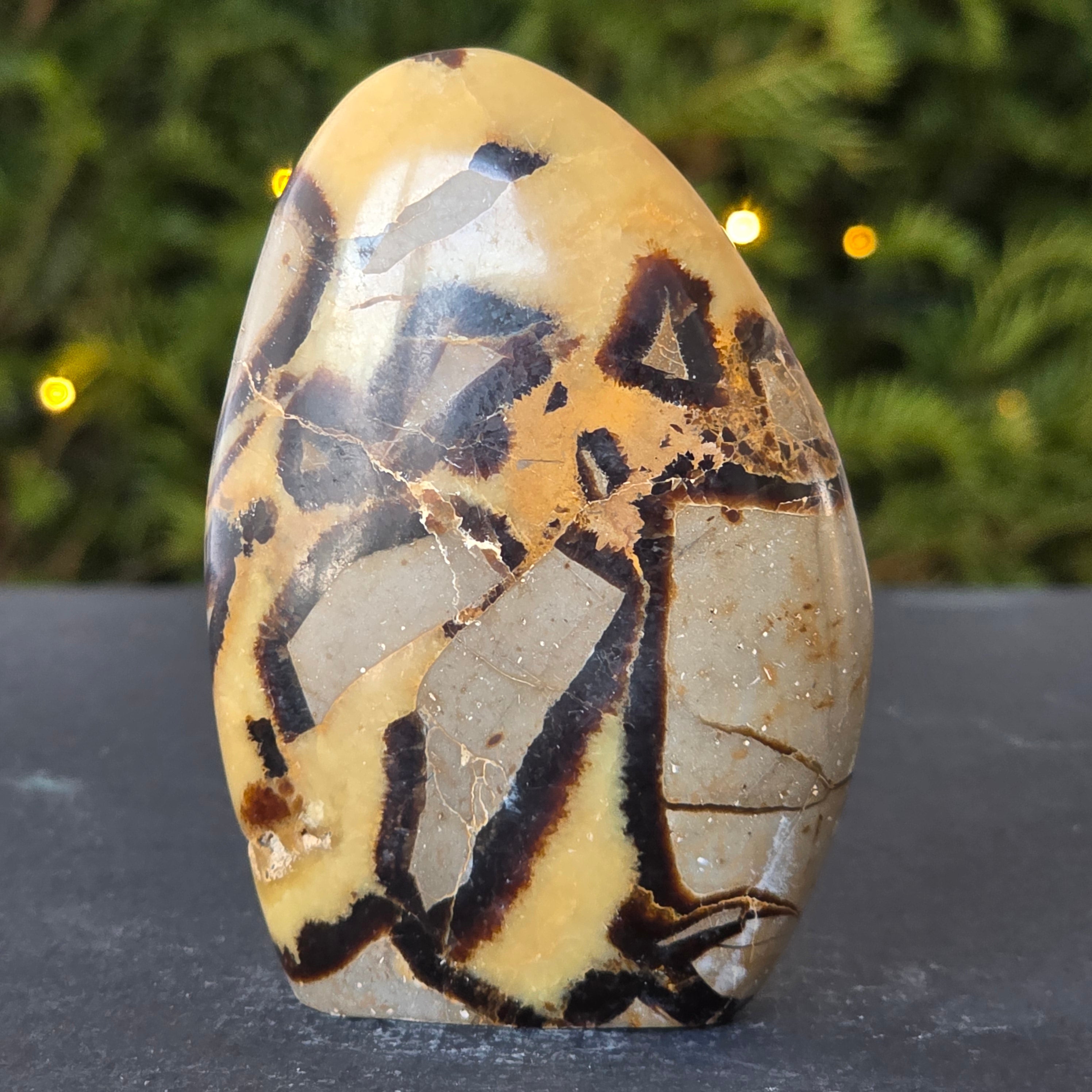 Септарията се състои от калцит, лимонит, гипс и барит – минерали, които образуват уникална игра в този камък и му придават специален вид.