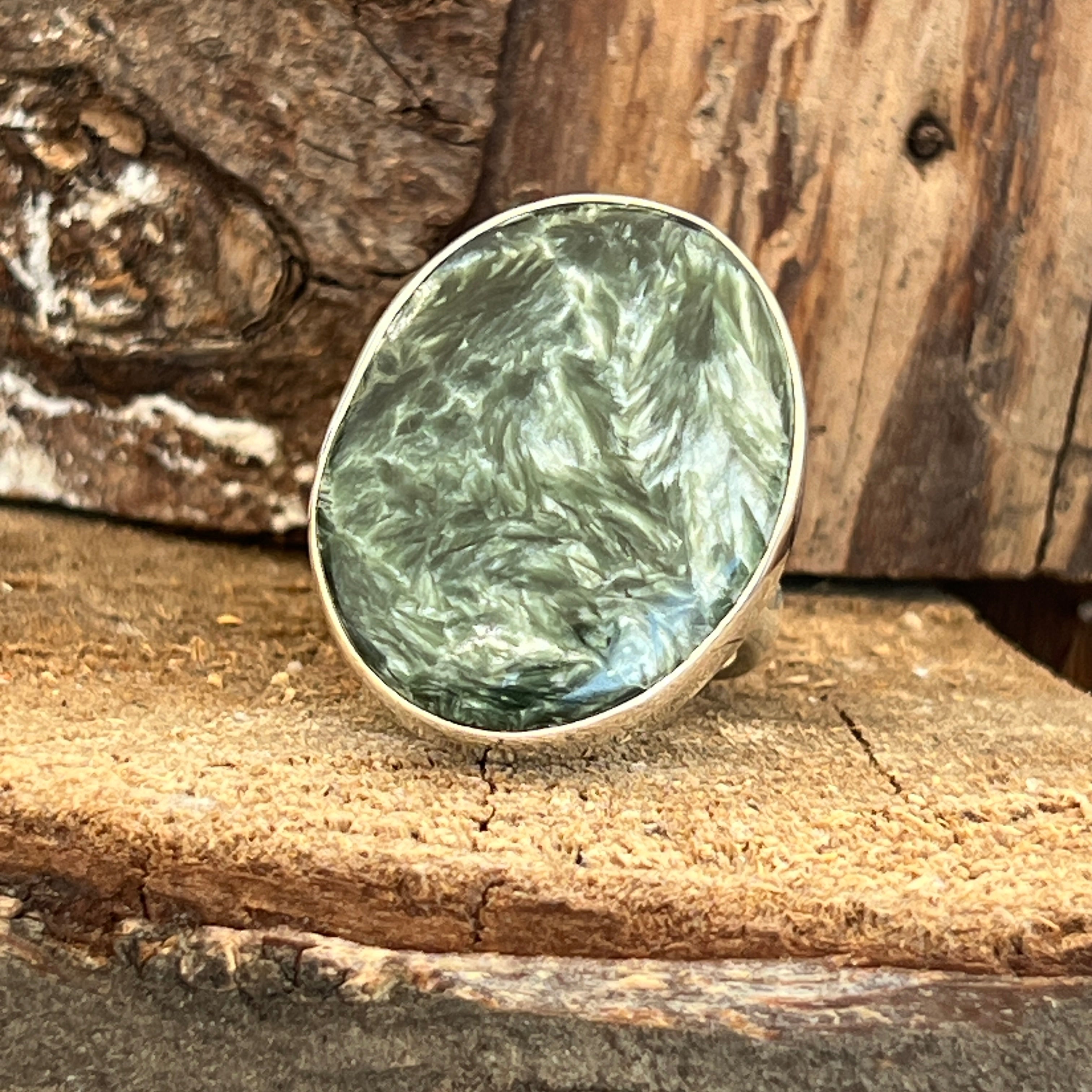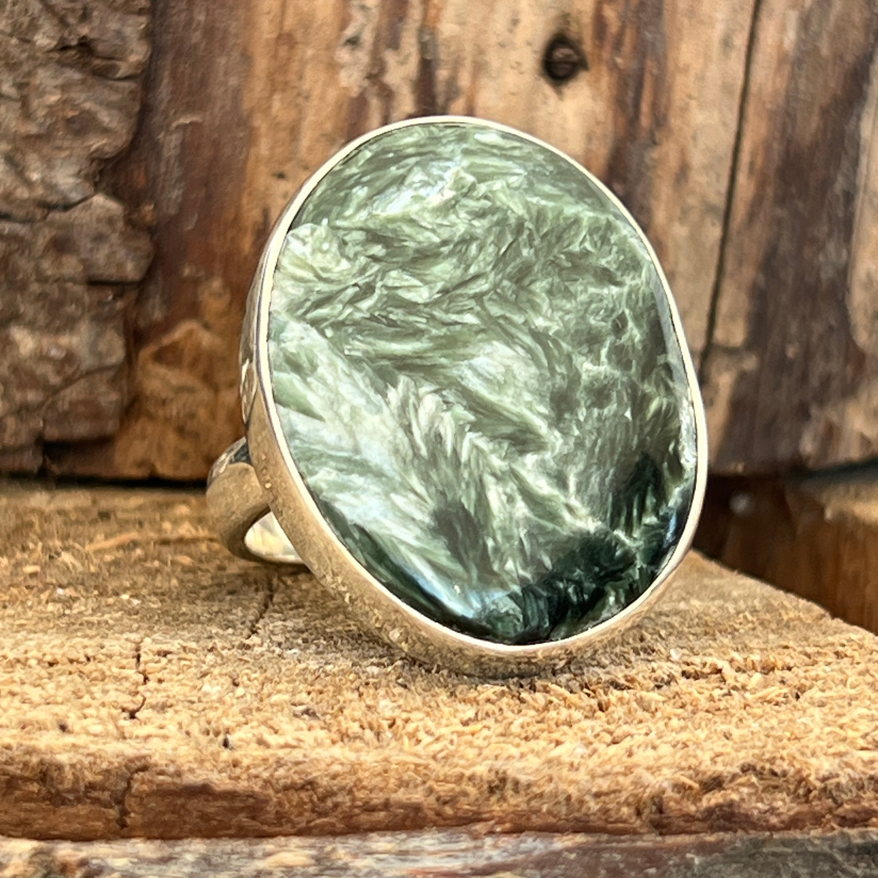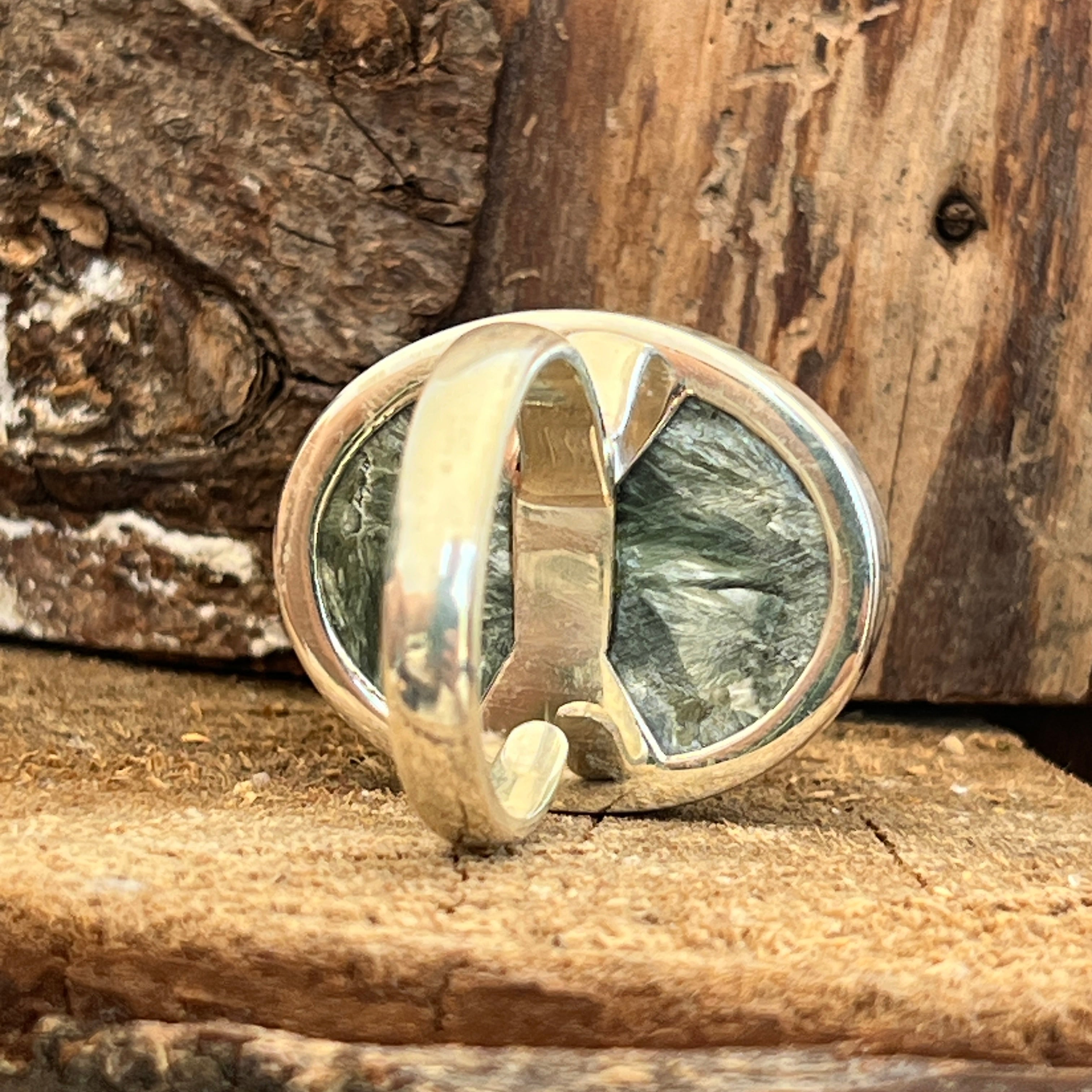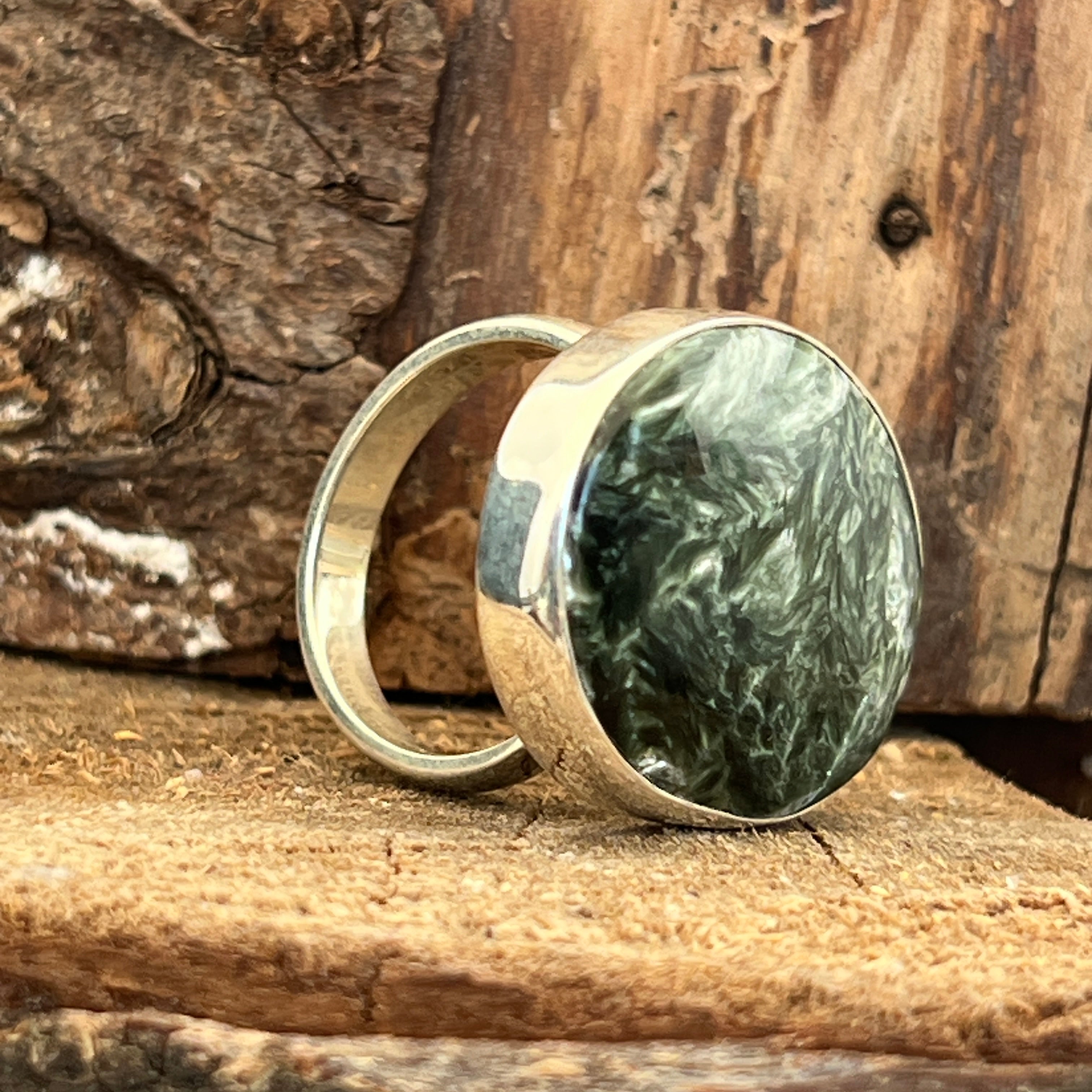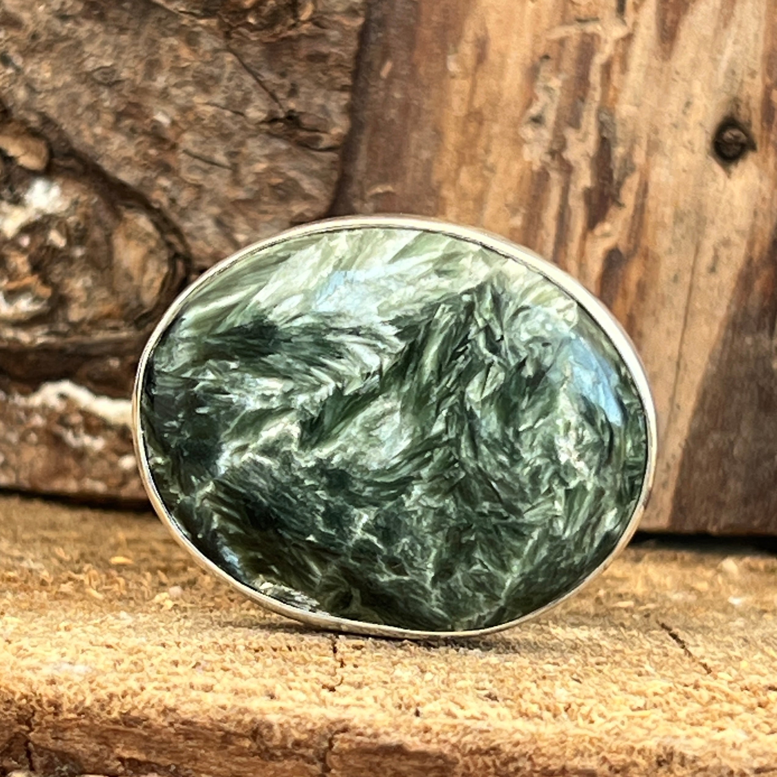 Серафинитът се отличава със своите нежни зелени нюанси, хармонично съчетани със сребристи или бели ивици, които напомнят на крилата на ангел. Тази комбинация от цветове и естествени модели създава деликатен и очарователен вид в бижутата. Серафинитът често се свързва с ангелски и духовни енергии, като се счита за камък на светлината и божествената любов.