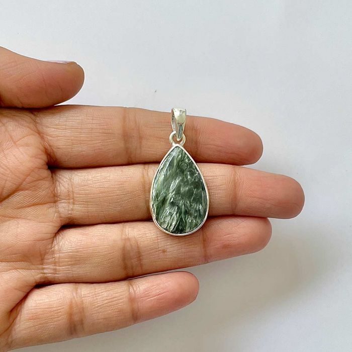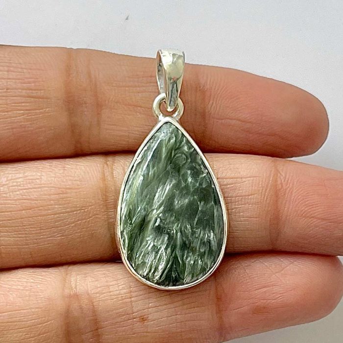 Серафинитът се отличава с фините си зелени нюанси, хармонично съчетани със сребристи или бели ивици, наподобяващи крилата на ангел. Това комбинация от цветове и естествени модели създава деликатен и очарователен вид на бижутата. Серафинитът често се свързва с ангелски и духовни енергии, като се счита за камък на светлината и божествената любов.