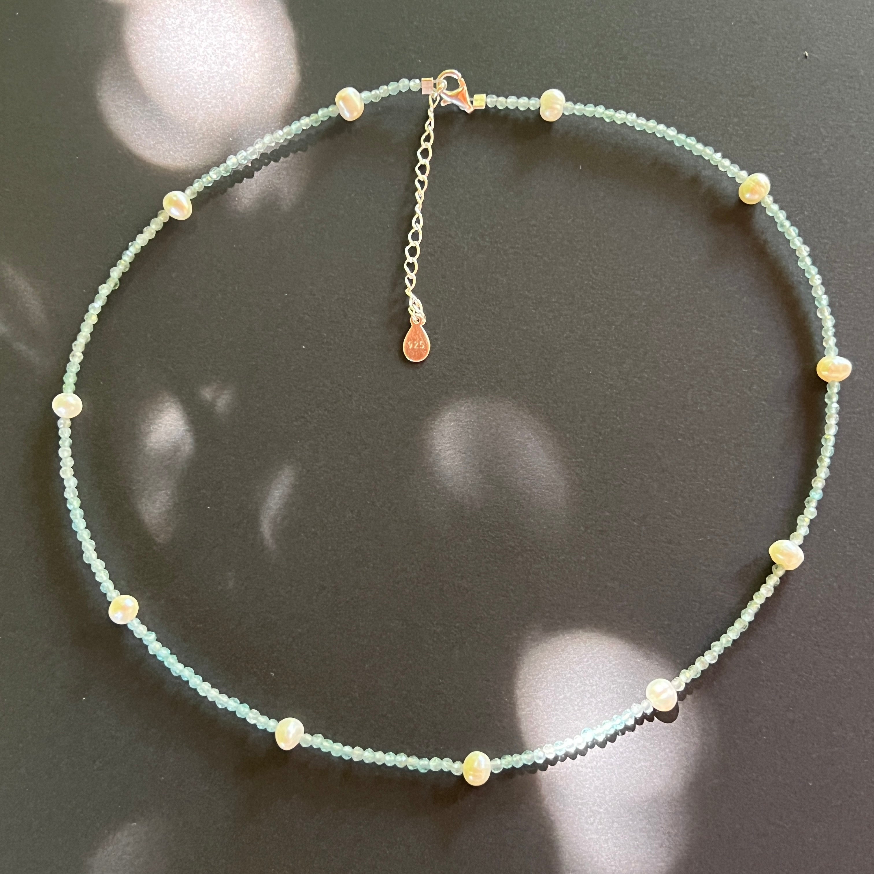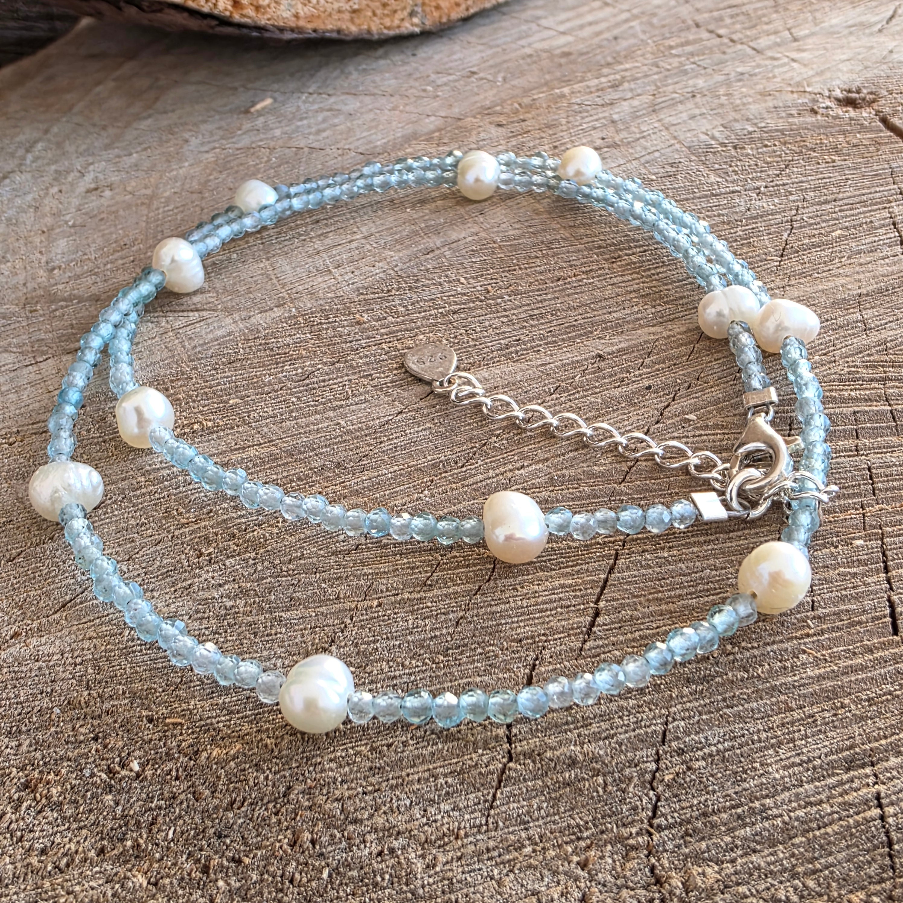 Разпръснати по дължината на наниза, естествените перли с диаметър около 5 мм добавят перлен и органичен контраст – като светлинни точки между капките небе. Заедно те формират бижу, което съчетава яснота и мекота, спокойствие и дълбочина.