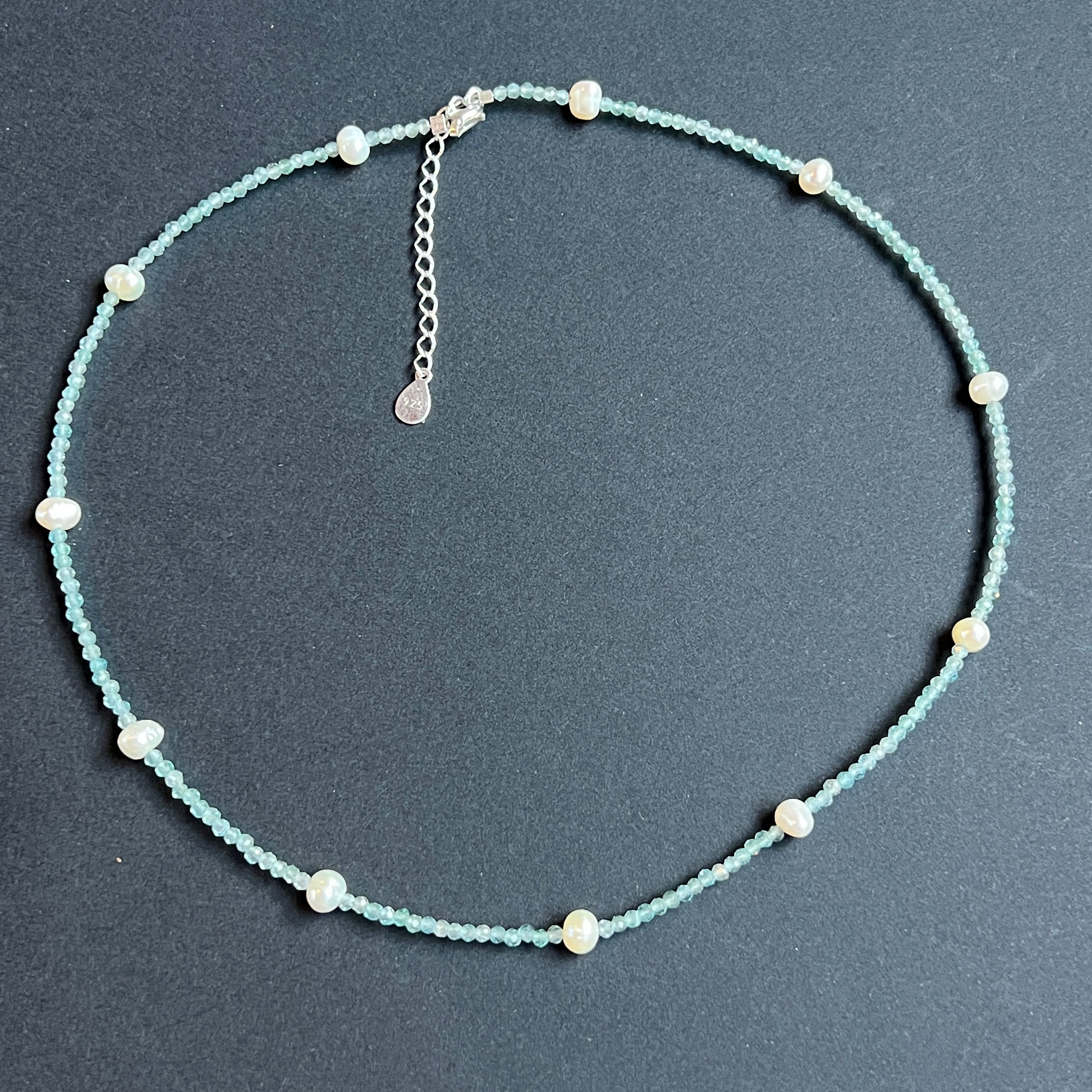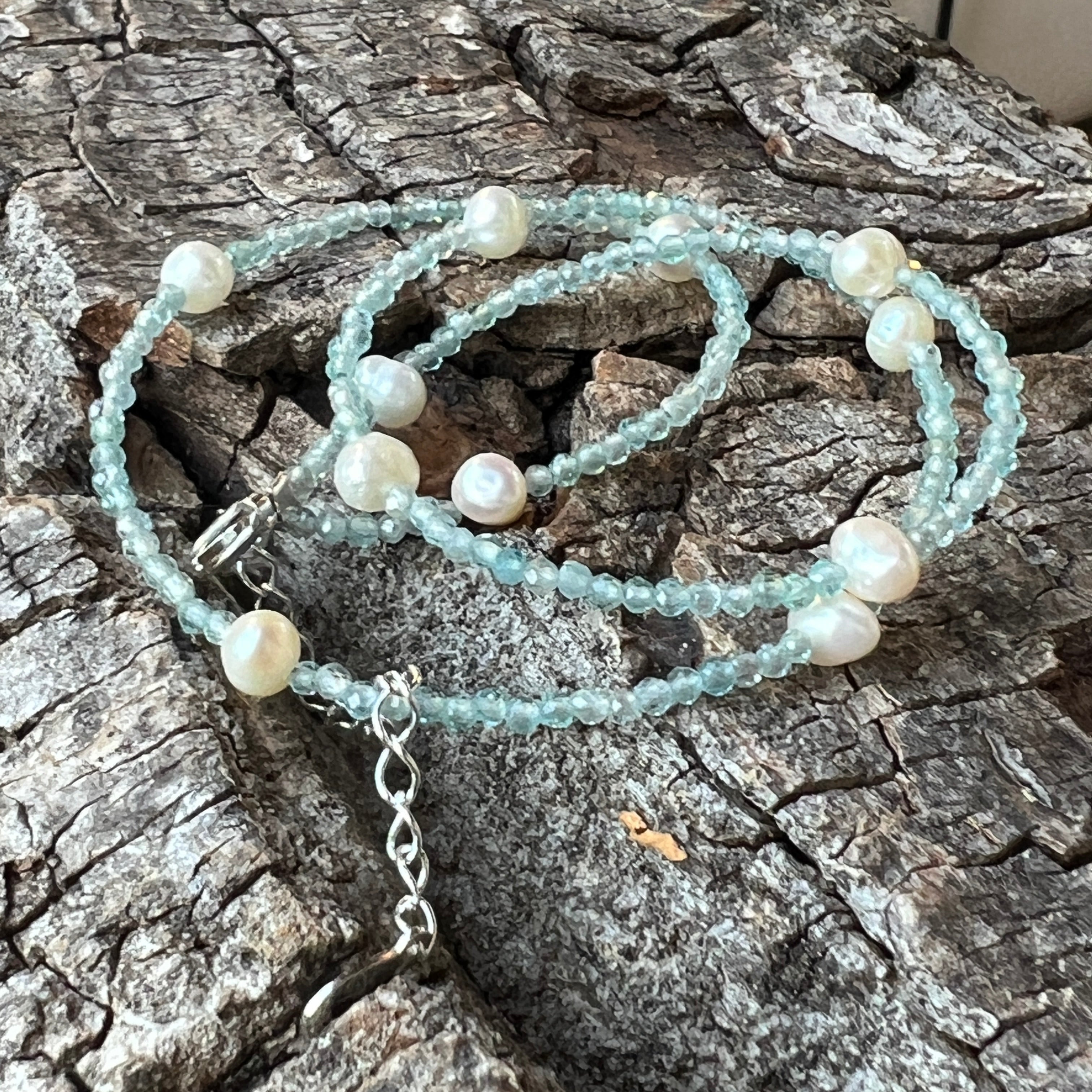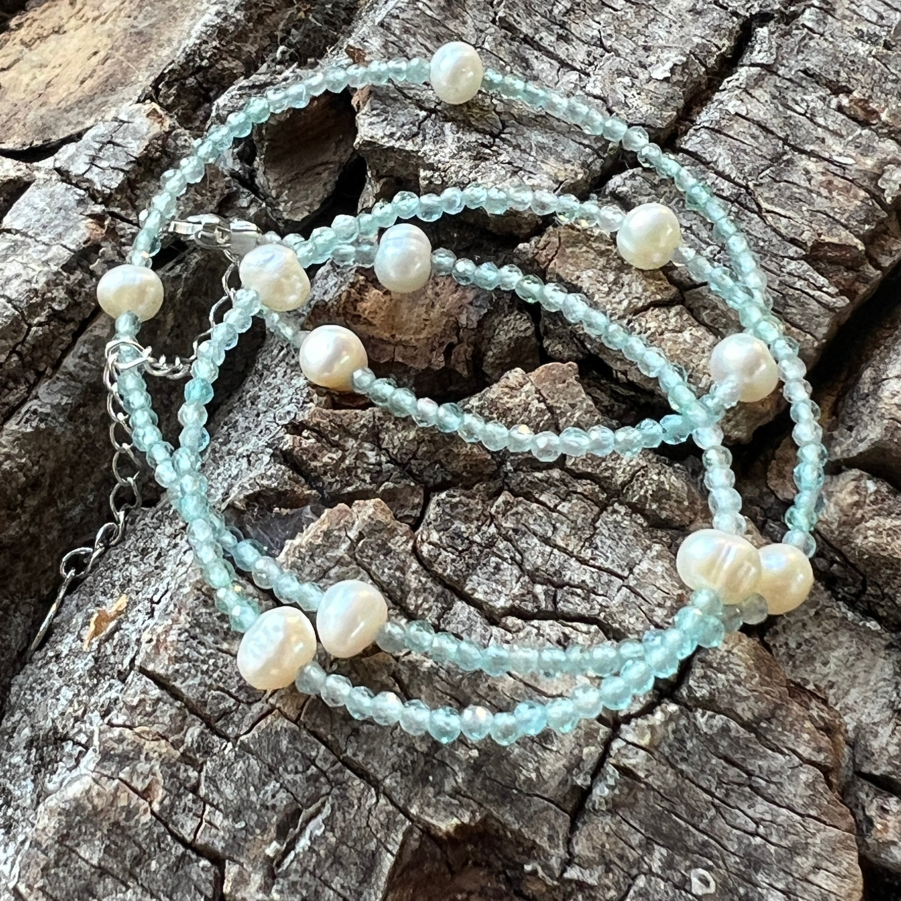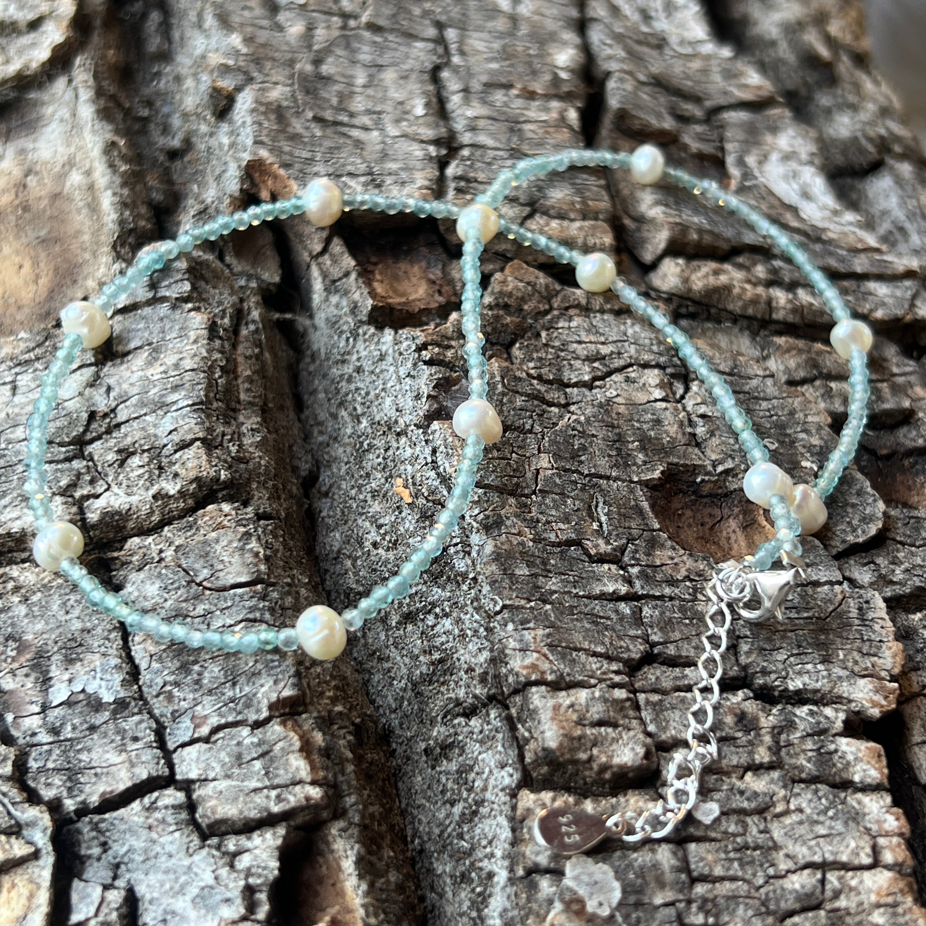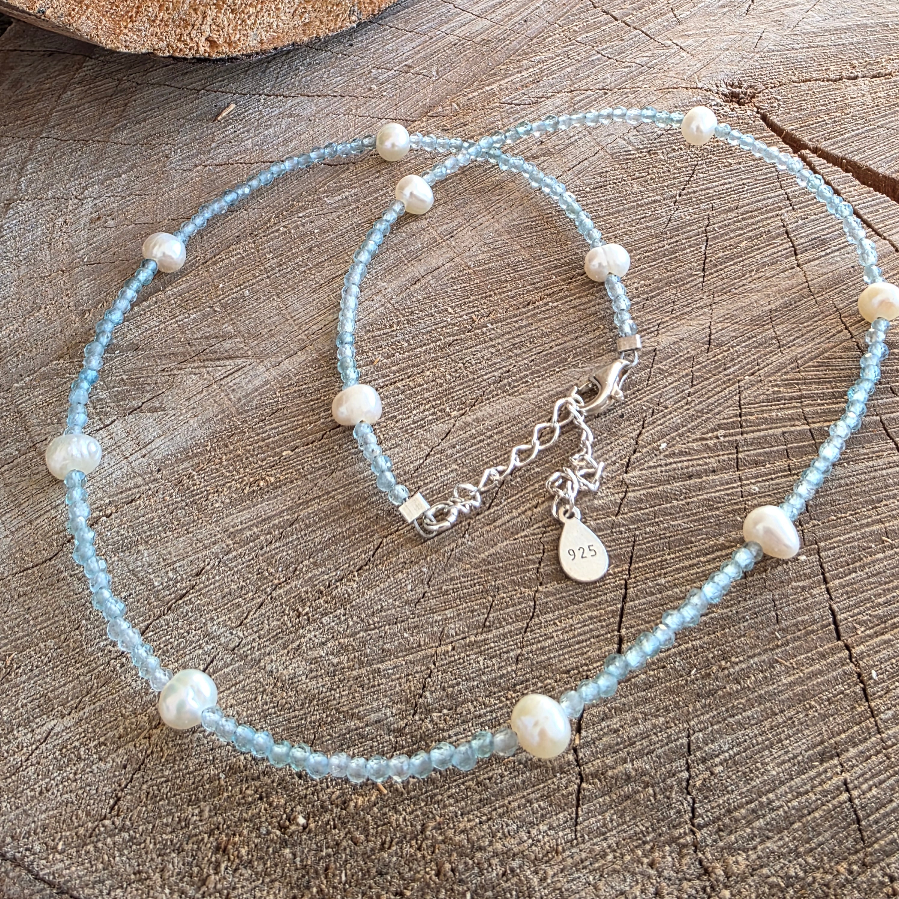 Материали: фасетиран син апатит 2,5 мм, естествени перли ~5 мм, сребро 925