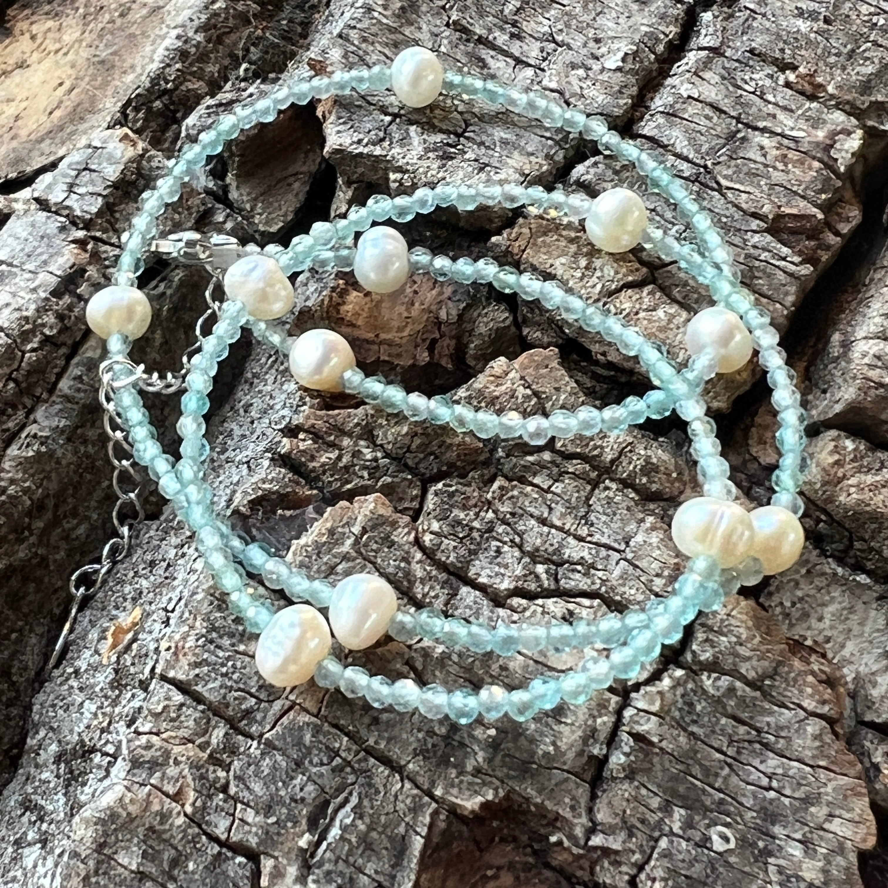 Синият апатит е известен като камък на умствената яснота и искрената комуникация. Той насърчава изразяването на вътрешната истина и носи емоционален баланс. Перлите, от своя страна, са символ на тихата мъдрост и чистотата на душата – заедно създават хармония, която говори без думи.