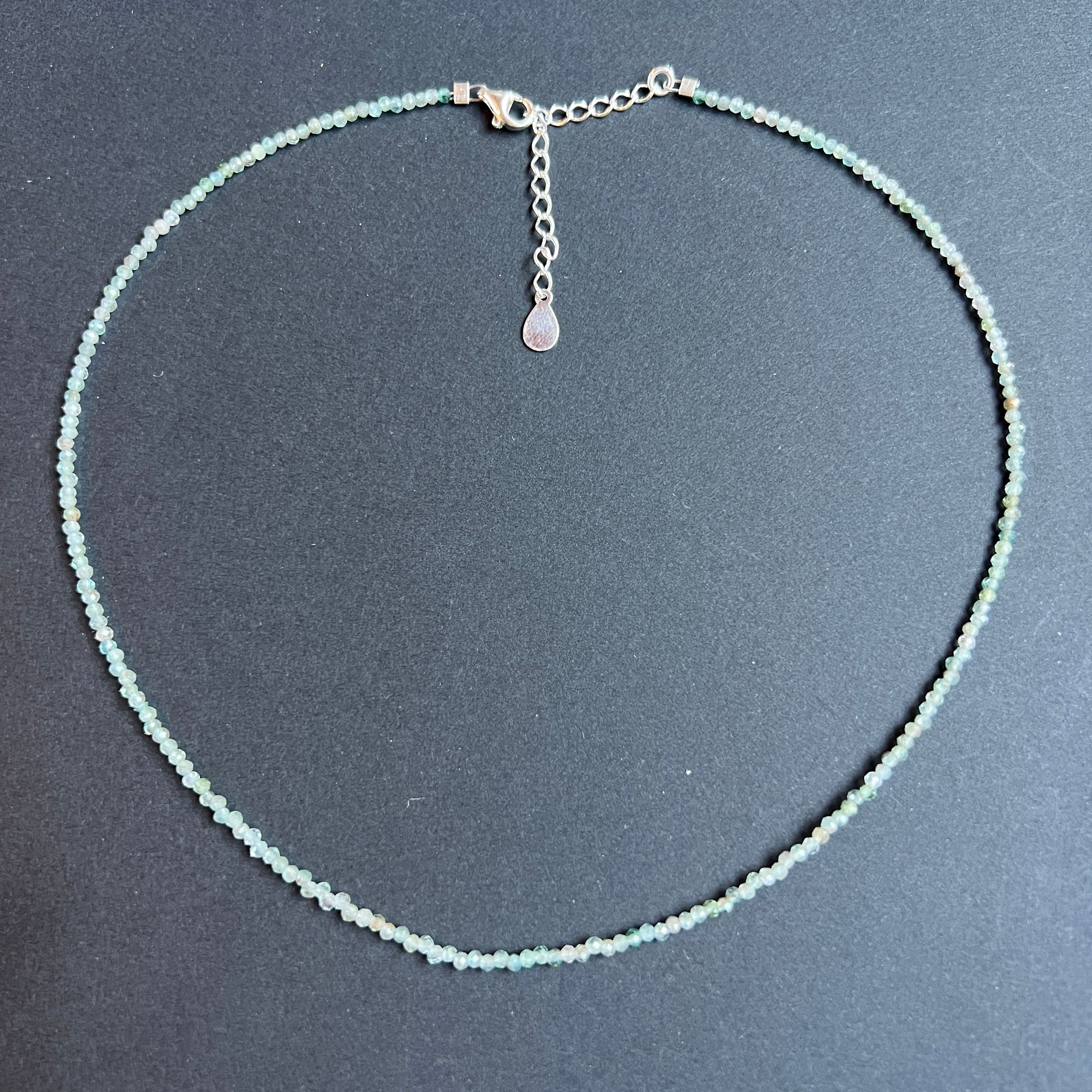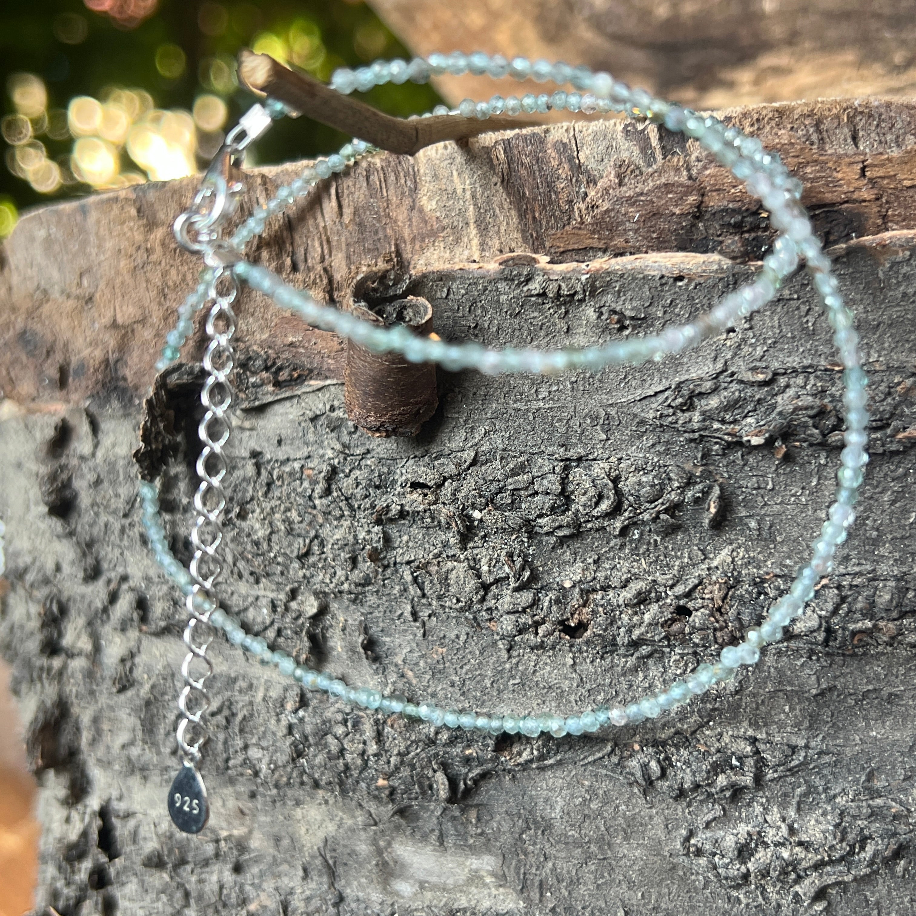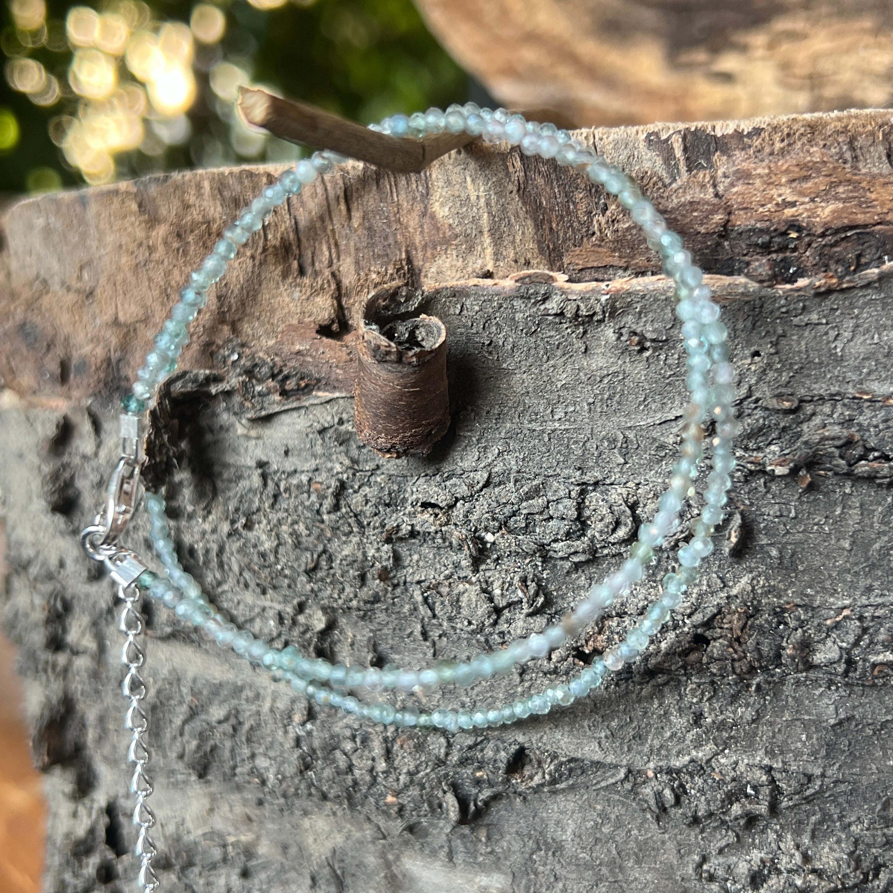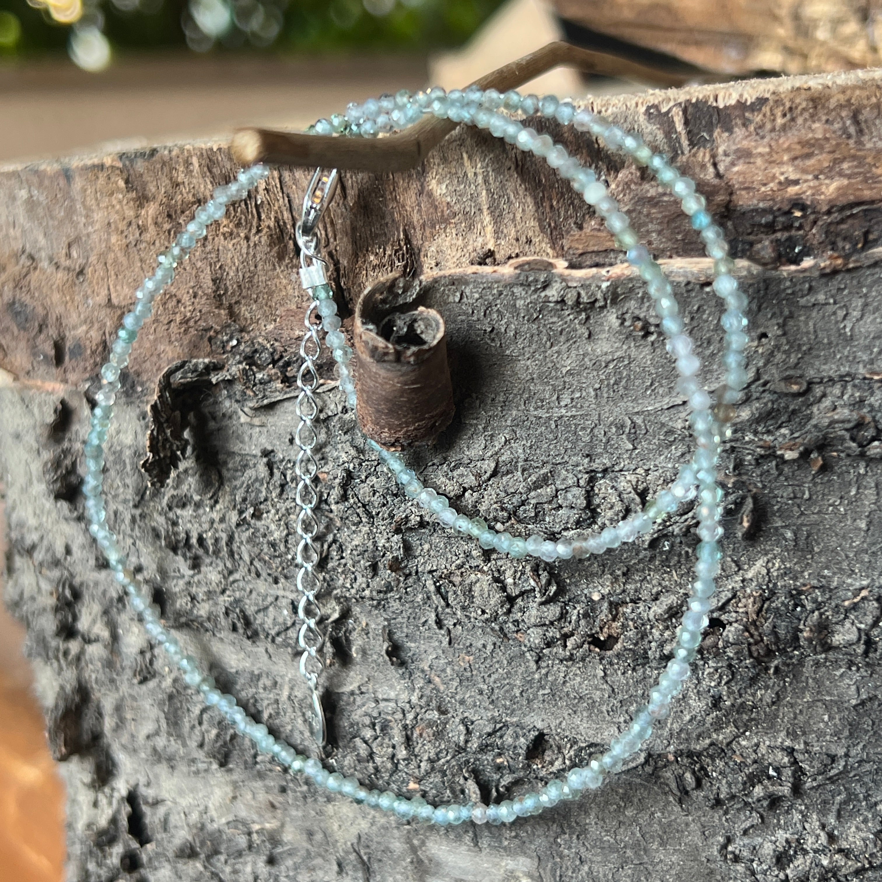 Деликатно колие като ясна бриза на спокойни мисли – изработено от фасетирани сферични мъниста от син апатит с диаметър 2,5–3 мм, в дълбок морско-син нюанс с прозрачни отблясъци.