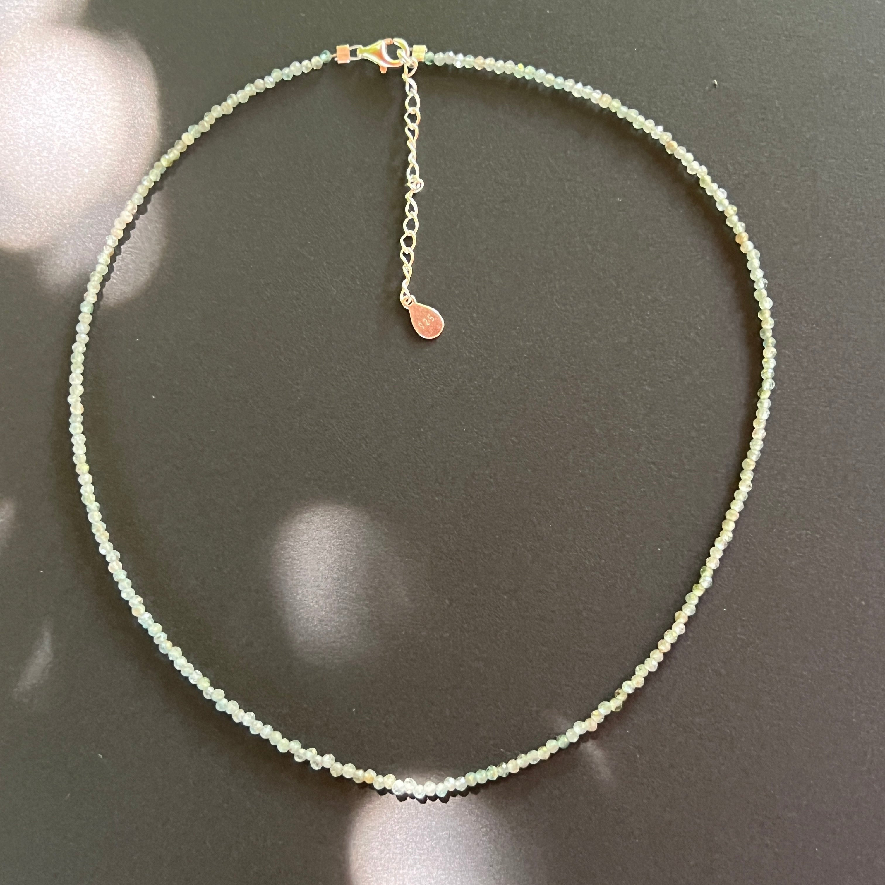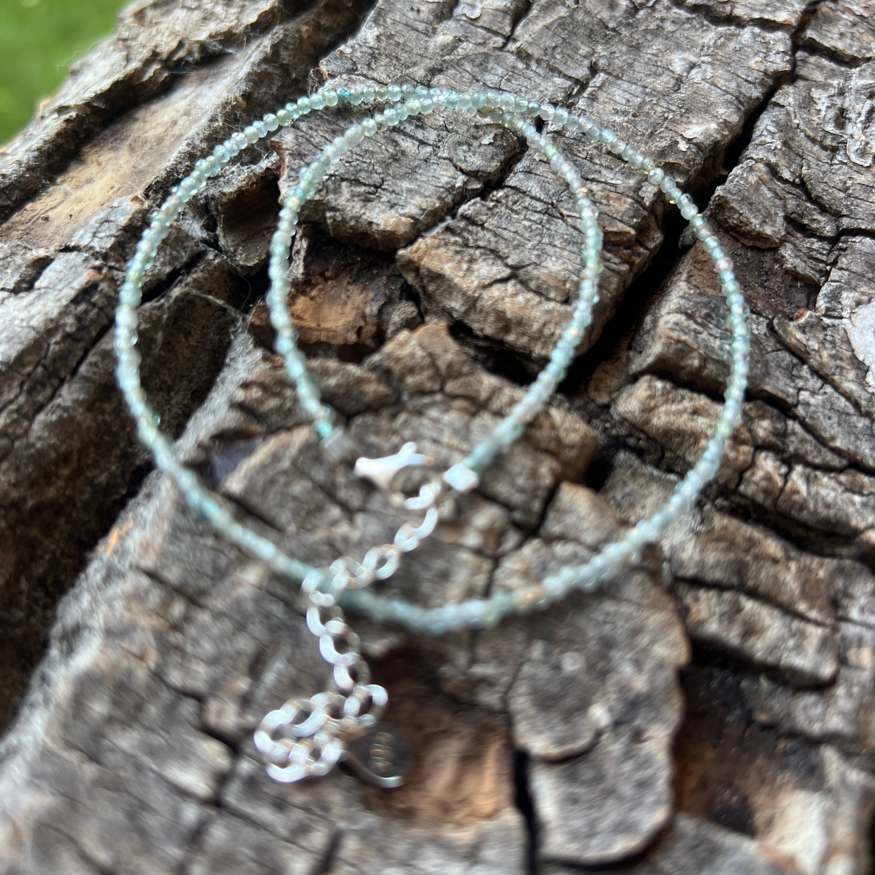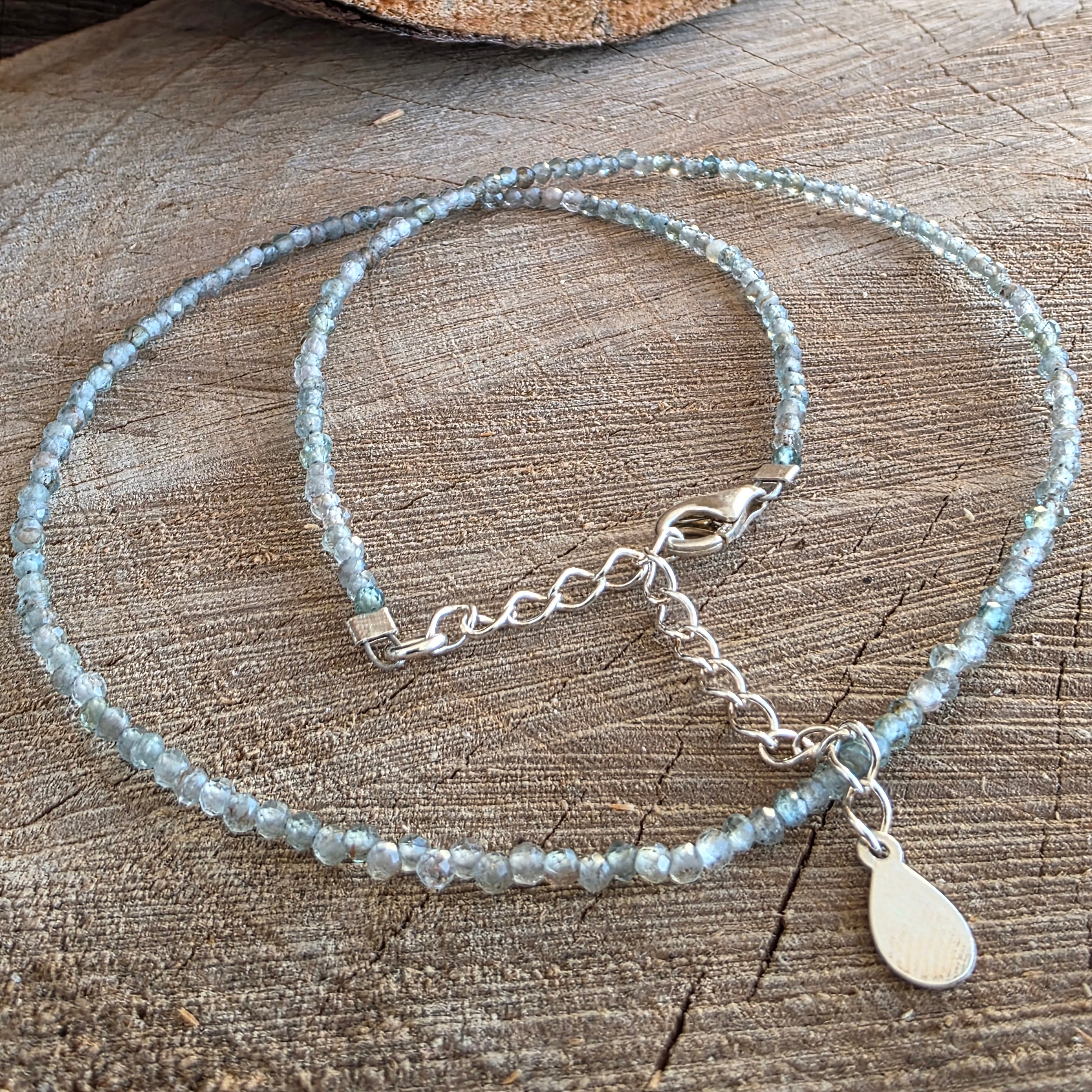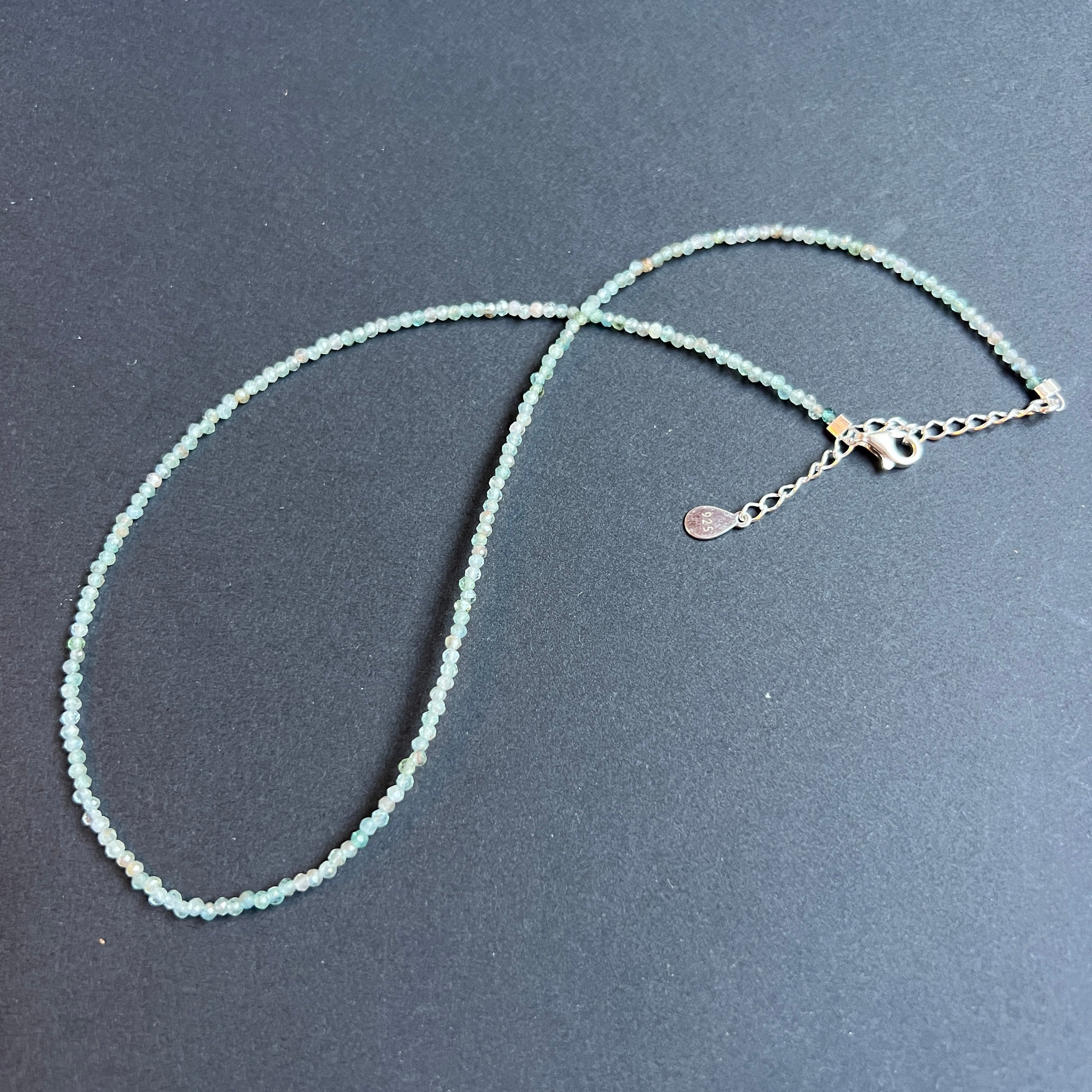 Деликатно колие като ясна бриза на спокойни мисли – изработено от фасетирани сферични мъниста от син апатит с диаметър 2,5–3 мм, в дълбок морско-син нюанс с прозрачни отблясъци.