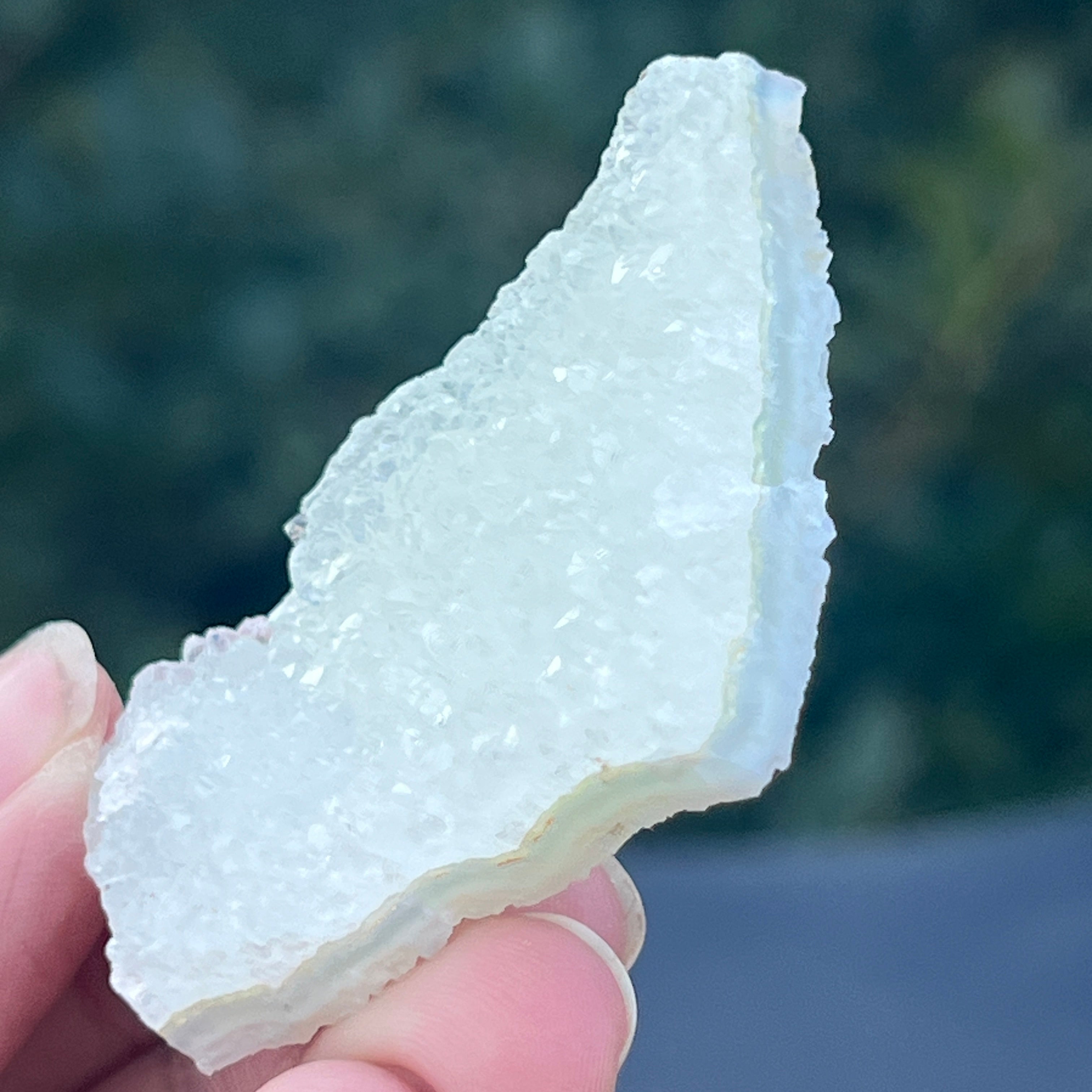 Примерък от син дантелено ахат и син калцедон, произхождащ от Нсанже, Малави. Тези уникални образувания преминават през сложен процес на киселинни бани в Южна Африка, който внимателно отстранява повечето или всички следи от матрицата, оставяйки чист син дантелено ахат и/или син калцедон с удивителна красота.
