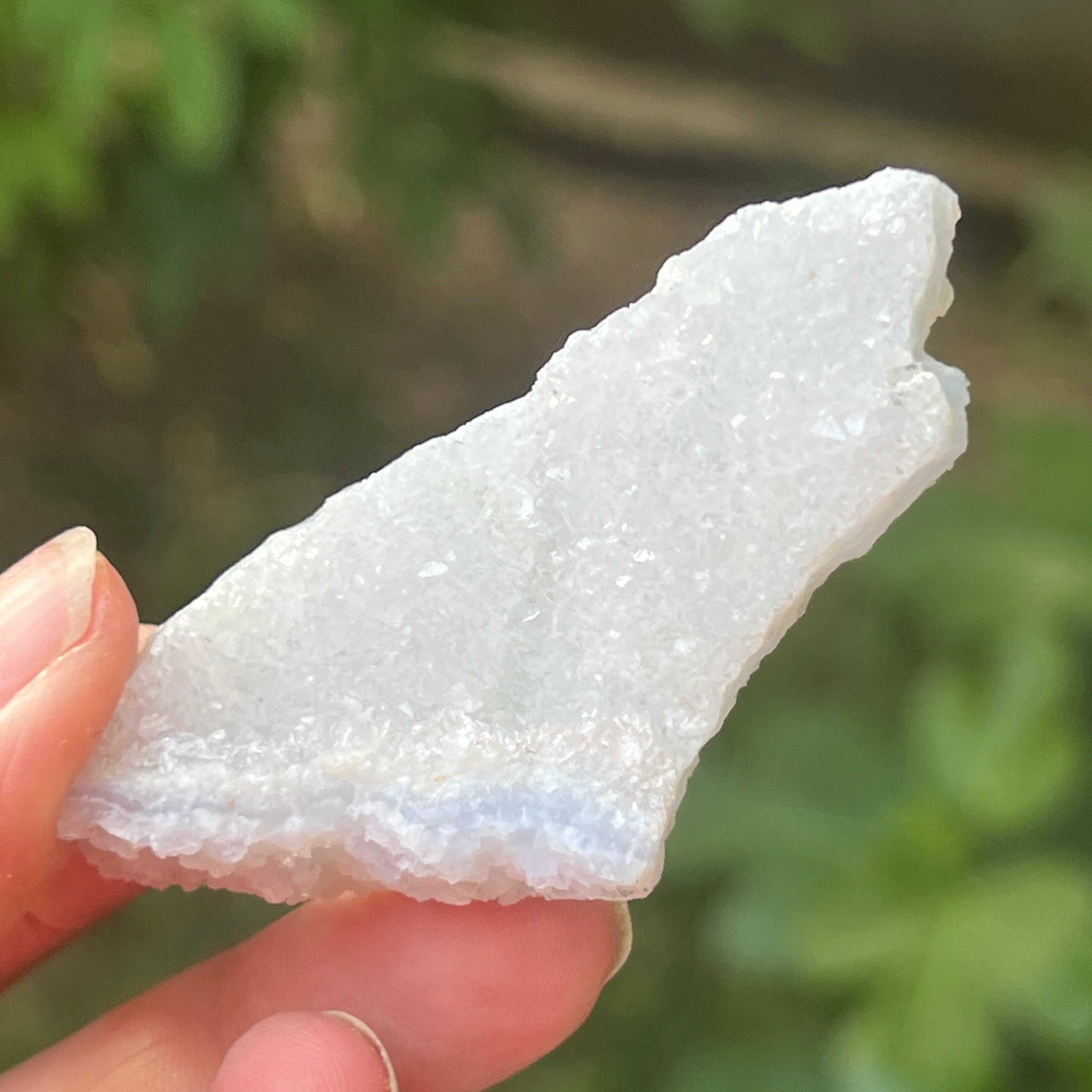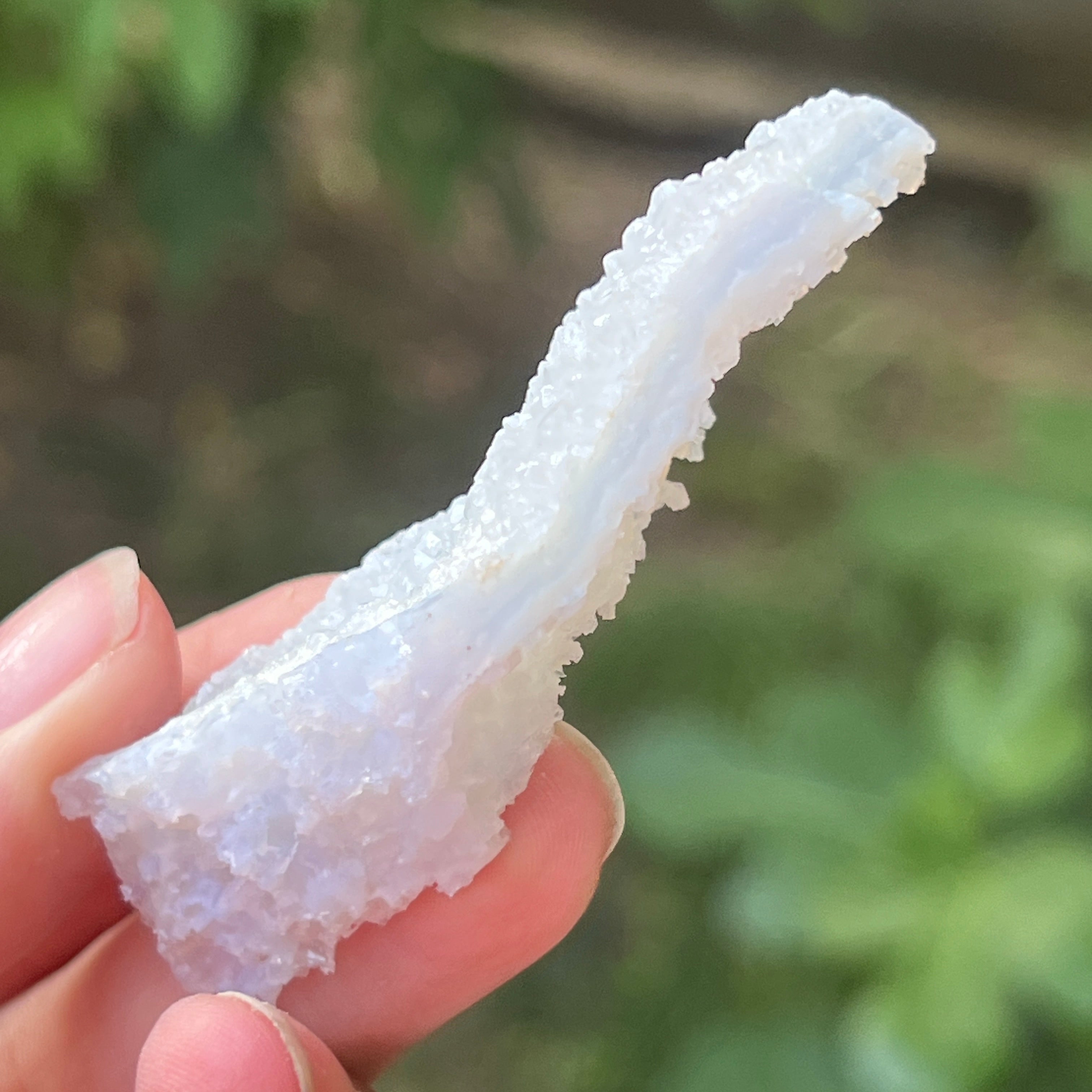Пример за синьо дантелено ахат и син халцедон, произхождащ от Нсанже, Малави. Тези изключителни образувания преминават през сложен процес на киселинни бани в Южна Африка, който внимателно премахва повечето или всички следи от матрицата, оставяйки зад себе си чист син дантелено ахат и/или син халцедон с изключителна красота.
