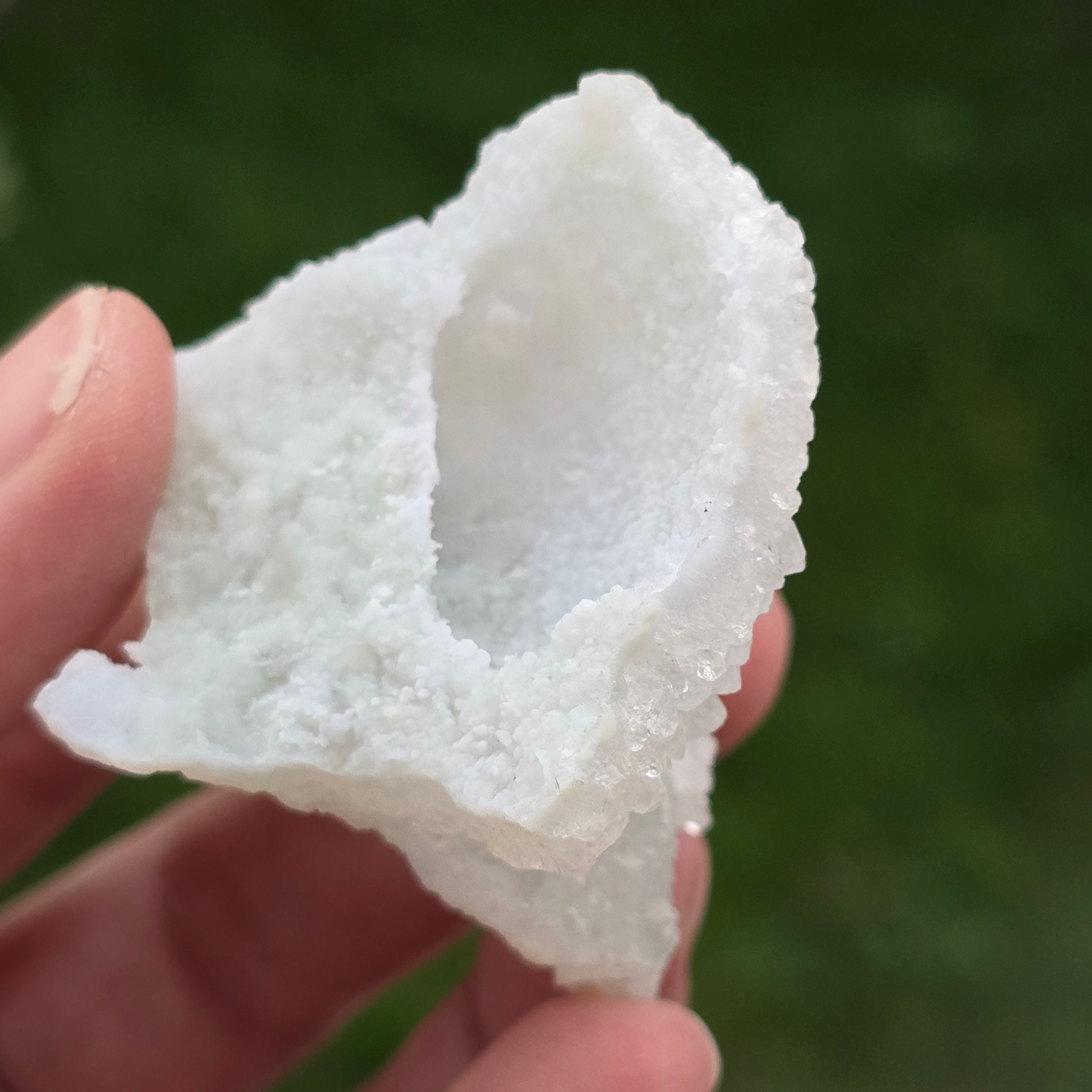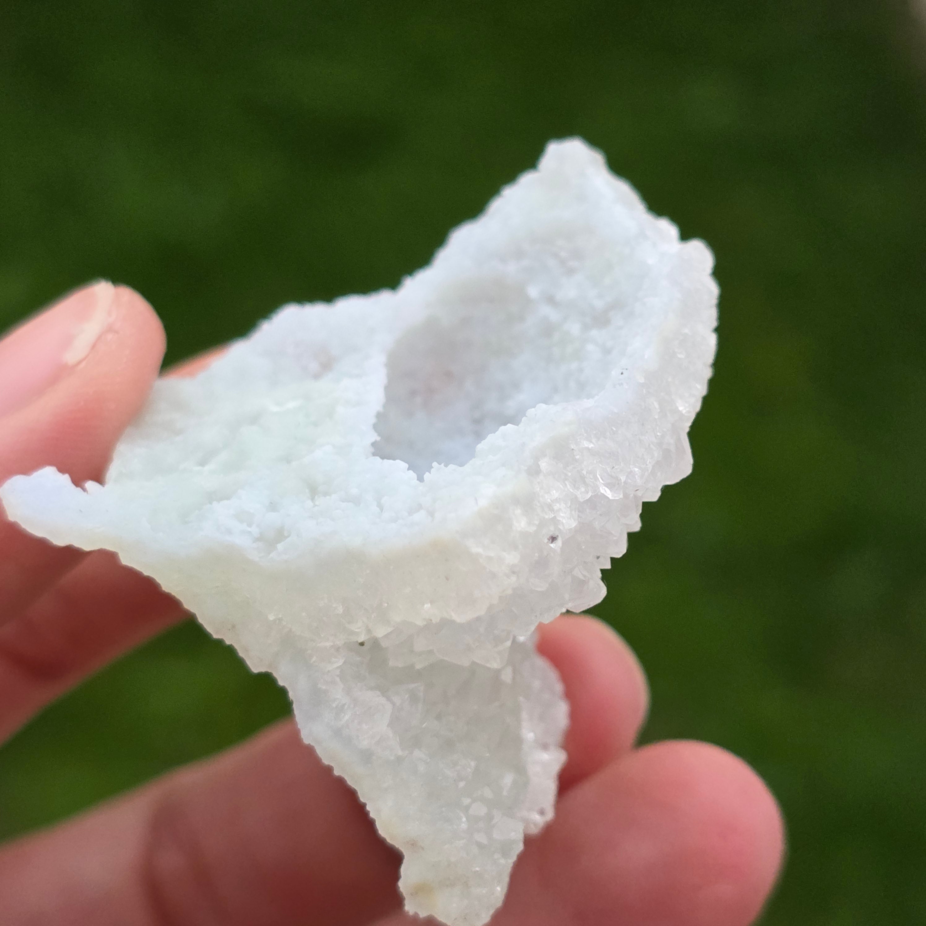 Пример за синьо дантелено ахат и син халцедон, произхождащ от Нсанже, Малави. Тези изключителни образувания преминават през сложен процес на киселинни бани в Южна Африка, който внимателно премахва повечето или всички следи от матрицата, оставяйки зад себе си чист син дантелено ахат и/или син халцедон с изключителна красота.