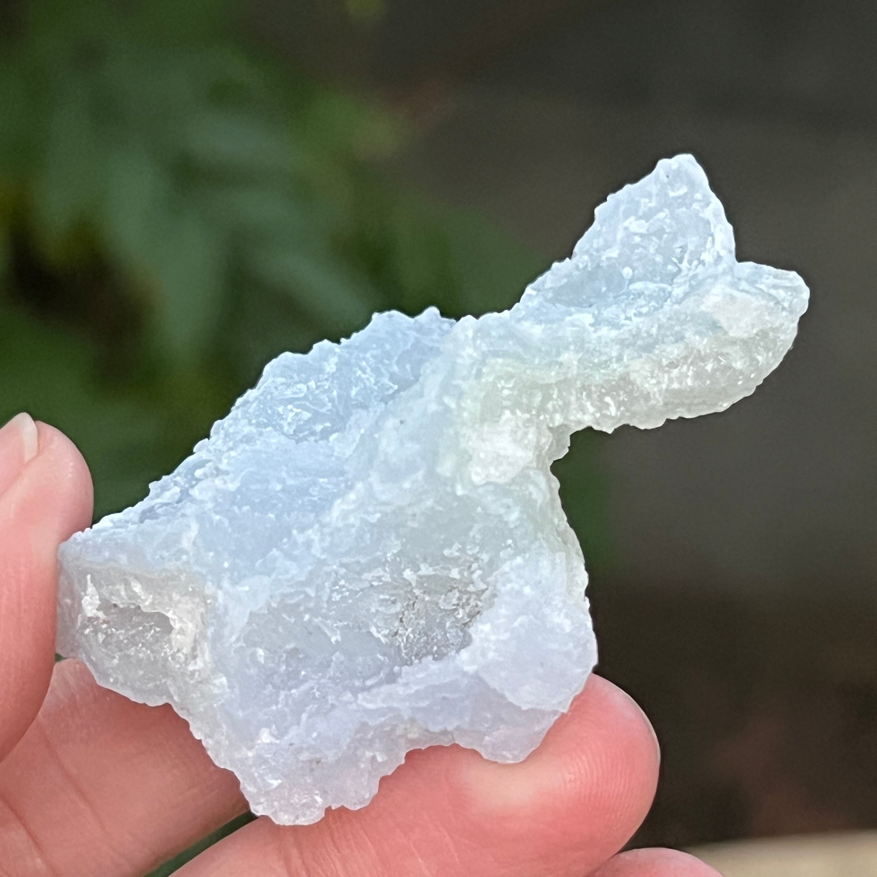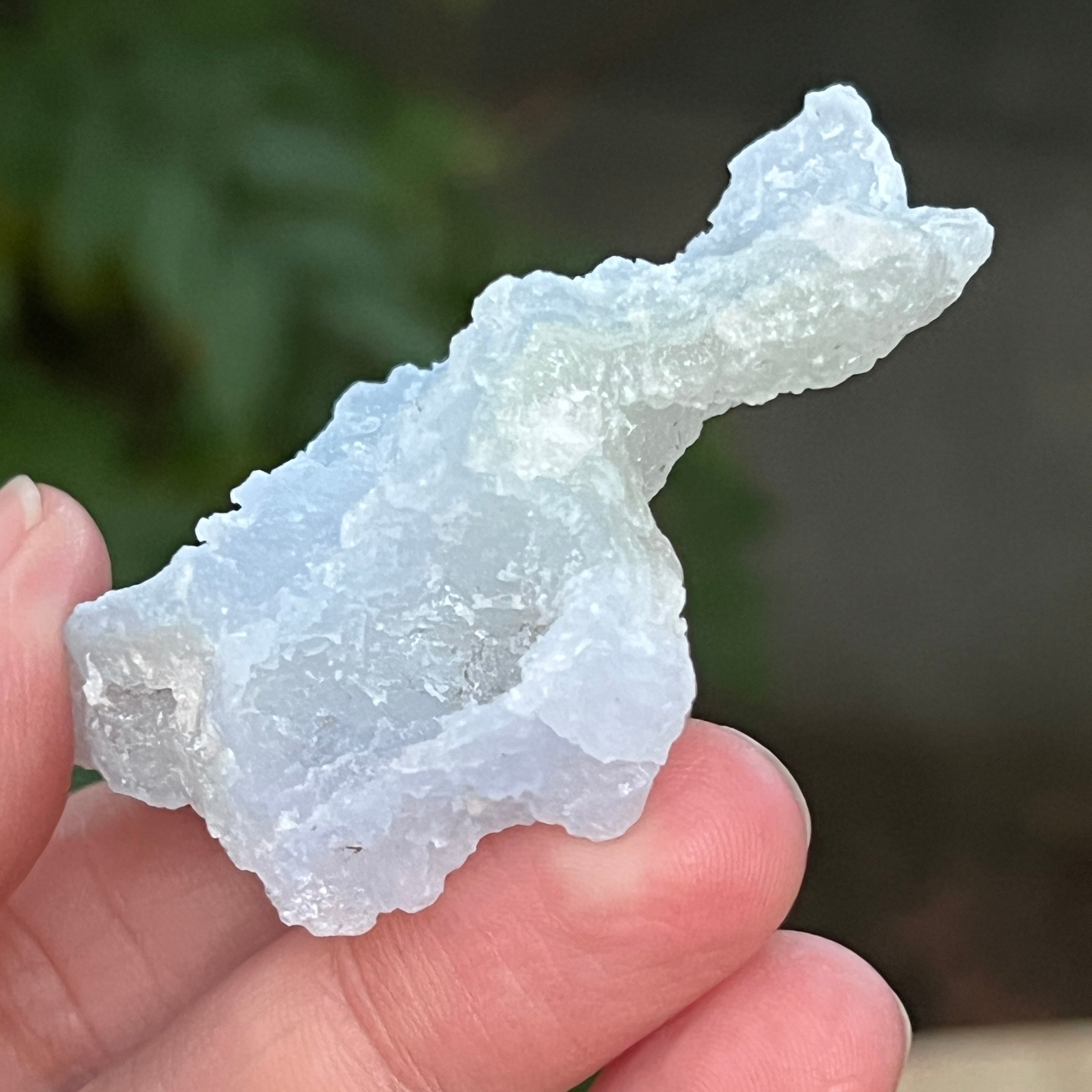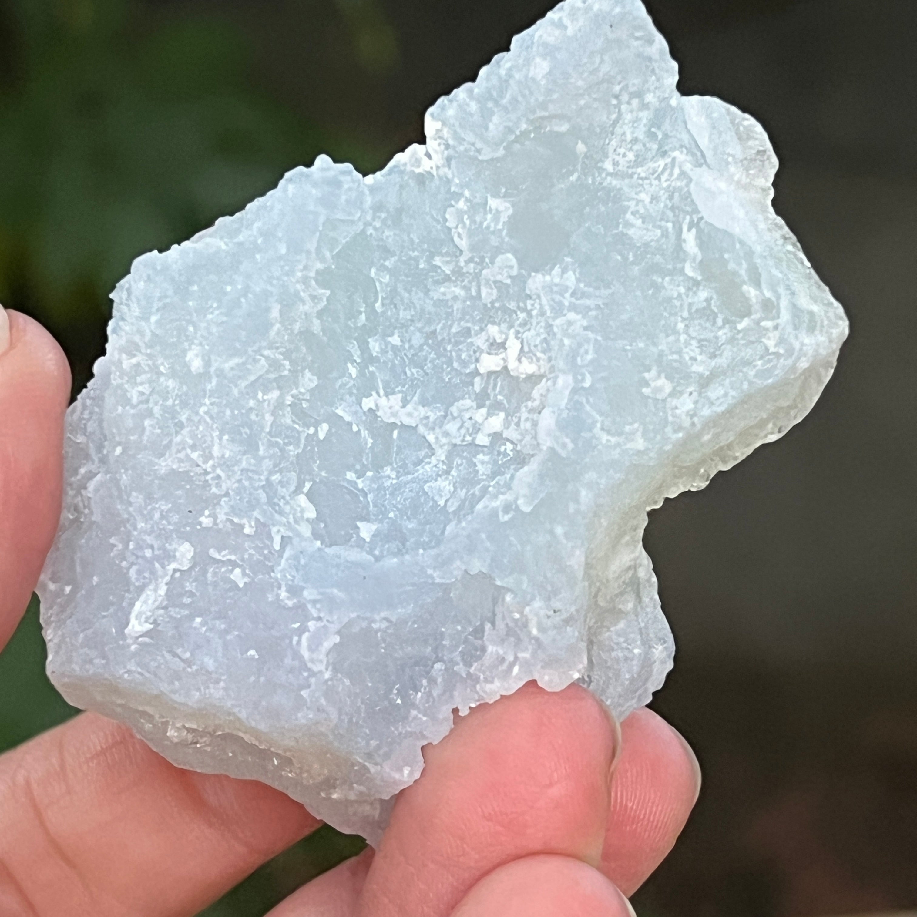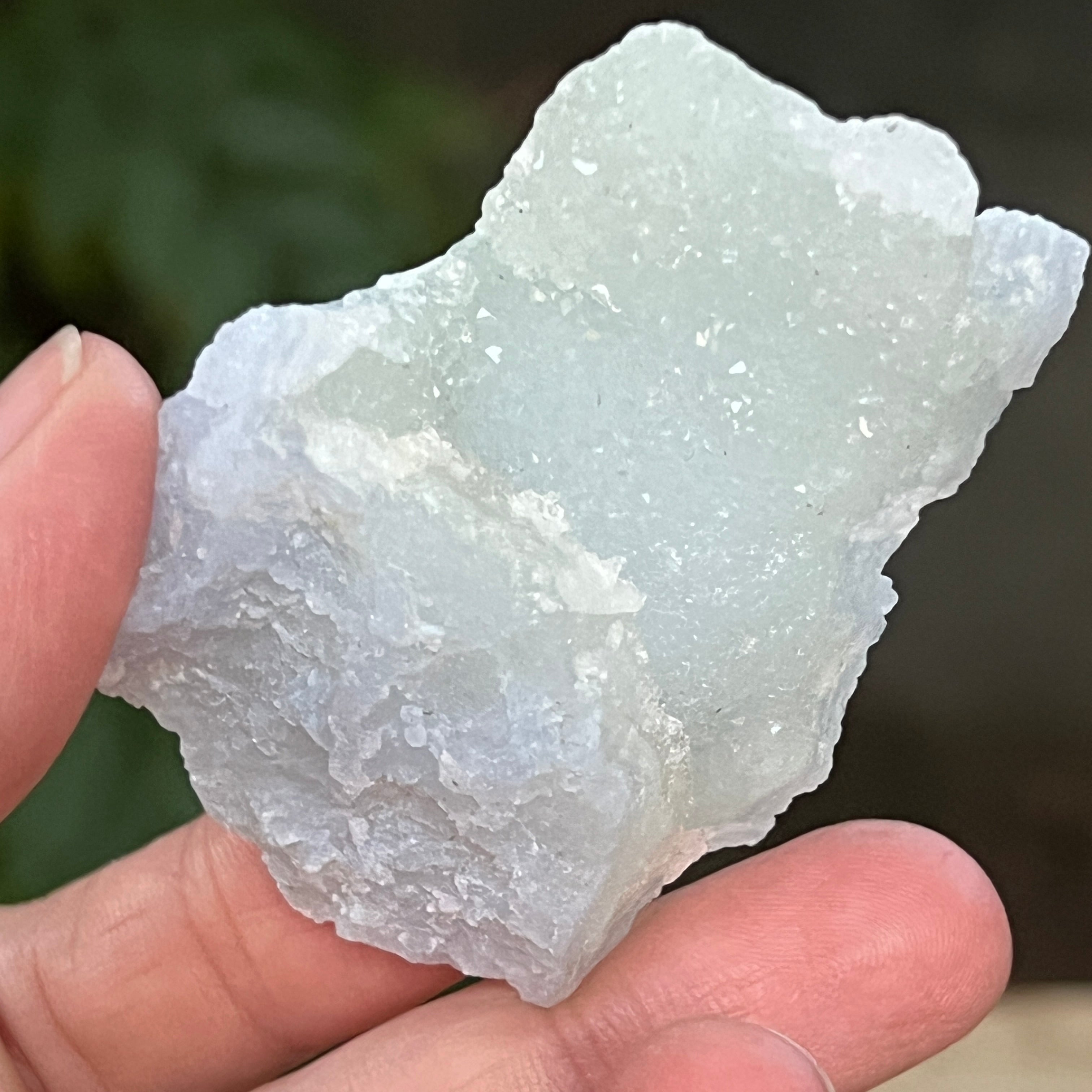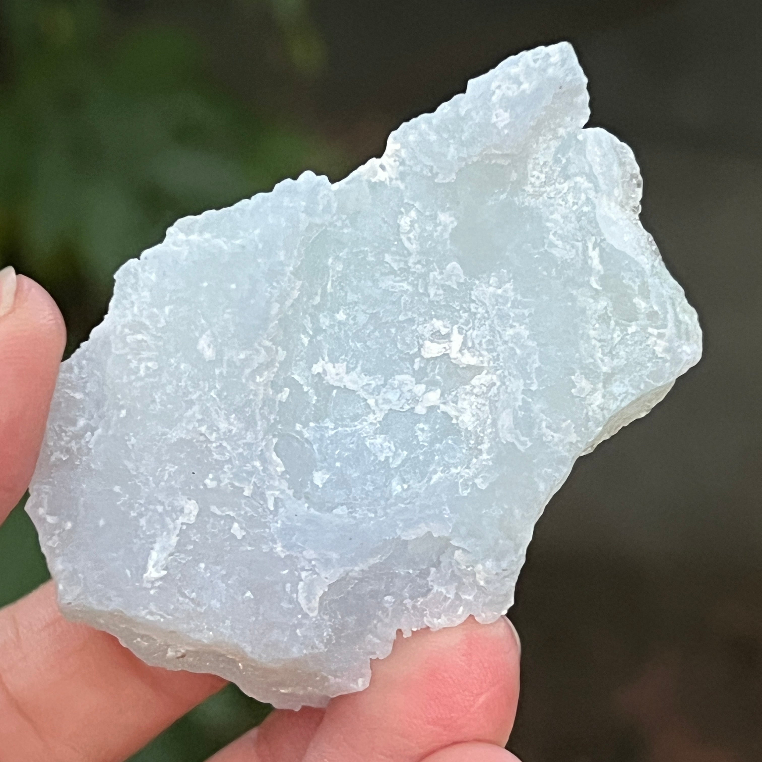 Примерък на синьо дантелово ахат и син калцедон, произхождащ от Нсанже, Малави. Тези изключителни образувания преминават през сложен процес на киселинни бани в Южна Африка, който внимателно отстранява повечето или всички следи от матрицата, оставяйки след себе си чист син дантелов ахат и/или син калцедон с изключителна красота.