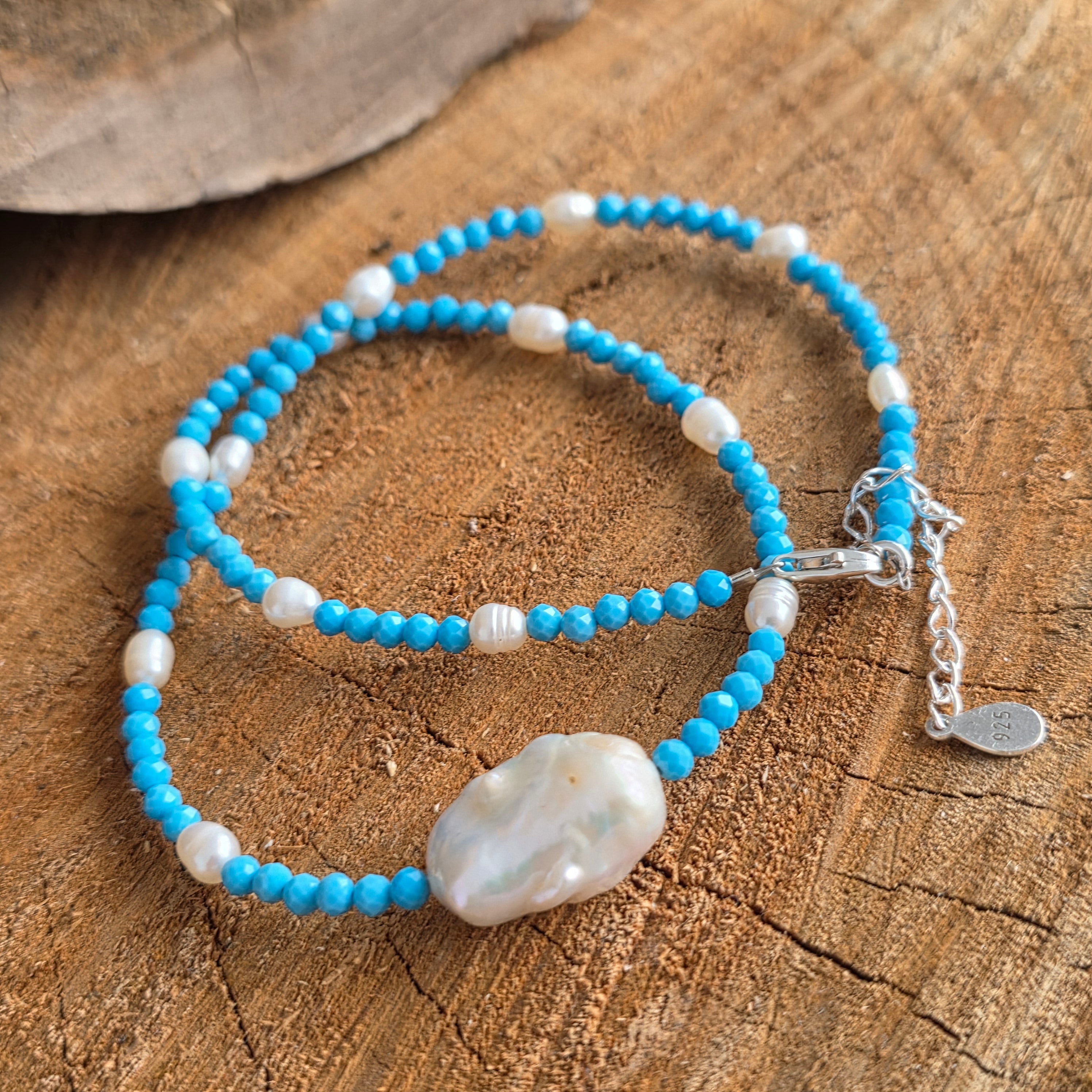 Синият ховлит е известен с ефекта си да успокоява умственото напрежение и да подпомага ясното, автентично и балансирано изразяване. Перлите, със своята несъвършена красота, добавят нежност и дълбочина – като покана просто да бъдете себе си.