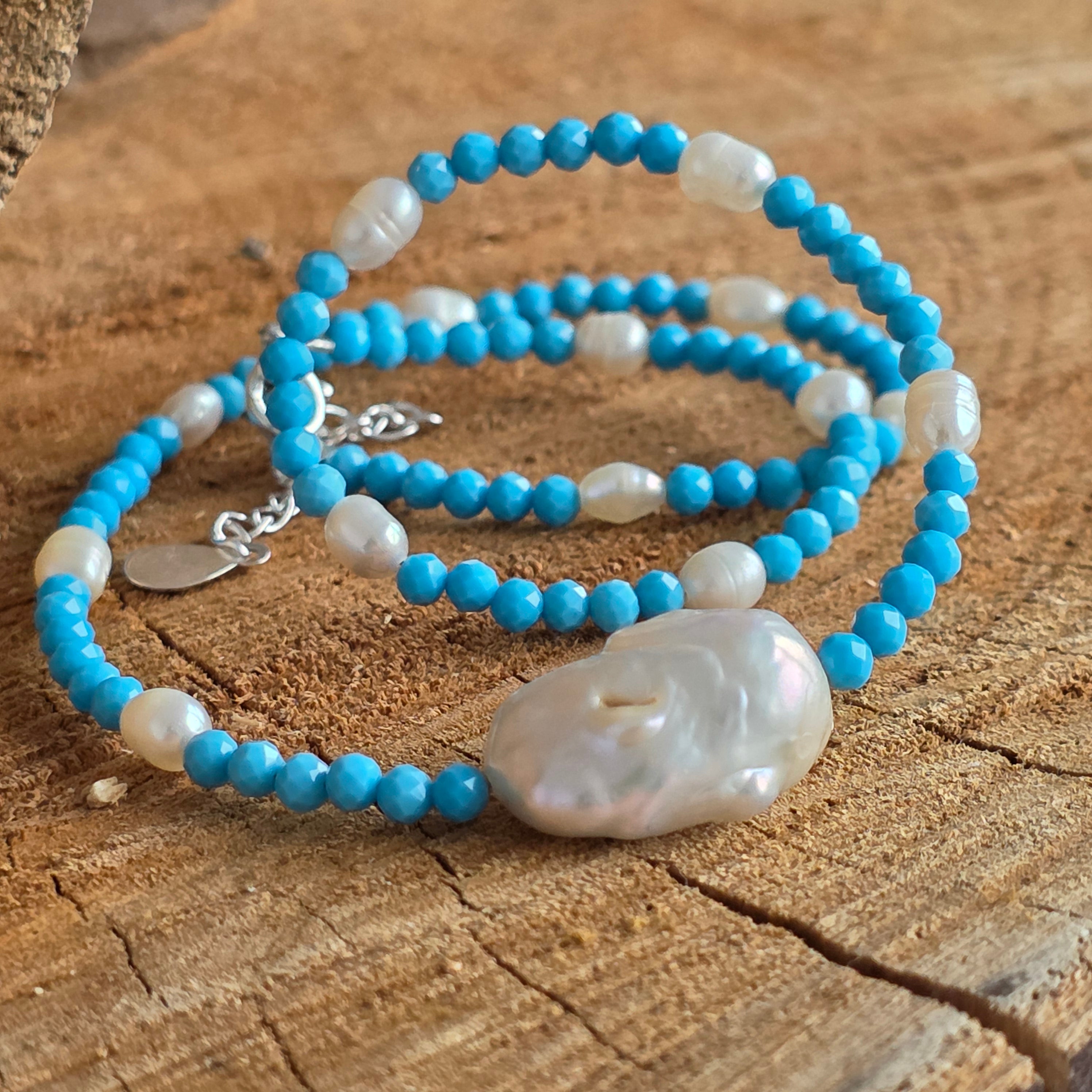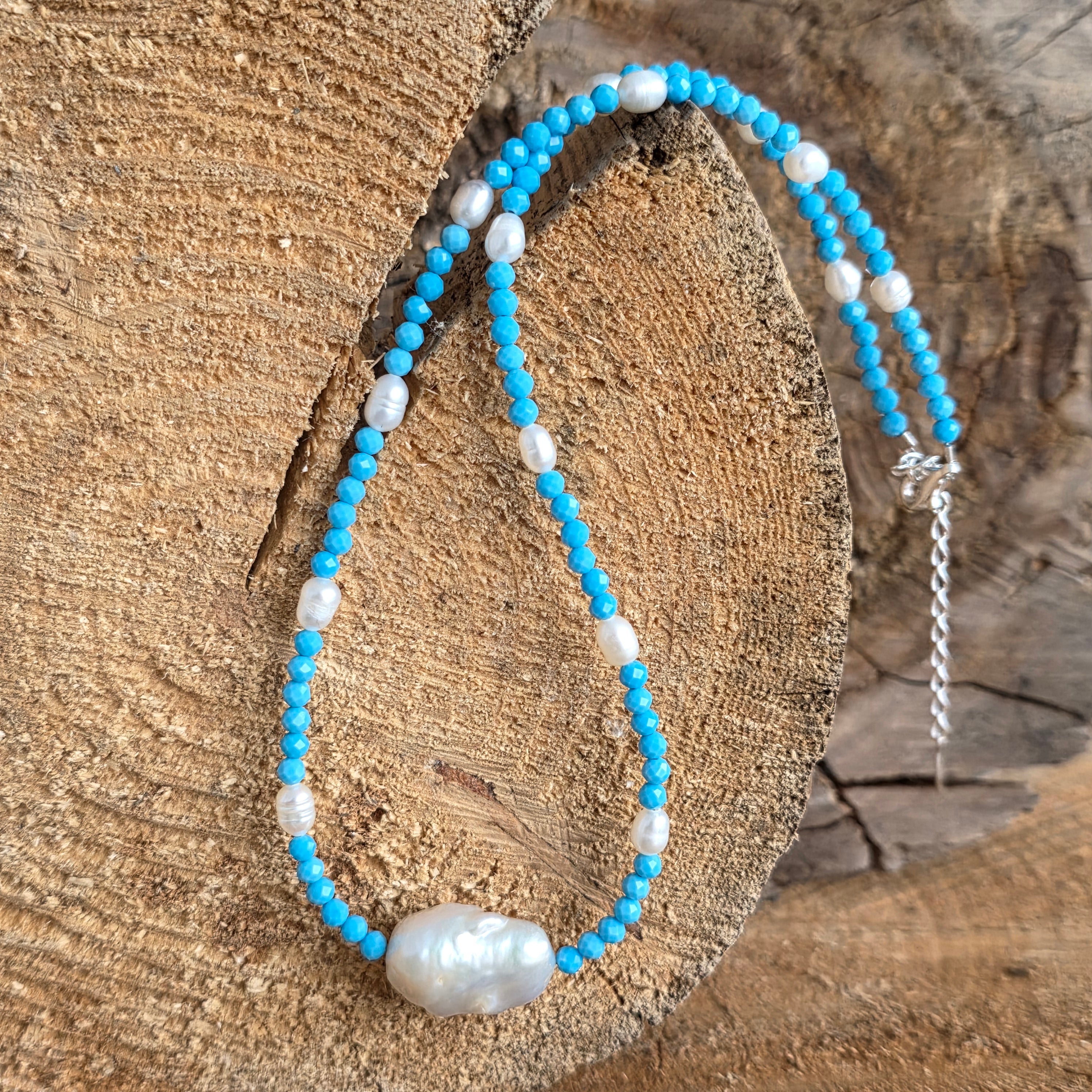 Колие, което се спуска като вълна на спокойна мисъл под кожата – съставено от фасетирани мъниста от син ховлит, 2,5–3 мм, които вибрират в успокояващи тюркоазени тонове, като дълбоко и спокойно дишане.