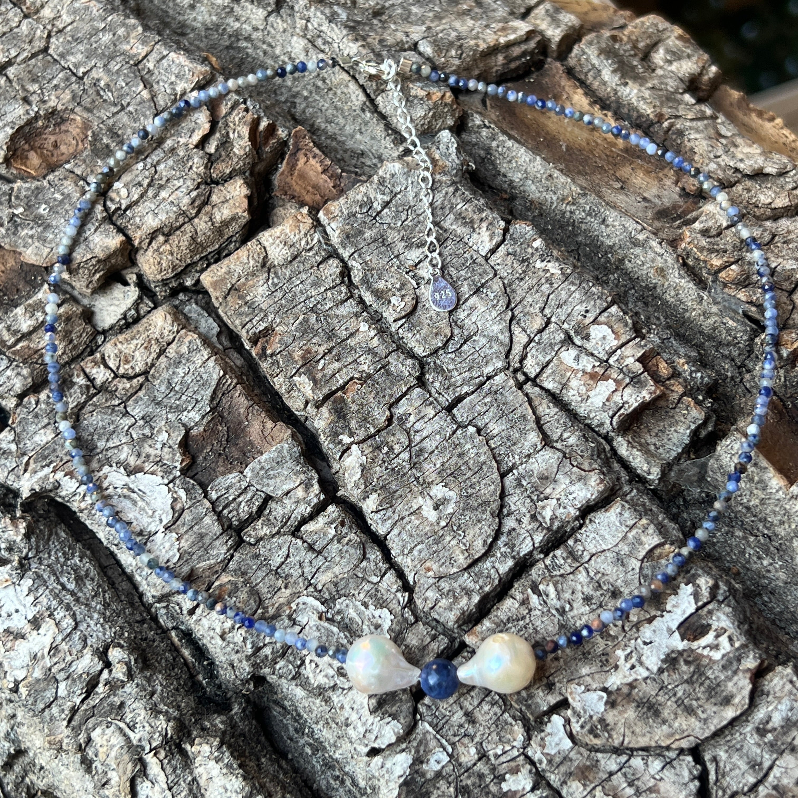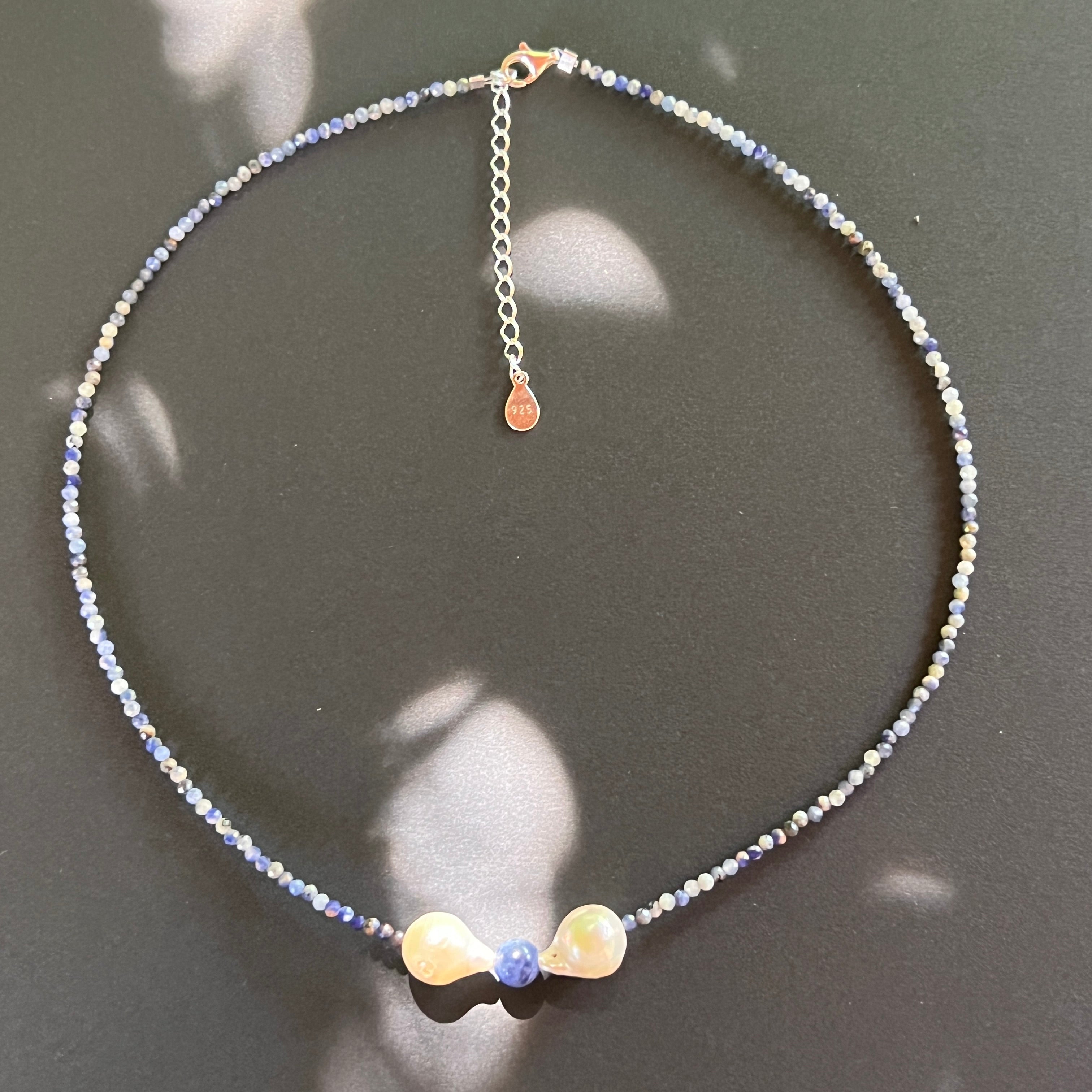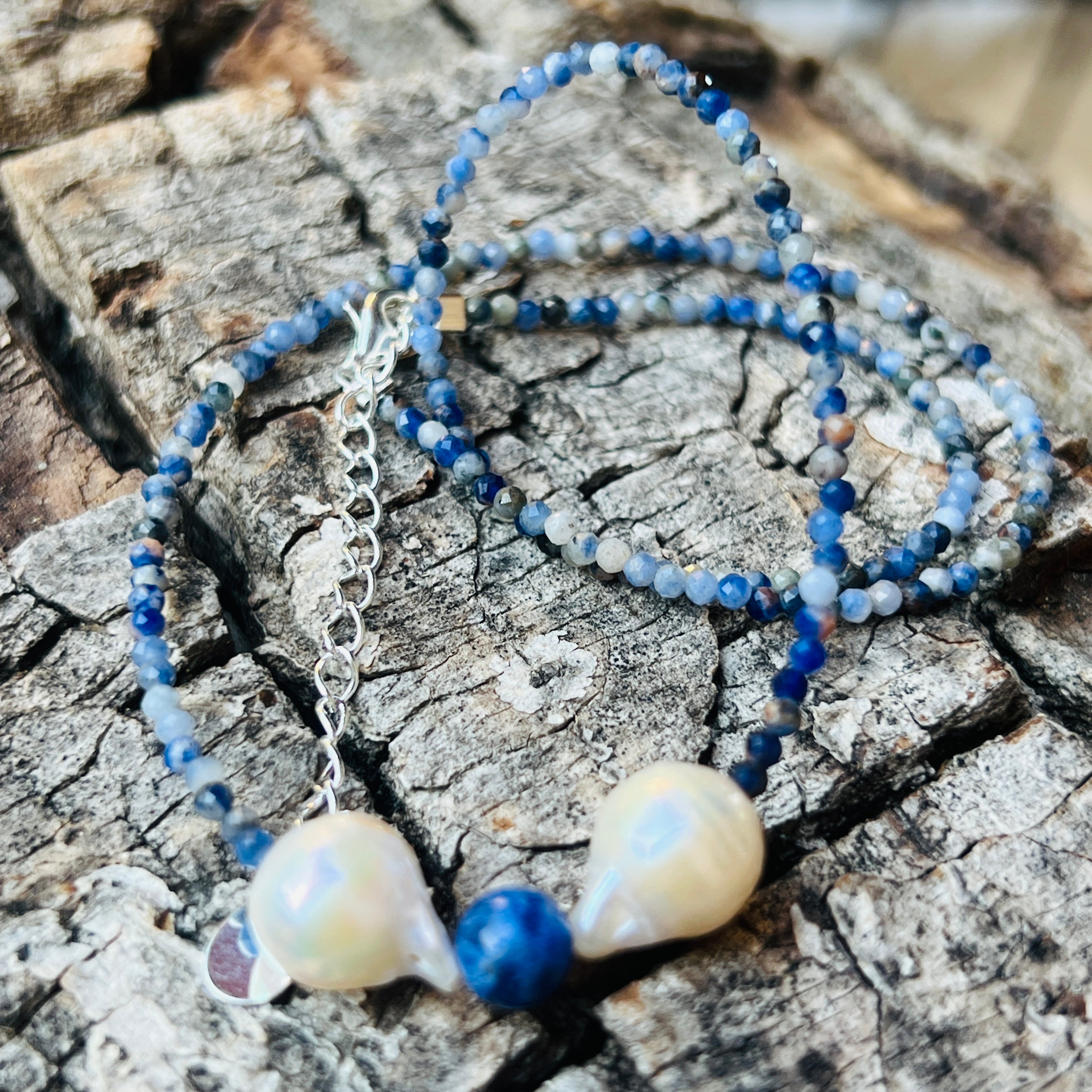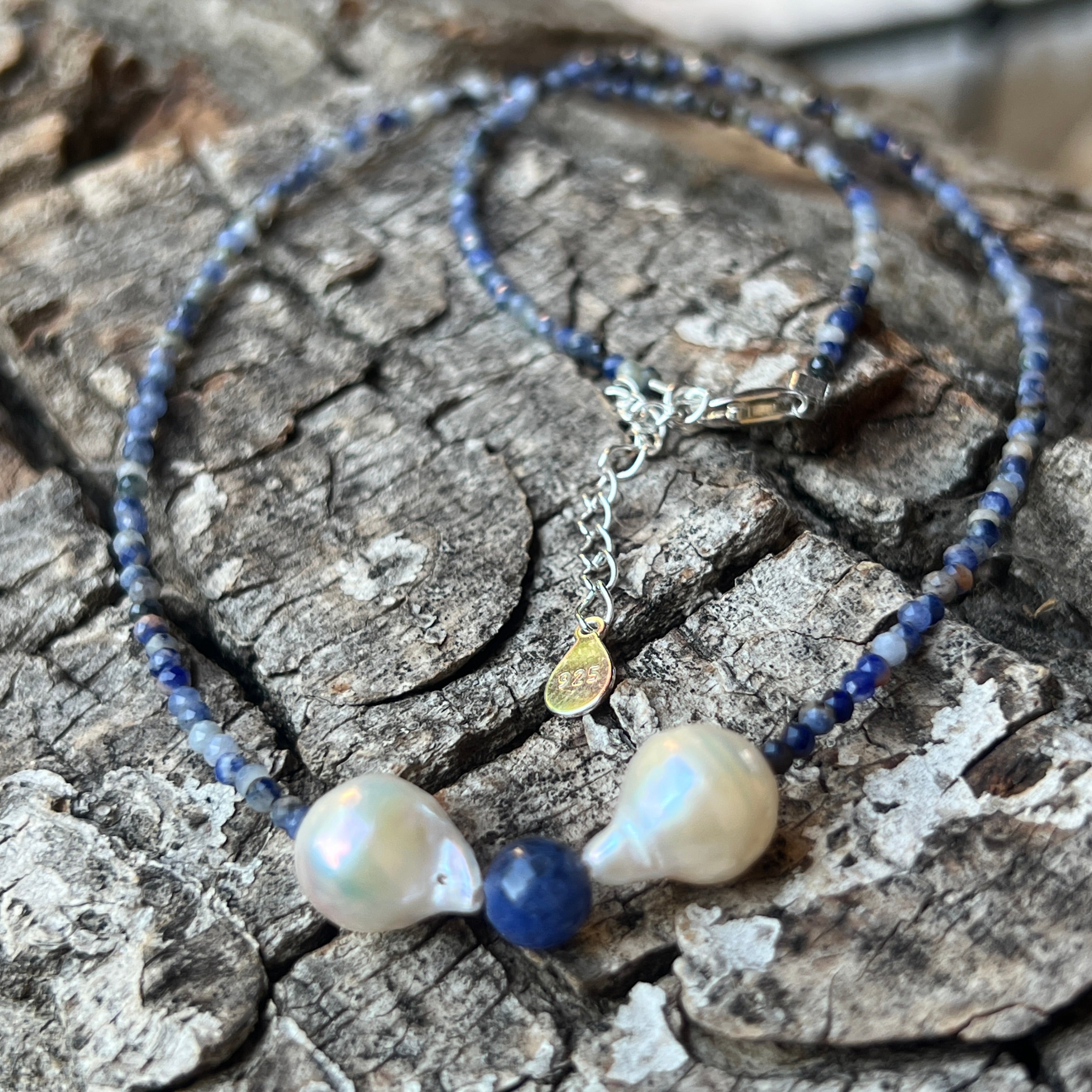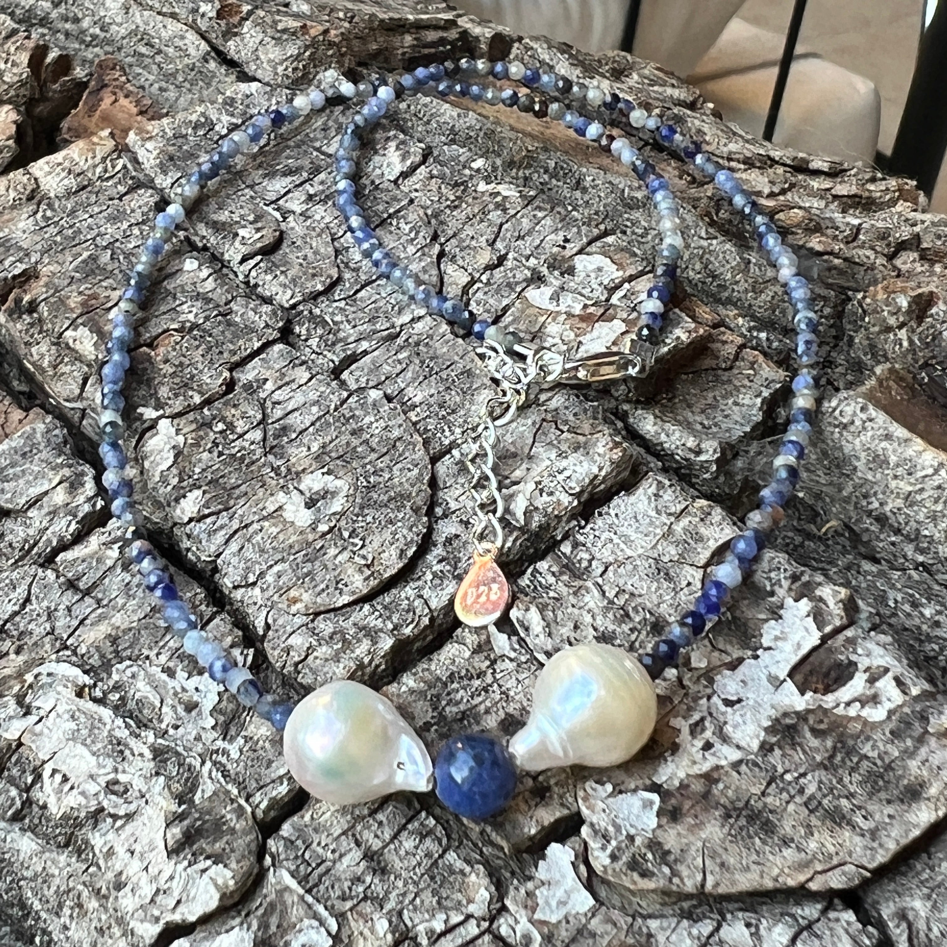 Материали: фасетиран син авантюрин 2,5 мм, содалит 6 мм, неправилни перли ~1 см, сребро 925
