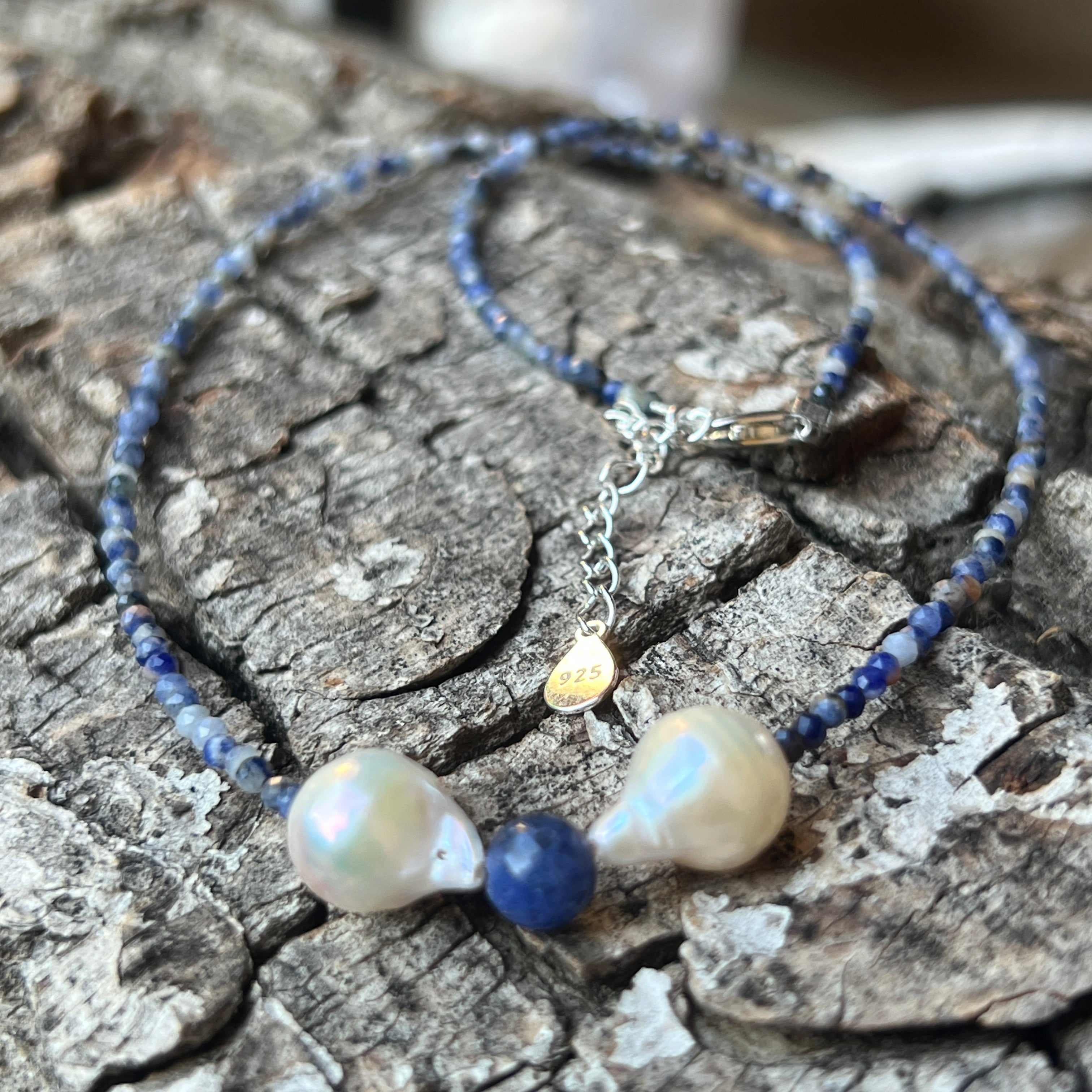 Син авантюрин това е камъкът на спокойствието и автентичния израз – тиха опора в процеса на слушане и яснота. Содалитът, в наситени нюанси на синьо с бели жилки, засилва вътрешната увереност и отваря пътя на ясните мисли. А перлите, с техните органични форми, носят женственост, чувствителност и докосване до несъвършена чистота – онова автентично красиво, което не се вписва в моделите.
