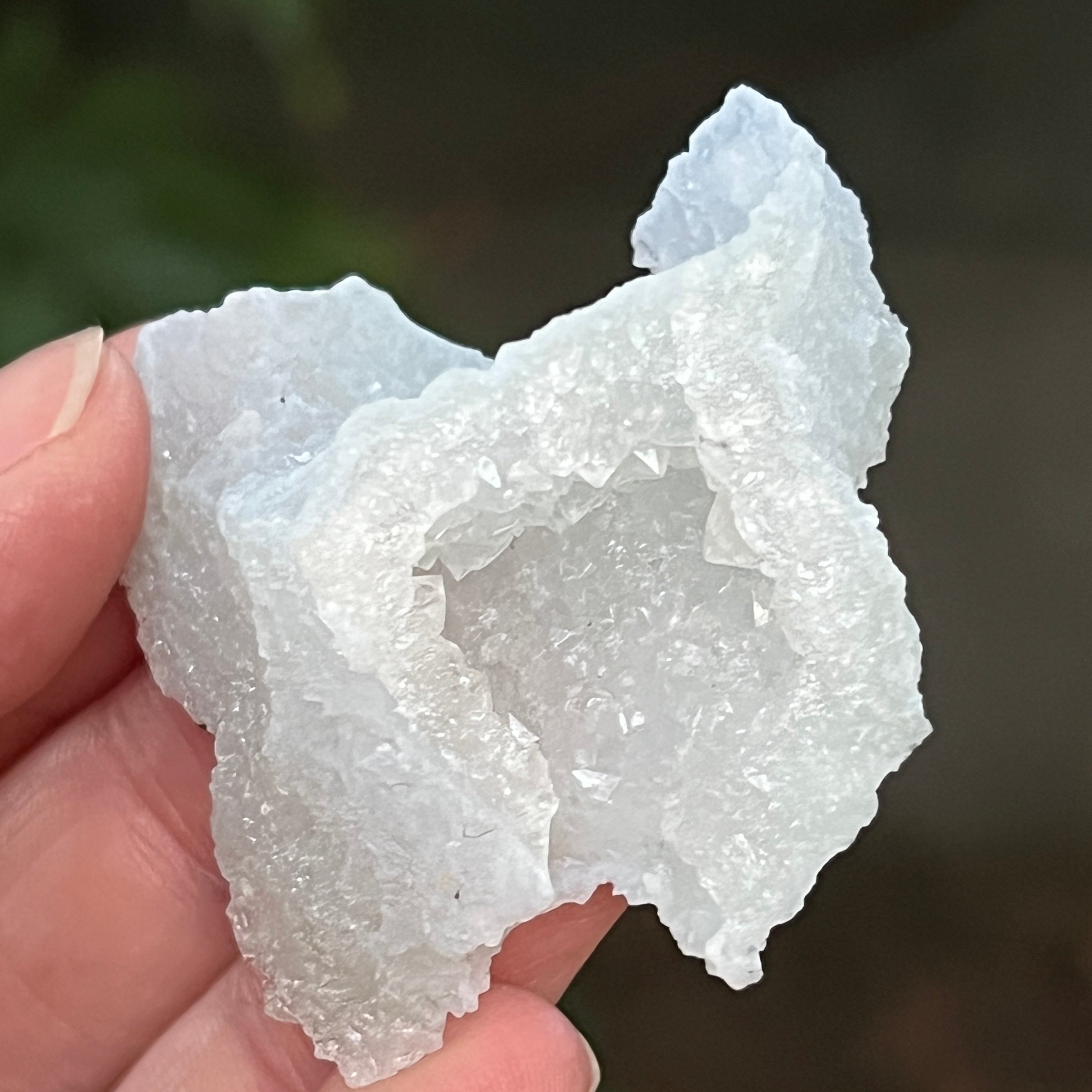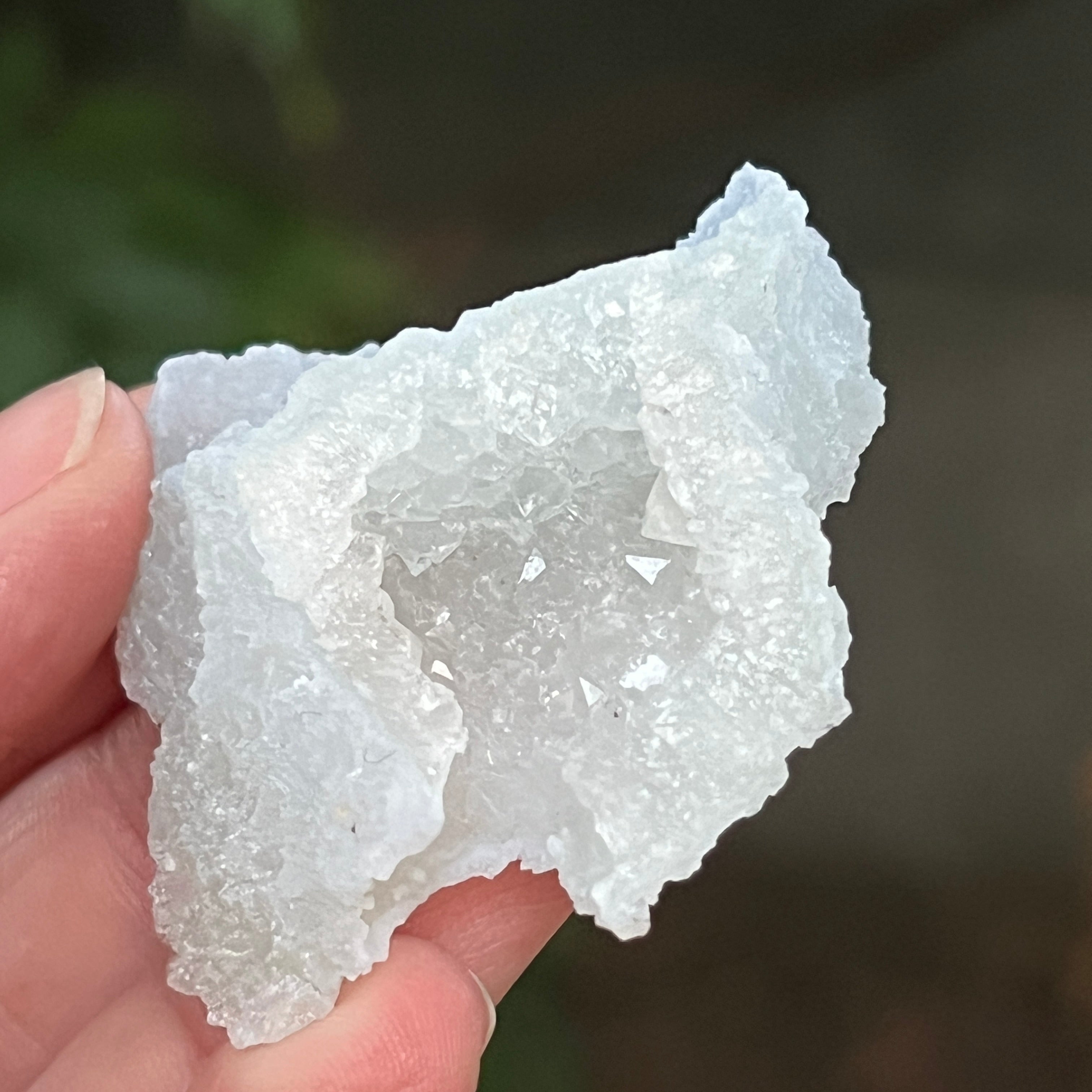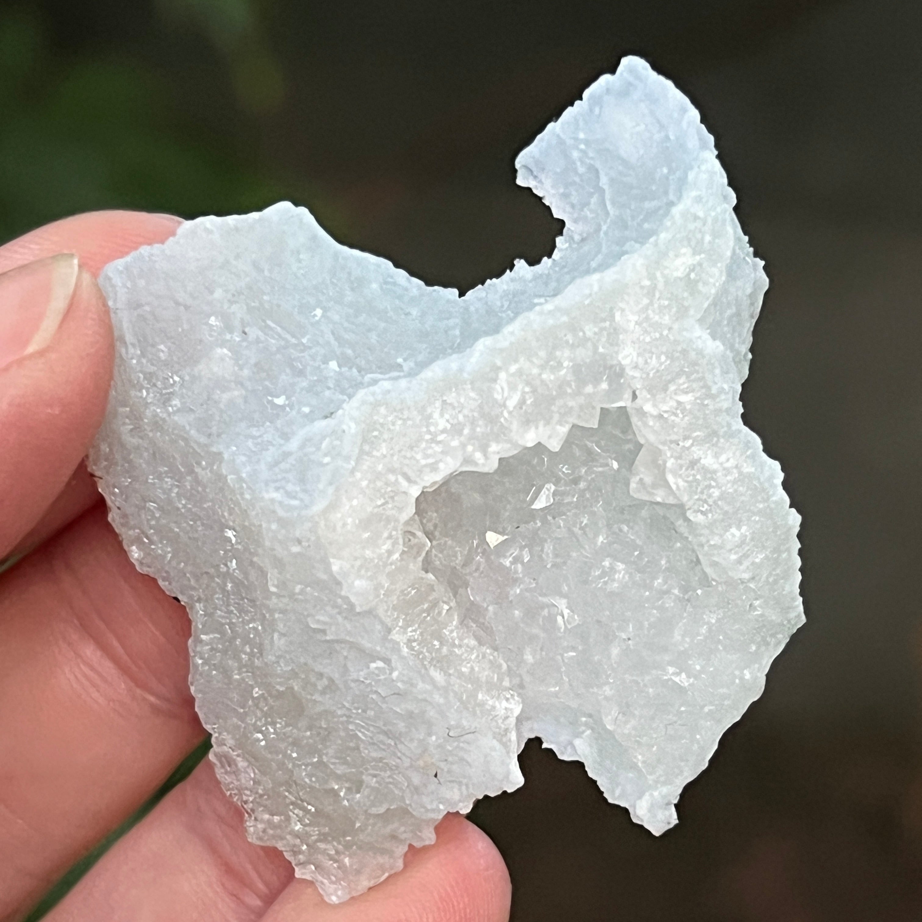 Примерък на син дантелен ахат и син калцедон, произхождащ от Нсанже, Малави. Тези уникални образувания преминават през сложен процес на киселинни бани в Южна Африка, който внимателно отстранява повечето или всички следи от матрицата, оставяйки чист син дантелен ахат и/или син калцедон с удивителна красота.