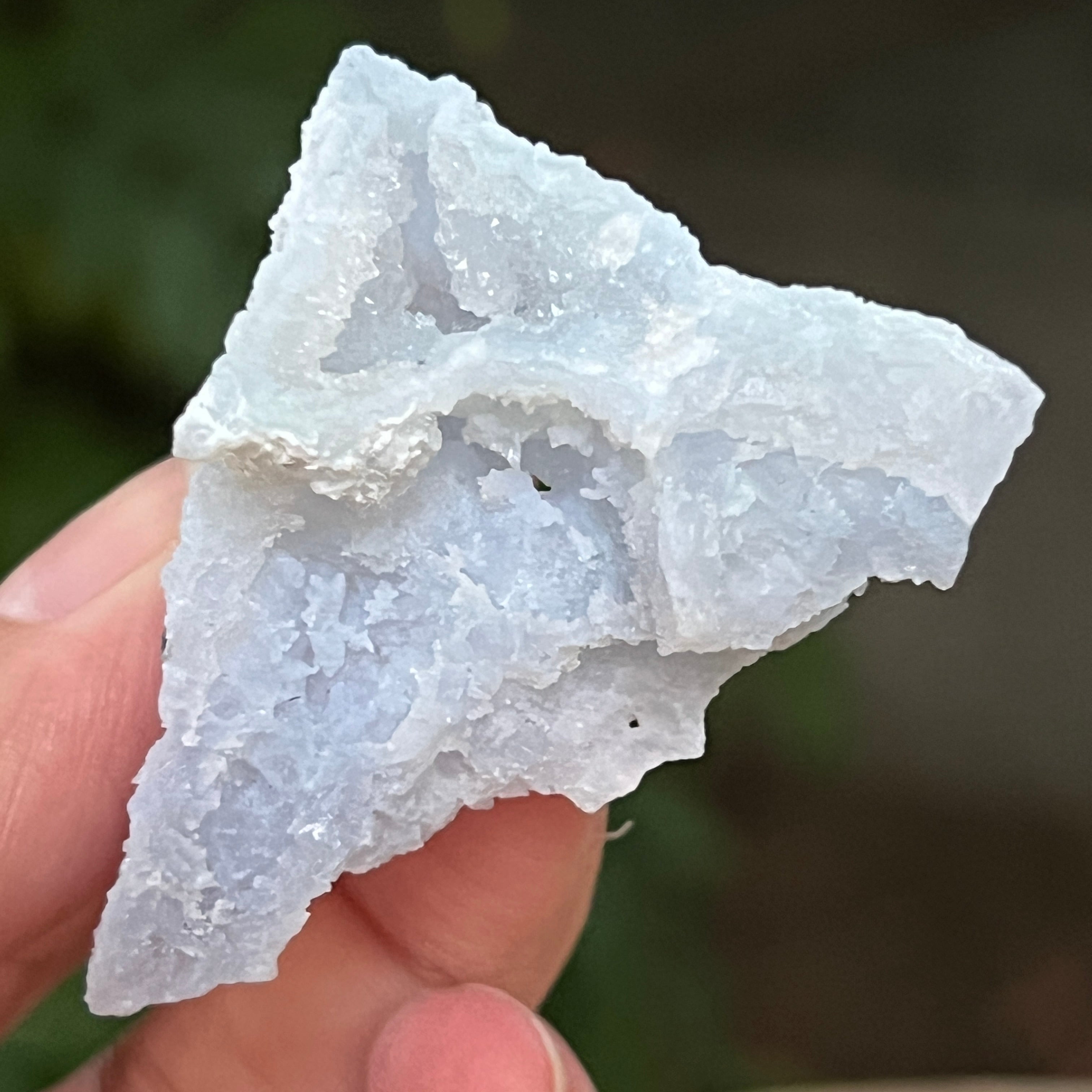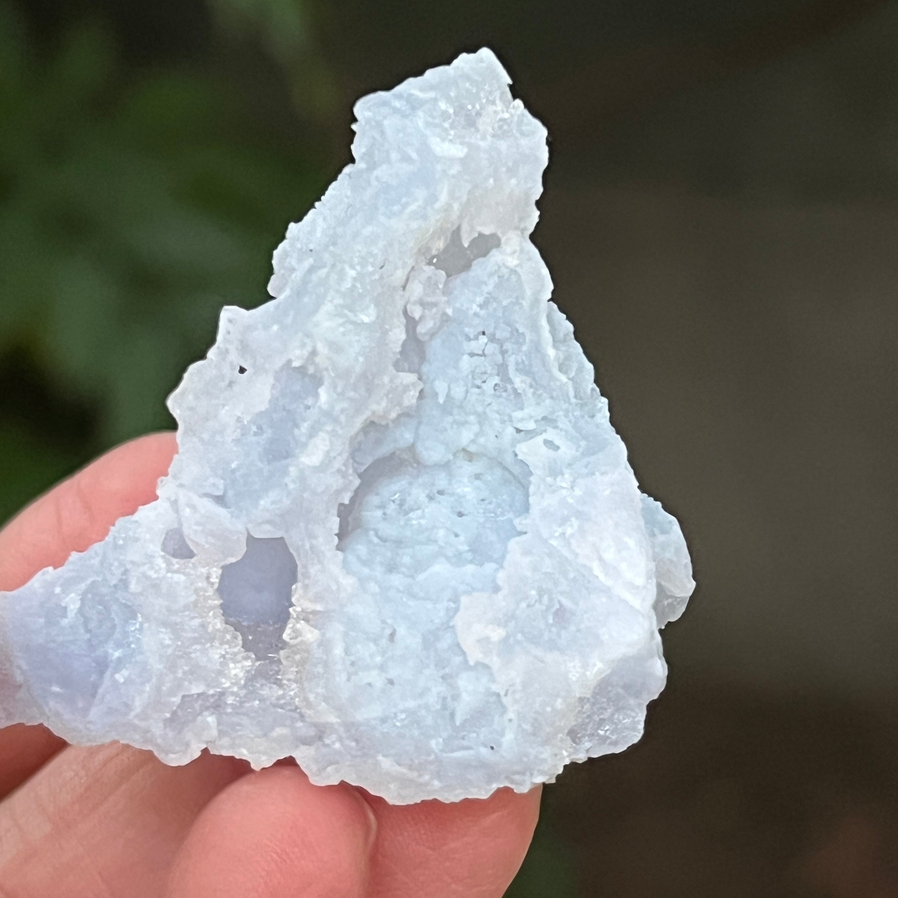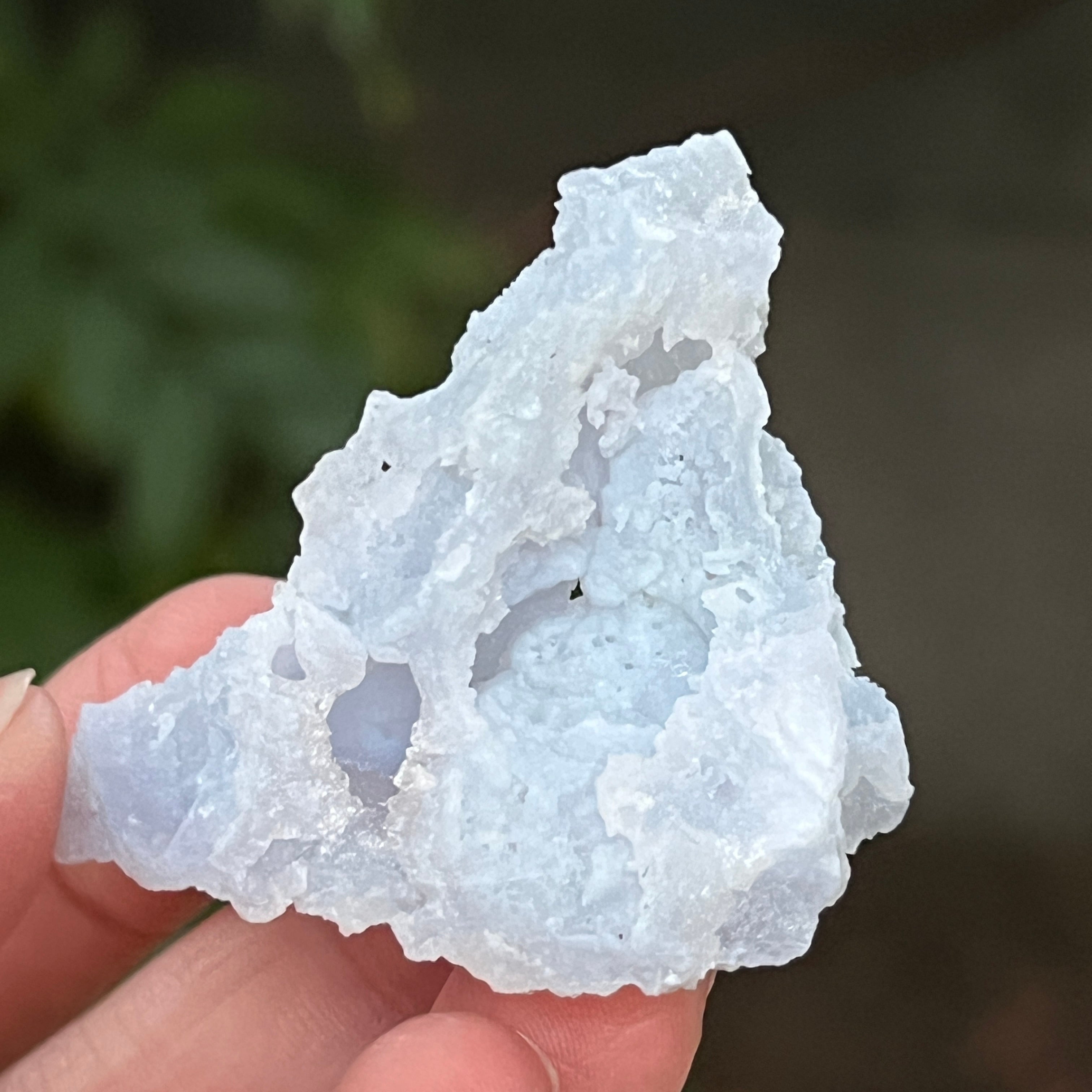 Примерък от Син Дантелен Ахат и Син Калцедон, произхождащ от Нсанже, Малави. Тези изключителни образувания преминават през сложен процес на киселинни бани в Южна Африка, който внимателно отстранява по-голямата част или всички следи от матрица, оставяйки след себе си чист Син Дантелен Ахат и/или Син Калцедон с изключителна красота.