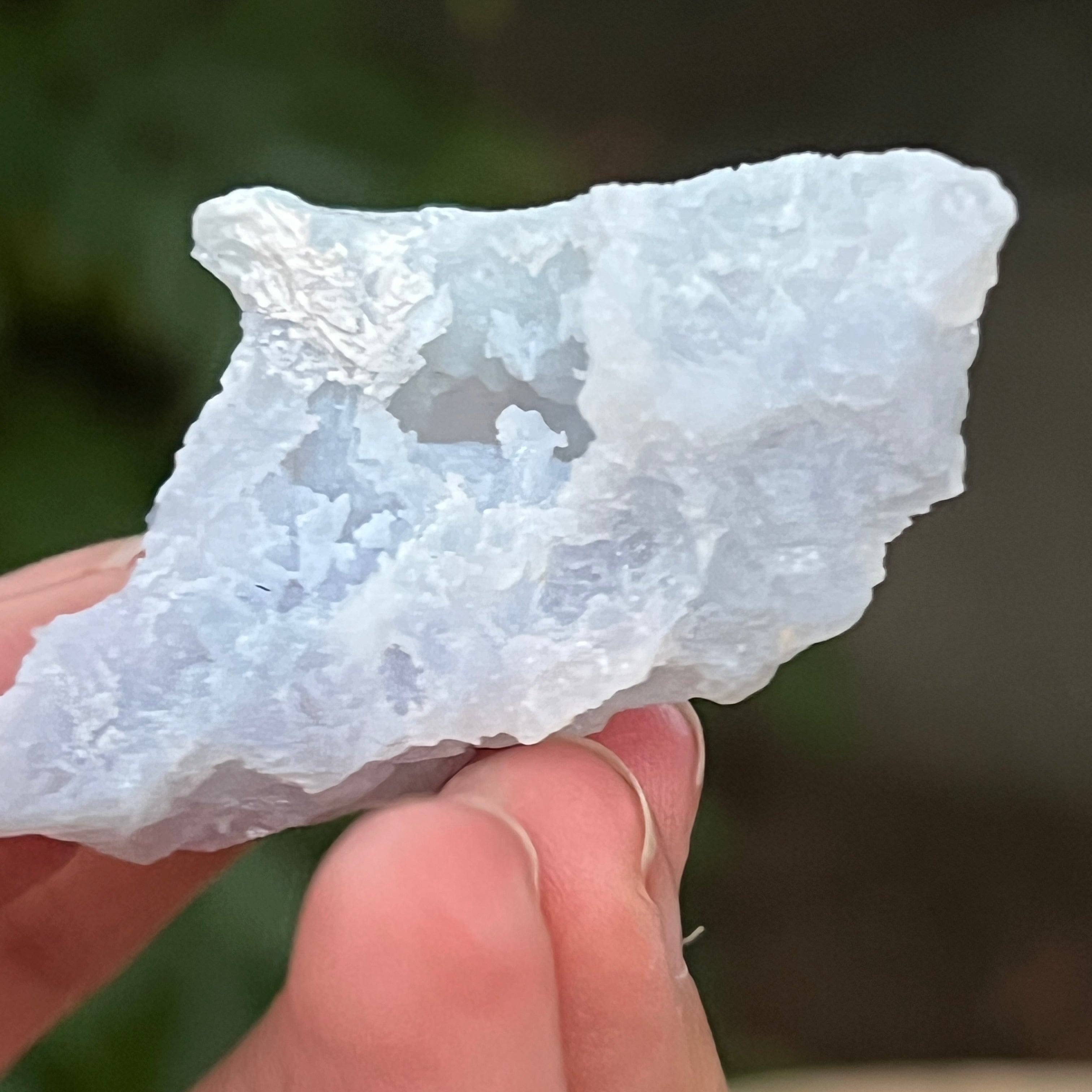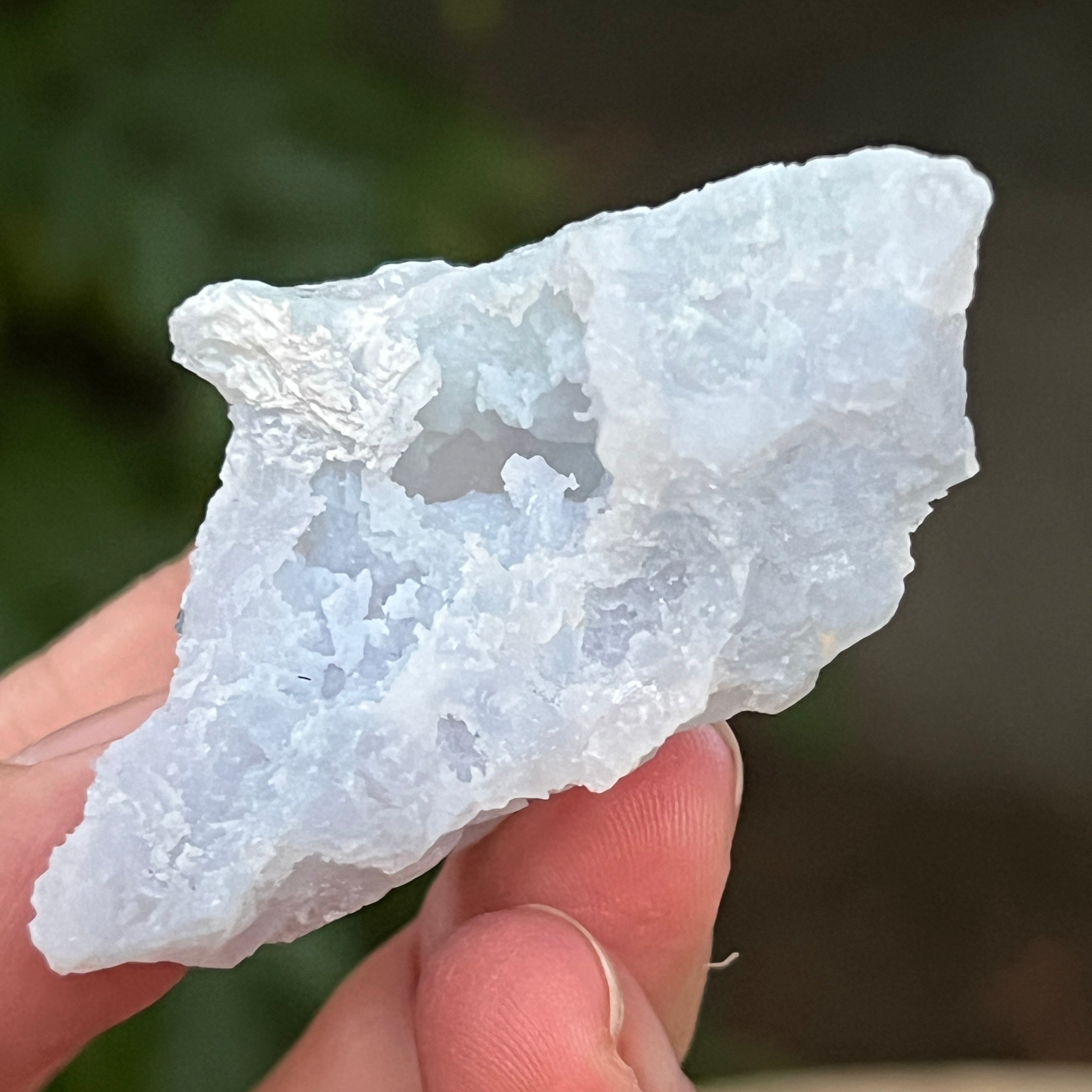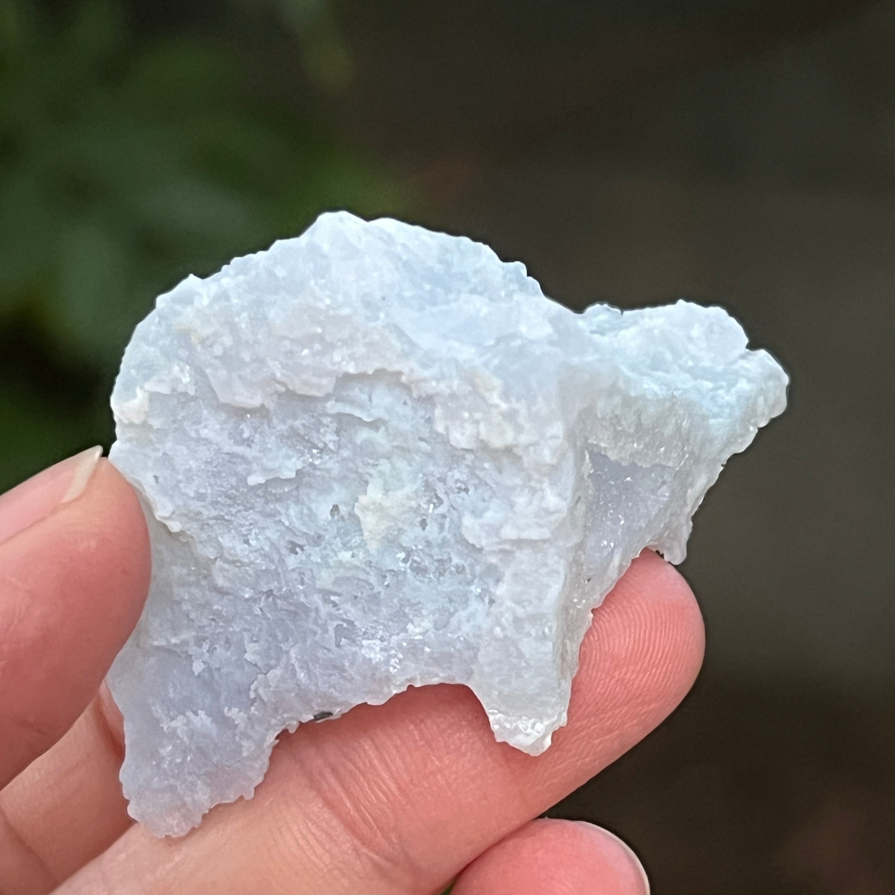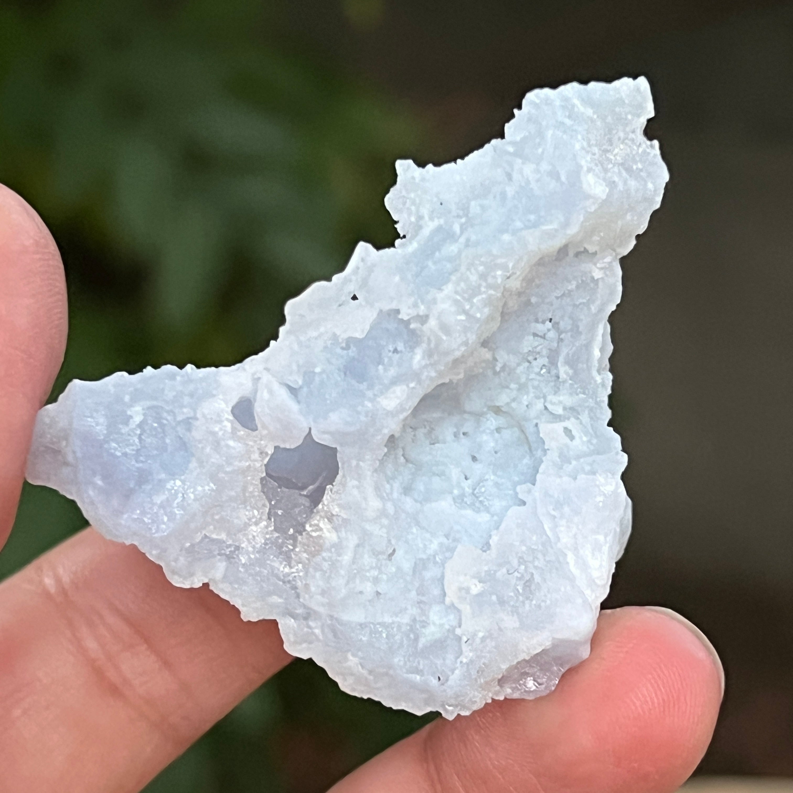 Примерък от Син Дантелен Ахат и Син Калцедон, произхождащ от Нсанже, Малави. Тези изключителни образувания преминават през сложен процес на киселинни бани в Южна Африка, който внимателно отстранява по-голямата част или всички следи от матрица, оставяйки след себе си чист Син Дантелен Ахат и/или Син Калцедон с изключителна красота.