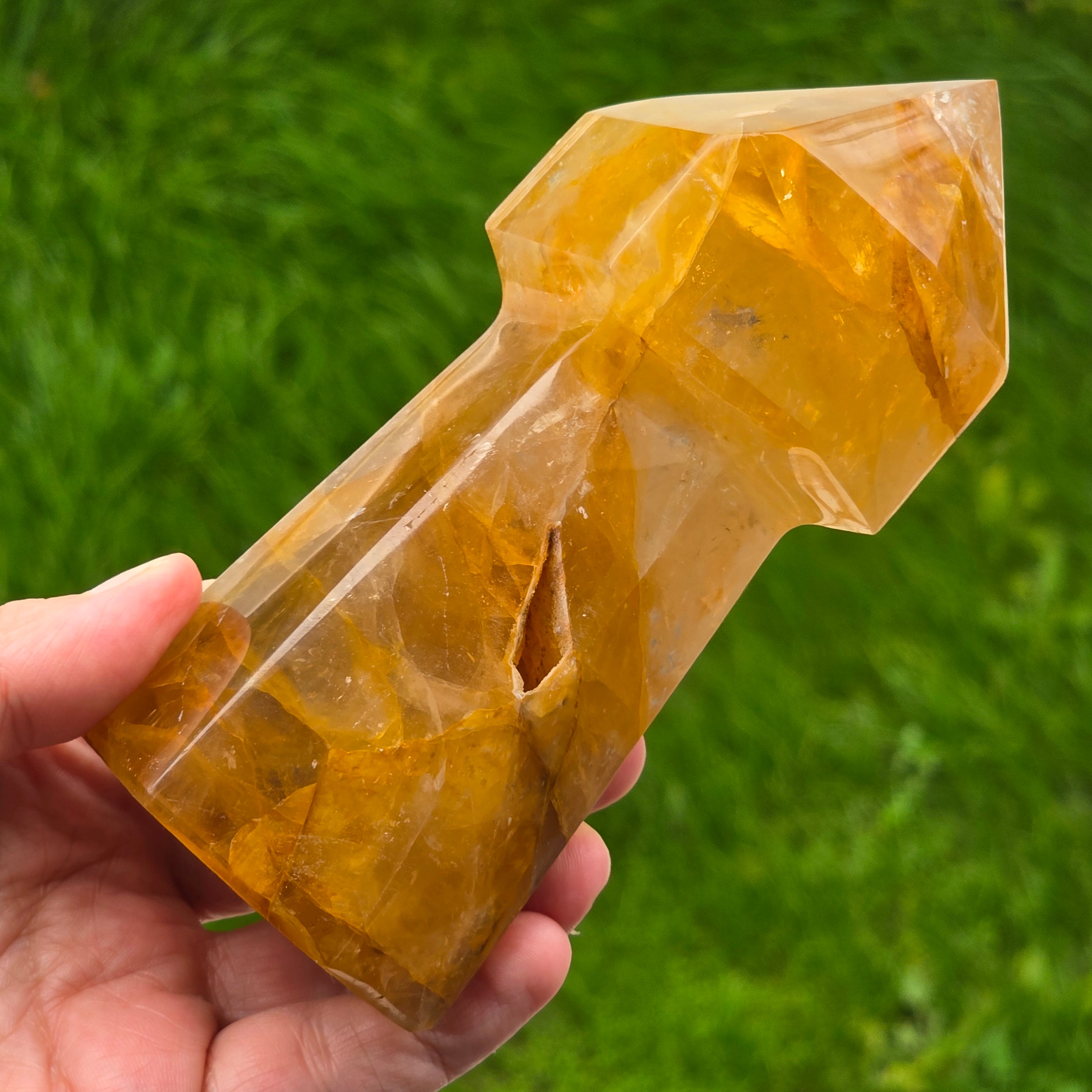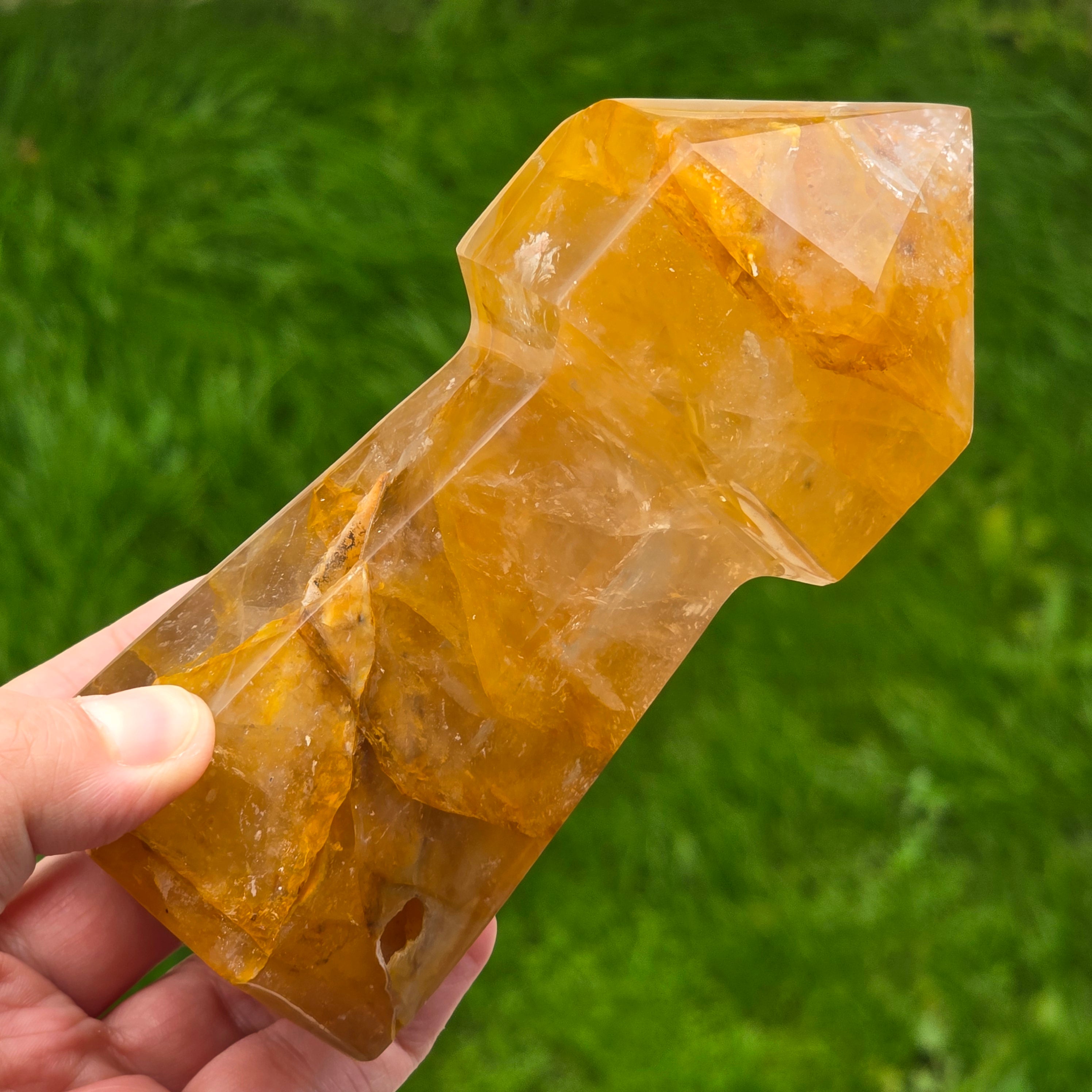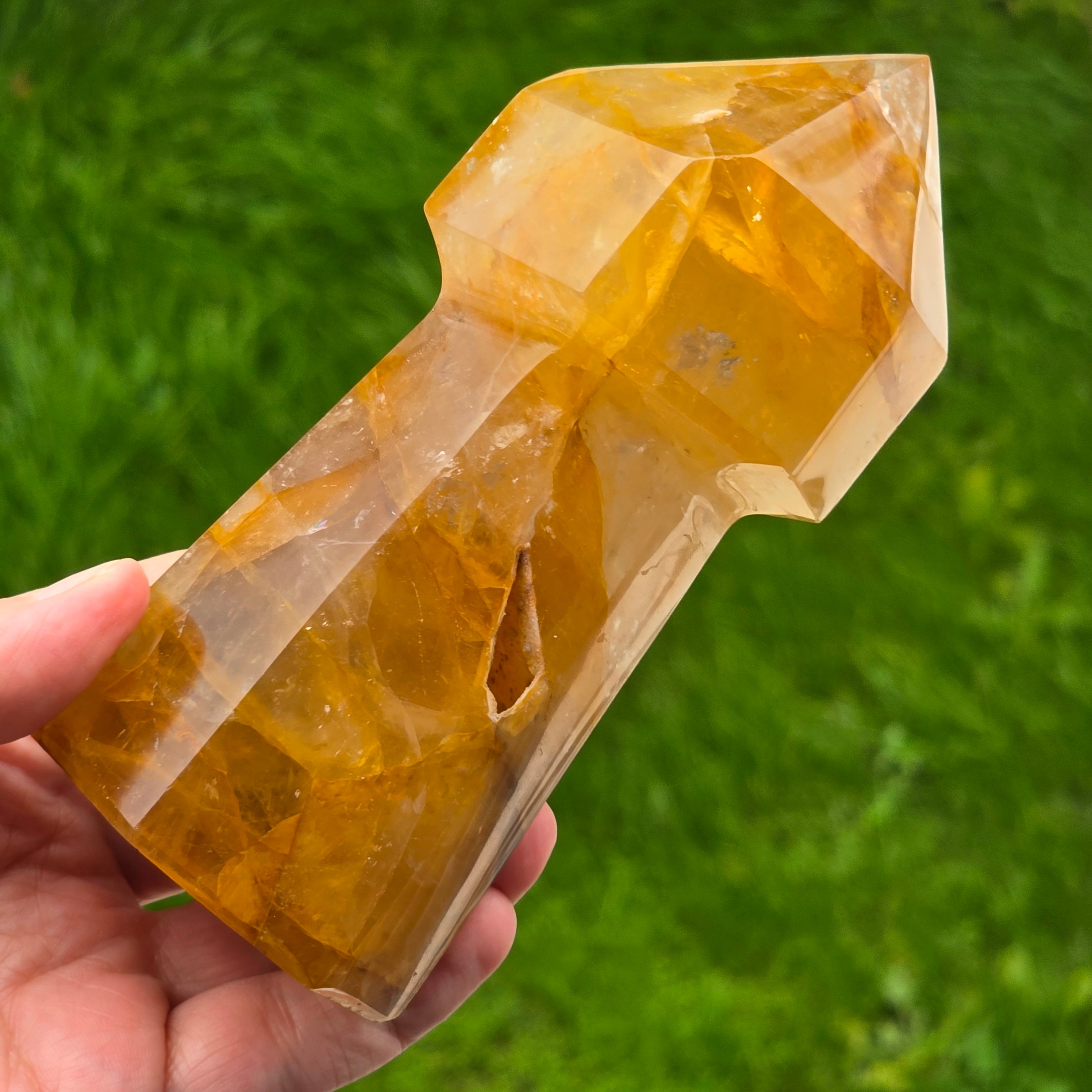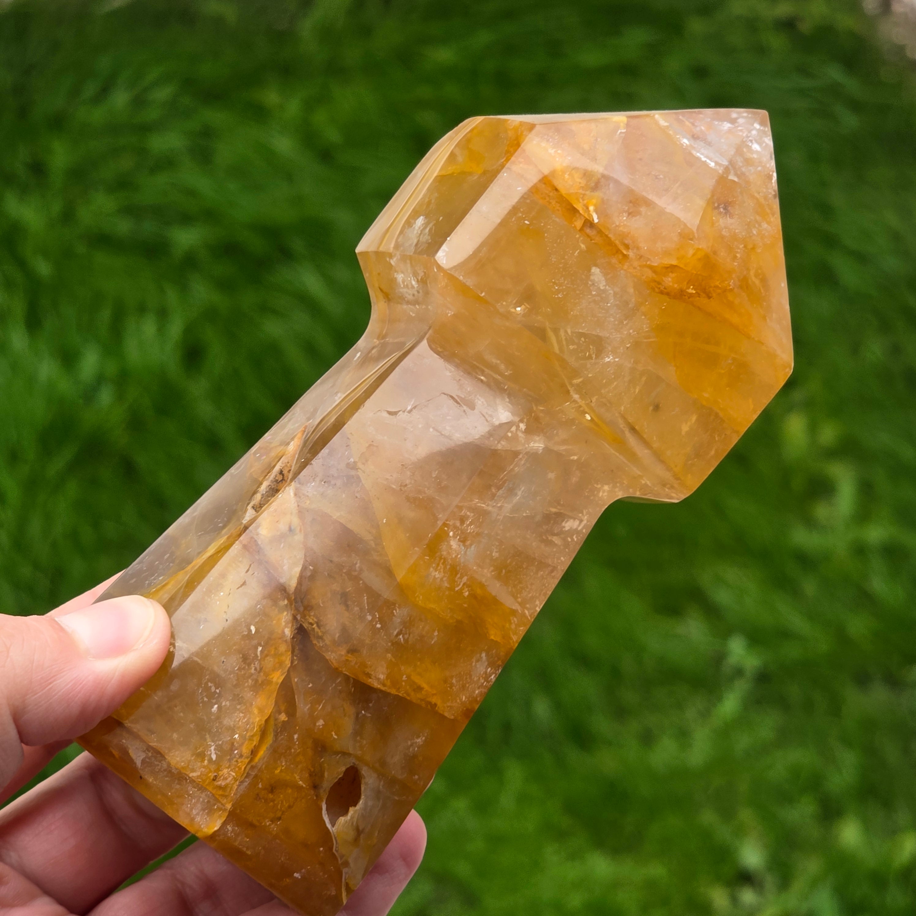 Лимоновият кварцов скиптър е ярко и изразително произведение, издълбано, за да подчертае нежната прозрачност и топлите жълти нюанси на кристала. Lemon Quartz е известен със своята визуална яснота и деликатните отражения, които се образуват при докосване от светлина, а формата му на скиптър му придава елегантно и насочено присъствие. Под формата на скиптър, кристалът става идеален за насочване на енергия, работа върху меридиани, енергиен масаж, активиране на намеренията и освобождаване на напрежение от тялото. Добре оформеният му връх позволява прецизна работа, а долната част стабилизира енергийния поток по време на медитация или терапия.