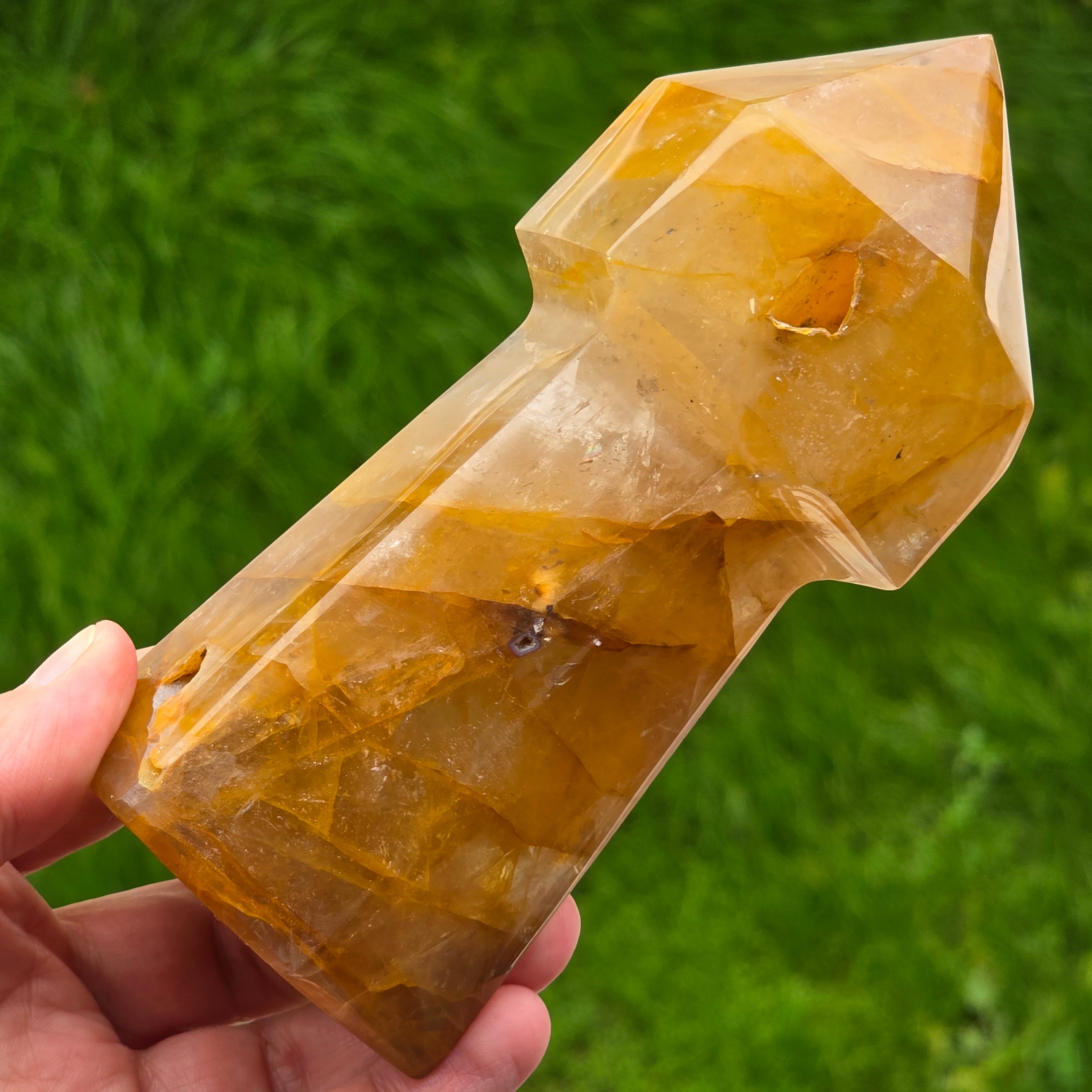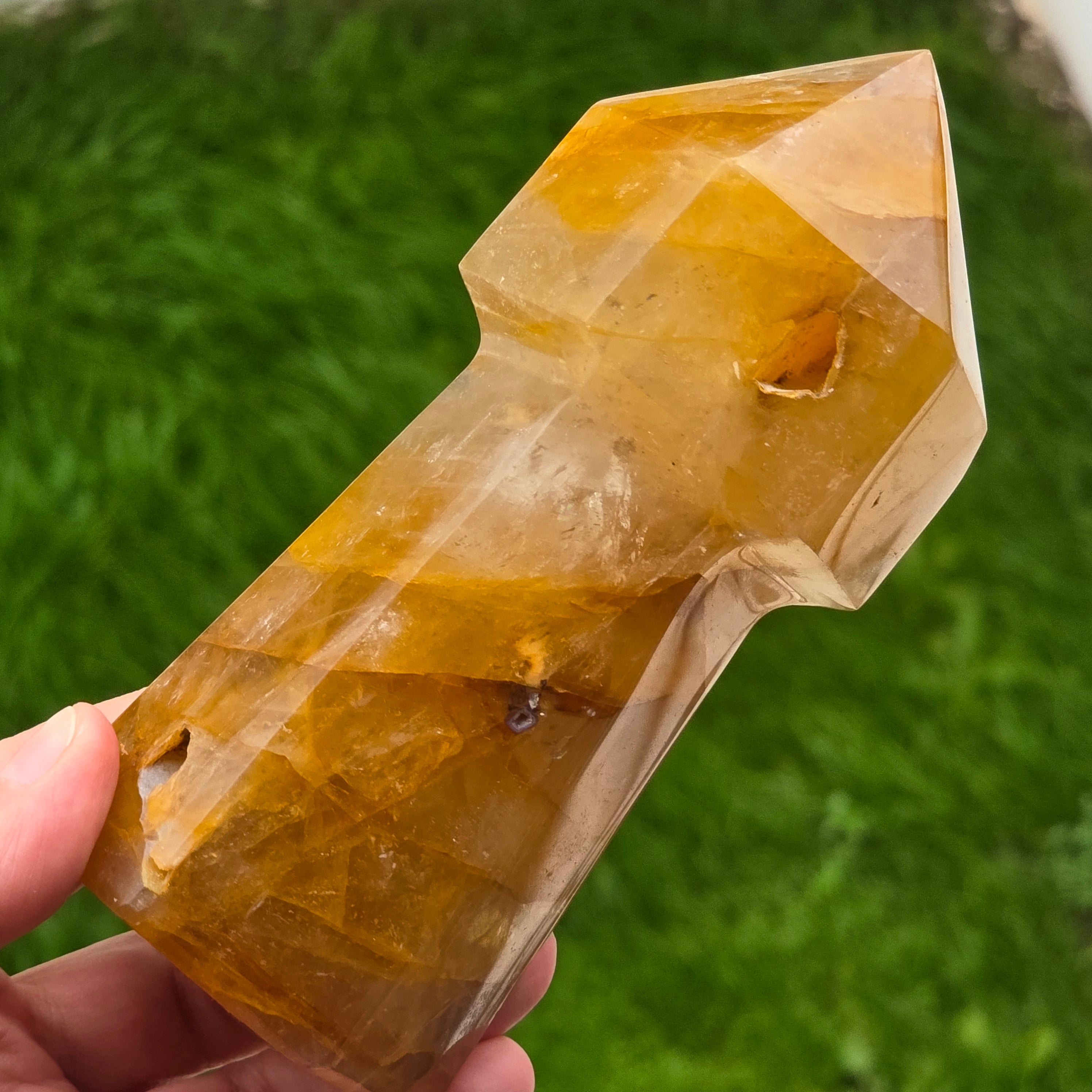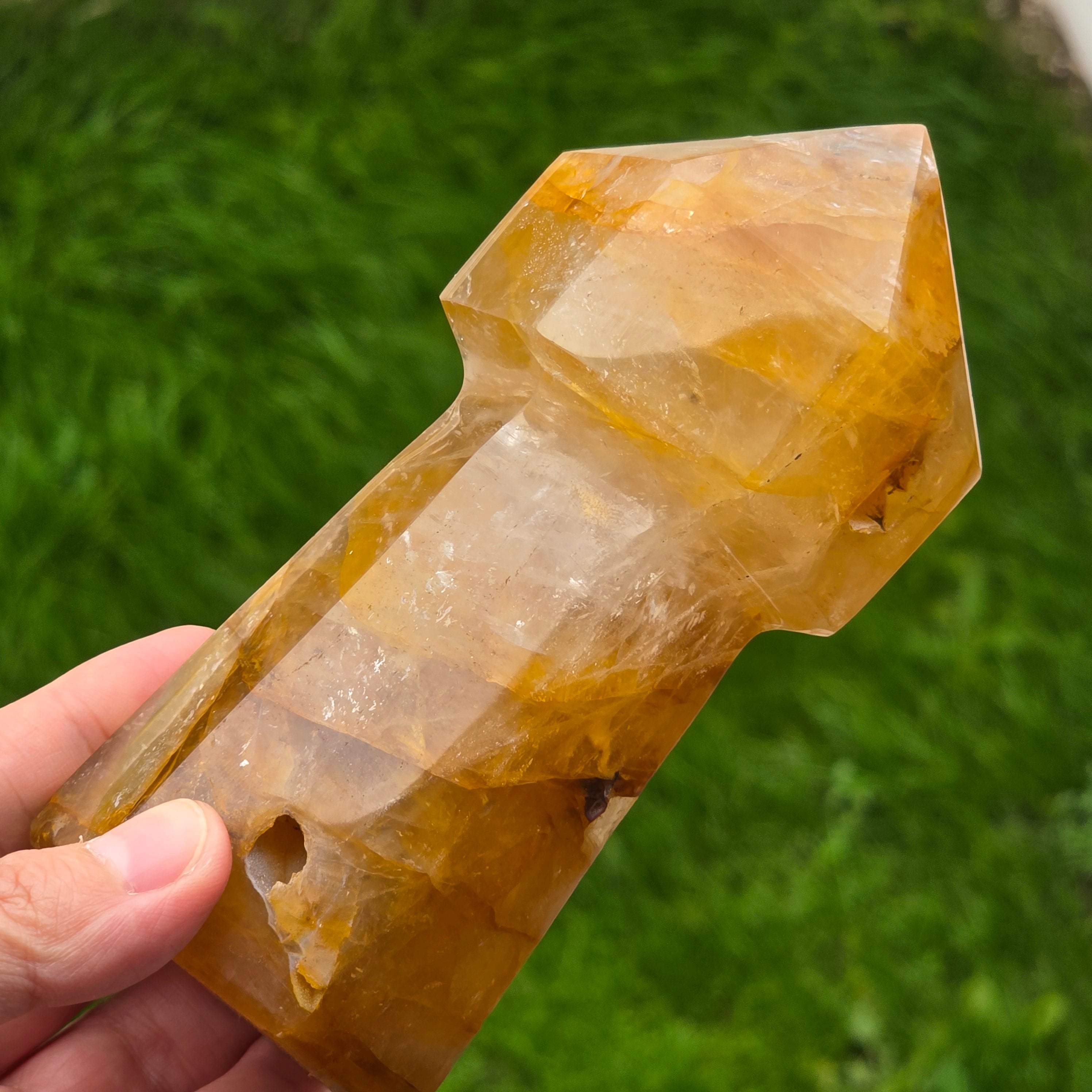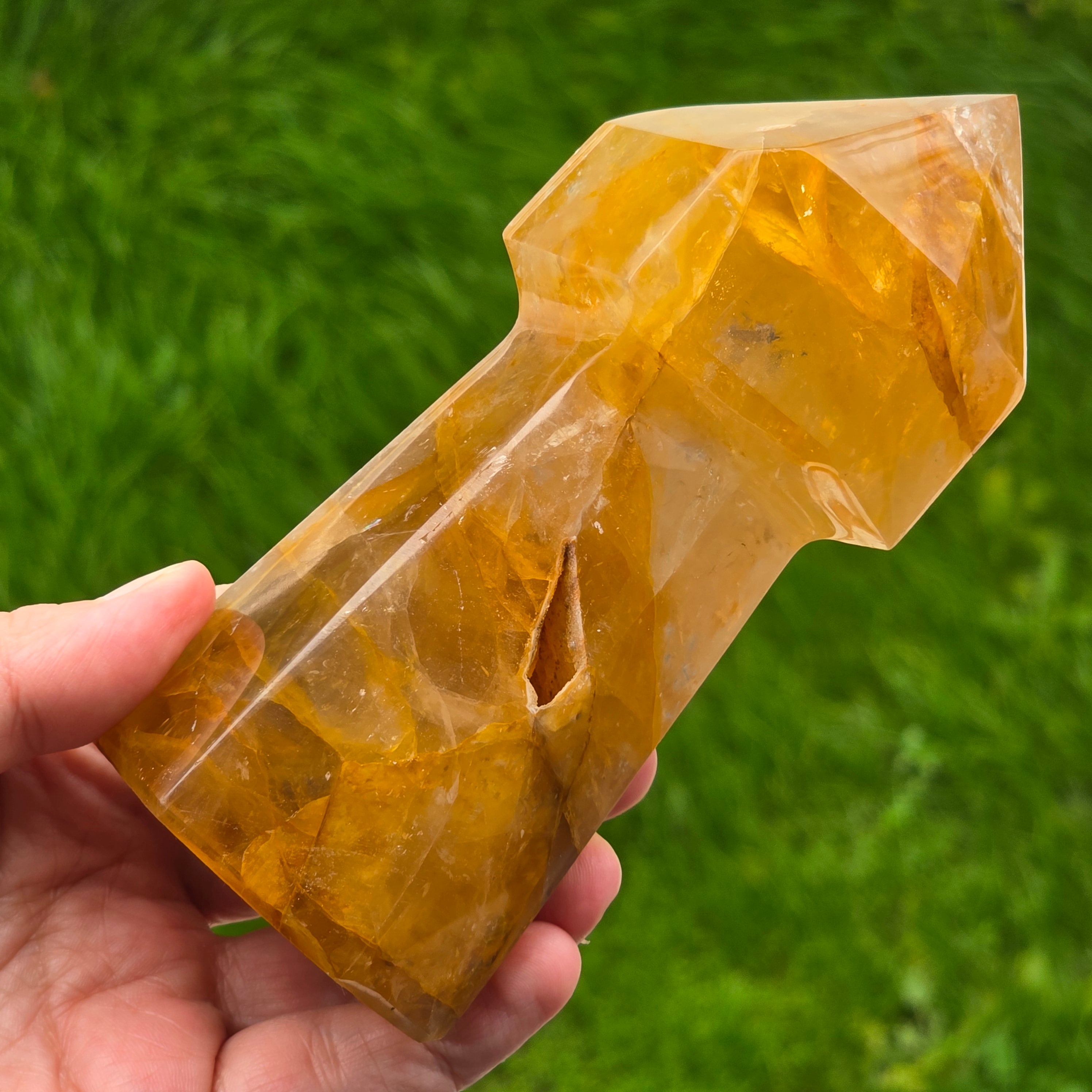Лимоновият кварцов скиптър е ярко и изразително произведение, издълбано, за да подчертае нежната прозрачност и топлите жълти нюанси на кристала. Lemon Quartz е известен със своята визуална яснота и деликатните отражения, които се образуват при докосване от светлина, а формата му на скиптър му придава елегантно и насочено присъствие. Под формата на скиптър, кристалът става идеален за насочване на енергия, работа върху меридиани, енергиен масаж, активиране на намеренията и освобождаване на напрежение от тялото. Добре оформеният му връх позволява прецизна работа, а долната част стабилизира енергийния поток по време на медитация или терапия.