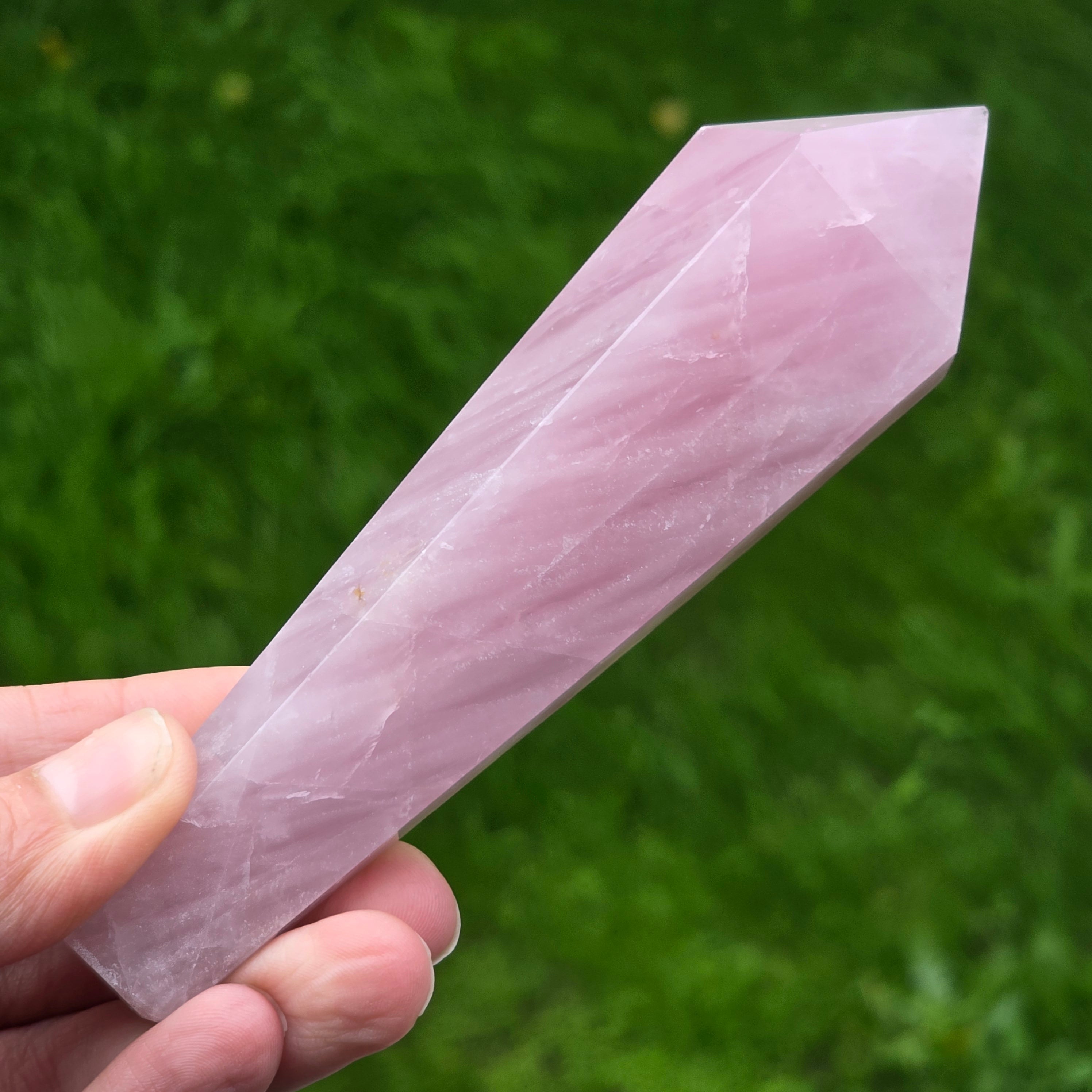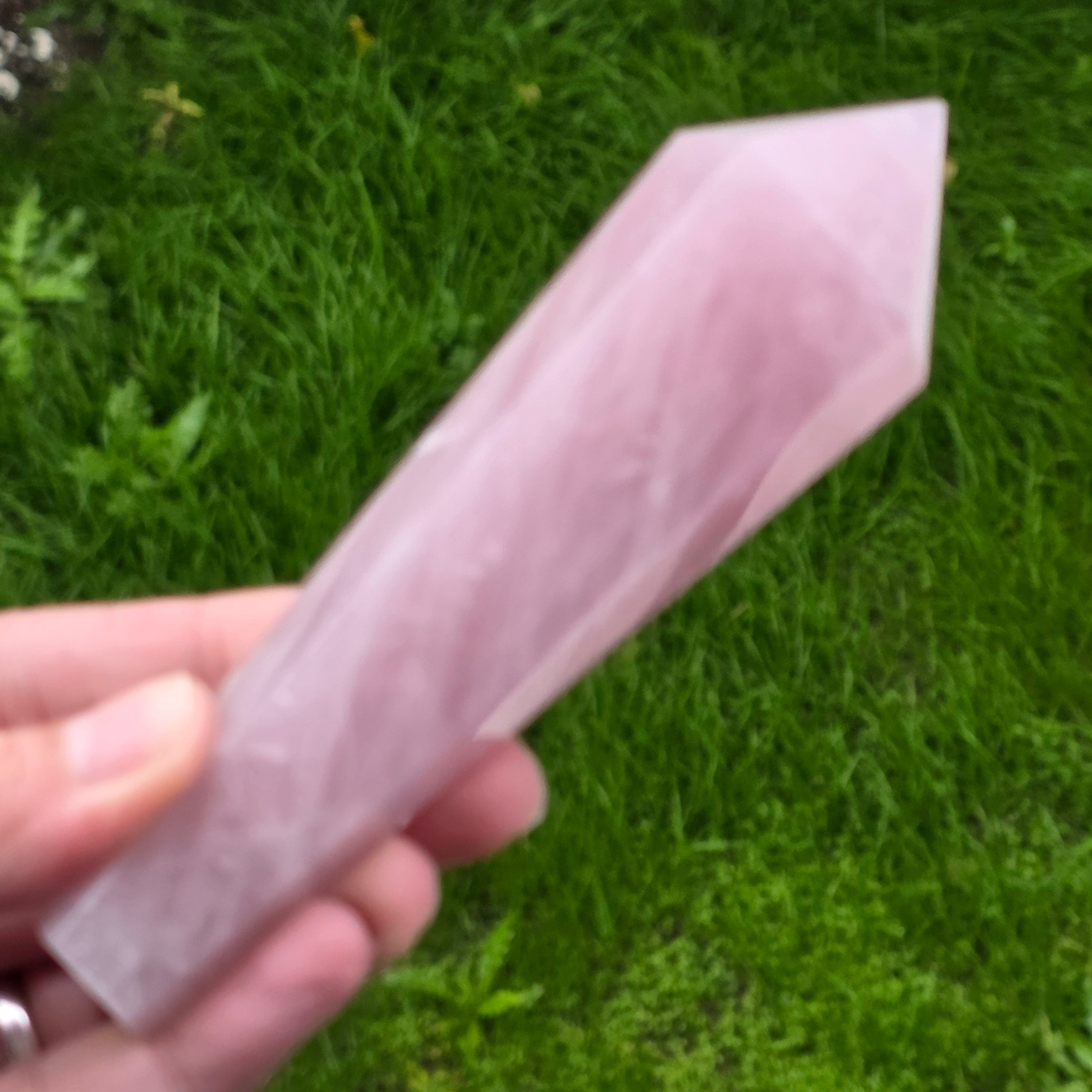 Скиптърът от розов кварц е инструмент, използван особено в енергийни практики, холистичен масаж и медитация. Удължената му форма и добре очертаният връх позволяват насочващо намерение, балансиране на енергийния поток и фокус на вниманието в области, където имате нужда от спокойствие или яснота. Често се използва за енергичен масаж, идеален за дълги маршрути по меридиани, за отпускане на раменете, гърба или дланта. По време на медитация може да се държи в ръка, за да се засили състоянието на спокойствие и вътрешна връзка.