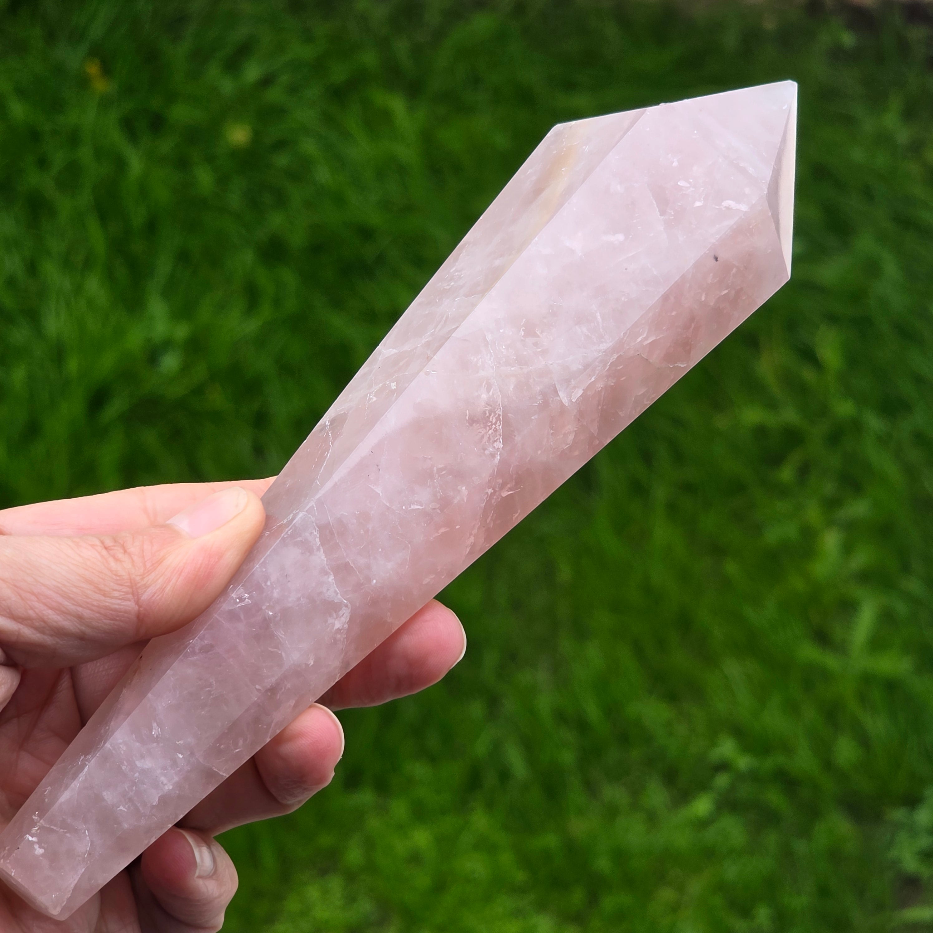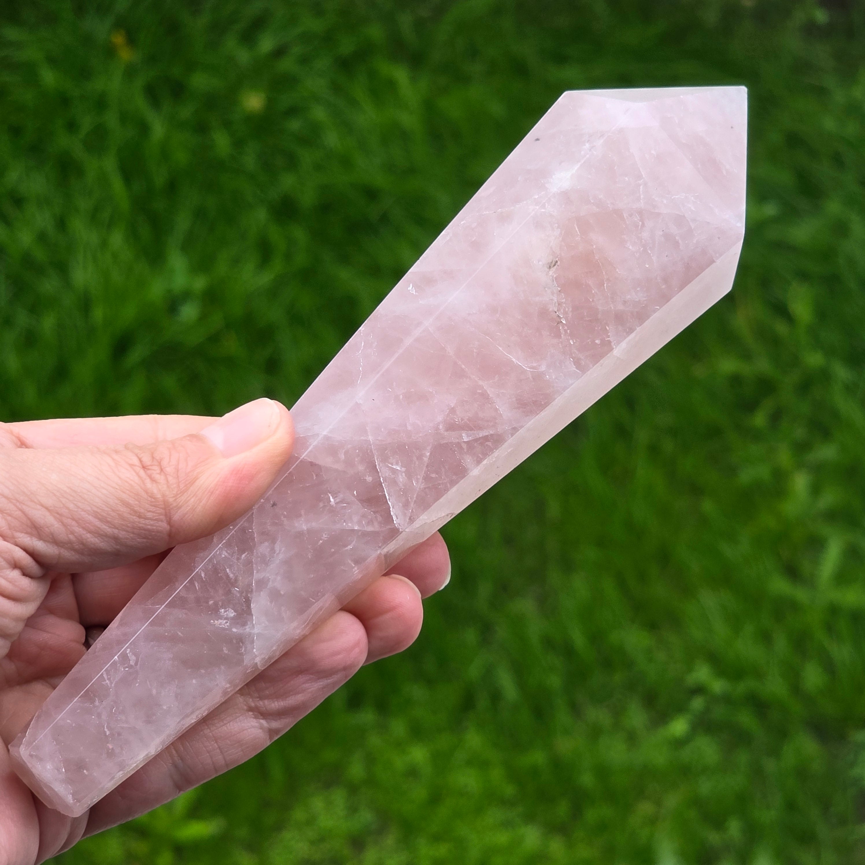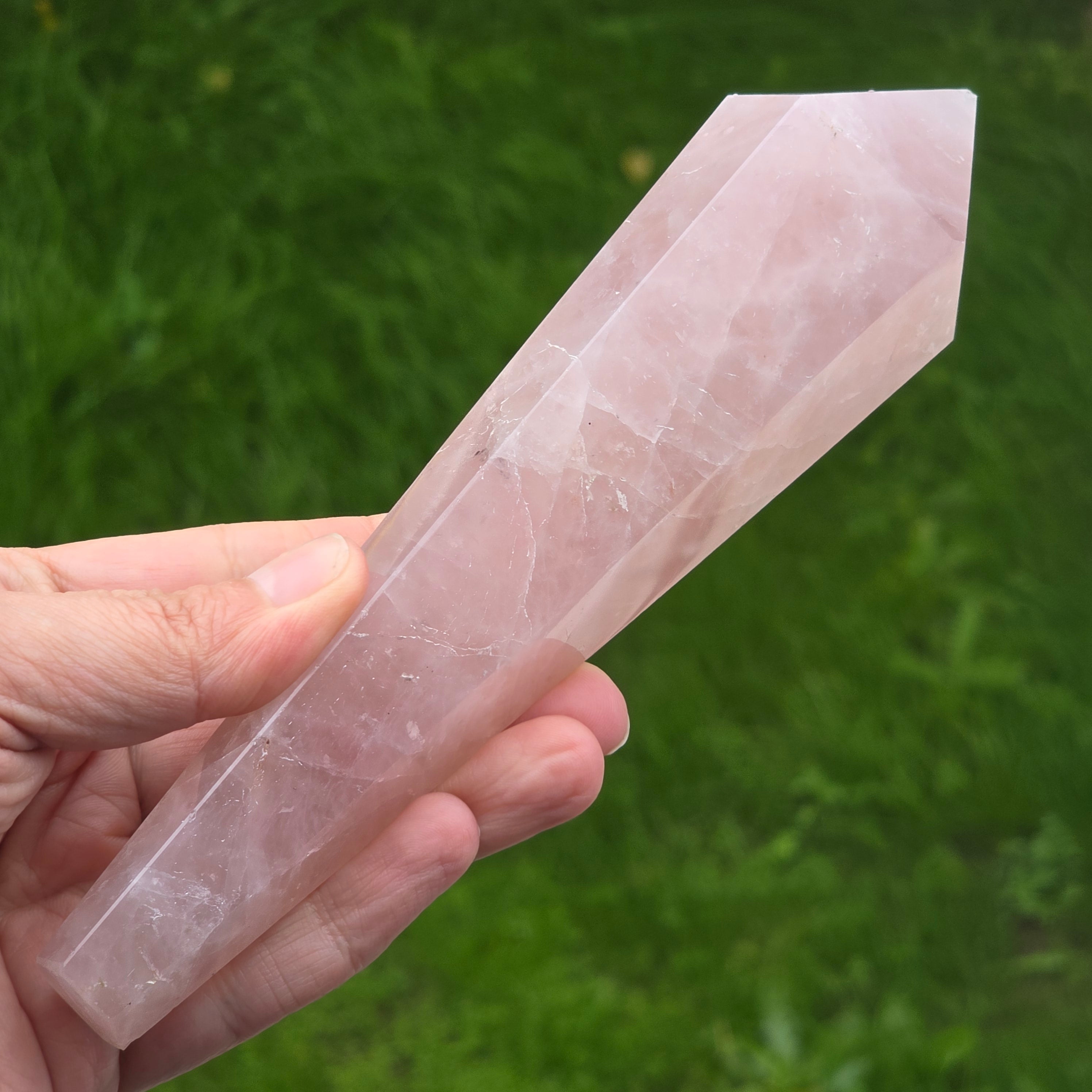 Скиптърът от розов кварц е инструмент, използван особено в енергийни практики, холистичен масаж и медитация. Удължената му форма и добре очертаният връх позволяват насочващо намерение, балансиране на енергийния поток и фокус на вниманието в области, където имате нужда от спокойствие или яснота. Често се използва за енергичен масаж, идеален за дълги маршрути по меридиани, за отпускане на раменете, гърба или дланта. По време на медитация може да се държи в ръка, за да се засили състоянието на спокойствие и вътрешна връзка.