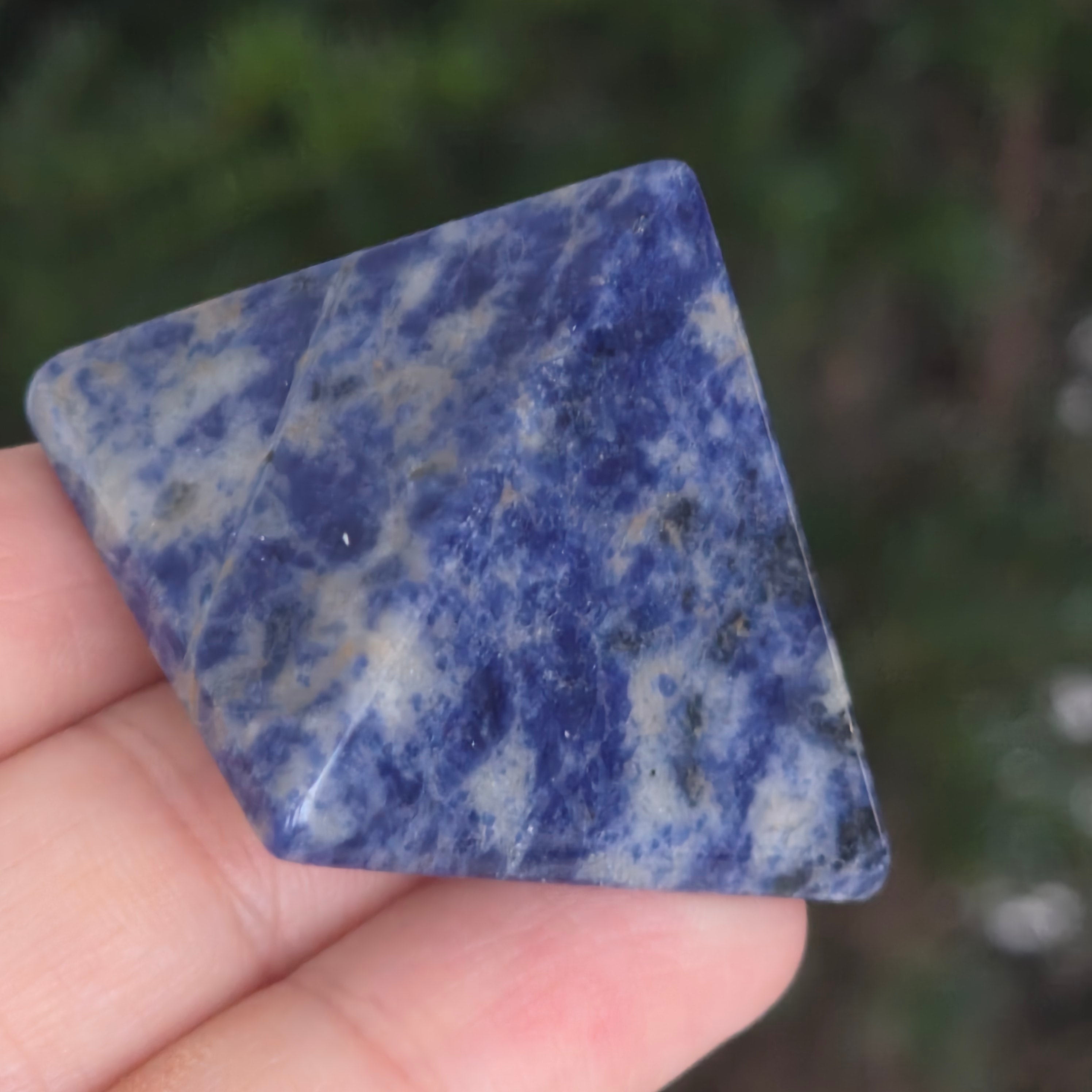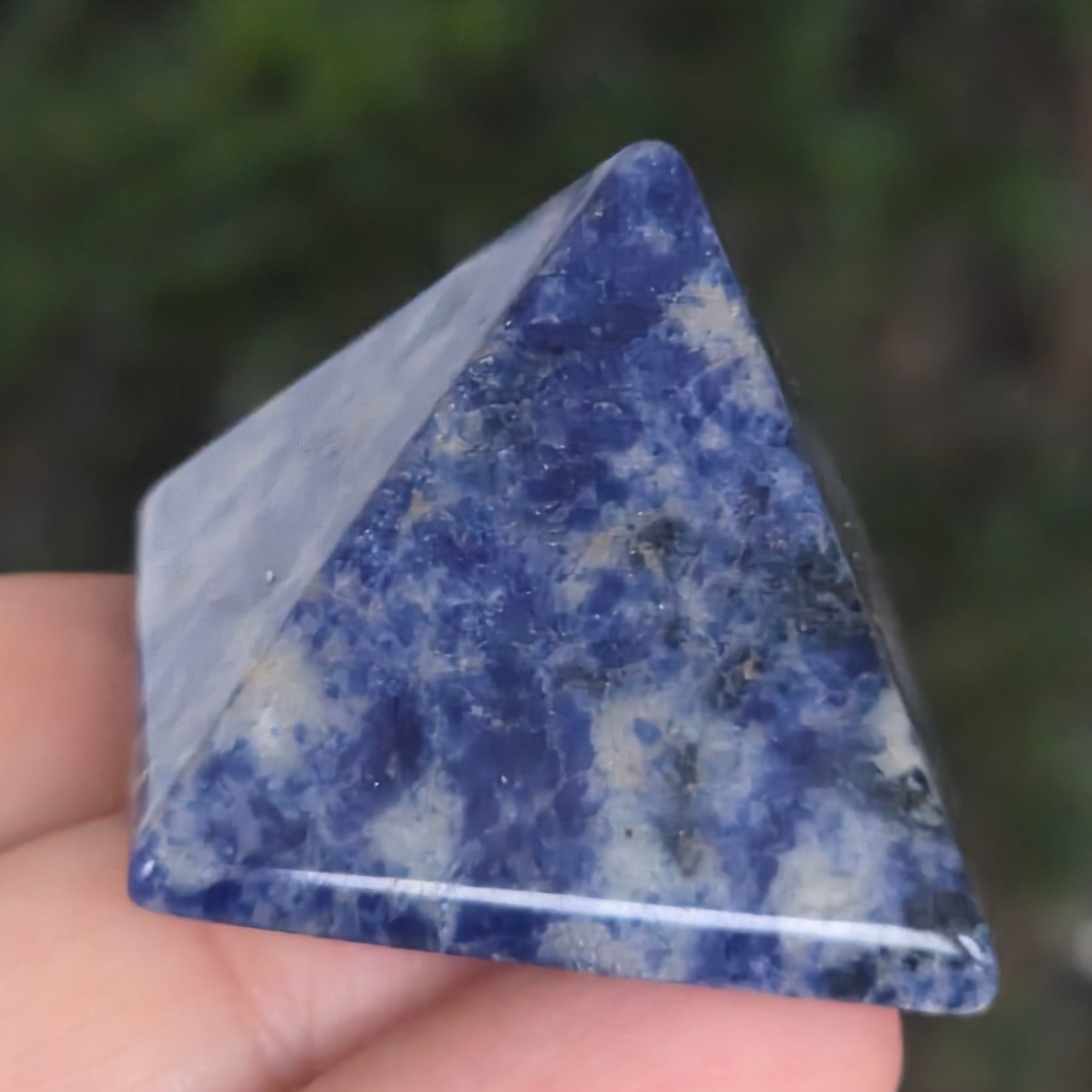 Пирамида, която носи дълбочината на нощното небе и тишината на ясните мисли. този парче естествен содалит, разкрива хипнотизираща смесица от наситено синьо, бяло и сиво, с деликатни вени, които изглеждат нарисувани от вода върху камъка. Фино полираната повърхност отразява нежно светлината, излъчвайки спокойствие и фокус.