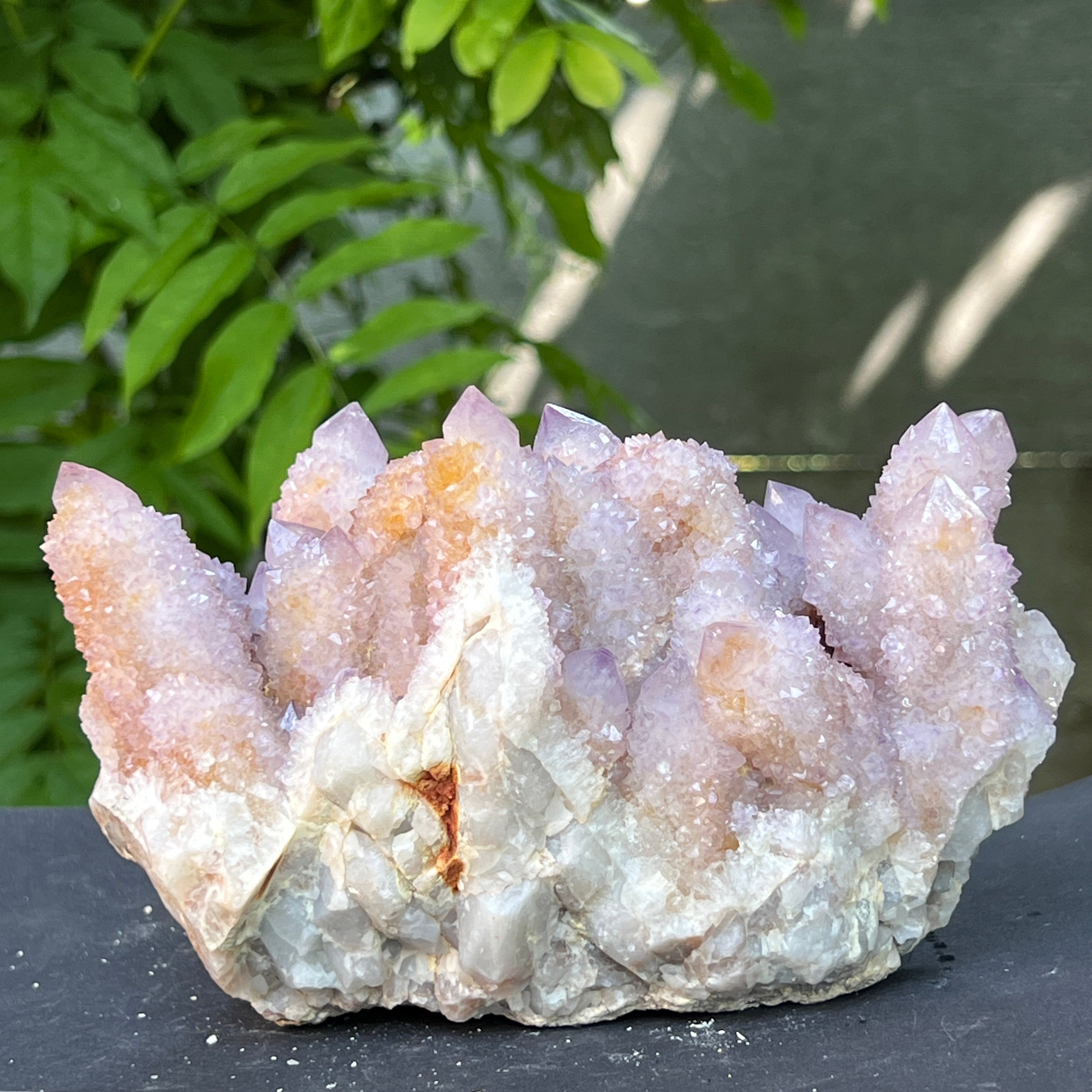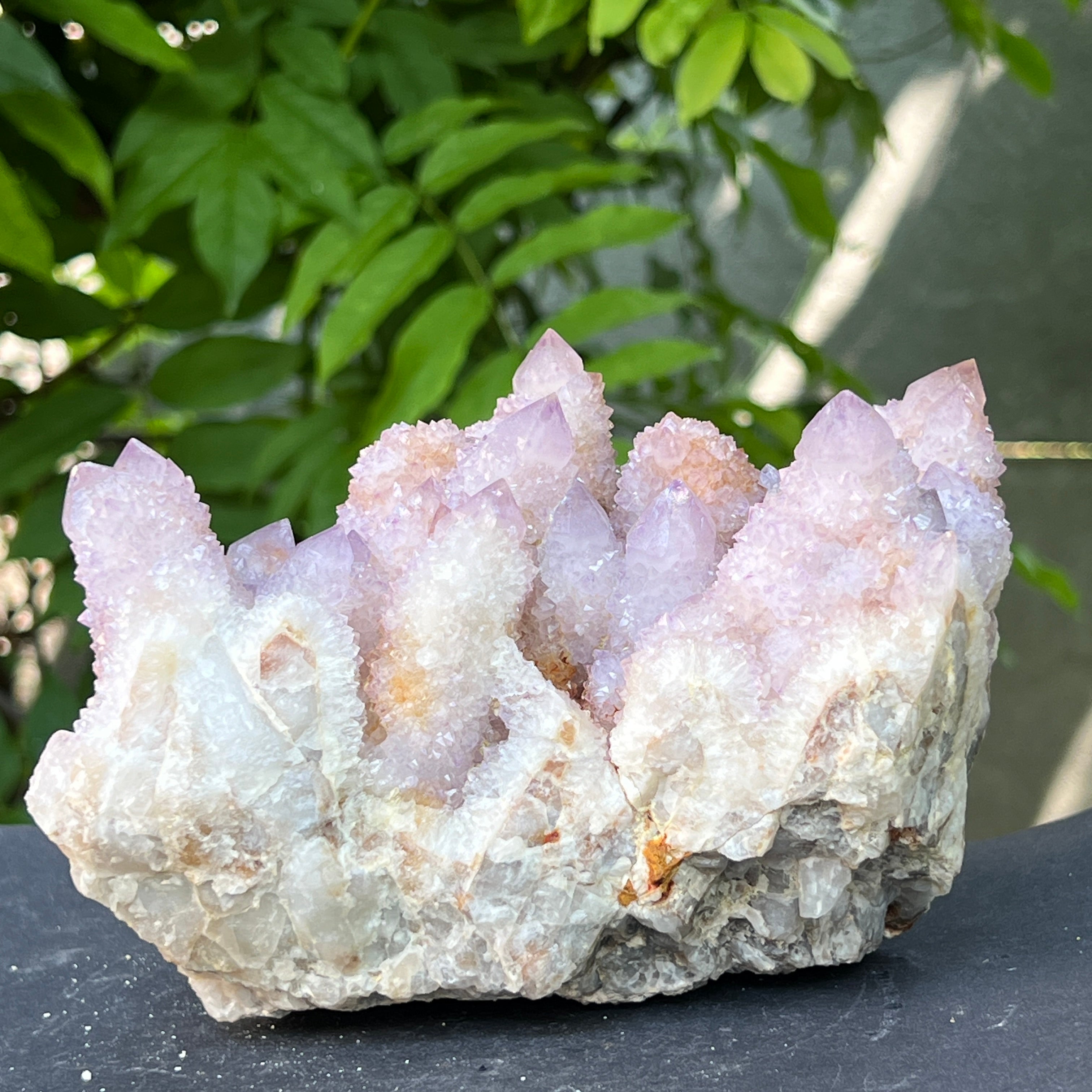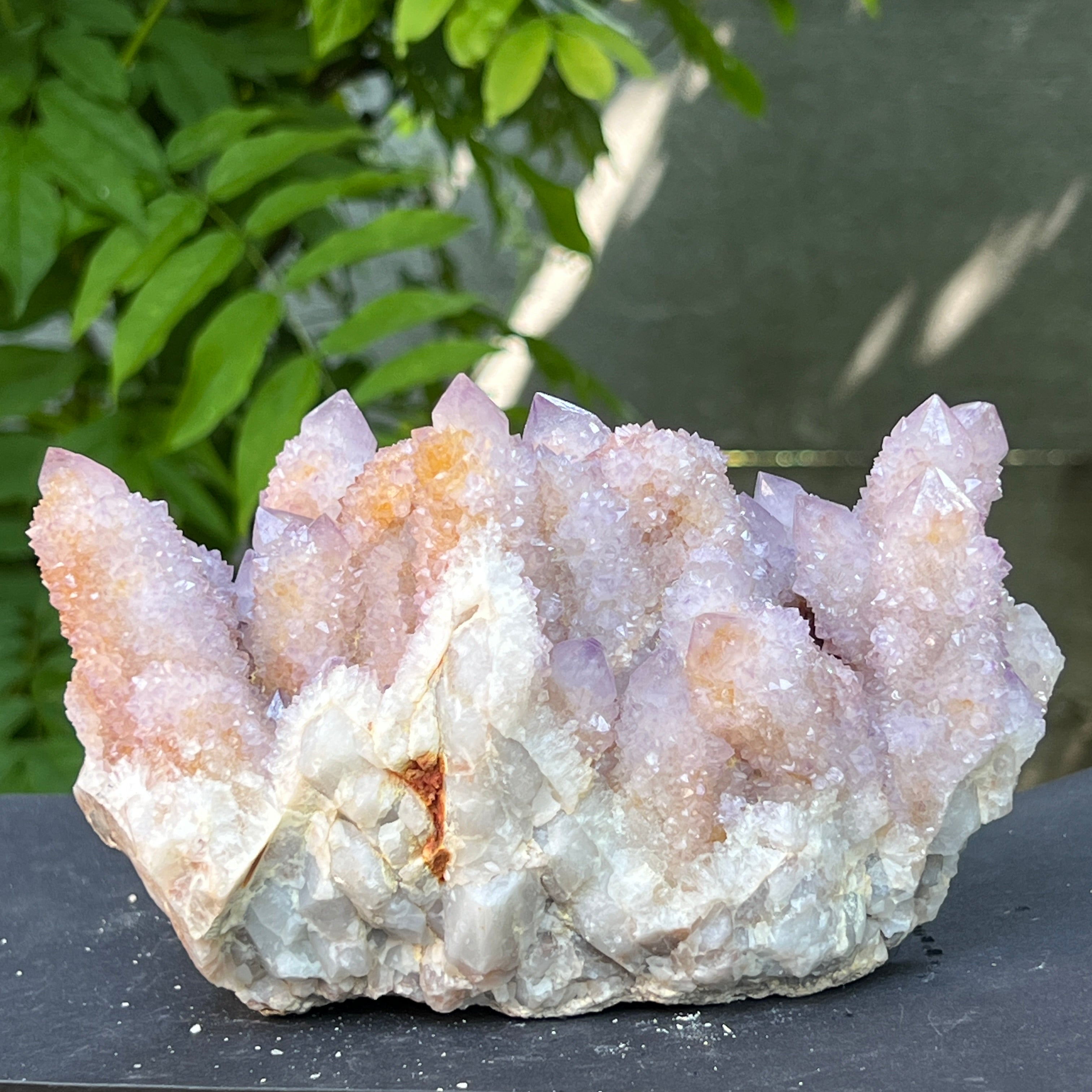 Произходът му е от Южна Африка, този уникален образец съчетава дълбоката енергия на кварца със високите вибрации на аметиста. Това е камък на сътрудничеството и духовната общност, символ на хармонията между индивидуалността и единството. Всеки малък кристал излъчва от общия център, като мрежа от съзнания в перфектна хармония.