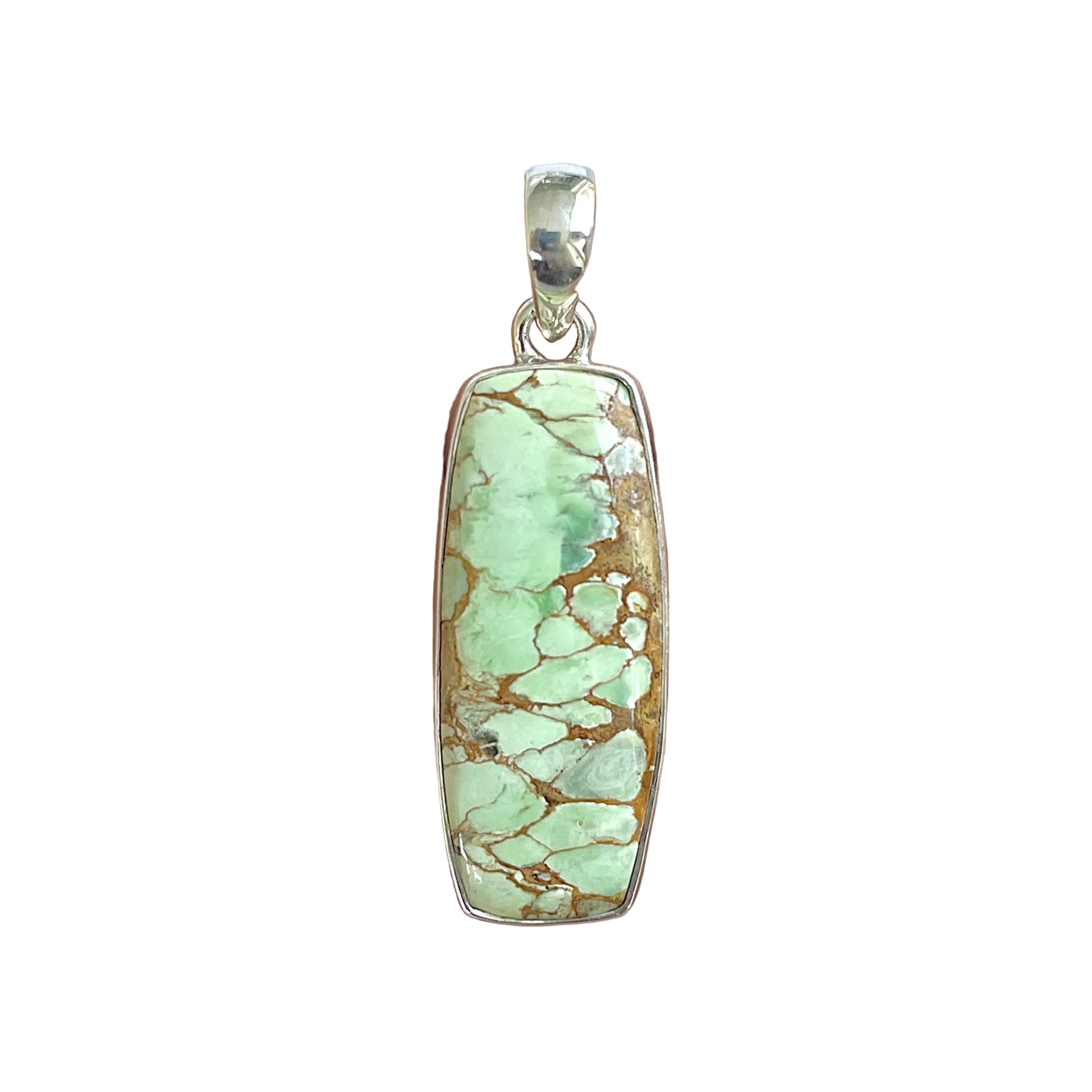 Този уникален медальон с варисцит улавя красотата на природата в баланса между свежозелено и топлите тонове на земята. Неговите естествени жилки, подобни на минни карти, изрисувани от времето, предизвикват връзката между сърцето и корените, между небето и земята.
