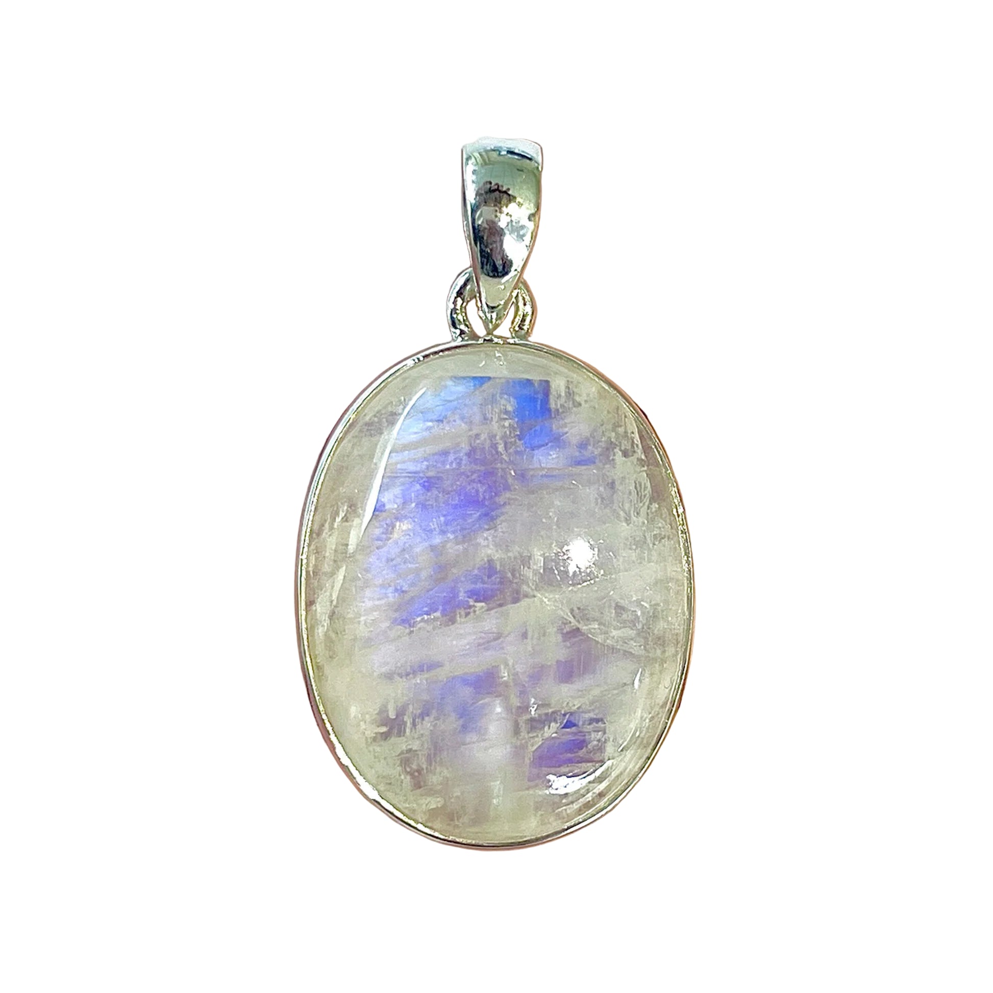 Този уникален медальон с дъговиден лунен камък блести като светлината, отразена върху водната повърхност, разкривайки сини и виолетови иризации, които танцуват с всяко движение. Прозрачният и мистериозен камък привлича погледа и носи чара на древен талисман.
