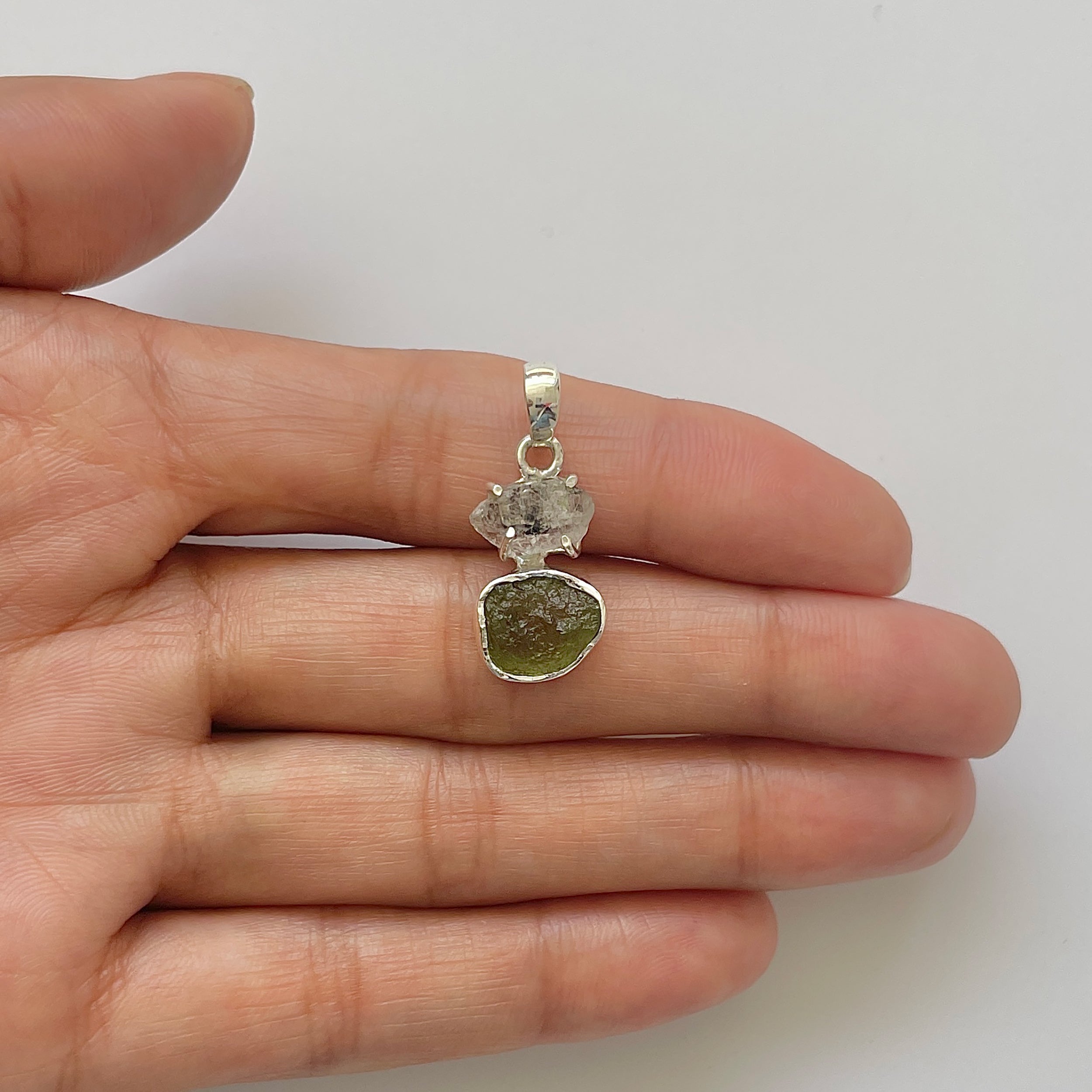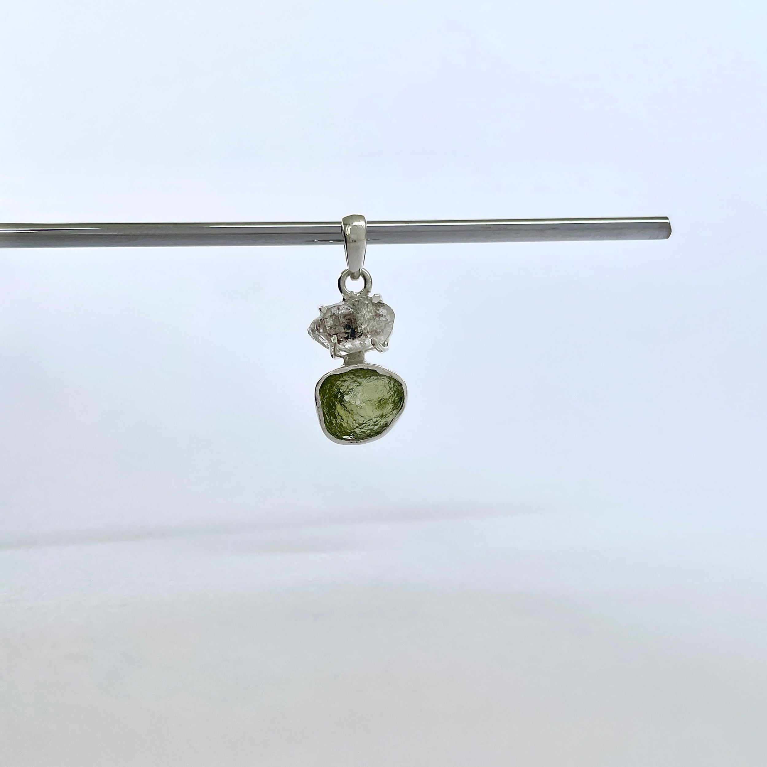 Размер на камъните: Молдавит ~ 0,9 x 1 см, Хъркимър ~ 1 x 0,5 см