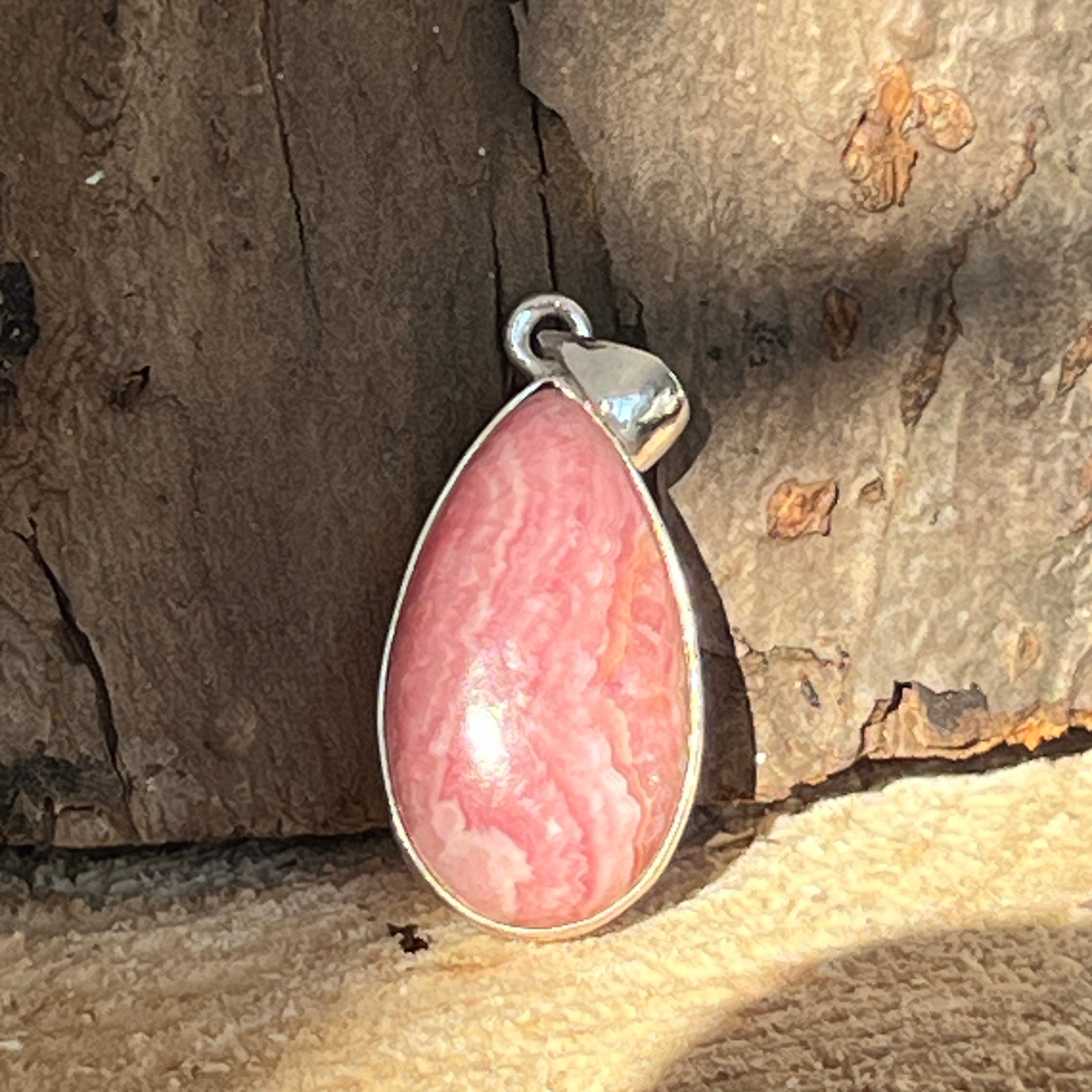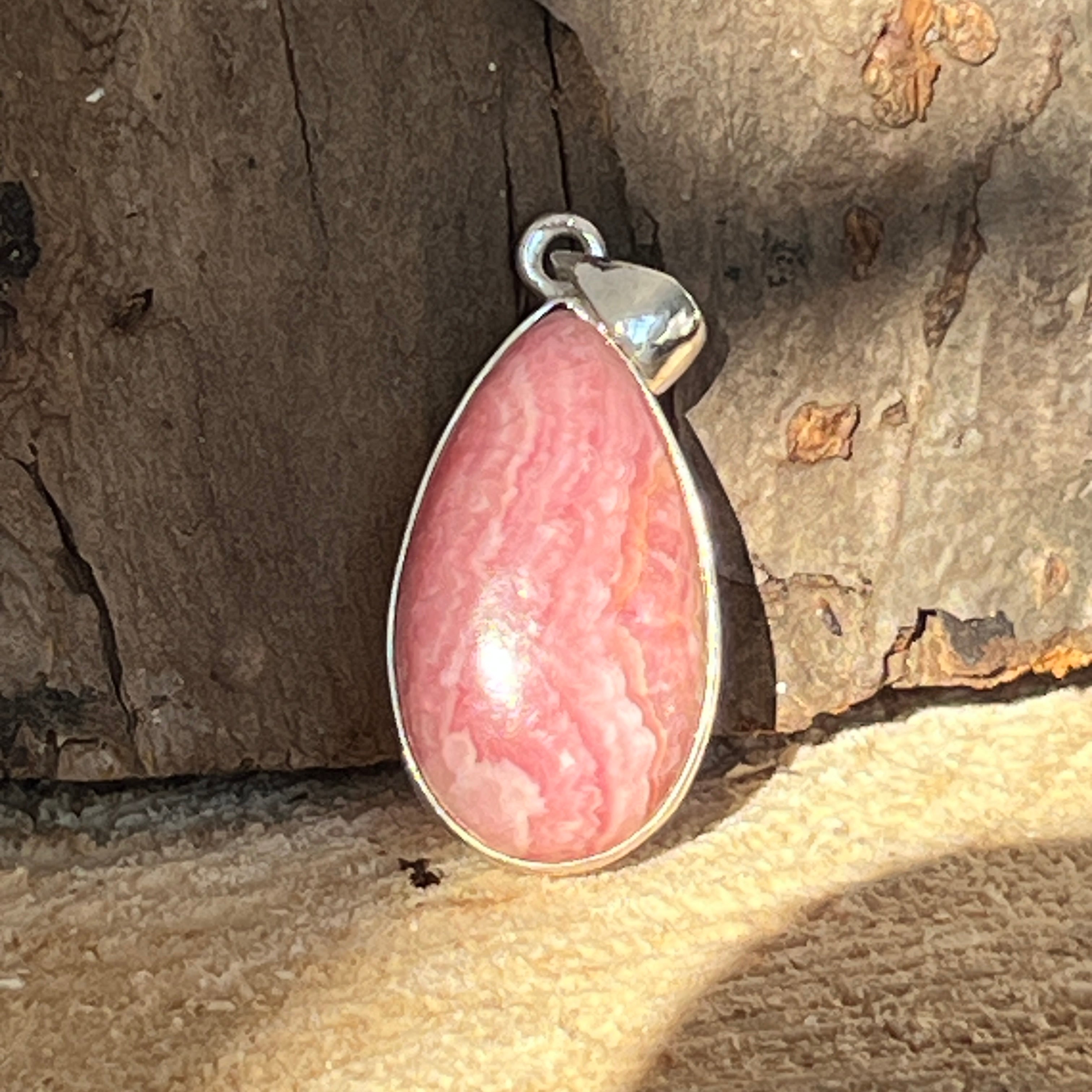 Този естествен родохрозитов DROP медальон, монтиран в сребро 925е изискано и уникално бижу със своята игра на цветове и ивици на камъка. Всяко парче е различно, отразявайки автентичната красота на природата.