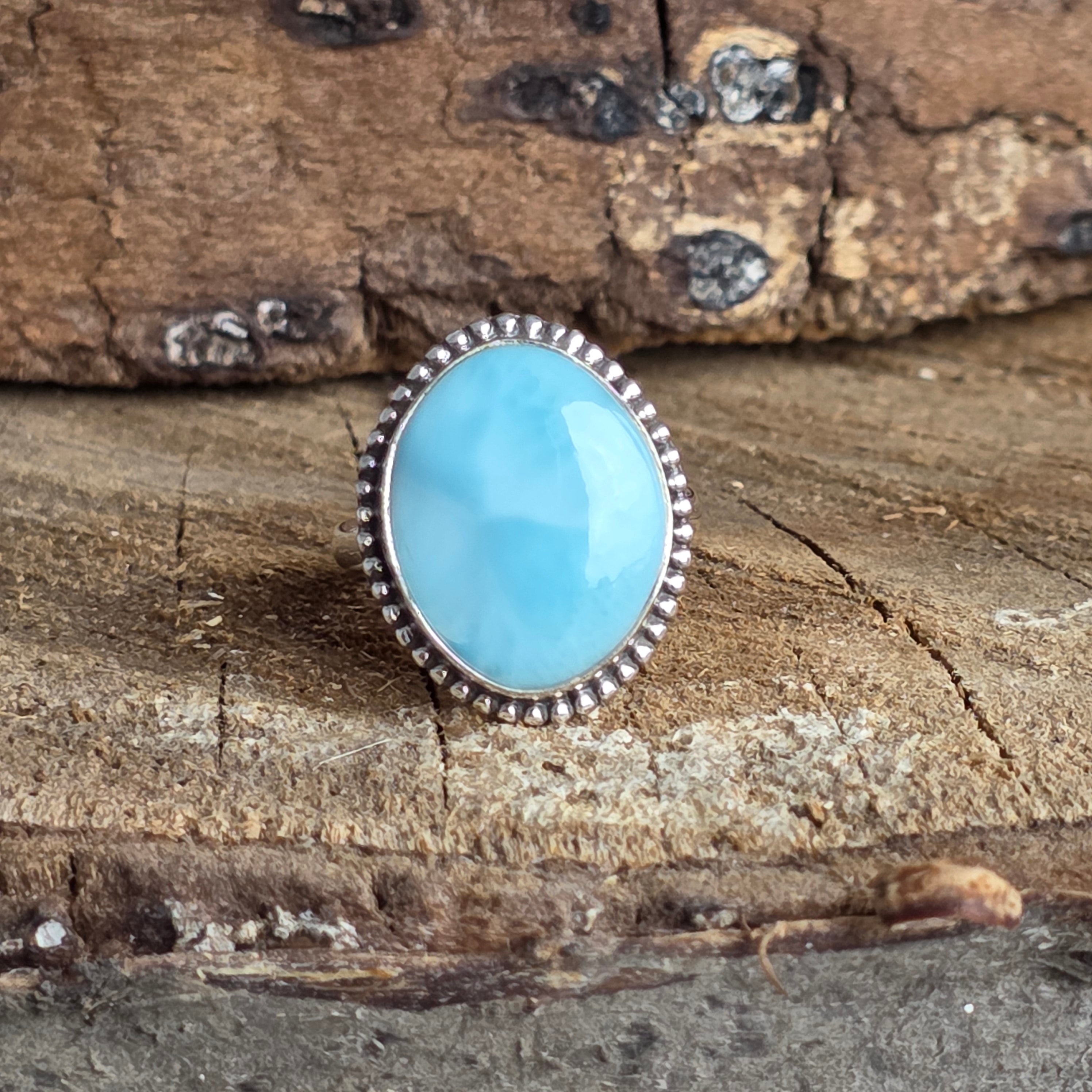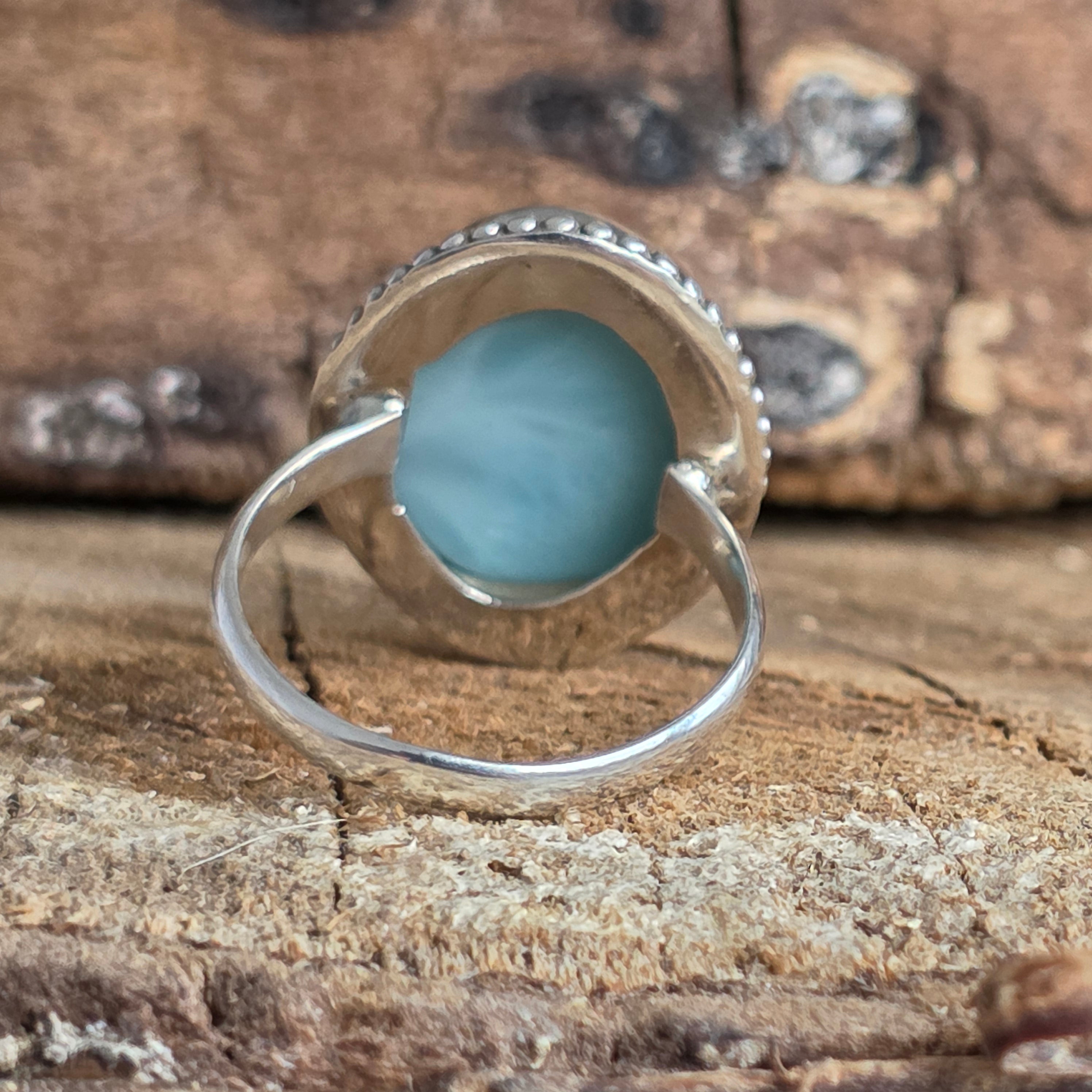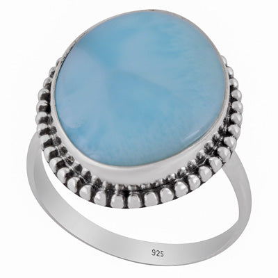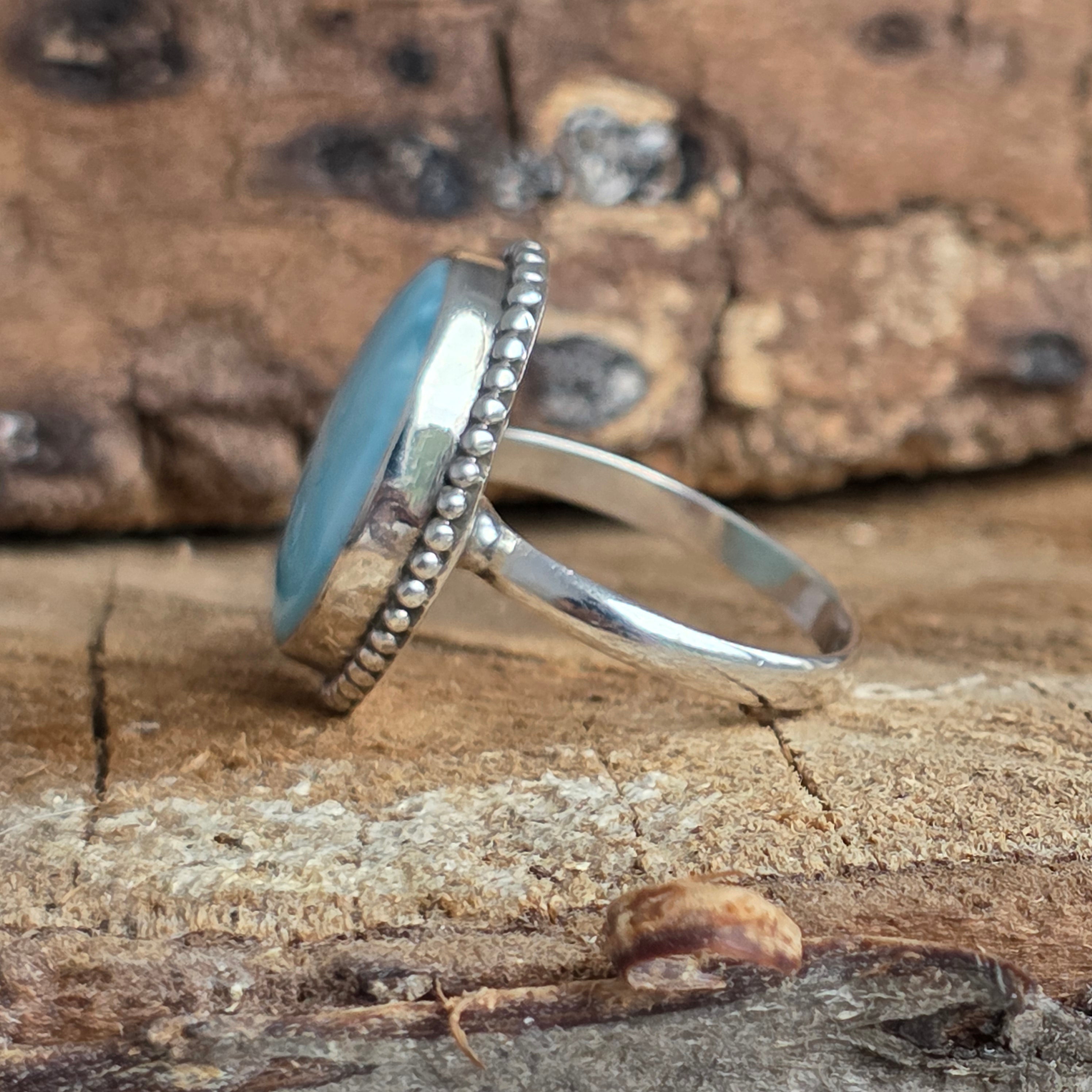 Елегантен сребърен пръстен проба 925 с естествен ларимар, в морски сини тонове, напомнящи водите на Карибите. Детайлите сурова работа ръчната изработка придава дълбочина и изтънченост на това автентично бижу.