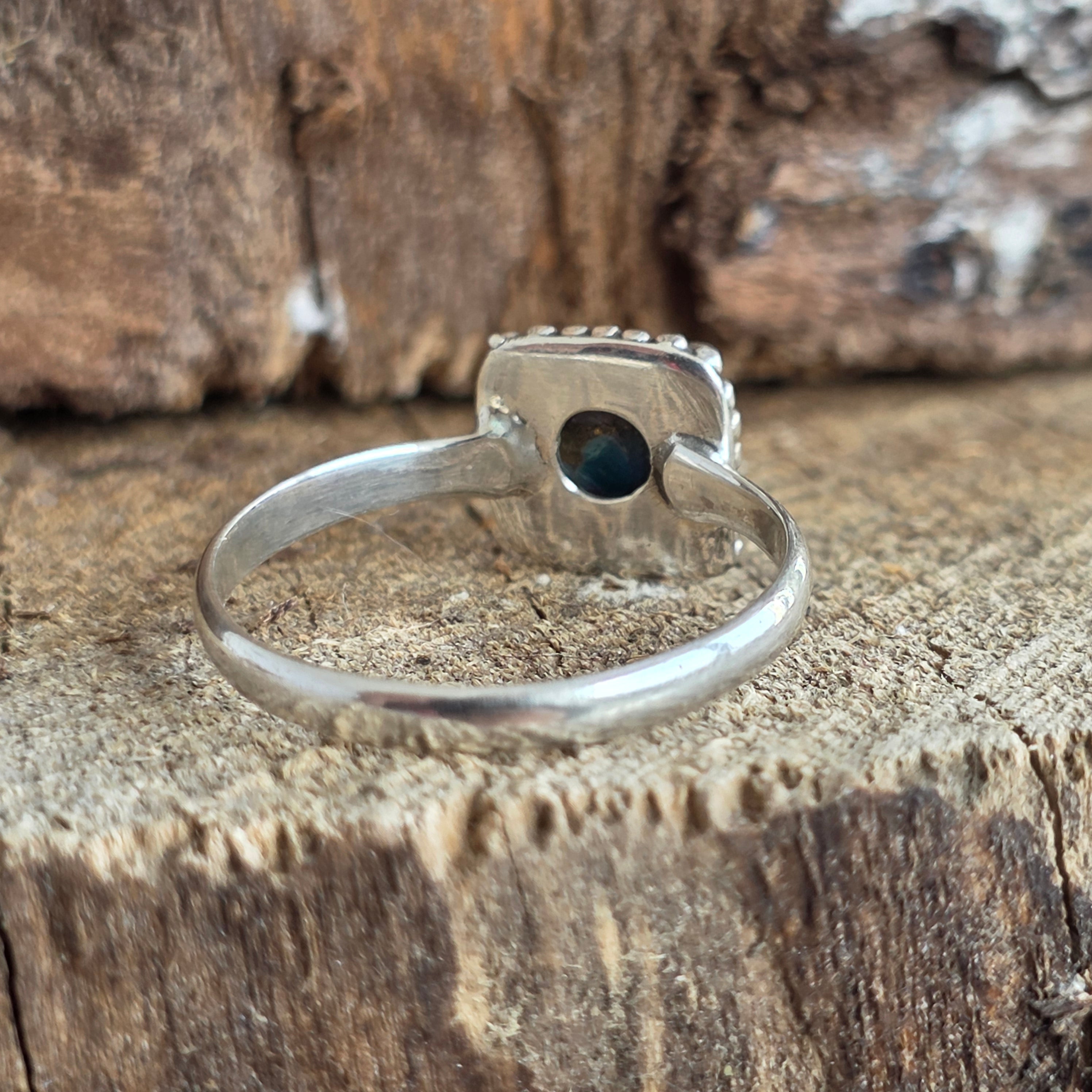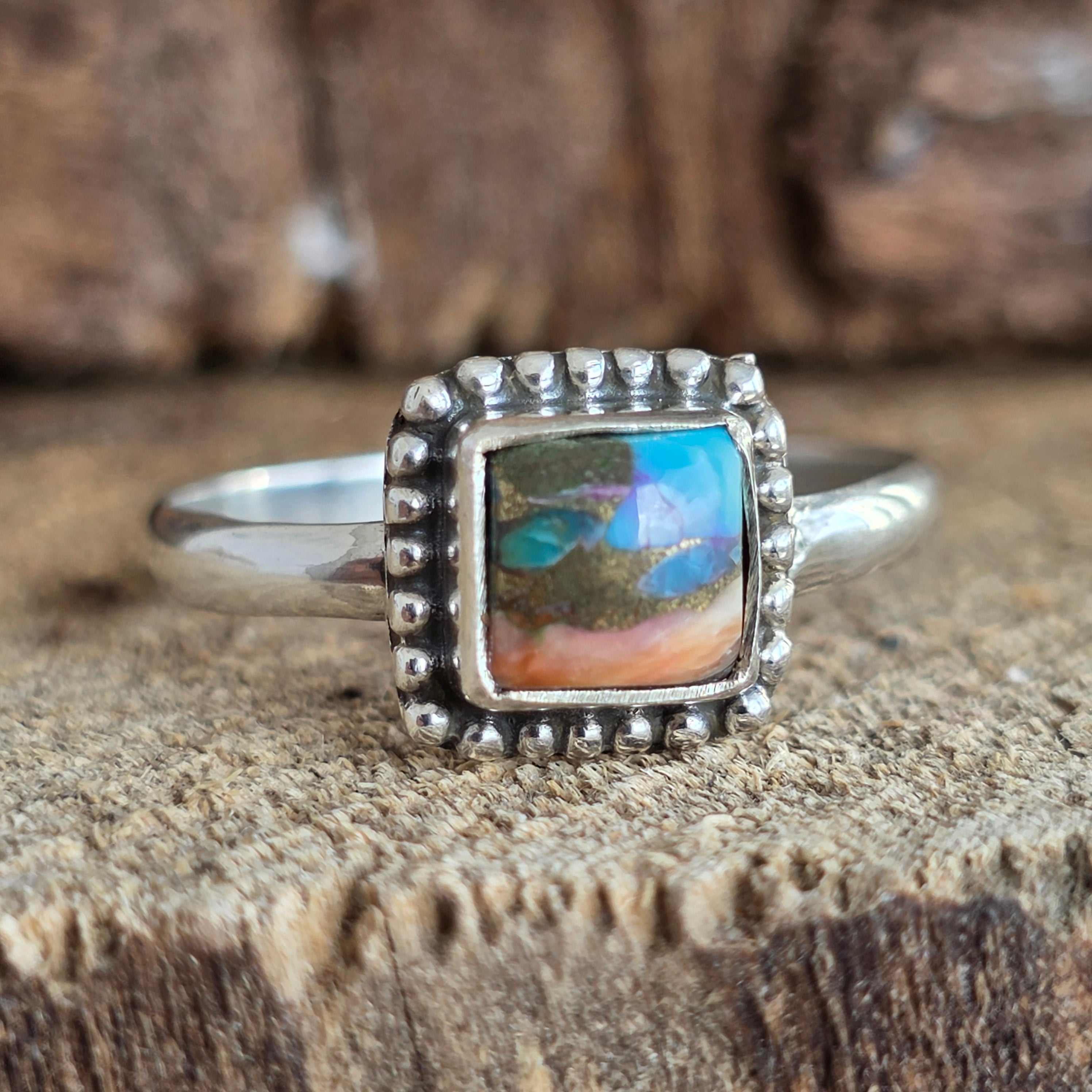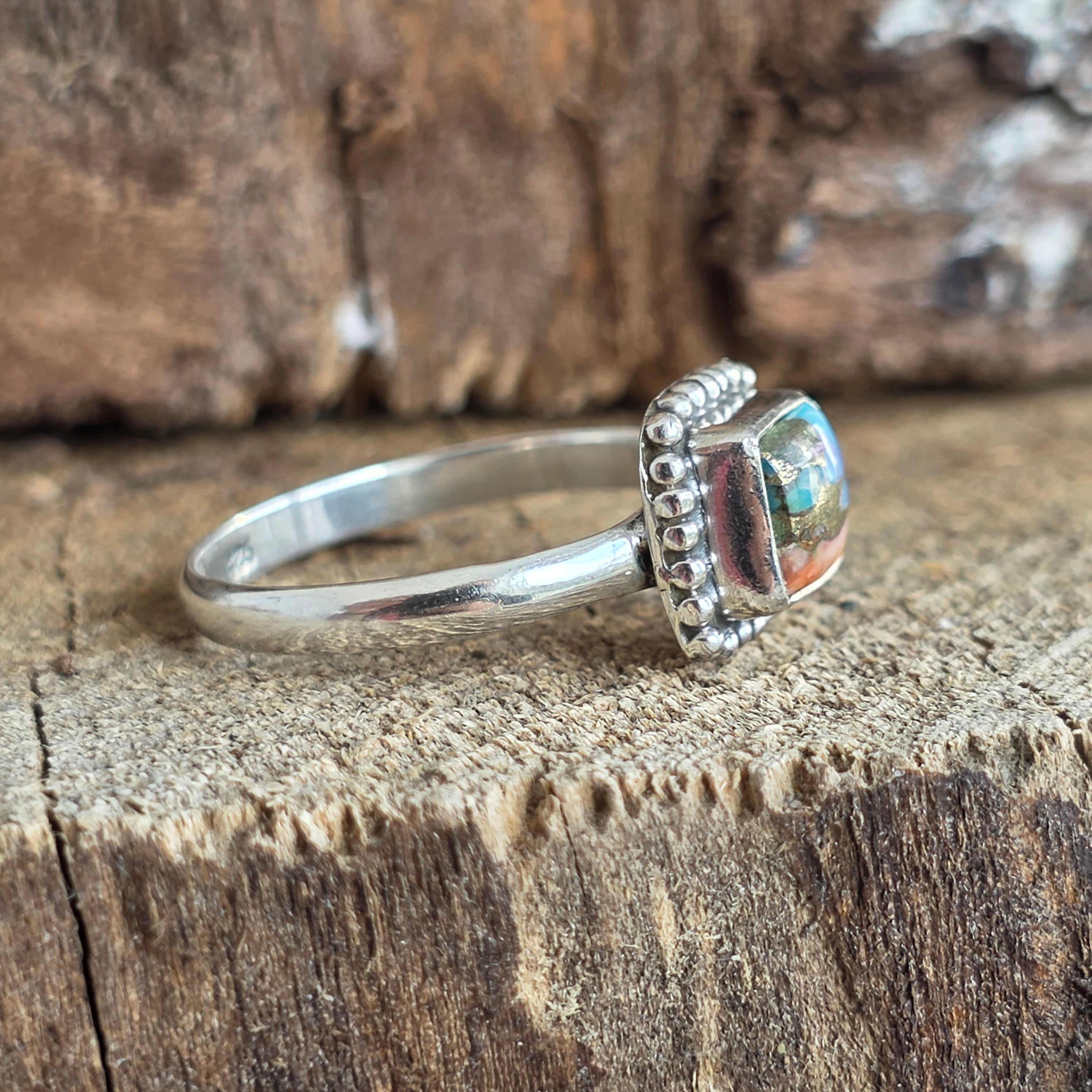 Този пръстен от сребро 925 изважда на преден план завладяващ камък – Oyster Copper Turquoise, естествена комбинация от тюркоаз, мида и фини медни вмъквания, създаваща жив мозайка от цветове: небесносиньо, коралово оранжево, перлено бяло и златисто-метални отблясъци.