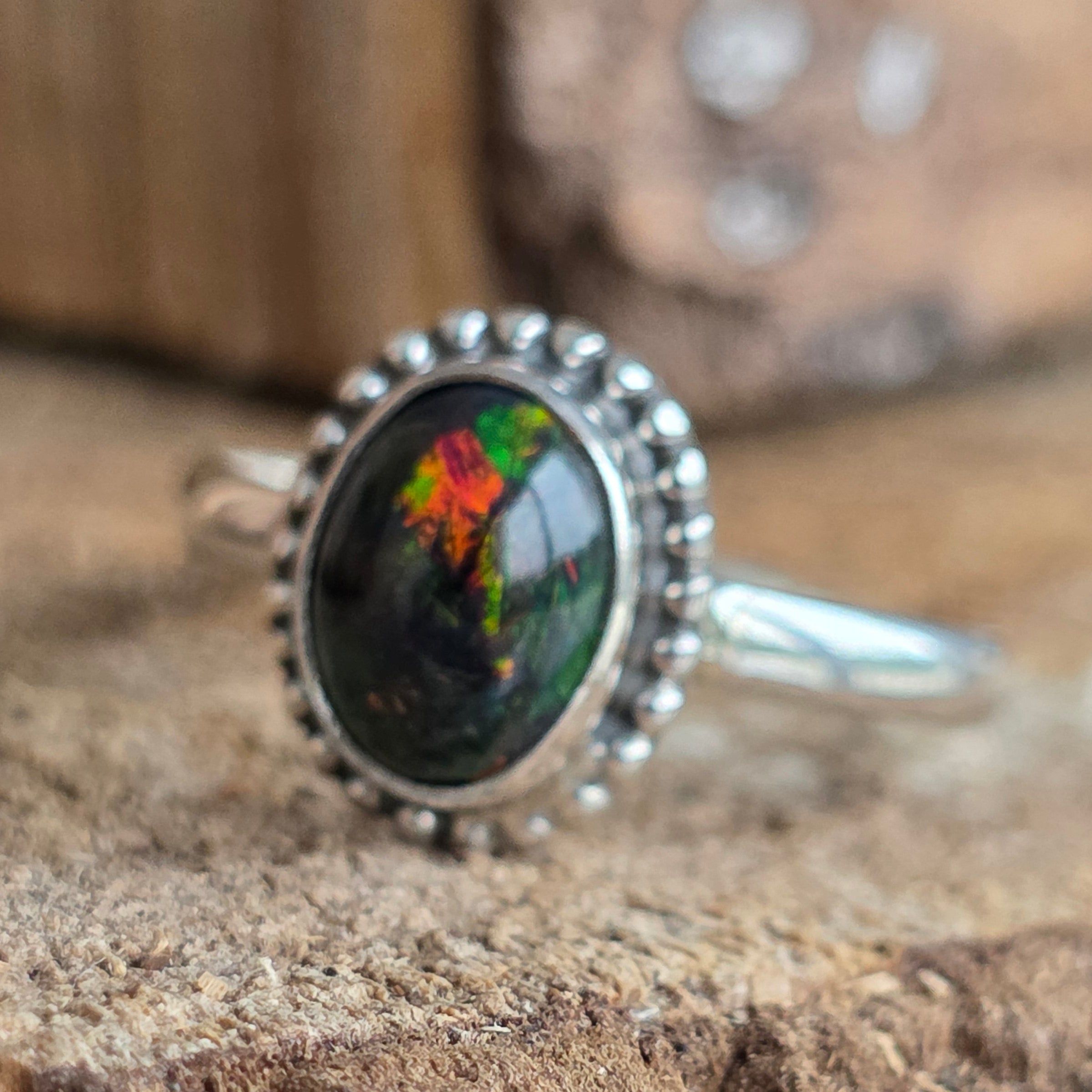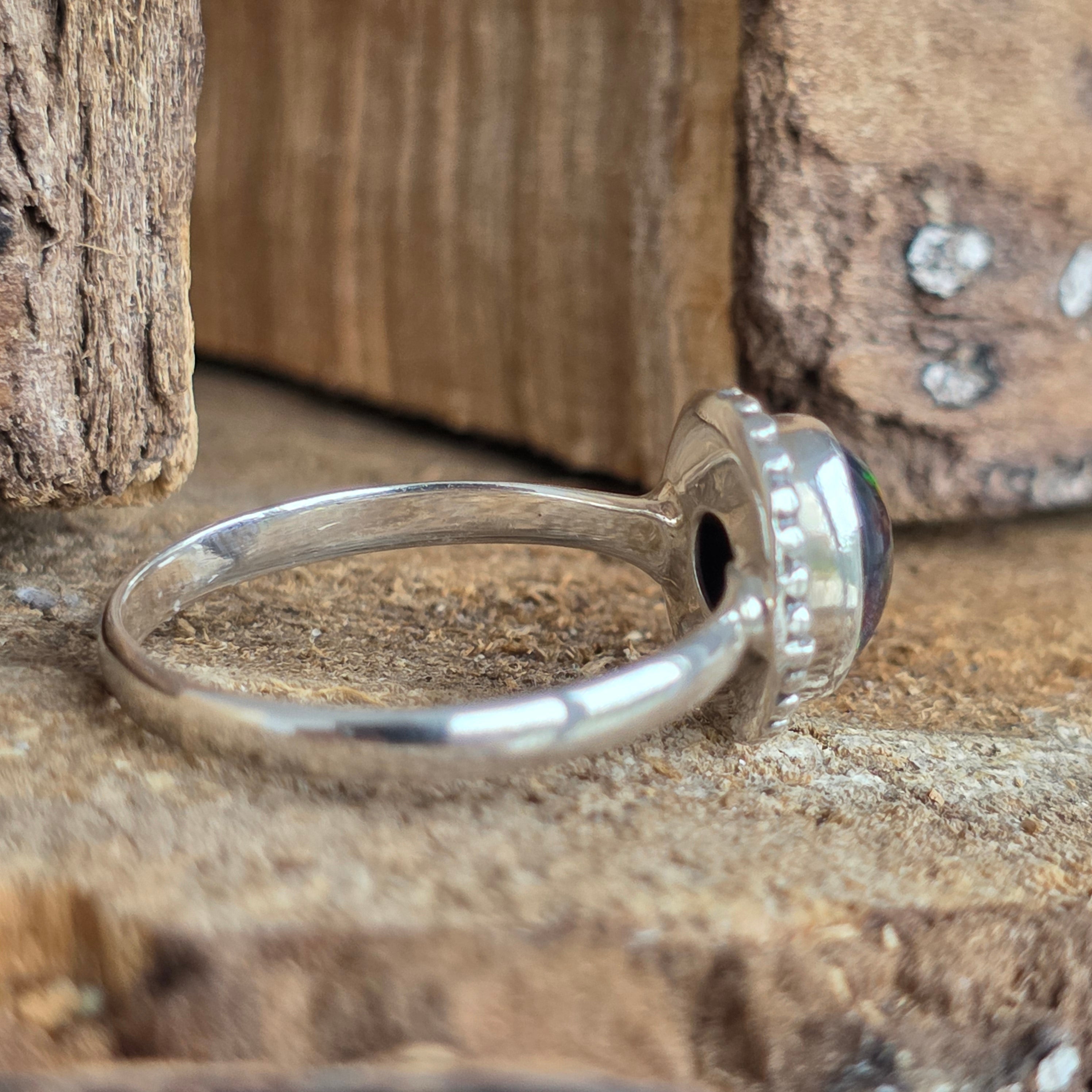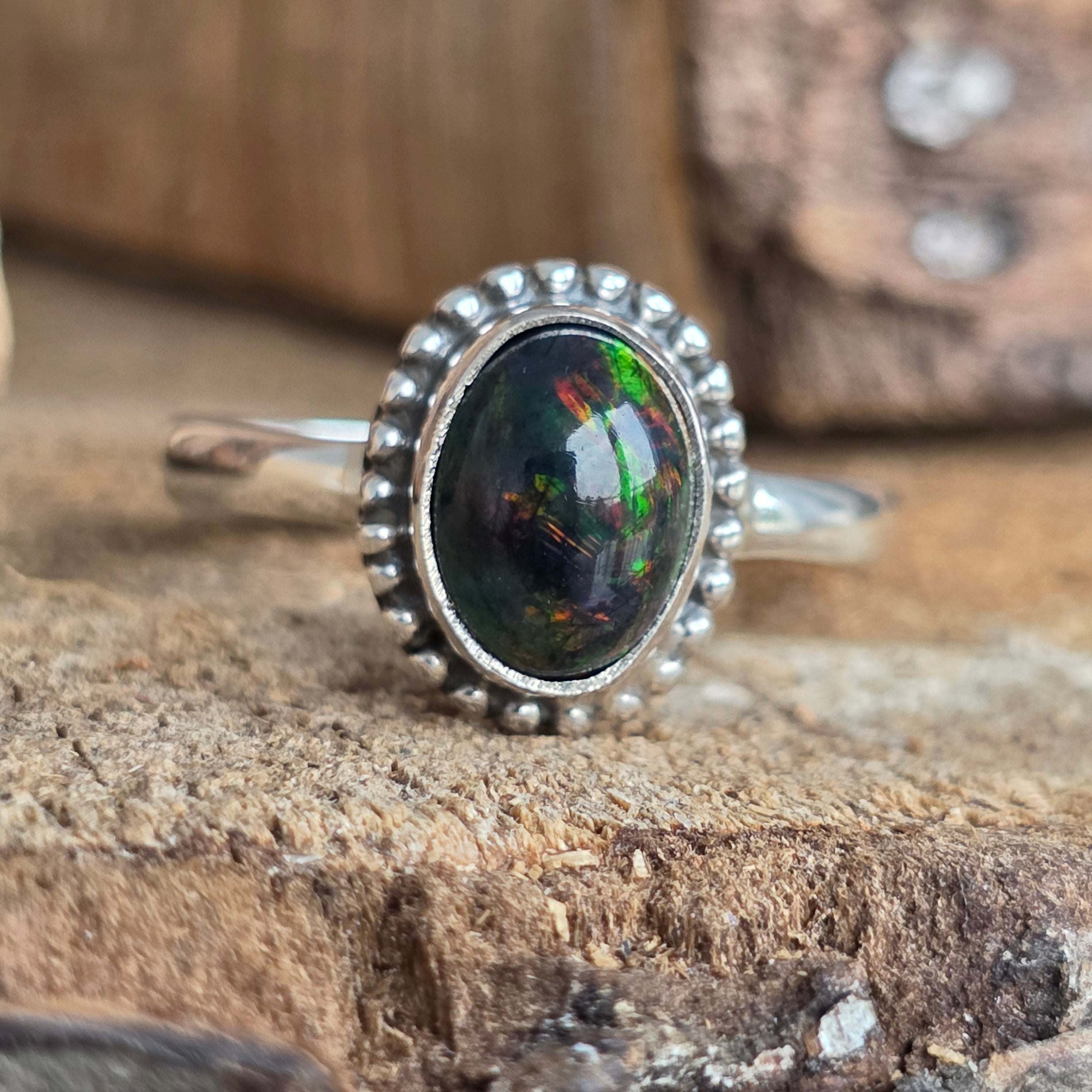 Елегантен и изискан пръстен, изработен от сребро 925, с естествен камък от етиопски опал, известен с ирисцирующите си отражения в нюанси на зелено, червено и синьо. Минималистичният дизайн plain wire setting позволява на камъка да бъде в центъра на вниманието, улавяйки светлината от всеки ъгъл.