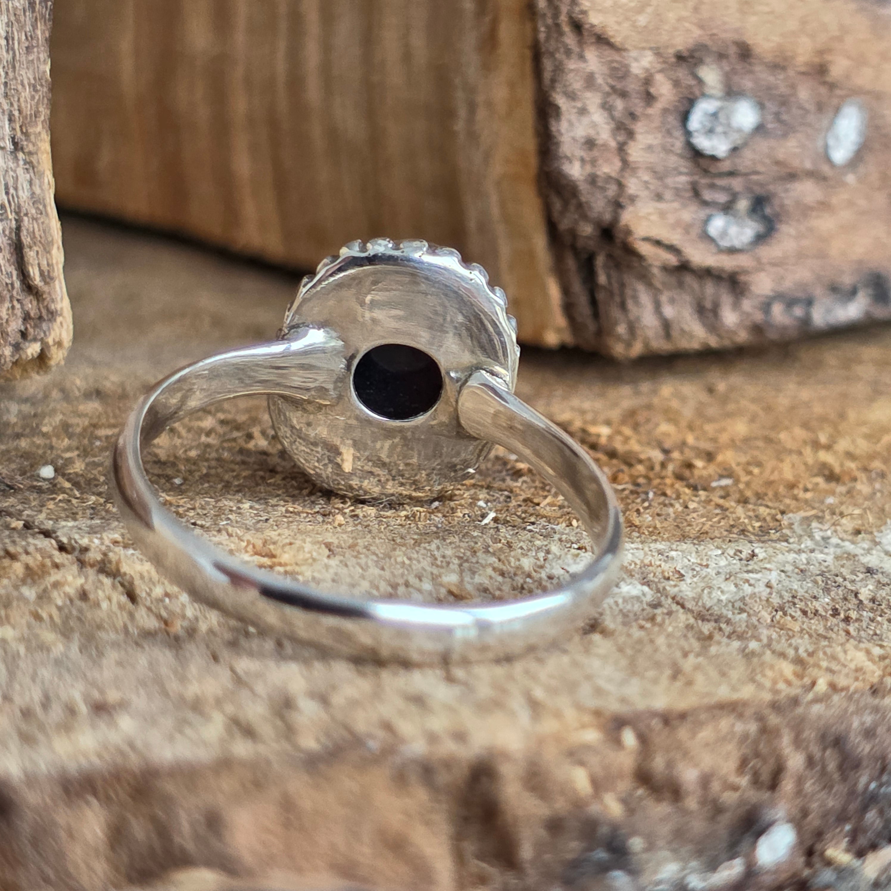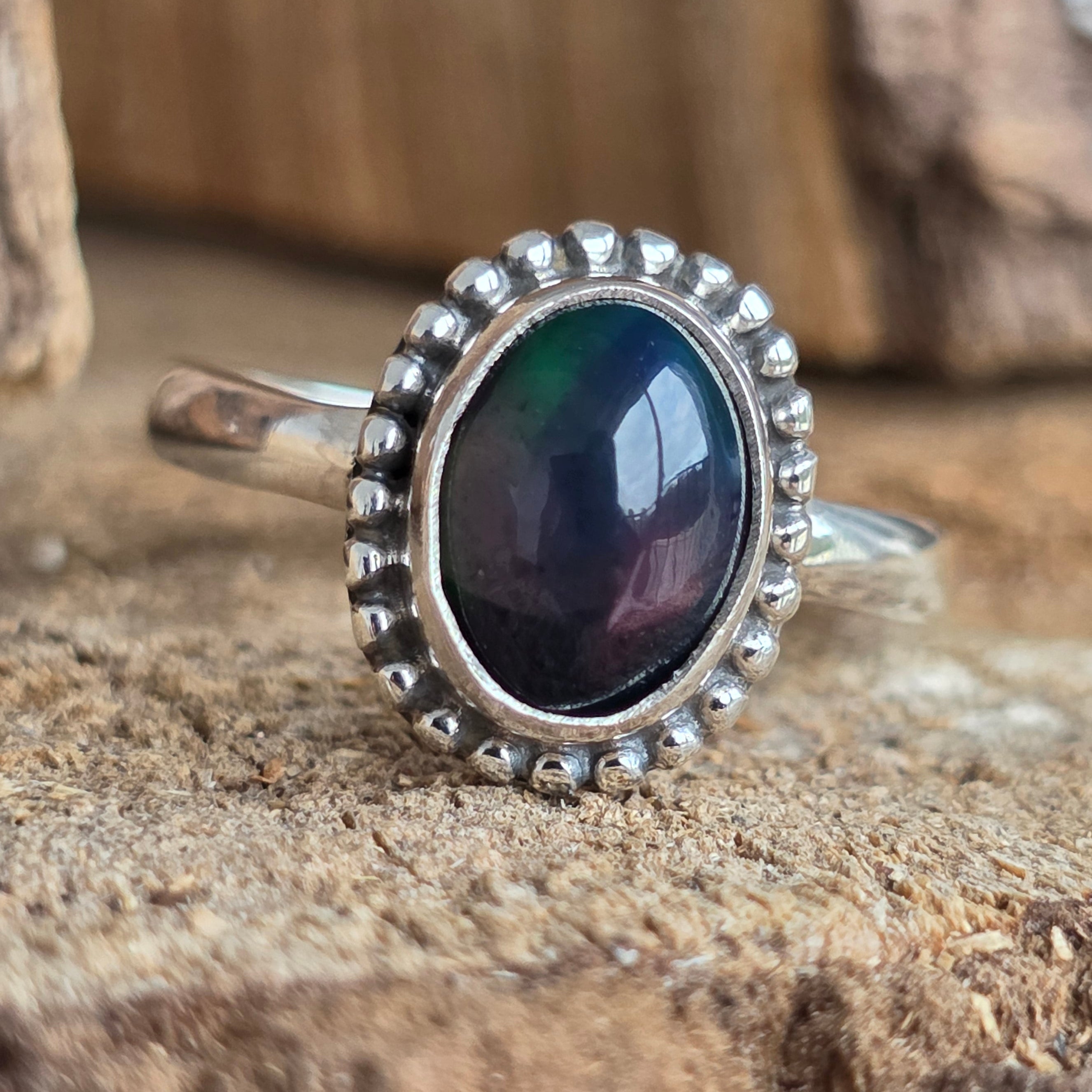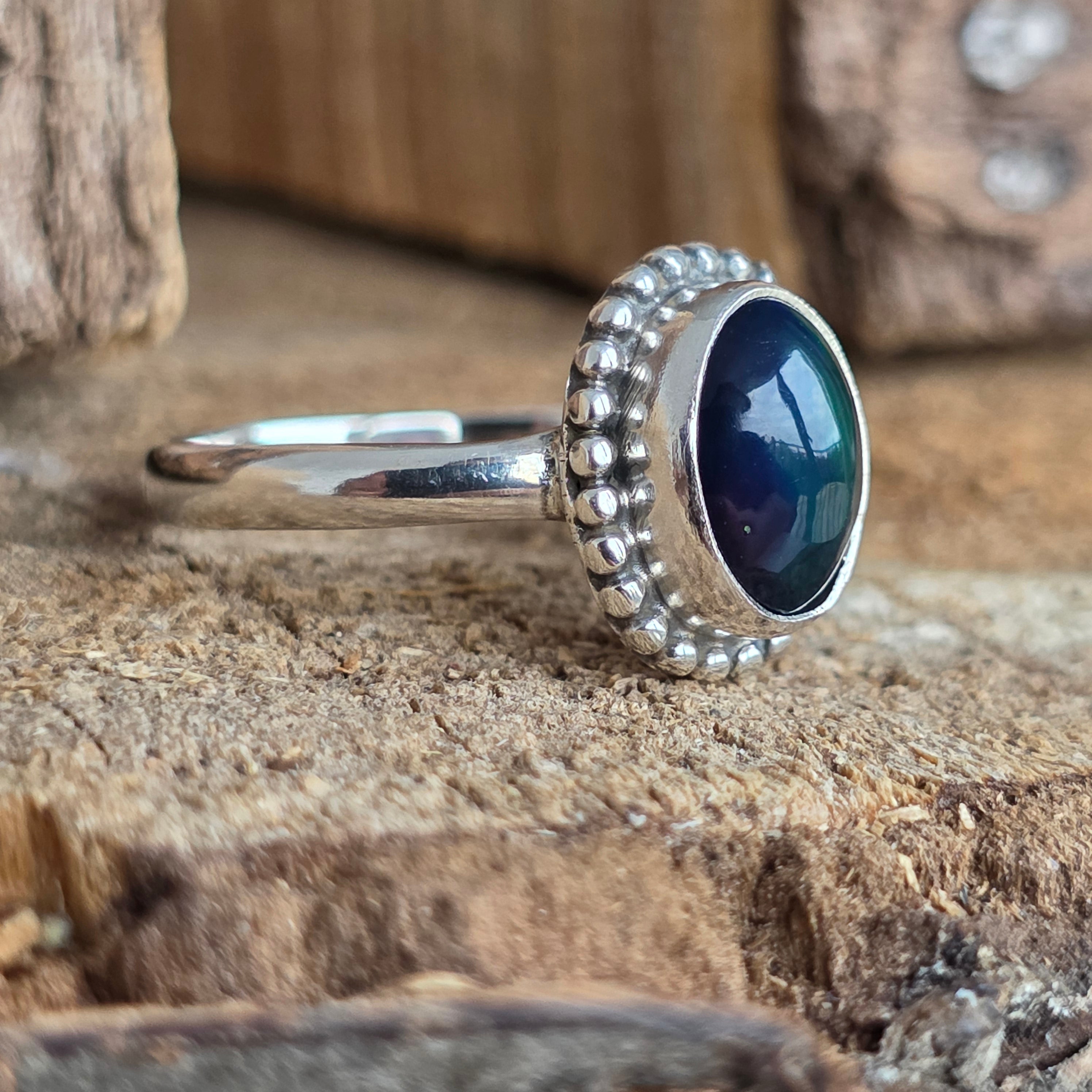 Елегантен и изискан пръстен, изработен от сребро 925, с естествен камък от етиопски опал, известен с ирисцирующите си отражения в нюанси на зелено, червено и синьо. Минималистичният дизайн plain wire setting позволява на камъка да бъде в центъра на вниманието, улавяйки светлината от всеки ъгъл.
