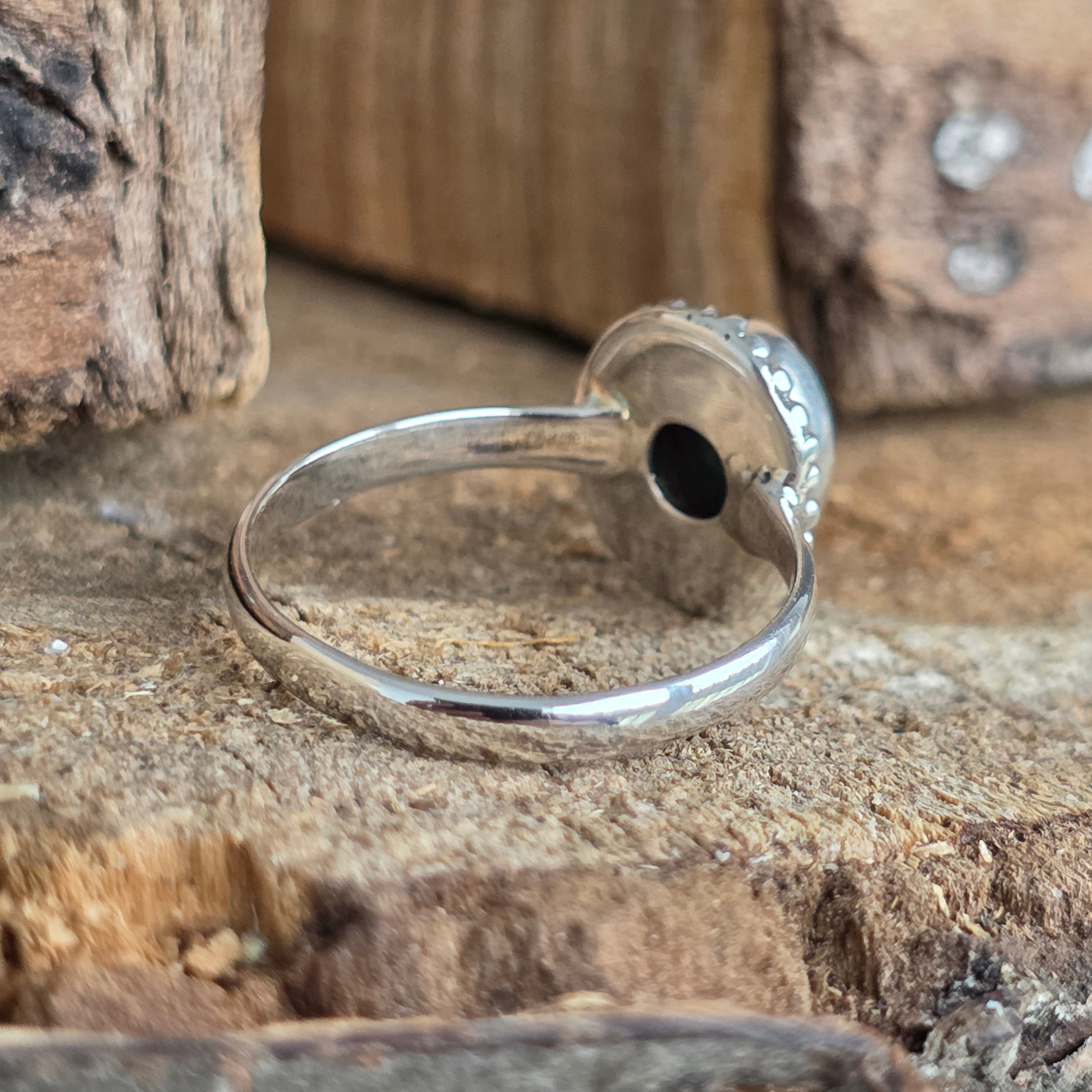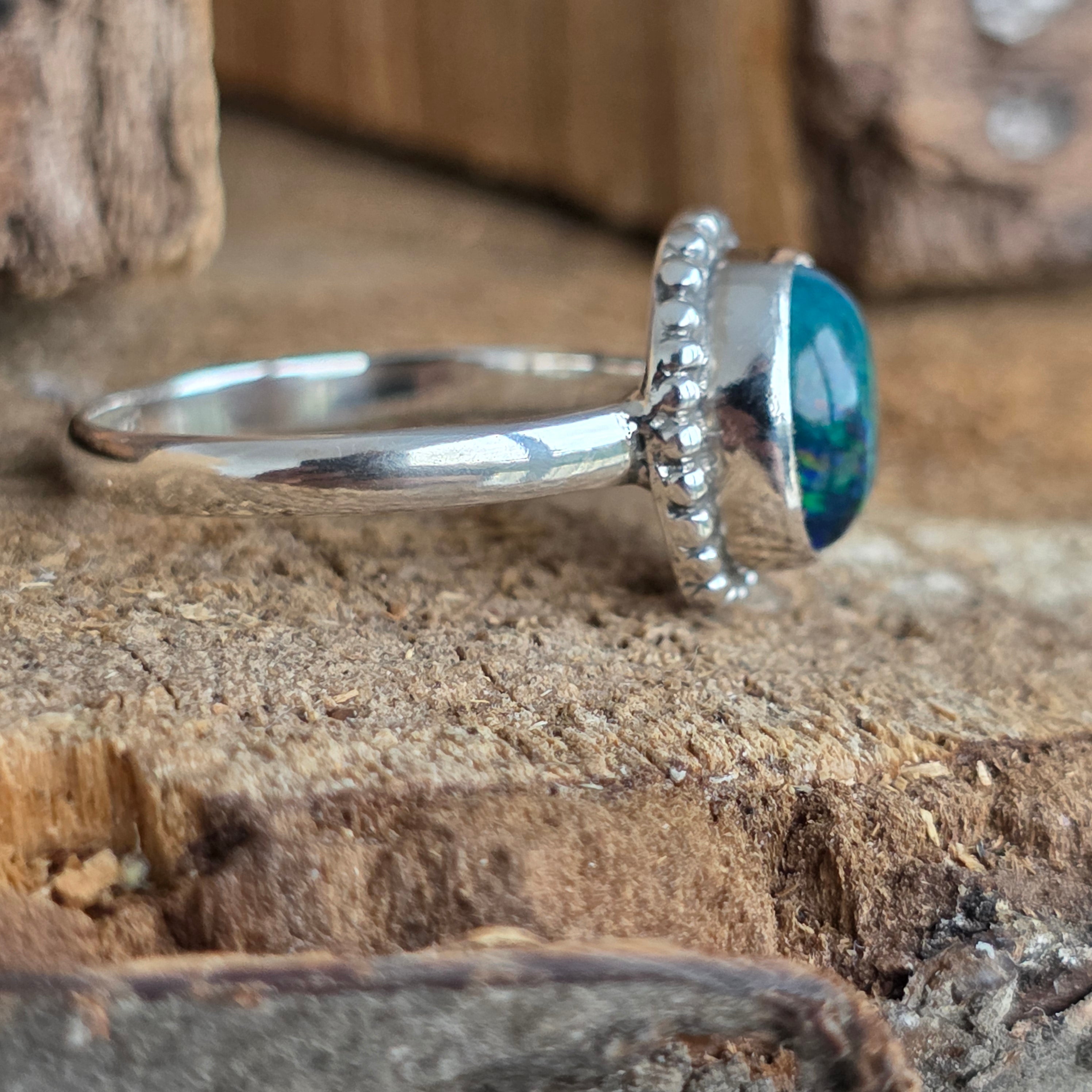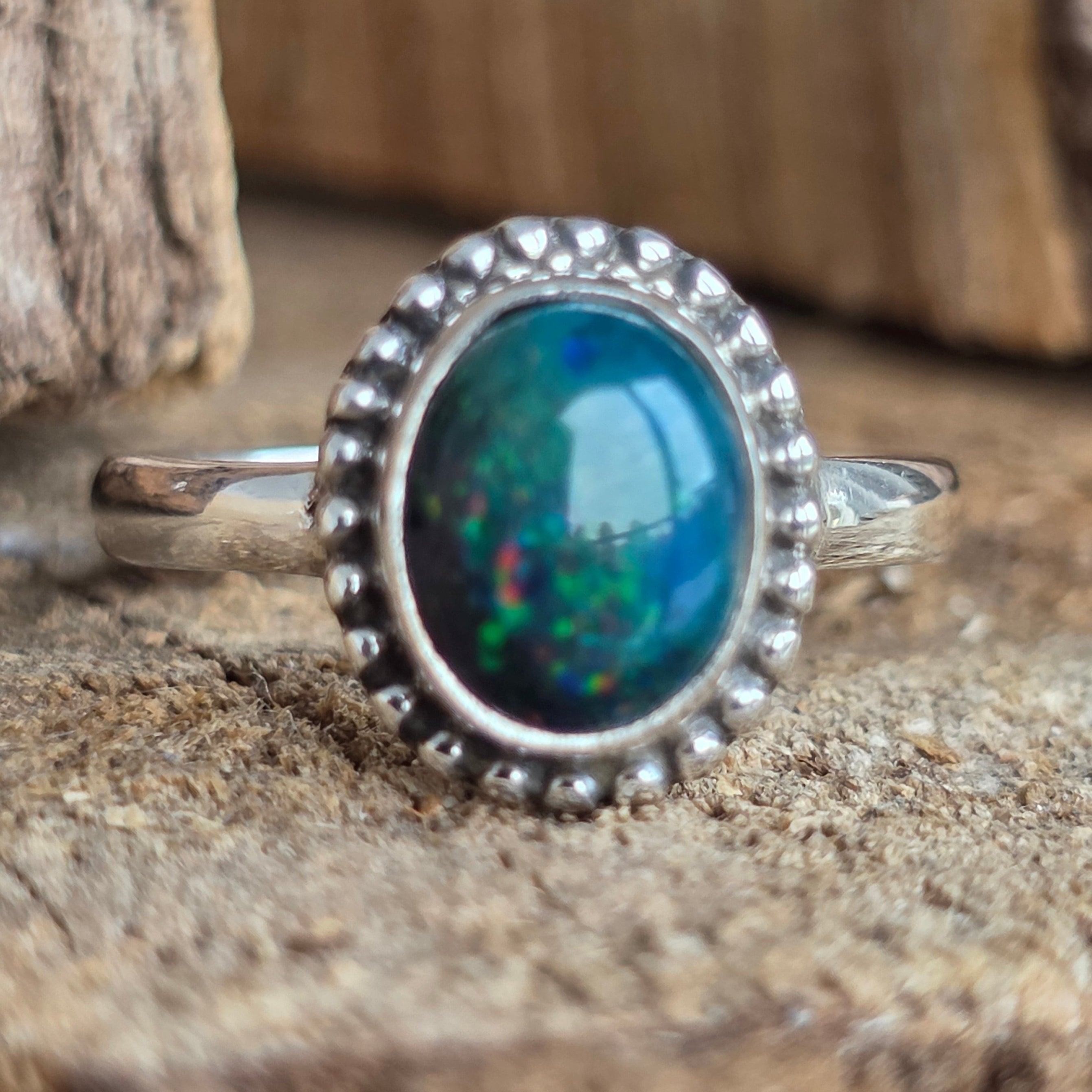 Елегантен и изискан пръстен, изработен от сребро 925, с естествен камък от етиопски опал, известен с ирисцирующите си отражения в нюанси на зелено, червено и синьо. Минималистичният дизайн plain wire setting позволява на камъка да бъде в центъра на вниманието, улавяйки светлината от всеки ъгъл.