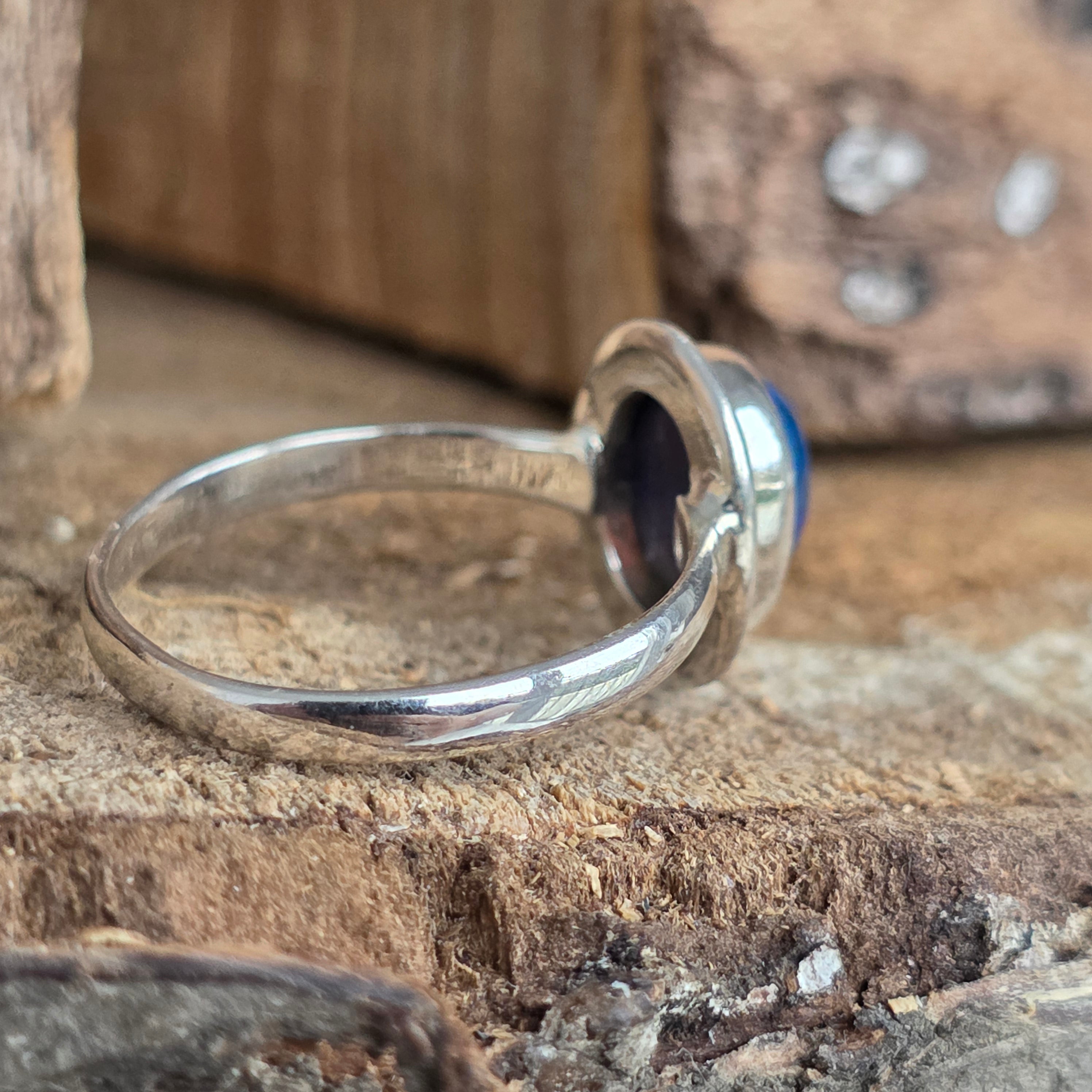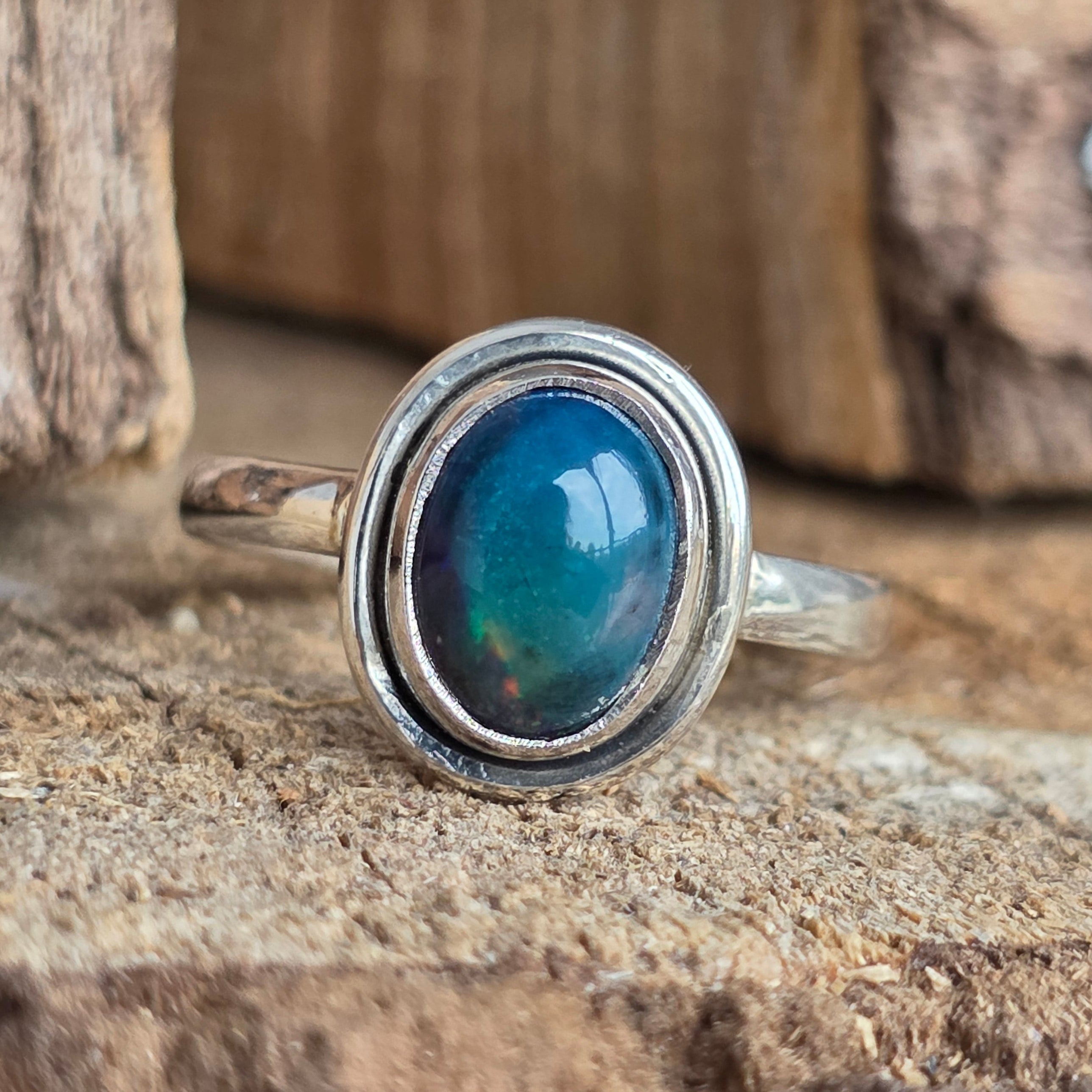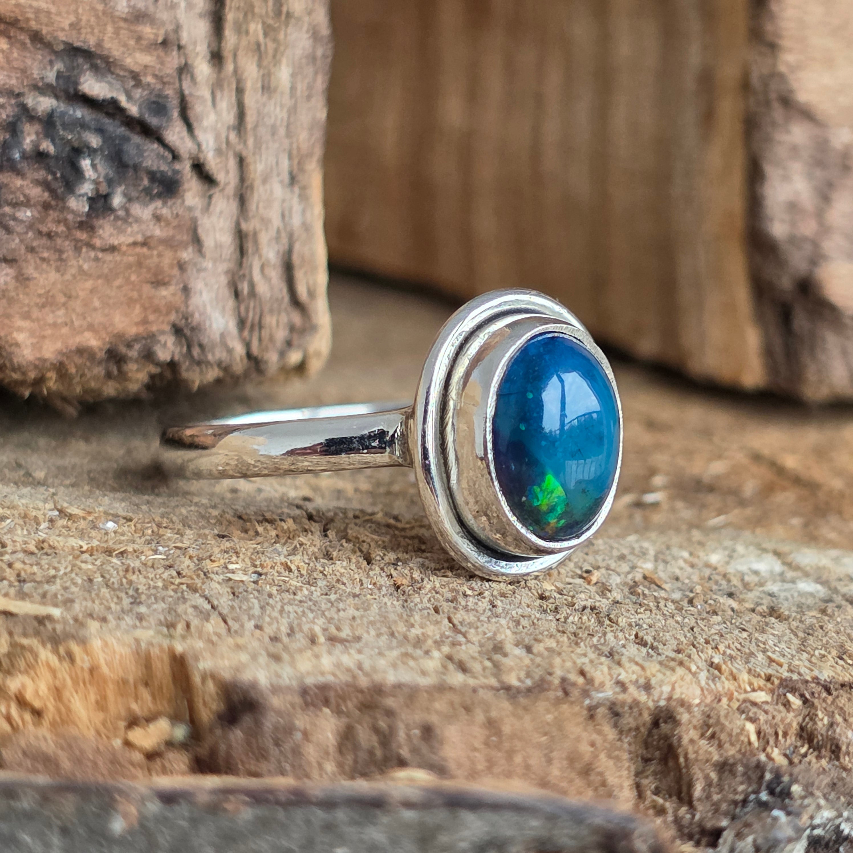 Елегантен и изискан пръстен, изработен от сребро 925, с естествен камък от етиопски опал, известен с ирисцирующите си отражения в нюанси на зелено, червено и синьо. Минималистичният дизайн plain wire setting позволява на камъка да бъде в центъра на вниманието, улавяйки светлината от всеки ъгъл.