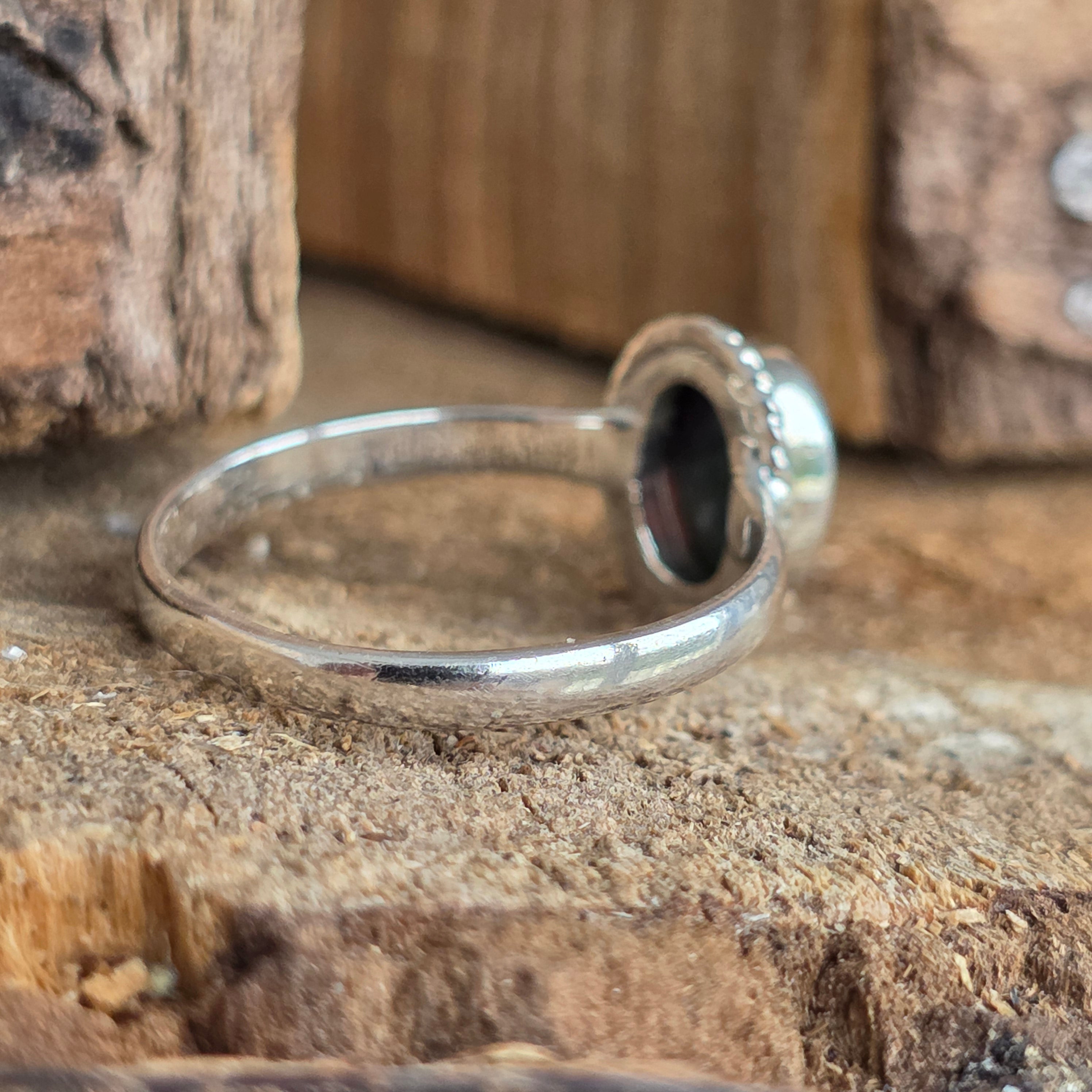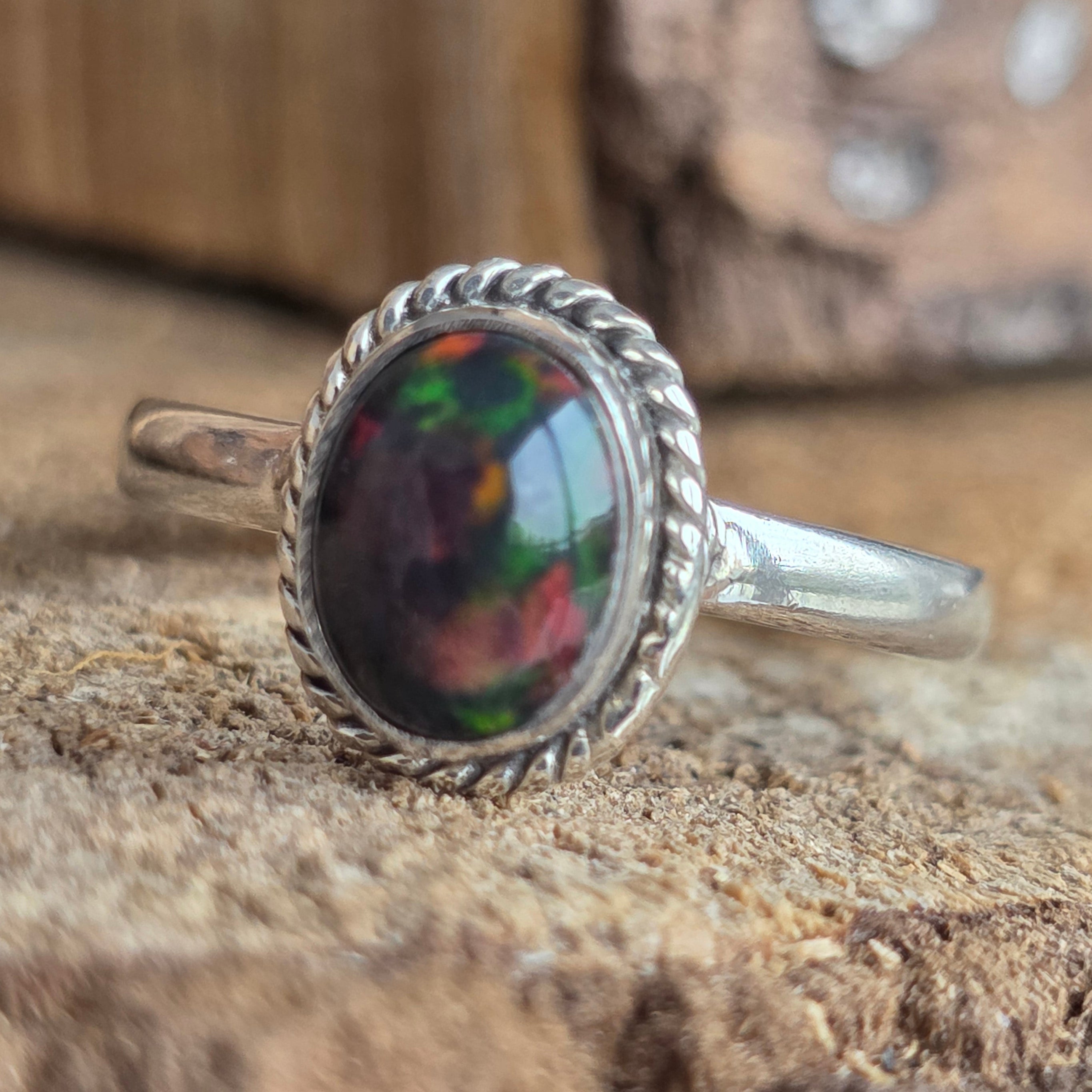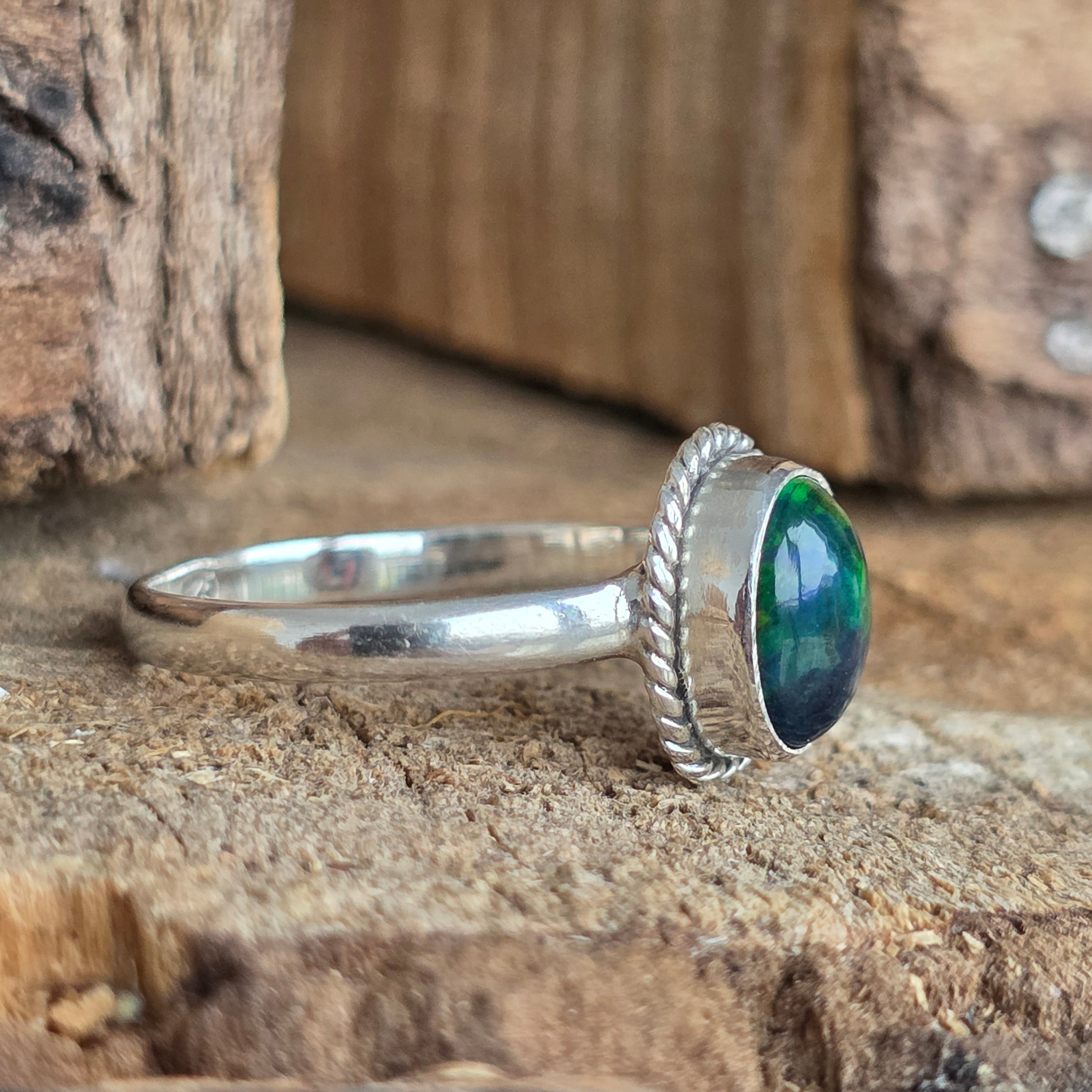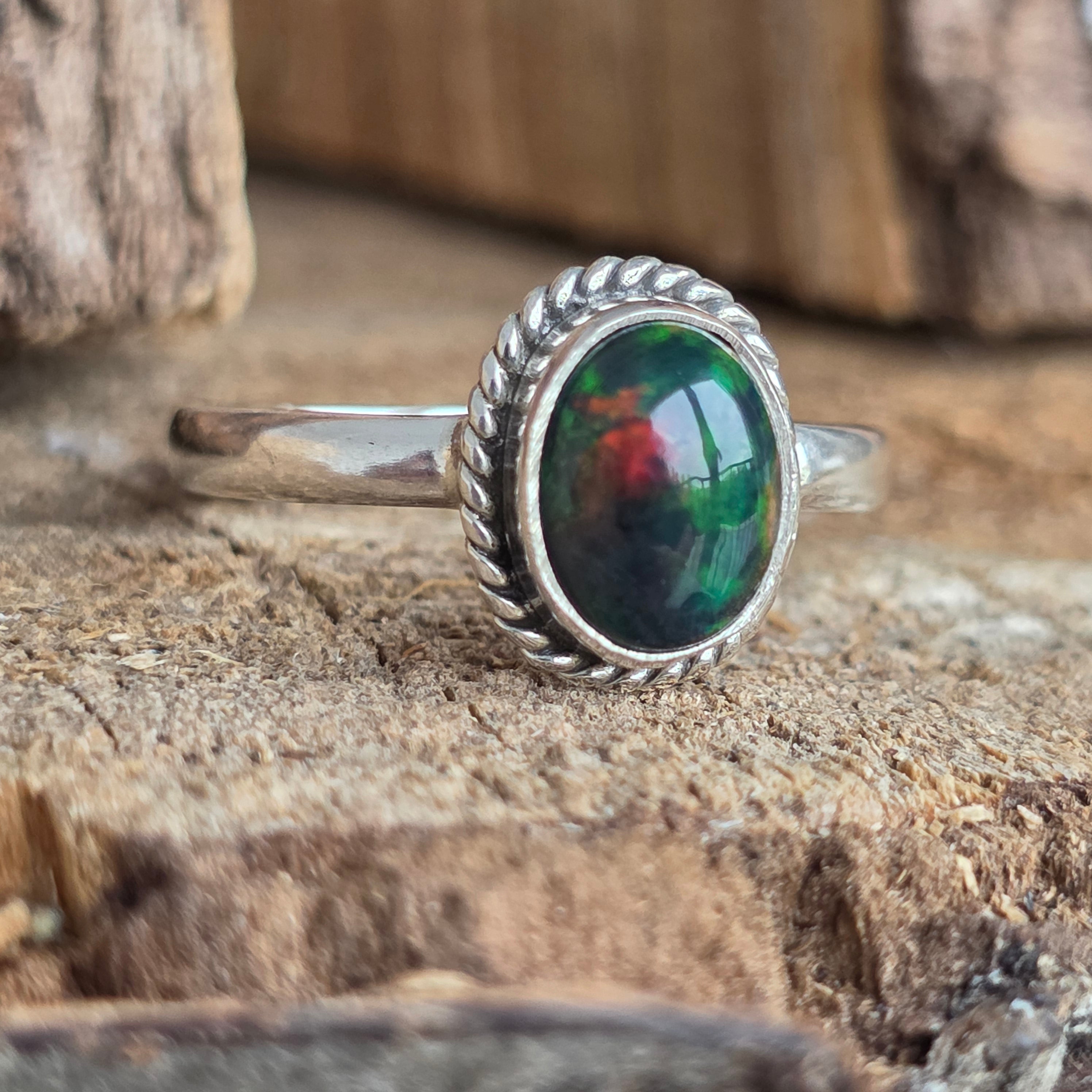 Елегантен и изискан пръстен, изработен от сребро 925, с естествен камък от етиопски опал, известен с ирисцирующите си отражения в нюанси на зелено, червено и синьо. Минималистичният дизайн plain wire setting позволява на камъка да бъде в центъра на вниманието, улавяйки светлината от всеки ъгъл.